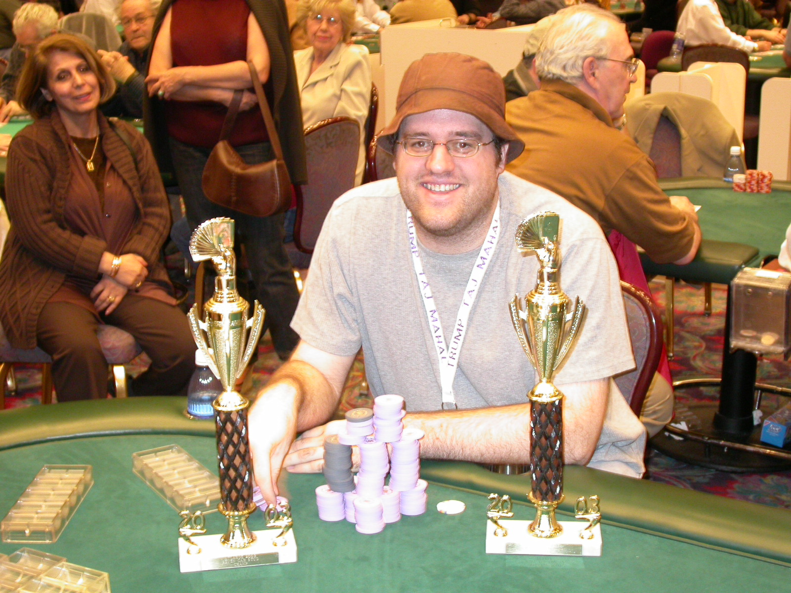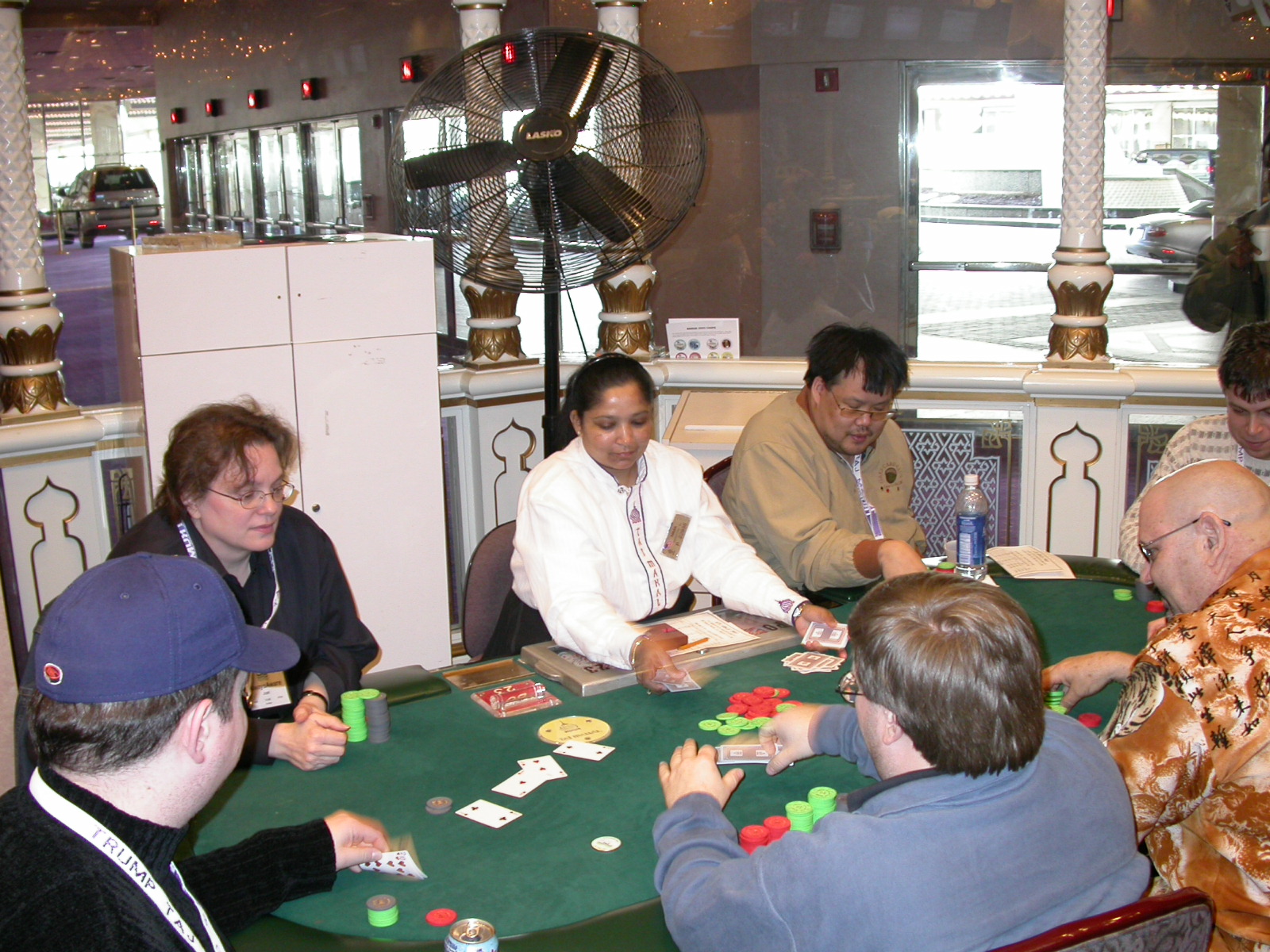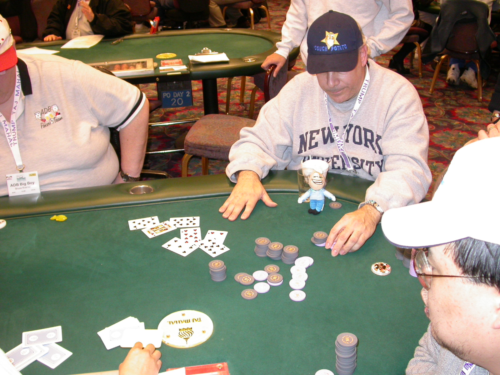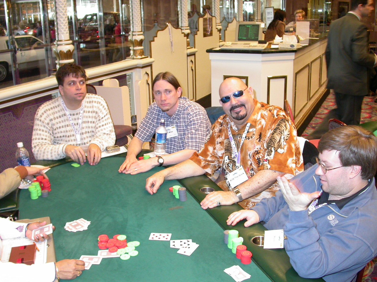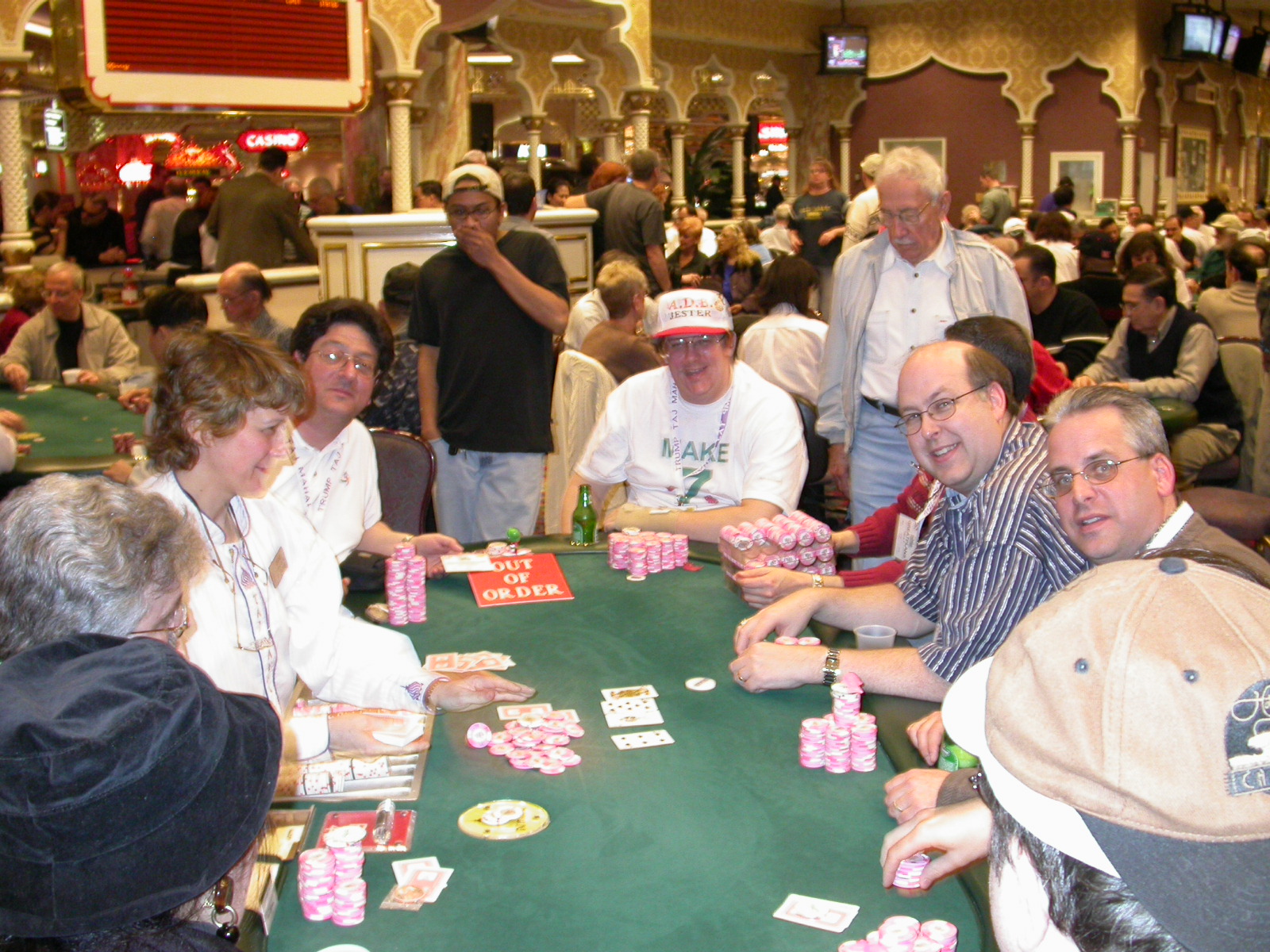 Standard trip report disclaimer: All events are reconstructed to the best of my memory; however, my memory seemed far worse this trip than others. I am a very poor person with both names and faces. As a point of fact, I may be the worst poker player there is when it comes to remembering names and faces. If I screw up your name, confuse you for someone else, make an inaccurate physical description of you, or completely forget about you, rest assured that it's my fault and I enjoyed your company. Russ Rosenblum -- whom I introduced myself to twice in three hours -- can attest to the complete ineptitude of my facial recognition skills. My severe sleep deprivation made my normally poor memory even worse both with regards to faces and incidents. For those of you who like lots of detailed poker action, I can't remember the hands well enough for you to get a lot out of this report. For those of you who like wacky antics outside of the poker room, there are none. For those of you who like meandering, vague recollections of crap...man, you're in luck! Monday, March 17 It was with my great anticipation that I embarked on a number of firsts. Not only was this to be my first ARG event, this was to be my first trip to the East Coast, my first time leaving Costa Rica (albeit since arriving last September), my first trip to New York, my first trip to the arena of the New Jersey Devils, a team I've had an affinity for since 1988. It was thus with no slight disappointment that my trip was delayed leaving Costa Rica, both boarding and departing. However, this was a very minor commuting bad beat, as the pilot evidently gunned it, or the winds were in our favour, or something, arriving just a few minutes late. Once in Newark, New Jersey, I was greeting by my excellent Newark-area hostess Christine Gonzalez and her red Jeep. We commuted quickly back to her place and to Continental Airlines Arena for a much anticipated game between the Devils and the rival Philadelphia Flyers. First place in the NHL's Atlantic Division was up for grabs, but the Devils didn't play like it, putting up a dispirited effort in a disappointing 4-2 loss. The game was not sold out, but the crowd was sufficiently rowdy to make up for the vacant seats. That it was St. Patrick's Day likely didn't hurt. Of note, President Bush's speech was broadcast in the stadium. Despite what seems to be a fair bit of anti-war sentiment in the area, the speech received four loud ovations. Tuesday, March 18 Today was my one day to do what I think everyone else in the world but me has done already -- tour New York City. What a vibrant city, so full of life, so...purposeful. I felt almost ashamed to be a tourist, since those around me all seemed to have somewhere to go; I felt as though I were a parasite, sucking time and leisure out of a city which had precious little of either to spare. New Yorkers, contrary to their reputation (or what I thought was their reputation), are a friendly species, but in a different sort of friendliness. After taking a two-hour cruise around Manhattan Island, I visited (in order) Times Square, Rockefeller Plaza, the New York Stock Exchange, the WTC site. Although I'd been told that there isn't much to see at the WTC site -- and in fact, this is true enough -- I felt very much compelled to see it, and am very much glad I did. I didn't do so to pay my respects to the victims and heroes of 9/11 (btw, I dislike how these are considered equivalent sets), although I did. I mused how odd it was that an event so horrific, tragic and damaging to the world could paradoxically bring forth so much positivity and strength, as we somehow find a profound connection with complete strangers. It is strange. I returned via subway to the port authority terminal, where I embarked back to Tina's. We went out for dinner, then to a bus station named Cheesequake (there has to be some interesting etymology surrounding that name) for the 2-hour bus to Atlantic City. One thing I don't ever think I've done before is travel a very long time and distance to a major cardroom and not play that first night, regardless of how tired I'd been. Unfortunately (perhaps), I did have to do this on Tuesday night. The Taj has a weird policy regarding opening new games and changing and breaking existing games. There were some 14 or 15 names on the 10/20 list, but no game opened for over two hours. When I realized I was falling asleep at the table waiting for games, I decided that sleep to start again in the morning would be the better play. Wednesday, March 19 / early Thursday, March 20 The waiting list strangeness continued Monday. I started playing a must-move 10/20 game at around 8am (and it was a surprisingly good 8am game), and also had my name on 15/30. There were two 10/20s and a number of players there were also on the 15 list, like me. At some point, a floorwoman goes to the main 10/20 and says that she knows a number of players from that game are also on the 15/30 list, so instead of breaking the game and starting a 15/30, she asks if anyone objects to making this game a 15/30. Sounds reasonable enough. Two players object, so the game does not change. Again, reasonable enough. However, the policy is that despite the fact there are well over 10 players actually playing 10/20 who are on the 15/30 list, they do not open a 15/30 game! Evidently, the rationale is that opening a 15/30 would break up the 10/20 -- the same 10/20 in which eight of ten players would rather play at 15/30, despite a huge 15/30 list. This all seemed par for the course to the locals, but seemed simply quite nuts to me. I also had my introduction to time pots Wednesday. For those who do not know, a time pot is where instead of all active players paying the time charge on the half hour, one player fronts the entire amount for the table. For example, time in a 10/20 game is $5 on the half hour, so at a full table, the table's time is $50. The time is then returned to the player posting the ti