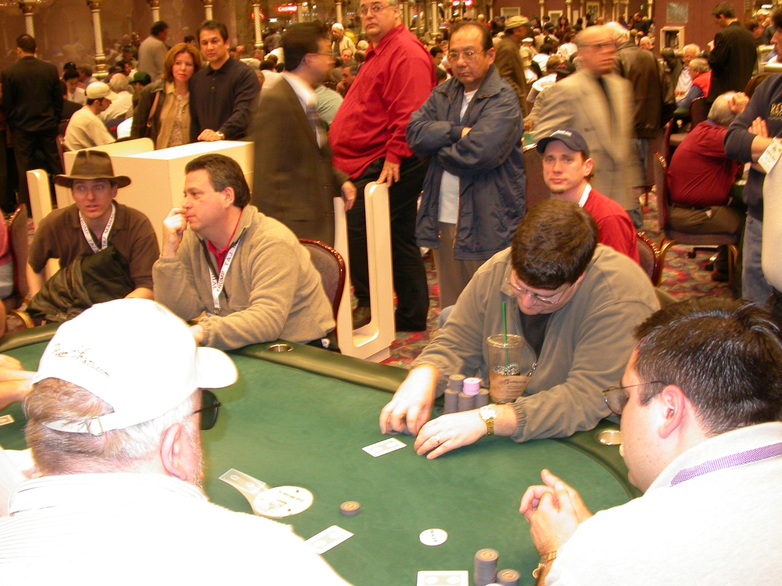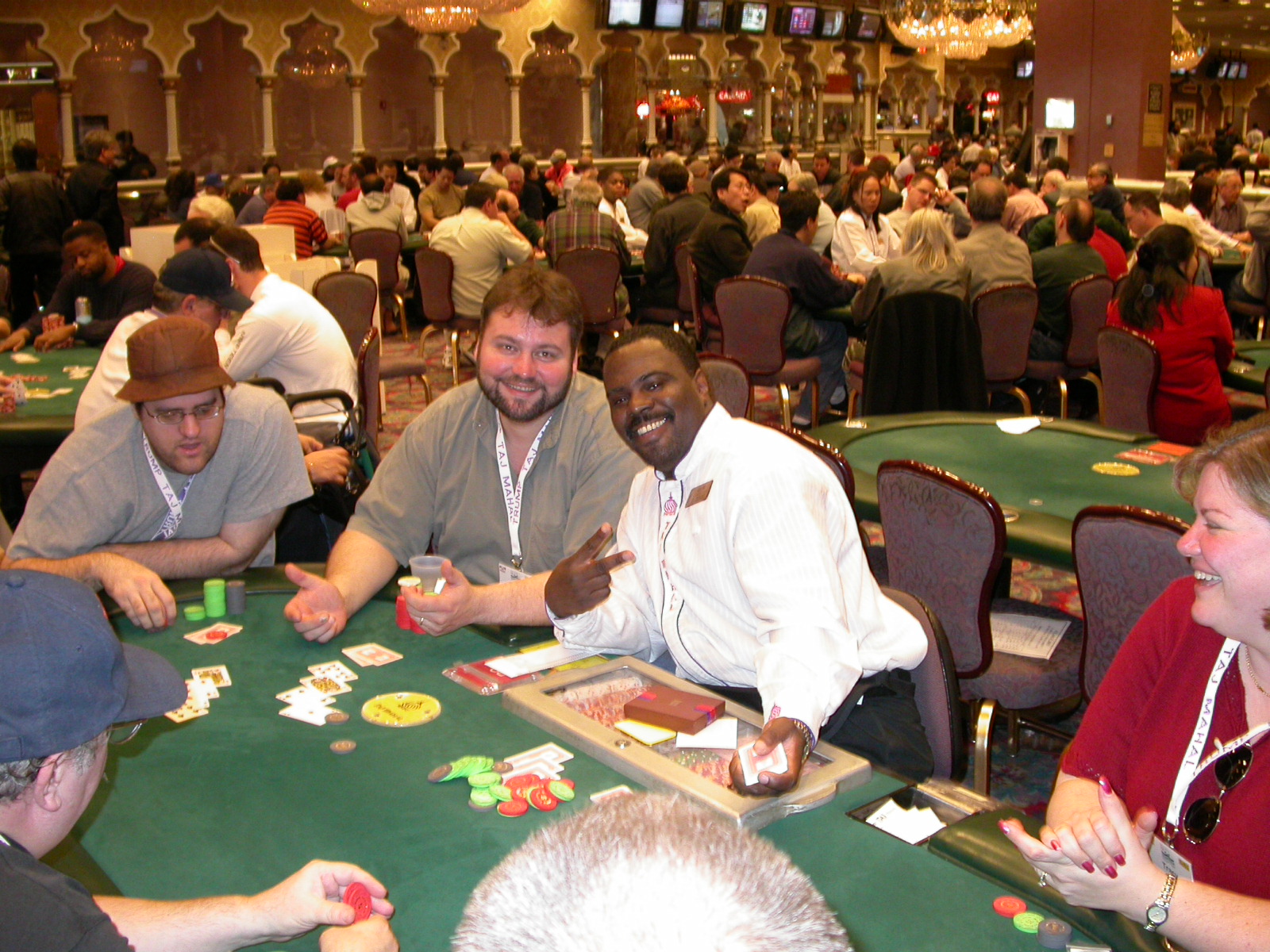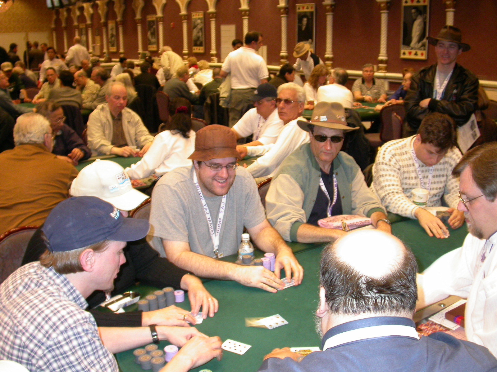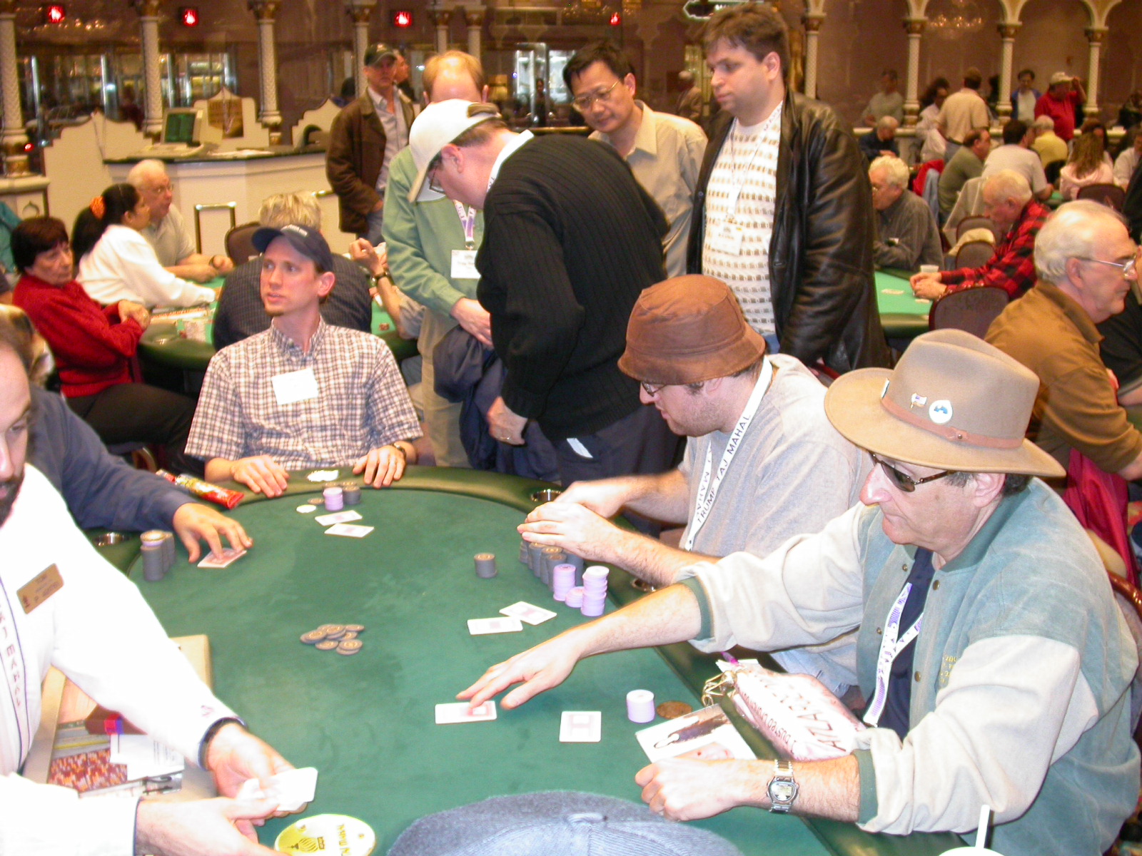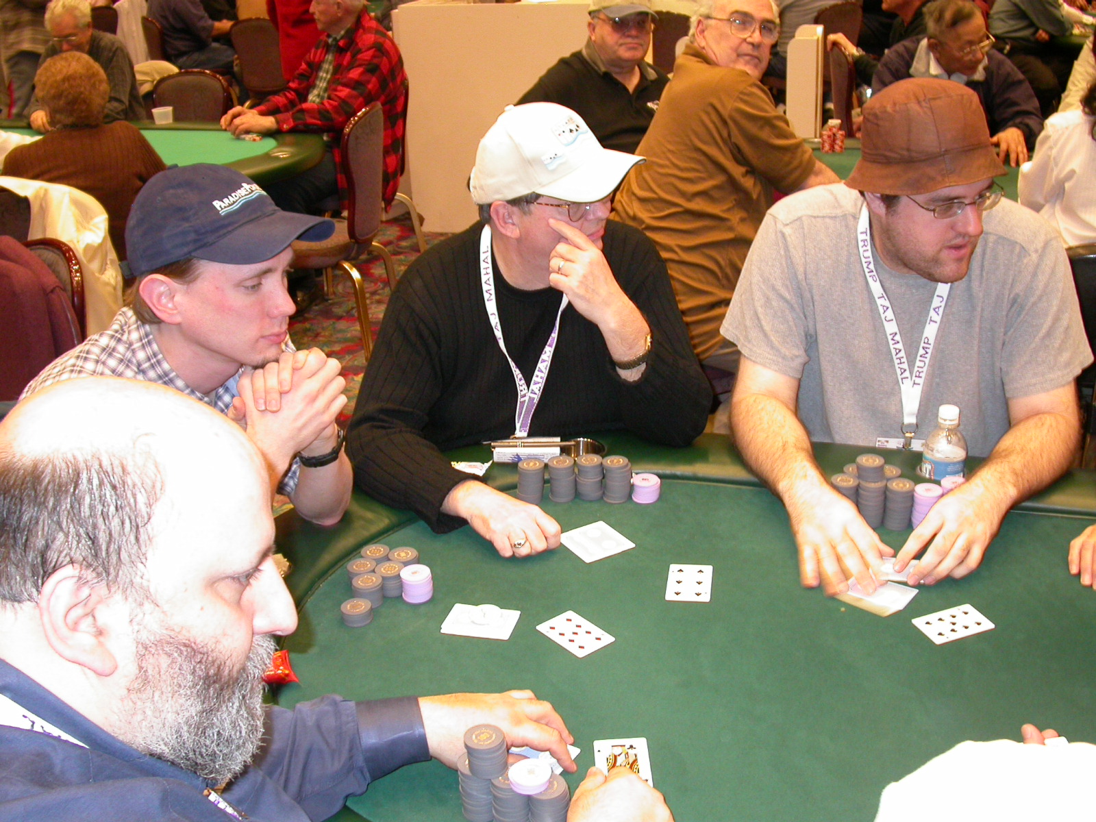 Standard trip report disclaimer: All events are reconstructed to the best of my memory; however, my memory seemed far worse this trip than others. I am a very poor person with both names and faces. As a point of fact, I may be the worst poker player there is when it comes to remembering names and faces. If I screw up your name, confuse you for someone else, make an inaccurate physical description of you, or completely forget about you, rest assured that it's my fault and I enjoyed your company. Russ Rosenblum -- whom I introduced myself to twice in three hours -- can attest to the complete ineptitude of my facial recognition skills. My severe sleep deprivation made my normally poor memory even worse both with regards to faces and incidents. For those of you who like lots of detailed poker action, I can't remember the hands well enough for you to get a lot out of this report. For those of you who like wacky antics outside of the poker room, there are none. For those of you who like meandering, vague recollections of crap...man, you're in luck! Monday, March 17 It was with my great anticipation that I embarked on a number of firsts. Not only was this to be my first ARG event, this was to be my first trip to the East Coast, my first time leaving Costa Rica (albeit since arriving last September), my first trip to New York, my first trip to the arena of the New Jersey Devils, a team I've had an affinity for since 1988. It was thus with no slight disappointment that my trip was delayed leaving Costa Rica, both boarding and departing. However, this was a very minor commuting bad beat, as the pilot evidently gunned it, or the winds were in our favour, or something, arriving just a few minutes late. Once in Newark, New Jersey, I was greeting by my excellent Newark-area hostess Christine Gonzalez and her red Jeep. We commuted quickly back to her place and to Continental Airlines Arena for a much anticipated game between the Devils and the rival Philadelphia Flyers. First place in the NHL's Atlantic Division was up for grabs, but the Devils didn't play like it, putting up a dispirited effort in a disappointing 4-2 loss. The game was not sold out, but the crowd was sufficiently rowdy to make up for the vacant seats. That it was St. Patrick's Day likely didn't hurt. Of note, President Bush's speech was broadcast in the stadium. Despite what seems to be a fair bit of anti-war sentiment in the area, the speech received four loud ovations. Tuesday, March 18 Today was my one day to do what I think everyone else in the world but me has done already -- tour New York City. What a vibrant city, so full of life, so...purposeful. I felt almost ashamed to be a tourist, since those around me all seemed to have somewhere to go; I felt as though I were a parasite, sucking time and leisure out of a city which had precious little of either to spare. New Yorkers, contrary to their reputation (or what I thought was their reputation), are a friendly species, but in a different sort of friendliness. After taking a two-hour cruise around Manhattan Island, I visited (in order) Times Square, Rockefeller Plaza, the New York Stock Exchange, the WTC site. Although I'd been told that there isn't much to see at the WTC site -- and in fact, this is true enough -- I felt very much compelled to see it, and am very much glad I did. I didn't do so to pay my respects to the victims and heroes of 9/11 (btw, I dislike how these are considered equivalent sets), although I did. I mused how odd it was that an event so horrific, tragic and damaging to the world could paradoxically bring forth so much positivity and strength, as we somehow find a profound connection with complete strangers. It is strange. I returned via subway to the port authority terminal, where I embarked back to Tina's. We went out for dinner, then to a bus station named Cheesequake (there has to be some interesting etymology surrounding that name) for the 2-hour bus to Atlantic City. One thing I don't ever think I've done before is travel a very long time and distance to a major cardroom and not play that first night, regardless of how tired I'd been. Unfortunately (perhaps), I did have to do this on Tuesday night. The Taj has a weird policy regarding opening new games and changing and breaking existing games. There were some 14 or 15 names on the 10/20 list, but no game opened for over two hours. When I realized I was falling asleep at the table waiting for games, I decided that sleep to start again in the morning would be the better play. Wednesday, March 19 / early Thursday, March 20 The waiting list strangeness continued Monday. I started playing a must-move 10/20 game at around 8am (and it was a surprisingly good 8am game), and also had my name on 15/30. There were two 10/20s and a number of players there were also on the 15 list, like me. At some point, a floorwoman goes to the main 10/20 and says that she knows a number of players from that game are also on the 15/30 list, so instead of breaking the game and starting a 15/30, she asks if anyone objects to making this game a 15/30. Sounds reasonable enough. Two players object, so the game does not change. Again, reasonable enough. However, the policy is that despite the fact there are well over 10 players actually playing 10/20 who are on the 15/30 list, they do not open a 15/30 game! Evidently, the rationale is that opening a 15/30 would break up the 10/20 -- the same 10/20 in which eight of ten players would rather play at 15/30, despite a huge 15/30 list. This all seemed par for the course to the locals, but seemed simply quite nuts to me. I also had my introduction to time pots Wednesday. For those who do not know, a time pot is where instead of all active players paying the time charge on the half hour, one player fronts the entire amount for the table. For example, time in a 10/20 game is $5 on the half hour, so at a full table, the table's time is $50. The time is then returned to the player posting the ti
