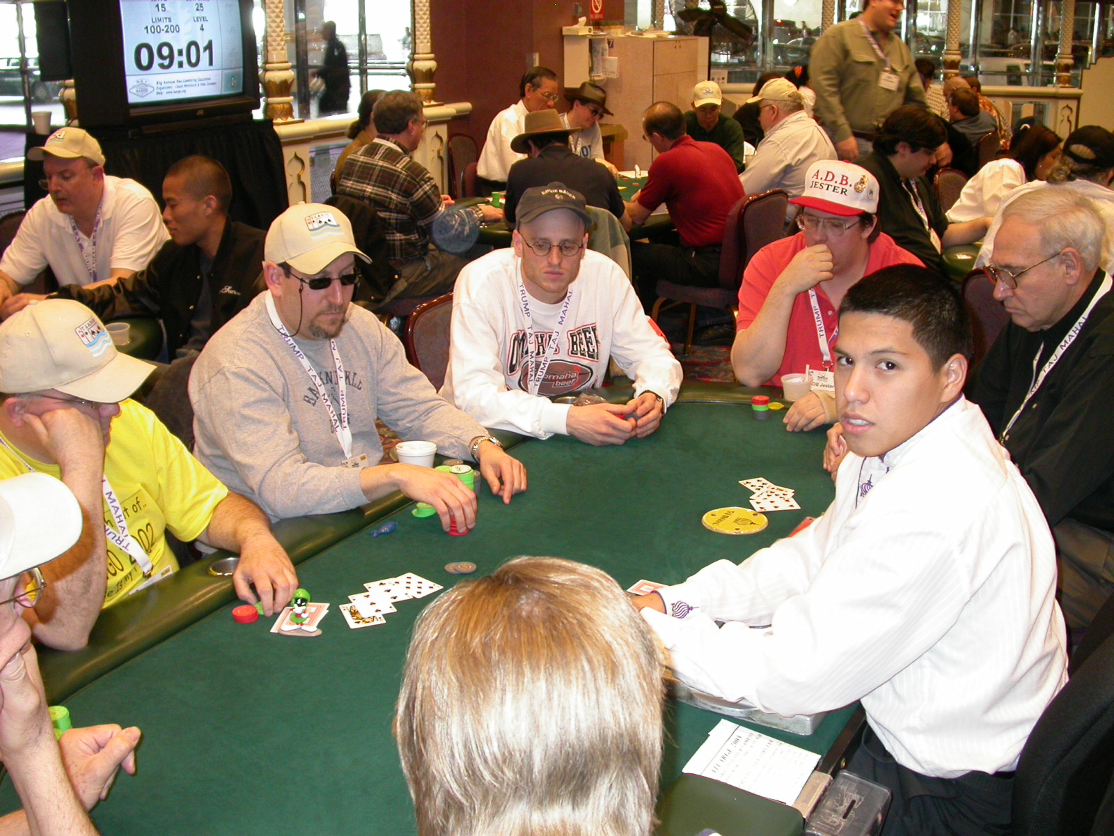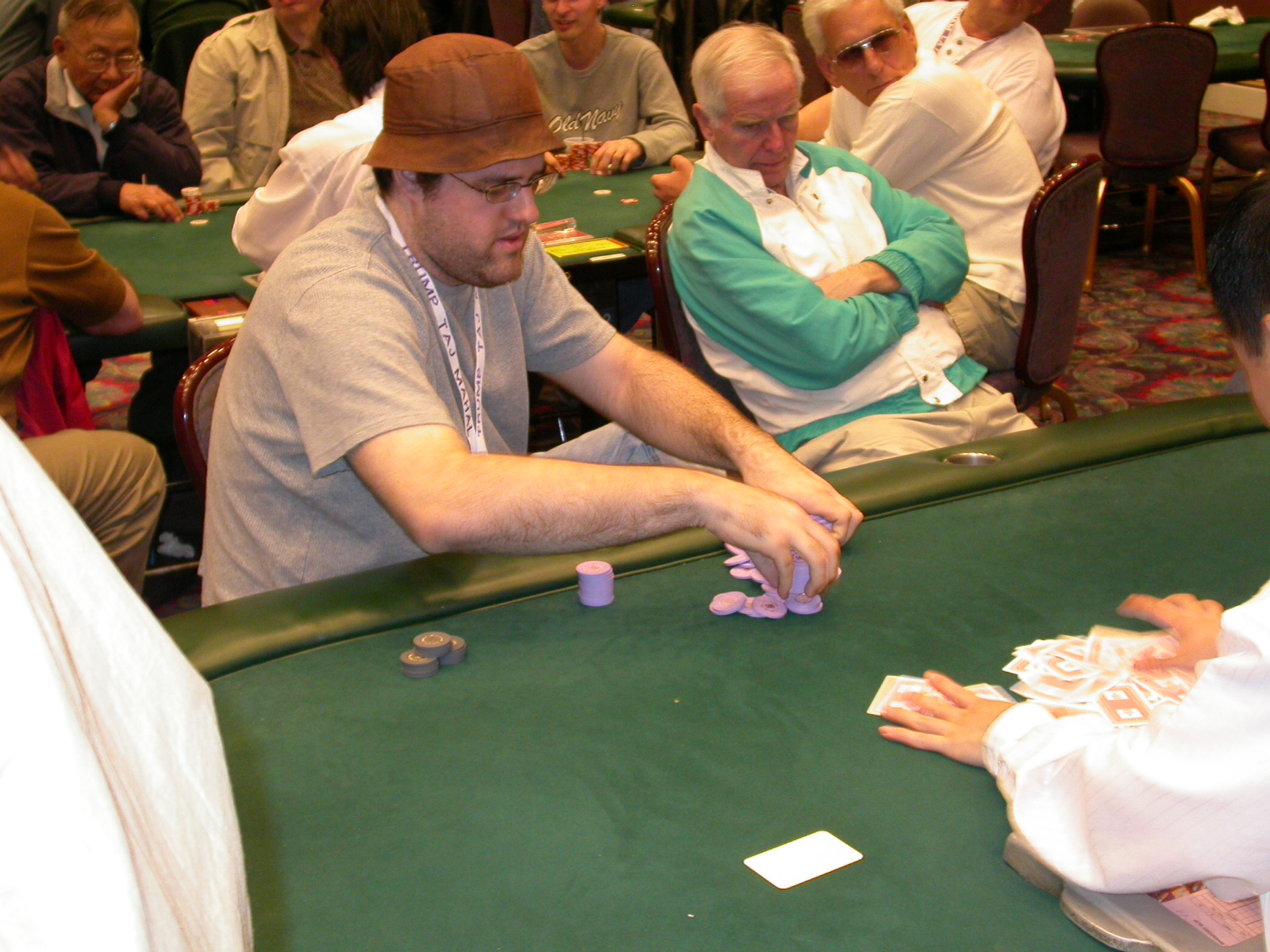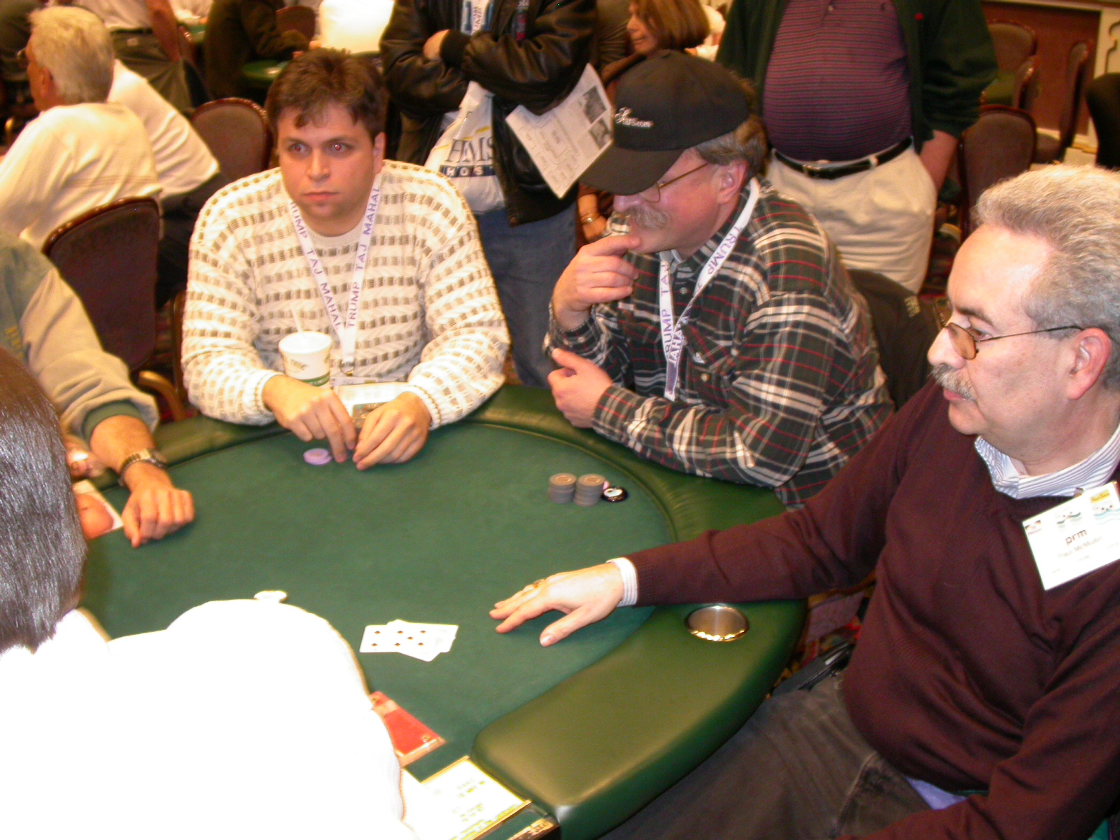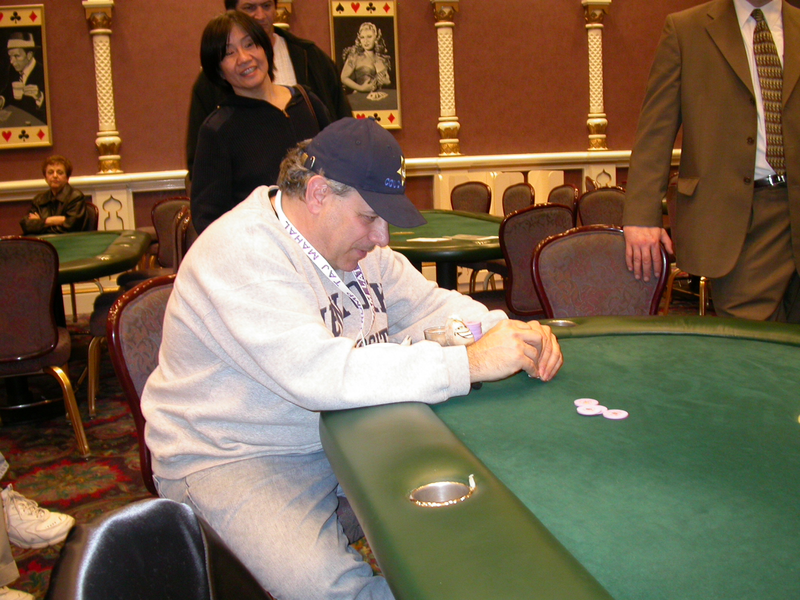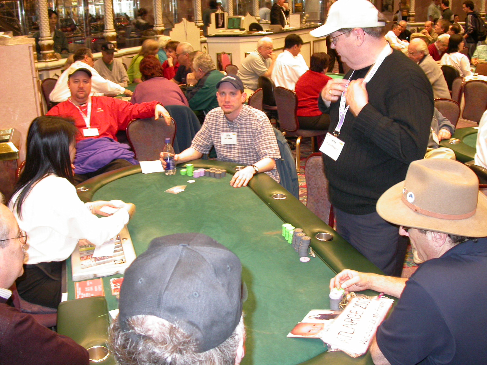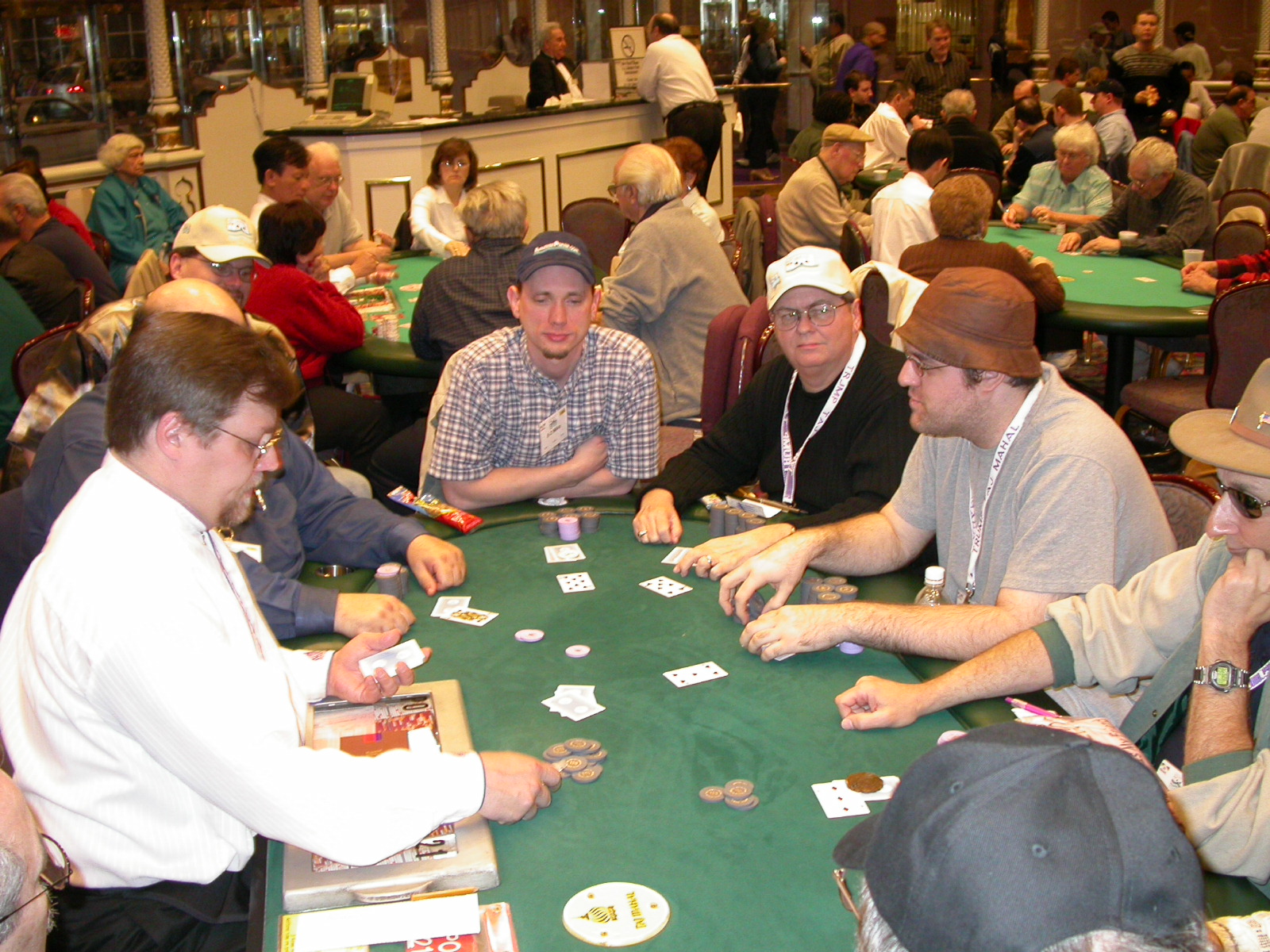 Standard trip report disclaimer: All events are reconstructed to the best of my memory; however, my memory seemed far worse this trip than others. I am a very poor person with both names and faces. As a point of fact, I may be the worst poker player there is when it comes to remembering names and faces. If I screw up your name, confuse you for someone else, make an inaccurate physical description of you, or completely forget about you, rest assured that it's my fault and I enjoyed your company. Russ Rosenblum -- whom I introduced myself to twice in three hours -- can attest to the complete ineptitude of my facial recognition skills. My severe sleep deprivation made my normally poor memory even worse both with regards to faces and incidents. For those of you who like lots of detailed poker action, I can't remember the hands well enough for you to get a lot out of this report. For those of you who like wacky antics outside of the poker room, there are none. For those of you who like meandering, vague recollections of crap...man, you're in luck! Monday, March 17 It was with my great anticipation that I embarked on a number of firsts. Not only was this to be my first ARG event, this was to be my first trip to the East Coast, my first time leaving Costa Rica (albeit since arriving last September), my first trip to New York, my first trip to the arena of the New Jersey Devils, a team I've had an affinity for since 1988. It was thus with no slight disappointment that my trip was delayed leaving Costa Rica, both boarding and departing. However, this was a very minor commuting bad beat, as the pilot evidently gunned it, or the winds were in our favour, or something, arriving just a few minutes late. Once in Newark, New Jersey, I was greeting by my excellent Newark-area hostess Christine Gonzalez and her red Jeep. We commuted quickly back to her place and to Continental Airlines Arena for a much anticipated game between the Devils and the rival Philadelphia Flyers. First place in the NHL's Atlantic Division was up for grabs, but the Devils didn't play like it, putting up a dispirited effort in a disappointing 4-2 loss. The game was not sold out, but the crowd was sufficiently rowdy to make up for the vacant seats. That it was St. Patrick's Day likely didn't hurt. Of note, President Bush's speech was broadcast in the stadium. Despite what seems to be a fair bit of anti-war sentiment in the area, the speech received four loud ovations. Tuesday, March 18 Today was my one day to do what I think everyone else in the world but me has done already -- tour New York City. What a vibrant city, so full of life, so...purposeful. I felt almost ashamed to be a tourist, since those around me all seemed to have somewhere to go; I felt as though I were a parasite, sucking time and leisure out of a city which had precious little of either to spare. New Yorkers, contrary to their reputation (or what I thought was their reputation), are a friendly species, but in a different sort of friendliness. After taking a two-hour cruise around Manhattan Island, I visited (in order) Times Square, Rockefeller Plaza, the New York Stock Exchange, the WTC site. Although I'd been told that there isn't much to see at the WTC site -- and in fact, this is true enough -- I felt very much compelled to see it, and am very much glad I did. I didn't do so to pay my respects to the victims and heroes of 9/11 (btw, I dislike how these are considered equivalent sets), although I did. I mused how odd it was that an event so horrific, tragic and damaging to the world could paradoxically bring forth so much positivity and strength, as we somehow find a profound connection with complete strangers. It is strange. I returned via subway to the port authority terminal, where I embarked back to Tina's. We went out for dinner, then to a bus station named Cheesequake (there has to be some interesting etymology surrounding that name) for the 2-hour bus to Atlantic City. One thing I don't ever think I've done before is travel a very long time and distance to a major cardroom and not play that first night, regardless of how tired I'd been. Unfortunately (perhaps), I did have to do this on Tuesday night. The Taj has a weird policy regarding opening new games and changing and breaking existing games. There were some 14 or 15 names on the 10/20 list, but no game opened for over two hours. When I realized I was falling asleep at the table waiting for games, I decided that sleep to start again in the morning would be the better play. Wednesday, March 19 / early Thursday, March 20 The waiting list strangeness continued Monday. I started playing a must-move 10/20 game at around 8am (and it was a surprisingly good 8am game), and also had my name on 15/30. There were two 10/20s and a number of players there were also on the 15 list, like me. At some point, a floorwoman goes to the main 10/20 and says that she knows a number of players from that game are also on the 15/30 list, so instead of breaking the game and starting a 15/30, she asks if anyone objects to making this game a 15/30. Sounds reasonable enough. Two players object, so the game does not change. Again, reasonable enough. However, the policy is that despite the fact there are well over 10 players actually playing 10/20 who are on the 15/30 list, they do not open a 15/30 game! Evidently, the rationale is that opening a 15/30 would break up the 10/20 -- the same 10/20 in which eight of ten players would rather play at 15/30, despite a huge 15/30 list. This all seemed par for the course to the locals, but seemed simply quite nuts to me. I also had my introduction to time pots Wednesday. For those who do not know, a time pot is where instead of all active players paying the time charge on the half hour, one player fronts the entire amount for the table. For example, time in a 10/20 game is $5 on the half hour, so at a full table, the table's time is $50. The time is then returned to the player posting the ti