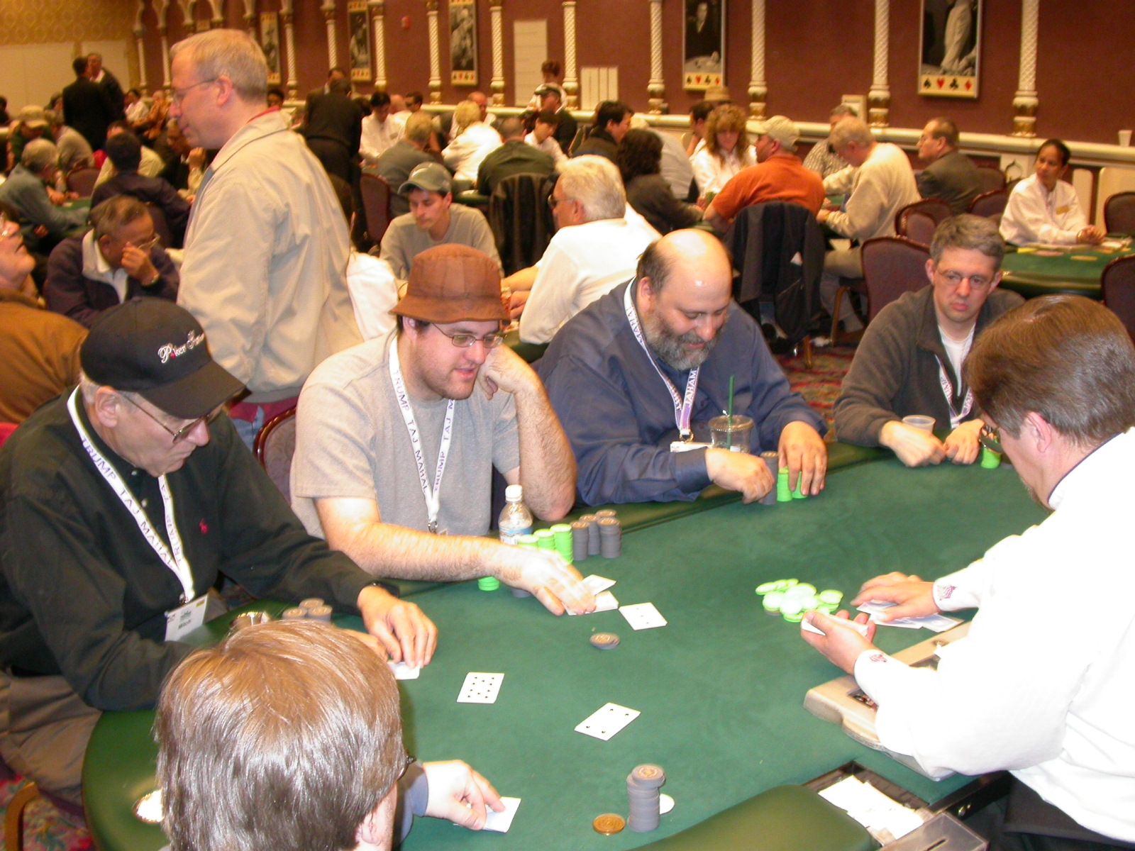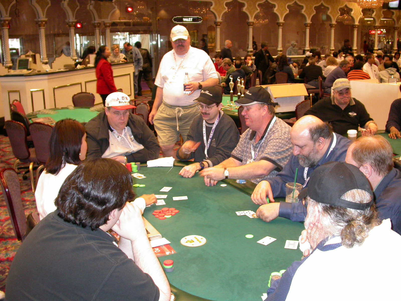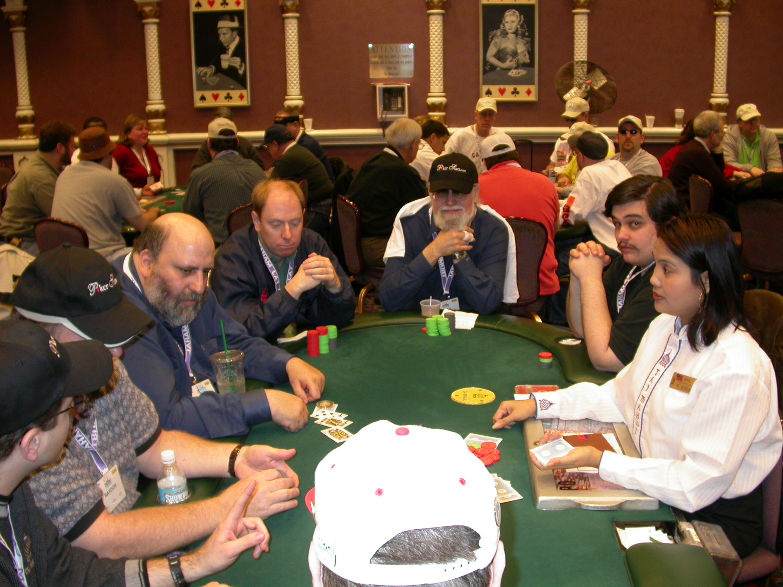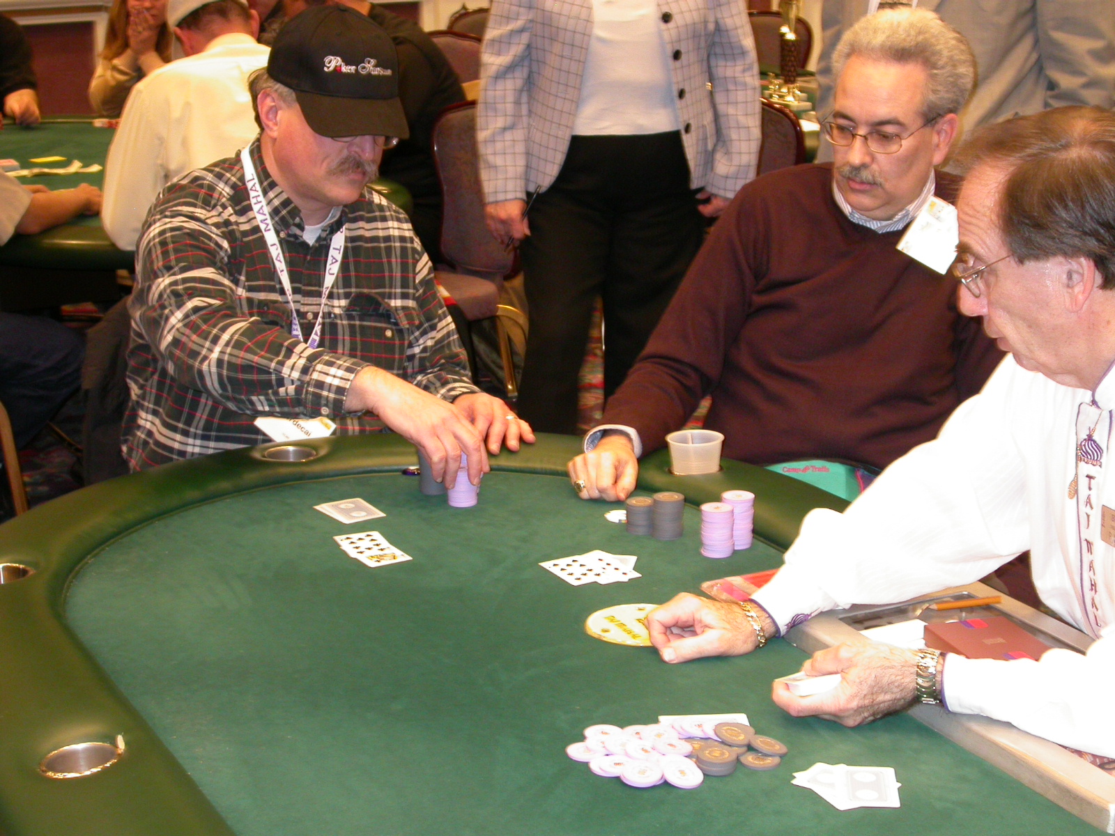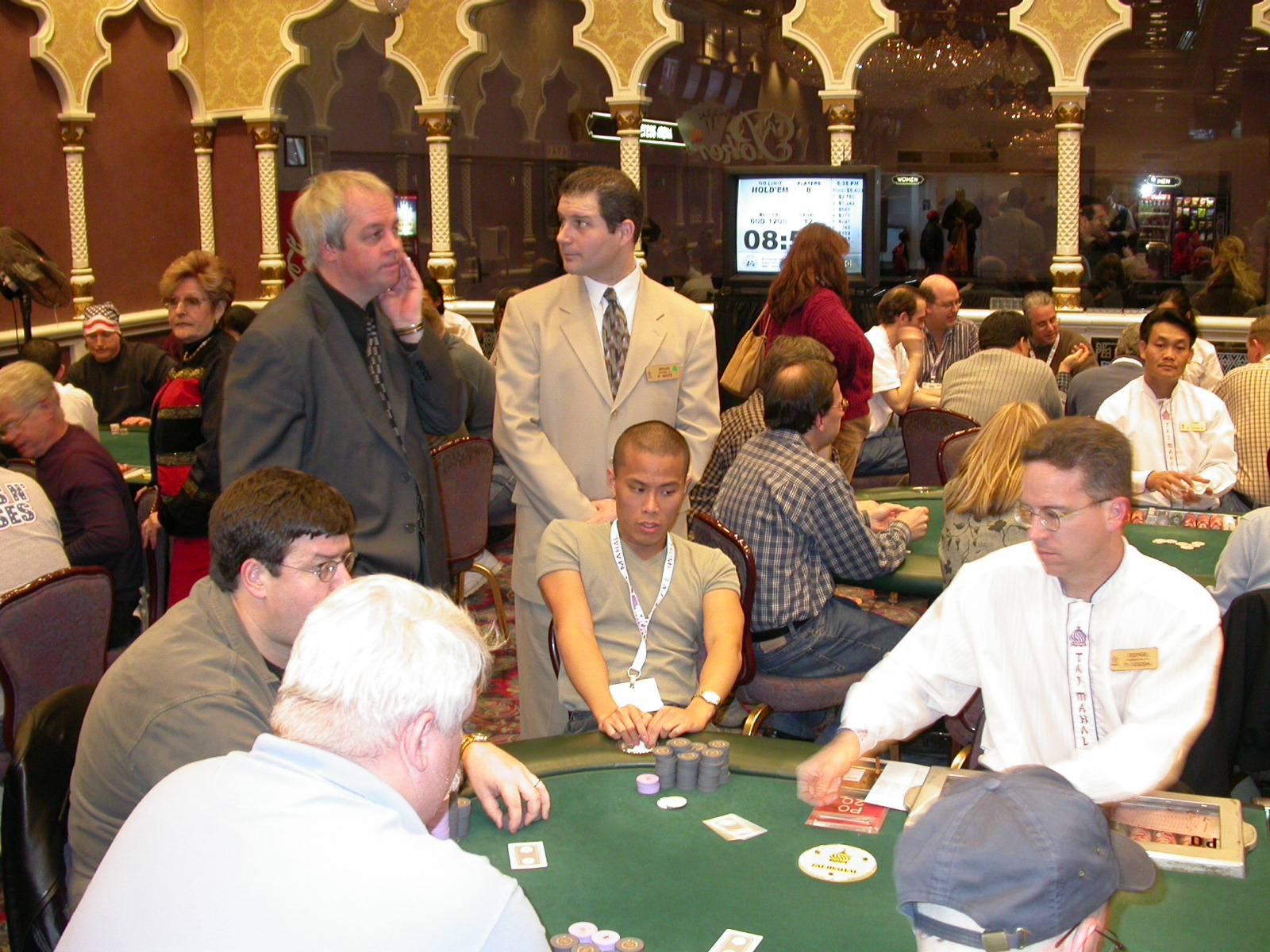 Standard trip report disclaimer: All events are reconstructed to the best of my memory; however, my memory seemed far worse this trip than others. I am a very poor person with both names and faces. As a point of fact, I may be the worst poker player there is when it comes to remembering names and faces. If I screw up your name, confuse you for someone else, make an inaccurate physical description of you, or completely forget about you, rest assured that it's my fault and I enjoyed your company. Russ Rosenblum -- whom I introduced myself to twice in three hours -- can attest to the complete ineptitude of my facial recognition skills. My severe sleep deprivation made my normally poor memory even worse both with regards to faces and incidents. For those of you who like lots of detailed poker action, I can't remember the hands well enough for you to get a lot out of this report. For those of you who like wacky antics outside of the poker room, there are none. For those of you who like meandering, vague recollections of crap...man, you're in luck! Monday, March 17 It was with my great anticipation that I embarked on a number of firsts. Not only was this to be my first ARG event, this was to be my first trip to the East Coast, my first time leaving Costa Rica (albeit since arriving last September), my first trip to New York, my first trip to the arena of the New Jersey Devils, a team I've had an affinity for since 1988. It was thus with no slight disappointment that my trip was delayed leaving Costa Rica, both boarding and departing. However, this was a very minor commuting bad beat, as the pilot evidently gunned it, or the winds were in our favour, or something, arriving just a few minutes late. Once in Newark, New Jersey, I was greeting by my excellent Newark-area hostess Christine Gonzalez and her red Jeep. We commuted quickly back to her place and to Continental Airlines Arena for a much anticipated game between the Devils and the rival Philadelphia Flyers. First place in the NHL's Atlantic Division was up for grabs, but the Devils didn't play like it, putting up a dispirited effort in a disappointing 4-2 loss. The game was not sold out, but the crowd was sufficiently rowdy to make up for the vacant seats. That it was St. Patrick's Day likely didn't hurt. Of note, President Bush's speech was broadcast in the stadium. Despite what seems to be a fair bit of anti-war sentiment in the area, the speech received four loud ovations. Tuesday, March 18 Today was my one day to do what I think everyone else in the world but me has done already -- tour New York City. What a vibrant city, so full of life, so...purposeful. I felt almost ashamed to be a tourist, since those around me all seemed to have somewhere to go; I felt as though I were a parasite, sucking time and leisure out of a city which had precious little of either to spare. New Yorkers, contrary to their reputation (or what I thought was their reputation), are a friendly species, but in a different sort of friendliness. After taking a two-hour cruise around Manhattan Island, I visited (in order) Times Square, Rockefeller Plaza, the New York Stock Exchange, the WTC site. Although I'd been told that there isn't much to see at the WTC site -- and in fact, this is true enough -- I felt very much compelled to see it, and am very much glad I did. I didn't do so to pay my respects to the victims and heroes of 9/11 (btw, I dislike how these are considered equivalent sets), although I did. I mused how odd it was that an event so horrific, tragic and damaging to the world could paradoxically bring forth so much positivity and strength, as we somehow find a profound connection with complete strangers. It is strange. I returned via subway to the port authority terminal, where I embarked back to Tina's. We went out for dinner, then to a bus station named Cheesequake (there has to be some interesting etymology surrounding that name) for the 2-hour bus to Atlantic City. One thing I don't ever think I've done before is travel a very long time and distance to a major cardroom and not play that first night, regardless of how tired I'd been. Unfortunately (perhaps), I did have to do this on Tuesday night. The Taj has a weird policy regarding opening new games and changing and breaking existing games. There were some 14 or 15 names on the 10/20 list, but no game opened for over two hours. When I realized I was falling asleep at the table waiting for games, I decided that sleep to start again in the morning would be the better play. Wednesday, March 19 / early Thursday, March 20 The waiting list strangeness continued Monday. I started playing a must-move 10/20 game at around 8am (and it was a surprisingly good 8am game), and also had my name on 15/30. There were two 10/20s and a number of players there were also on the 15 list, like me. At some point, a floorwoman goes to the main 10/20 and says that she knows a number of players from that game are also on the 15/30 list, so instead of breaking the game and starting a 15/30, she asks if anyone objects to making this game a 15/30. Sounds reasonable enough. Two players object, so the game does not change. Again, reasonable enough. However, the policy is that despite the fact there are well over 10 players actually playing 10/20 who are on the 15/30 list, they do not open a 15/30 game! Evidently, the rationale is that opening a 15/30 would break up the 10/20 -- the same 10/20 in which eight of ten players would rather play at 15/30, despite a huge 15/30 list. This all seemed par for the course to the locals, but seemed simply quite nuts to me. I also had my introduction to time pots Wednesday. For those who do not know, a time pot is where instead of all active players paying the time charge on the half hour, one player fronts the entire amount for the table. For example, time in a 10/20 game is $5 on the half hour, so at a full table, the table's time is $50. The time is then returned to the player posting the ti