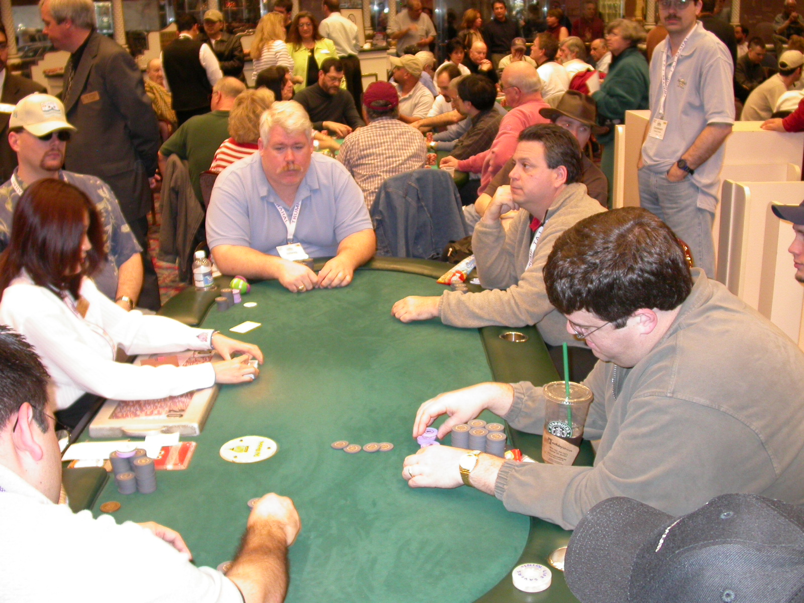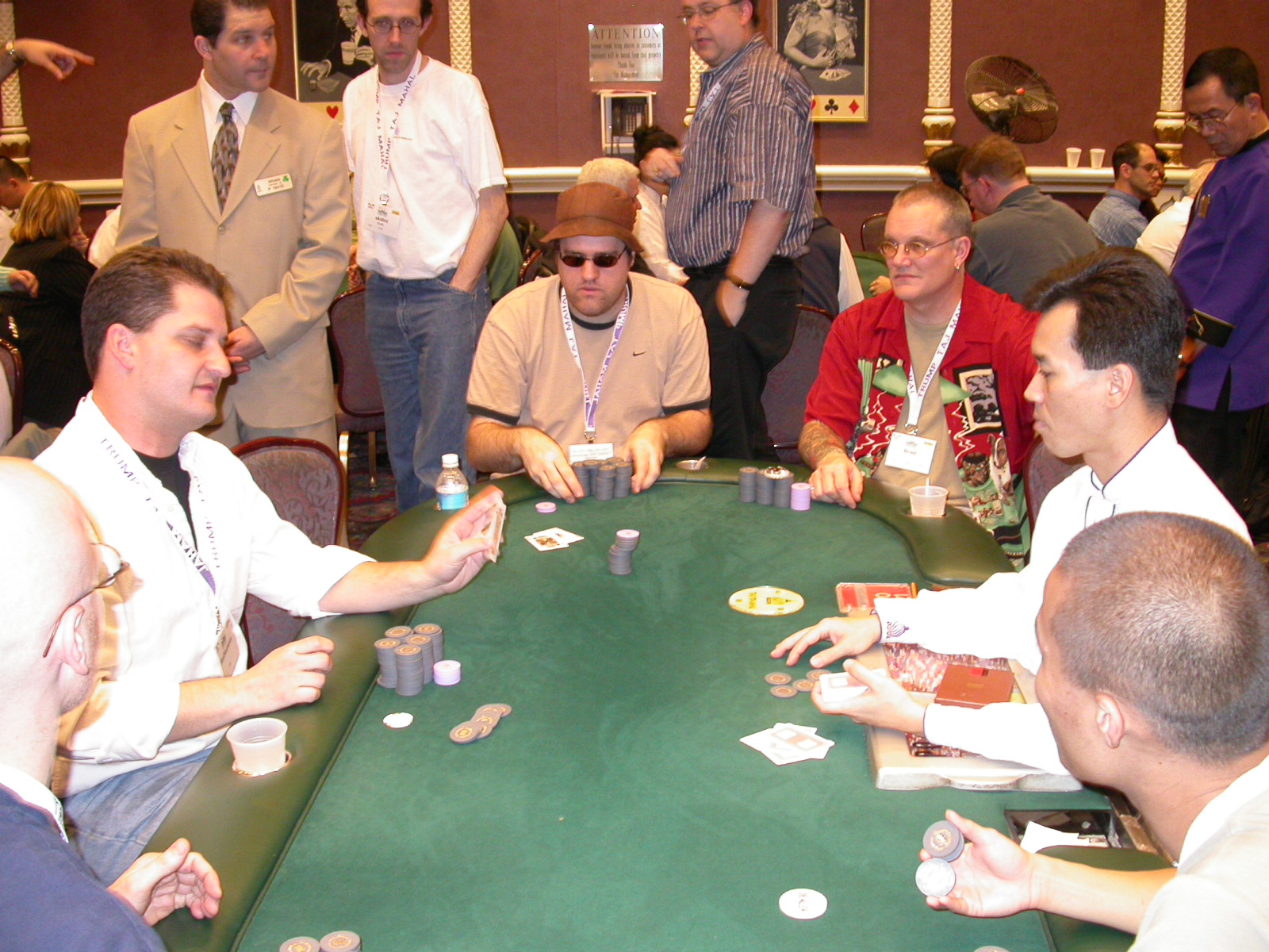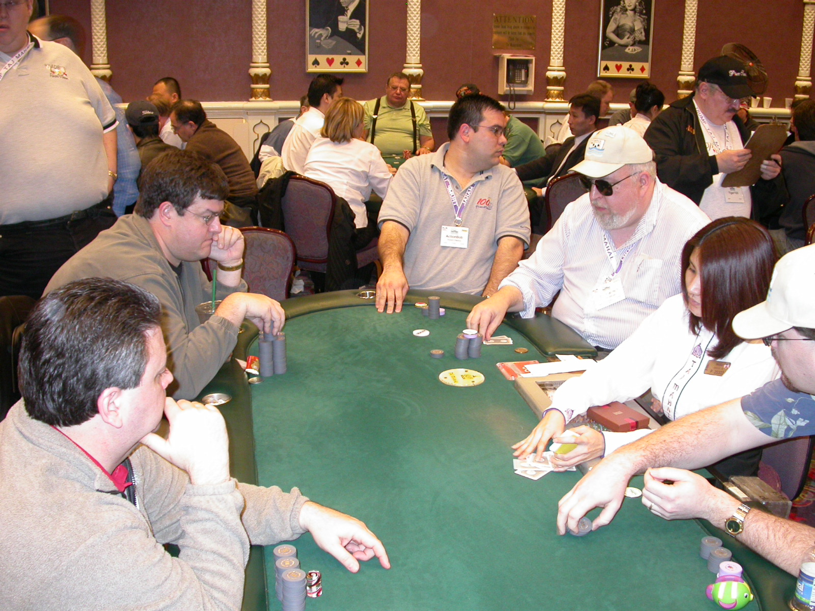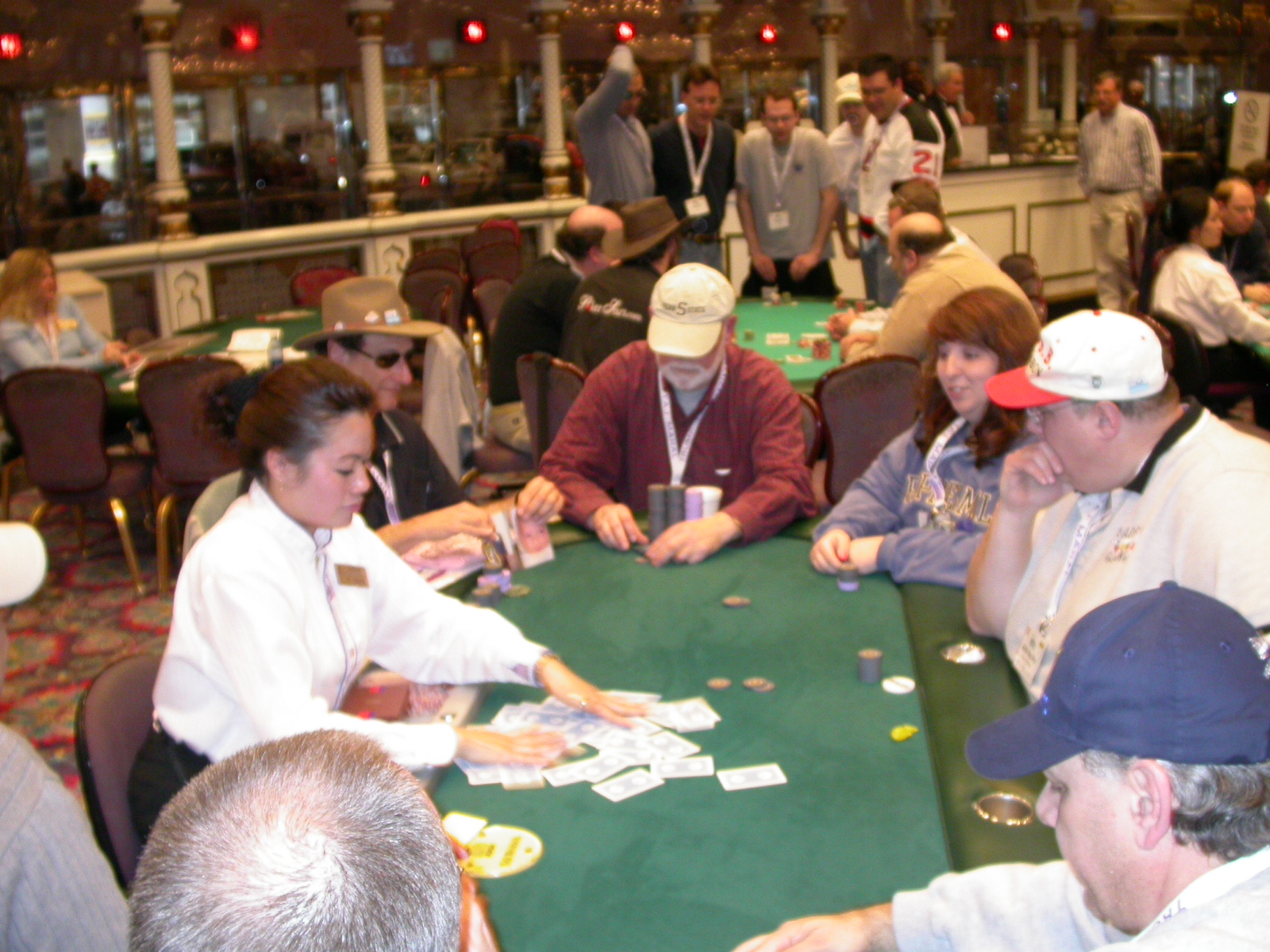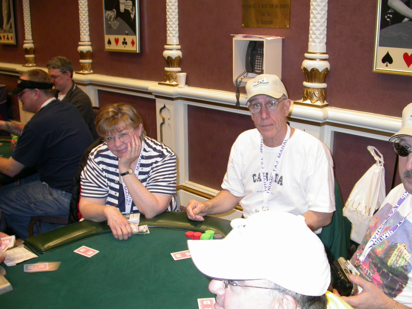 Standard trip report disclaimer: All events are reconstructed to the best of my memory; however, my memory seemed far worse this trip than others. I am a very poor person with both names and faces. As a point of fact, I may be the worst poker player there is when it comes to remembering names and faces. If I screw up your name, confuse you for someone else, make an inaccurate physical description of you, or completely forget about you, rest assured that it's my fault and I enjoyed your company. Russ Rosenblum -- whom I introduced myself to twice in three hours -- can attest to the complete ineptitude of my facial recognition skills. My severe sleep deprivation made my normally poor memory even worse both with regards to faces and incidents. For those of you who like lots of detailed poker action, I can't remember the hands well enough for you to get a lot out of this report. For those of you who like wacky antics outside of the poker room, there are none. For those of you who like meandering, vague recollections of crap...man, you're in luck! Monday, March 17 It was with my great anticipation that I embarked on a number of firsts. Not only was this to be my first ARG event, this was to be my first trip to the East Coast, my first time leaving Costa Rica (albeit since arriving last September), my first trip to New York, my first trip to the arena of the New Jersey Devils, a team I've had an affinity for since 1988. It was thus with no slight disappointment that my trip was delayed leaving Costa Rica, both boarding and departing. However, this was a very minor commuting bad beat, as the pilot evidently gunned it, or the winds were in our favour, or something, arriving just a few minutes late. Once in Newark, New Jersey, I was greeting by my excellent Newark-area hostess Christine Gonzalez and her red Jeep. We commuted quickly back to her place and to Continental Airlines Arena for a much anticipated game between the Devils and the rival Philadelphia Flyers. First place in the NHL's Atlantic Division was up for grabs, but the Devils didn't play like it, putting up a dispirited effort in a disappointing 4-2 loss. The game was not sold out, but the crowd was sufficiently rowdy to make up for the vacant seats. That it was St. Patrick's Day likely didn't hurt. Of note, President Bush's speech was broadcast in the stadium. Despite what seems to be a fair bit of anti-war sentiment in the area, the speech received four loud ovations. Tuesday, March 18 Today was my one day to do what I think everyone else in the world but me has done already -- tour New York City. What a vibrant city, so full of life, so...purposeful. I felt almost ashamed to be a tourist, since those around me all seemed to have somewhere to go; I felt as though I were a parasite, sucking time and leisure out of a city which had precious little of either to spare. New Yorkers, contrary to their reputation (or what I thought was their reputation), are a friendly species, but in a different sort of friendliness. After taking a two-hour cruise around Manhattan Island, I visited (in order) Times Square, Rockefeller Plaza, the New York Stock Exchange, the WTC site. Although I'd been told that there isn't much to see at the WTC site -- and in fact, this is true enough -- I felt very much compelled to see it, and am very much glad I did. I didn't do so to pay my respects to the victims and heroes of 9/11 (btw, I dislike how these are considered equivalent sets), although I did. I mused how odd it was that an event so horrific, tragic and damaging to the world could paradoxically bring forth so much positivity and strength, as we somehow find a profound connection with complete strangers. It is strange. I returned via subway to the port authority terminal, where I embarked back to Tina's. We went out for dinner, then to a bus station named Cheesequake (there has to be some interesting etymology surrounding that name) for the 2-hour bus to Atlantic City. One thing I don't ever think I've done before is travel a very long time and distance to a major cardroom and not play that first night, regardless of how tired I'd been. Unfortunately (perhaps), I did have to do this on Tuesday night. The Taj has a weird policy regarding opening new games and changing and breaking existing games. There were some 14 or 15 names on the 10/20 list, but no game opened for over two hours. When I realized I was falling asleep at the table waiting for games, I decided that sleep to start again in the morning would be the better play. Wednesday, March 19 / early Thursday, March 20 The waiting list strangeness continued Monday. I started playing a must-move 10/20 game at around 8am (and it was a surprisingly good 8am game), and also had my name on 15/30. There were two 10/20s and a number of players there were also on the 15 list, like me. At some point, a floorwoman goes to the main 10/20 and says that she knows a number of players from that game are also on the 15/30 list, so instead of breaking the game and starting a 15/30, she asks if anyone objects to making this game a 15/30. Sounds reasonable enough. Two players object, so the game does not change. Again, reasonable enough. However, the policy is that despite the fact there are well over 10 players actually playing 10/20 who are on the 15/30 list, they do not open a 15/30 game! Evidently, the rationale is that opening a 15/30 would break up the 10/20 -- the same 10/20 in which eight of ten players would rather play at 15/30, despite a huge 15/30 list. This all seemed par for the course to the locals, but seemed simply quite nuts to me. I also had my introduction to time pots Wednesday. For those who do not know, a time pot is where instead of all active players paying the time charge on the half hour, one player fronts the entire amount for the table. For example, time in a 10/20 game is $5 on the half hour, so at a full table, the table's time is $50. The time is then returned to the player posting the ti