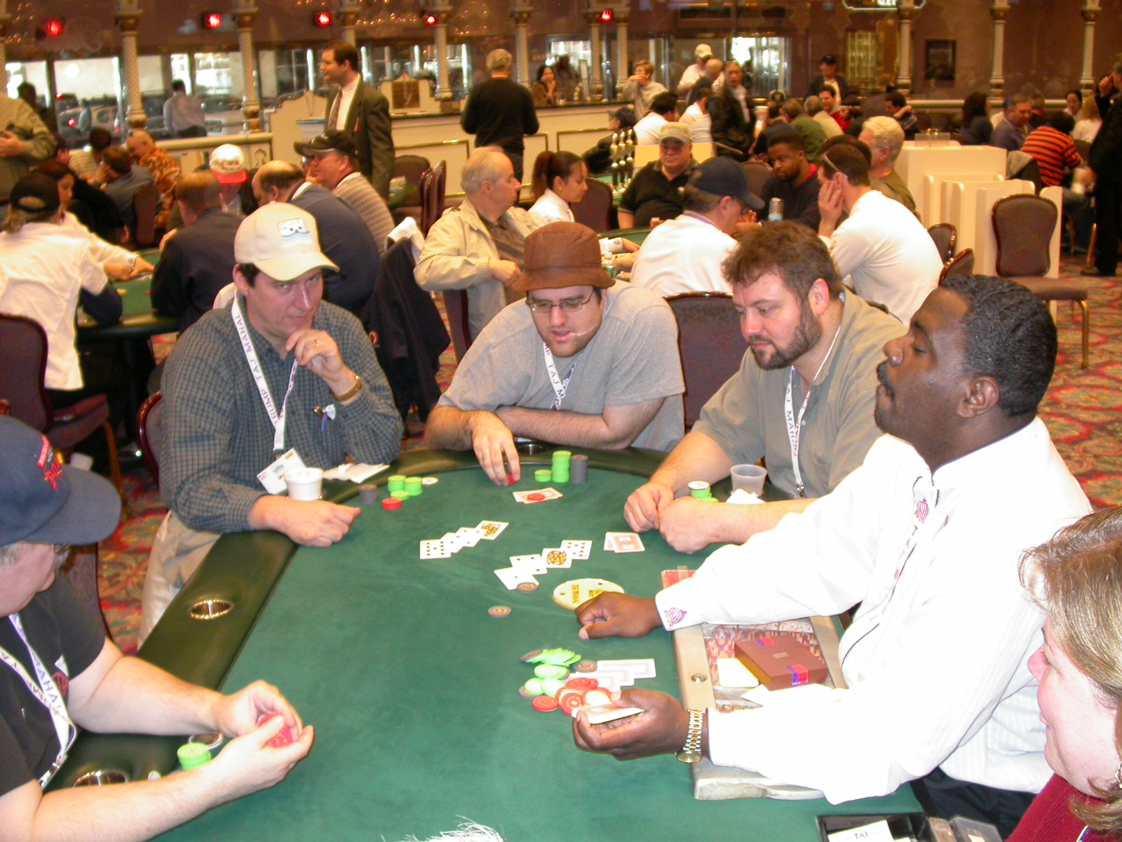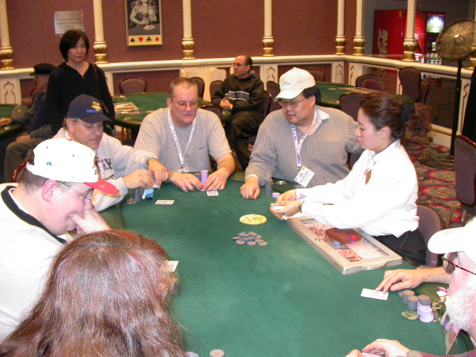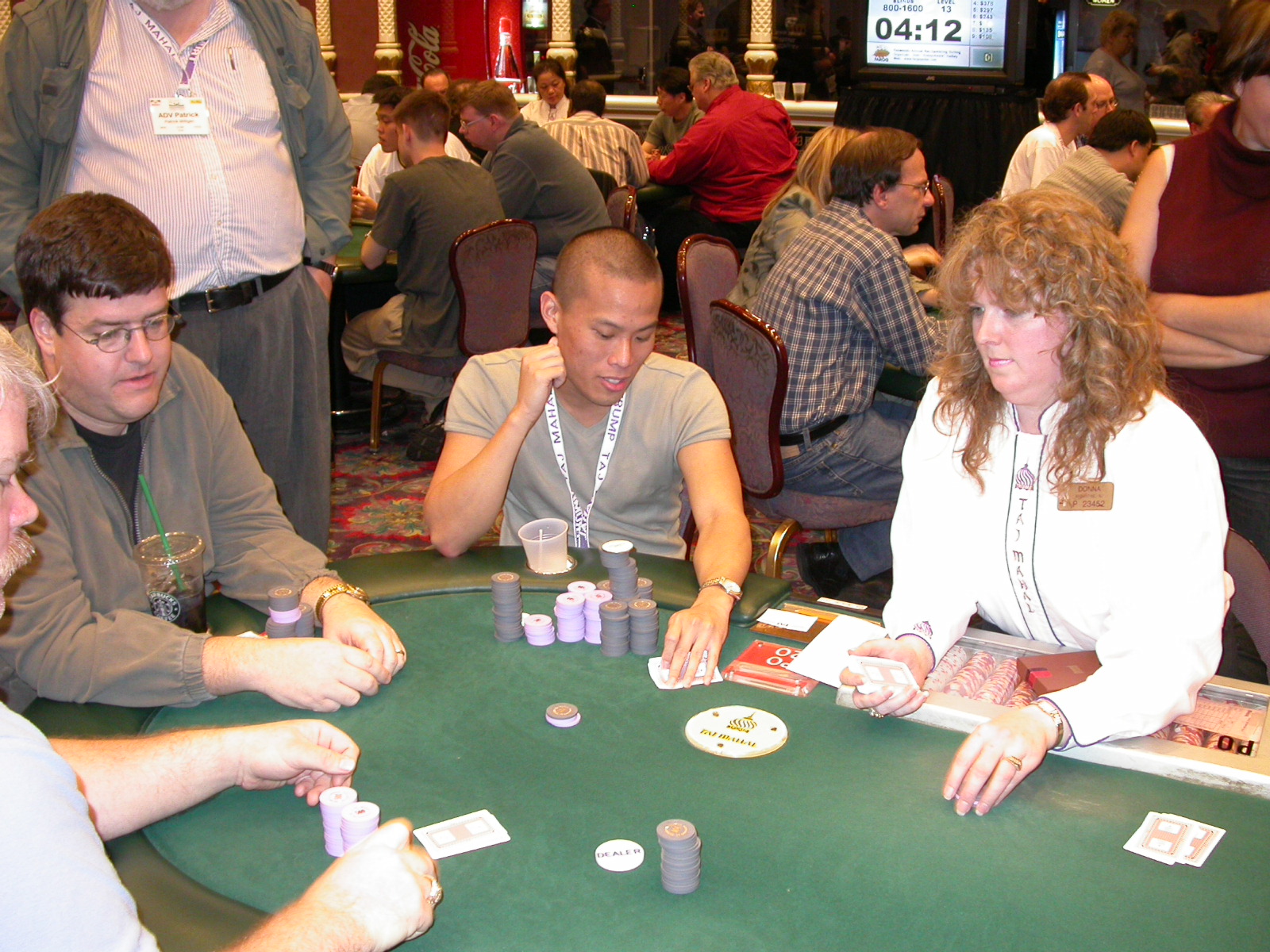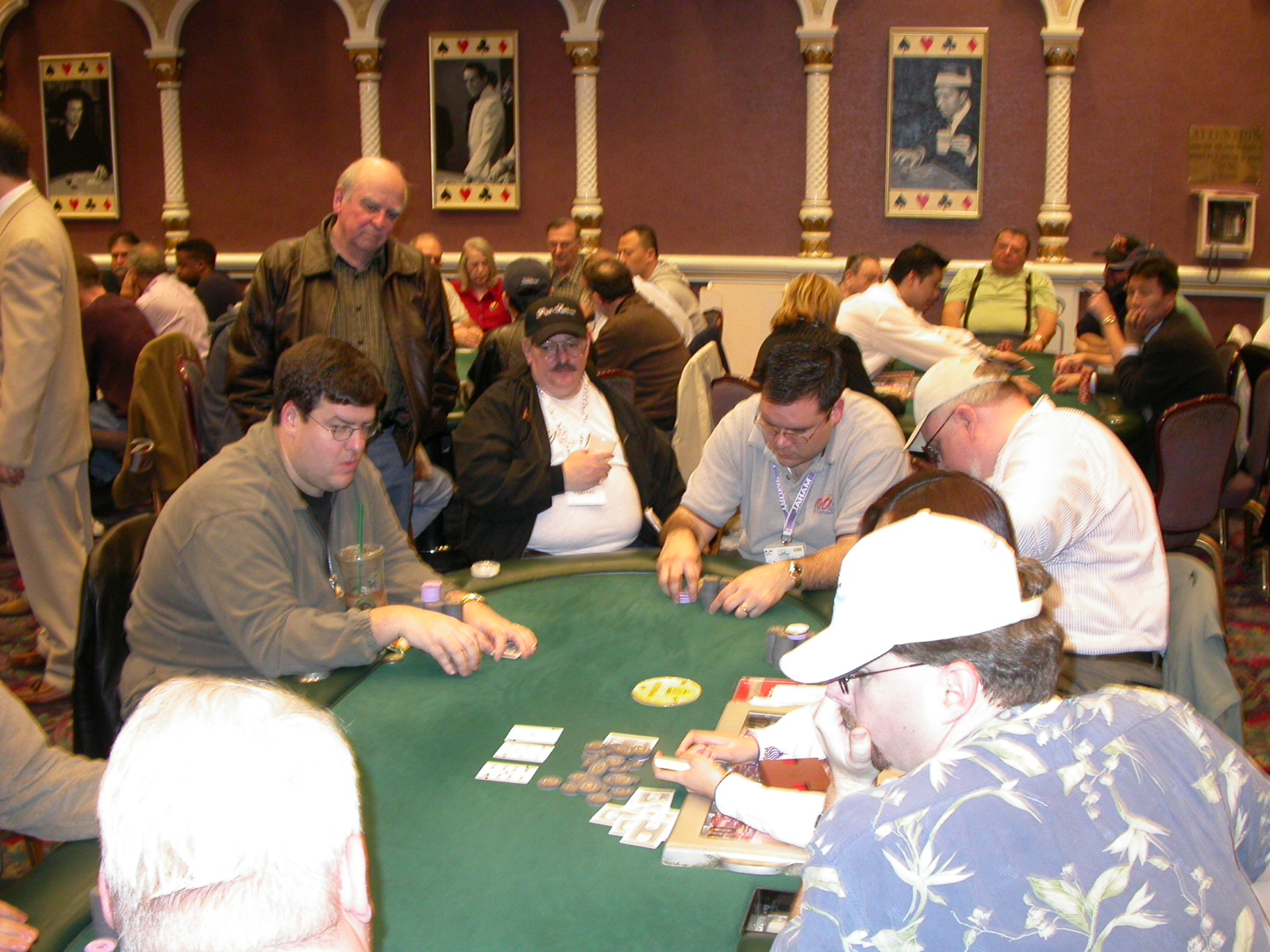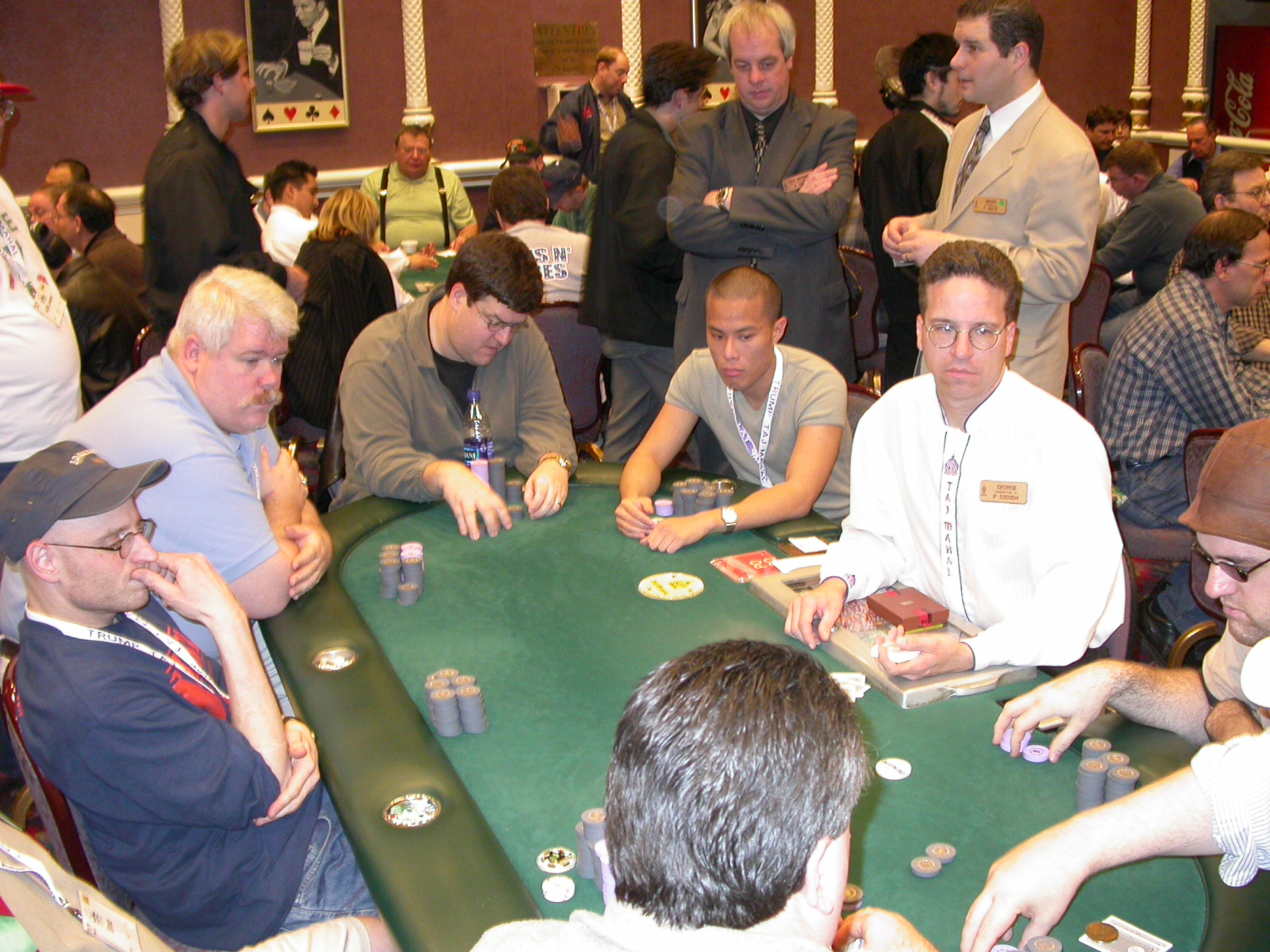 Standard trip report disclaimer: All events are reconstructed to the best of my memory; however, my memory seemed far worse this trip than others. I am a very poor person with both names and faces. As a point of fact, I may be the worst poker player there is when it comes to remembering names and faces. If I screw up your name, confuse you for someone else, make an inaccurate physical description of you, or completely forget about you, rest assured that it's my fault and I enjoyed your company. Russ Rosenblum -- whom I introduced myself to twice in three hours -- can attest to the complete ineptitude of my facial recognition skills. My severe sleep deprivation made my normally poor memory even worse both with regards to faces and incidents. For those of you who like lots of detailed poker action, I can't remember the hands well enough for you to get a lot out of this report. For those of you who like wacky antics outside of the poker room, there are none. For those of you who like meandering, vague recollections of crap...man, you're in luck! Monday, March 17 It was with my great anticipation that I embarked on a number of firsts. Not only was this to be my first ARG event, this was to be my first trip to the East Coast, my first time leaving Costa Rica (albeit since arriving last September), my first trip to New York, my first trip to the arena of the New Jersey Devils, a team I've had an affinity for since 1988. It was thus with no slight disappointment that my trip was delayed leaving Costa Rica, both boarding and departing. However, this was a very minor commuting bad beat, as the pilot evidently gunned it, or the winds were in our favour, or something, arriving just a few minutes late. Once in Newark, New Jersey, I was greeting by my excellent Newark-area hostess Christine Gonzalez and her red Jeep. We commuted quickly back to her place and to Continental Airlines Arena for a much anticipated game between the Devils and the rival Philadelphia Flyers. First place in the NHL's Atlantic Division was up for grabs, but the Devils didn't play like it, putting up a dispirited effort in a disappointing 4-2 loss. The game was not sold out, but the crowd was sufficiently rowdy to make up for the vacant seats. That it was St. Patrick's Day likely didn't hurt. Of note, President Bush's speech was broadcast in the stadium. Despite what seems to be a fair bit of anti-war sentiment in the area, the speech received four loud ovations. Tuesday, March 18 Today was my one day to do what I think everyone else in the world but me has done already -- tour New York City. What a vibrant city, so full of life, so...purposeful. I felt almost ashamed to be a tourist, since those around me all seemed to have somewhere to go; I felt as though I were a parasite, sucking time and leisure out of a city which had precious little of either to spare. New Yorkers, contrary to their reputation (or what I thought was their reputation), are a friendly species, but in a different sort of friendliness. After taking a two-hour cruise around Manhattan Island, I visited (in order) Times Square, Rockefeller Plaza, the New York Stock Exchange, the WTC site. Although I'd been told that there isn't much to see at the WTC site -- and in fact, this is true enough -- I felt very much compelled to see it, and am very much glad I did. I didn't do so to pay my respects to the victims and heroes of 9/11 (btw, I dislike how these are considered equivalent sets), although I did. I mused how odd it was that an event so horrific, tragic and damaging to the world could paradoxically bring forth so much positivity and strength, as we somehow find a profound connection with complete strangers. It is strange. I returned via subway to the port authority terminal, where I embarked back to Tina's. We went out for dinner, then to a bus station named Cheesequake (there has to be some interesting etymology surrounding that name) for the 2-hour bus to Atlantic City. One thing I don't ever think I've done before is travel a very long time and distance to a major cardroom and not play that first night, regardless of how tired I'd been. Unfortunately (perhaps), I did have to do this on Tuesday night. The Taj has a weird policy regarding opening new games and changing and breaking existing games. There were some 14 or 15 names on the 10/20 list, but no game opened for over two hours. When I realized I was falling asleep at the table waiting for games, I decided that sleep to start again in the morning would be the better play. Wednesday, March 19 / early Thursday, March 20 The waiting list strangeness continued Monday. I started playing a must-move 10/20 game at around 8am (and it was a surprisingly good 8am game), and also had my name on 15/30. There were two 10/20s and a number of players there were also on the 15 list, like me. At some point, a floorwoman goes to the main 10/20 and says that she knows a number of players from that game are also on the 15/30 list, so instead of breaking the game and starting a 15/30, she asks if anyone objects to making this game a 15/30. Sounds reasonable enough. Two players object, so the game does not change. Again, reasonable enough. However, the policy is that despite the fact there are well over 10 players actually playing 10/20 who are on the 15/30 list, they do not open a 15/30 game! Evidently, the rationale is that opening a 15/30 would break up the 10/20 -- the same 10/20 in which eight of ten players would rather play at 15/30, despite a huge 15/30 list. This all seemed par for the course to the locals, but seemed simply quite nuts to me. I also had my introduction to time pots Wednesday. For those who do not know, a time pot is where instead of all active players paying the time charge on the half hour, one player fronts the entire amount for the table. For example, time in a 10/20 game is $5 on the half hour, so at a full table, the table's time is $50. The time is then returned to the player posting the ti