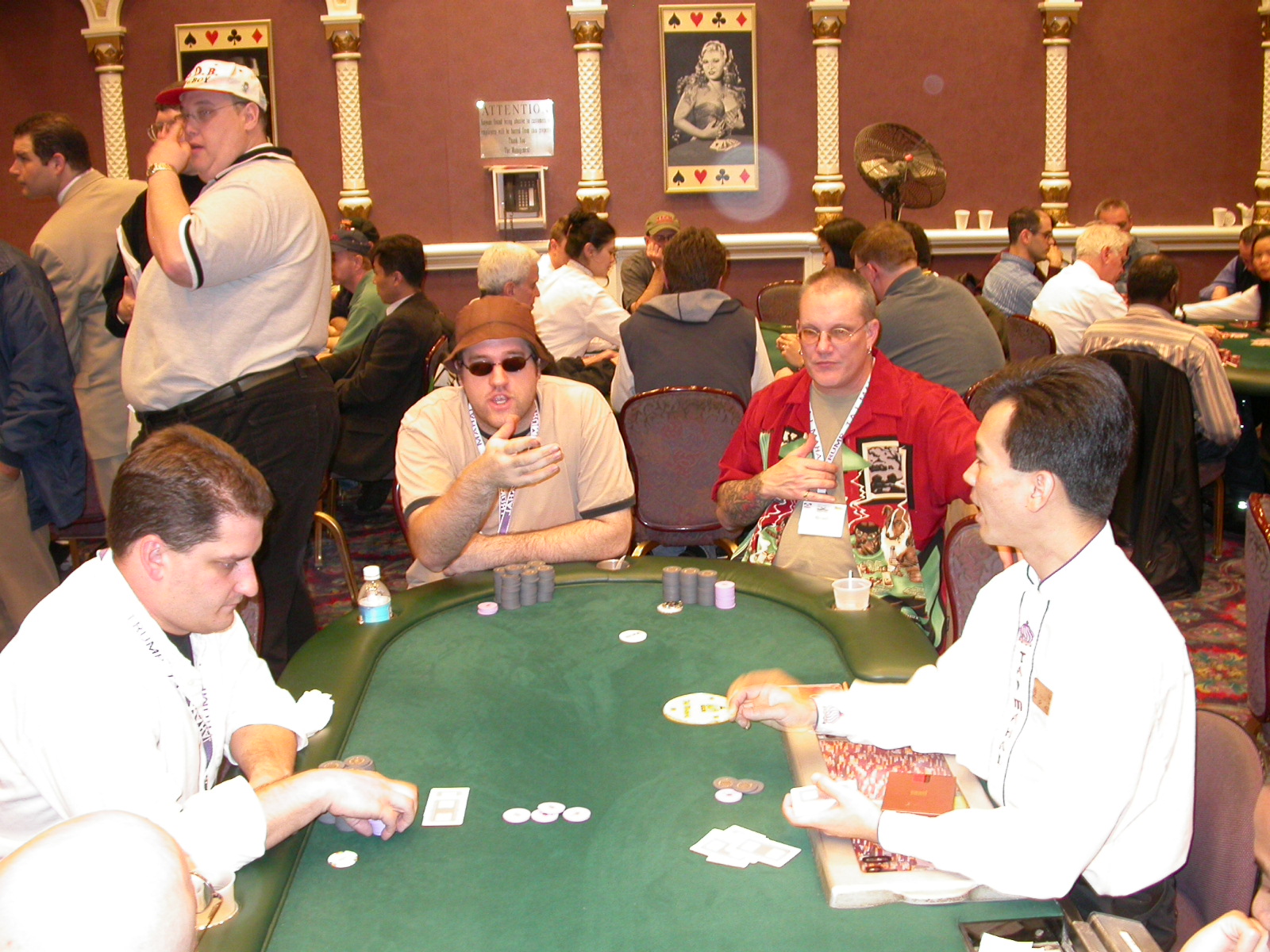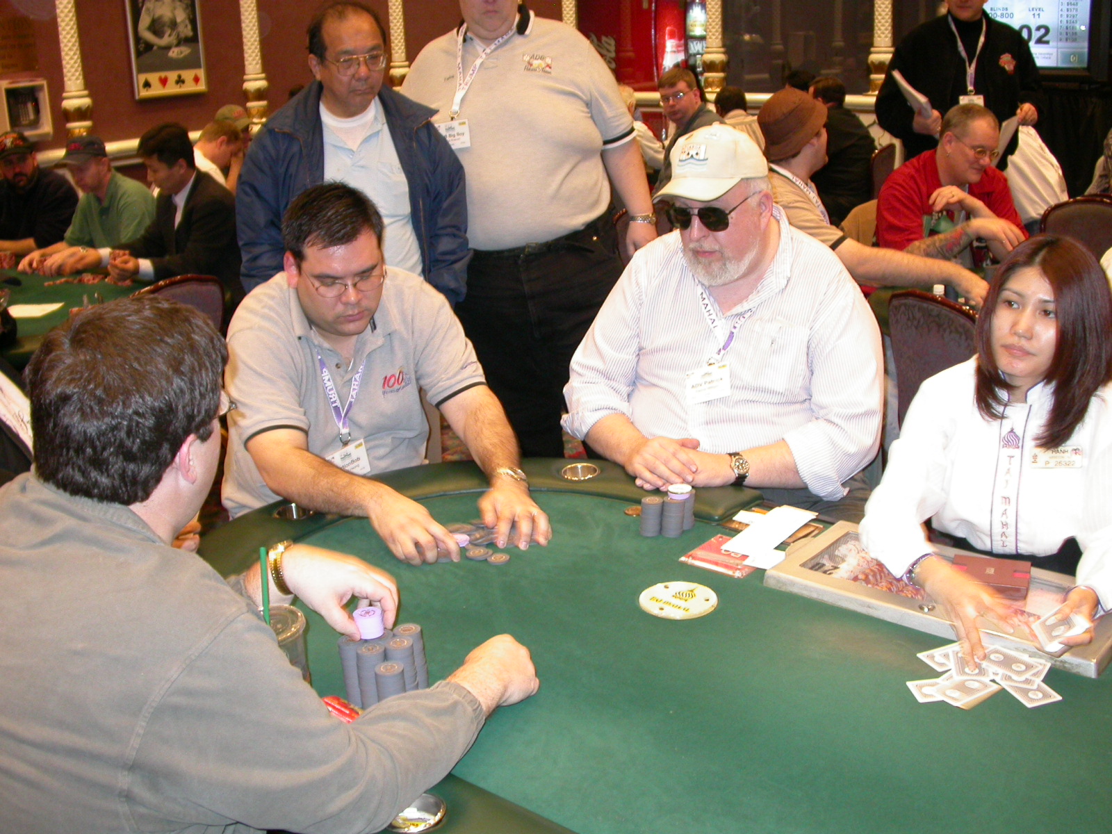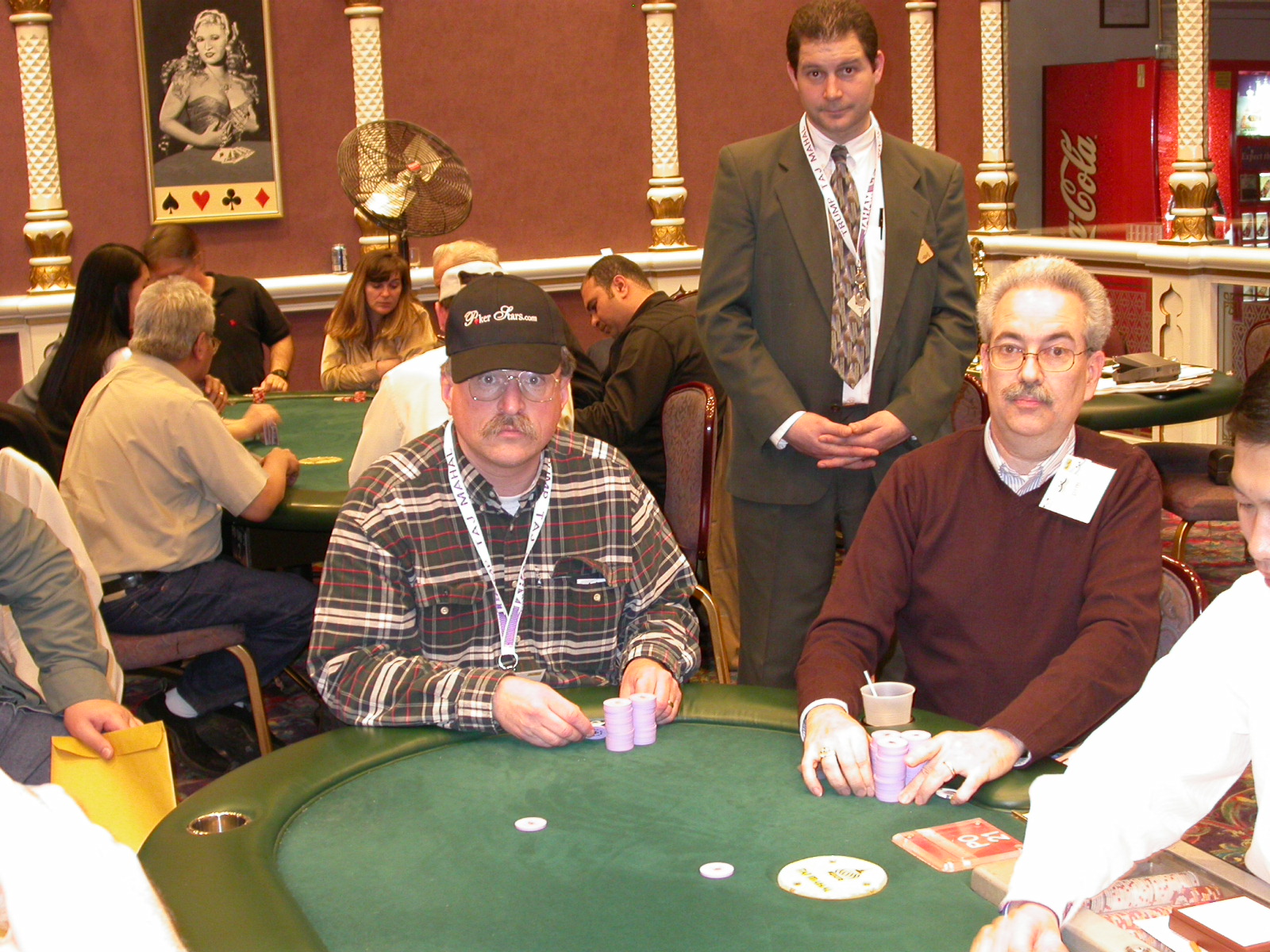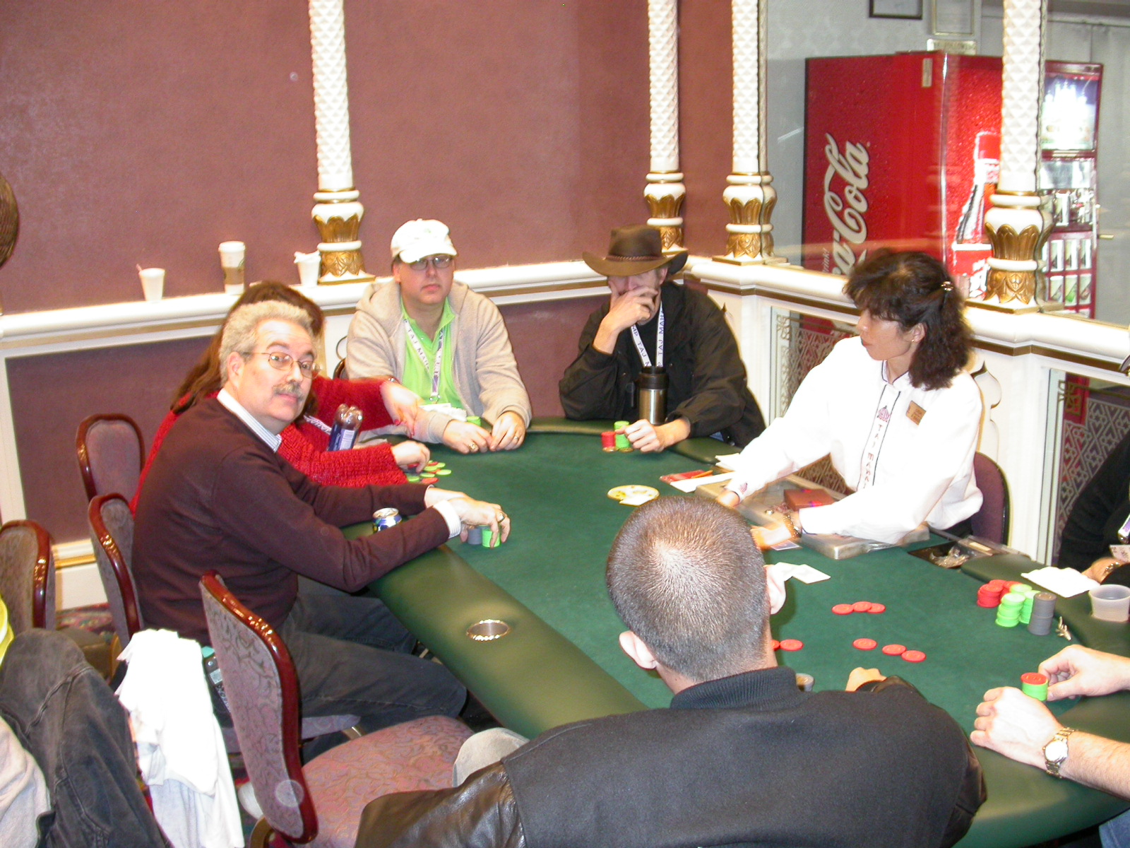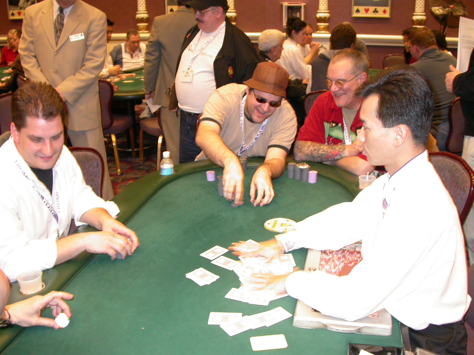 Standard trip report disclaimer: All events are reconstructed to the best of my memory; however, my memory seemed far worse this trip than others. I am a very poor person with both names and faces. As a point of fact, I may be the worst poker player there is when it comes to remembering names and faces. If I screw up your name, confuse you for someone else, make an inaccurate physical description of you, or completely forget about you, rest assured that it's my fault and I enjoyed your company. Russ Rosenblum -- whom I introduced myself to twice in three hours -- can attest to the complete ineptitude of my facial recognition skills. My severe sleep deprivation made my normally poor memory even worse both with regards to faces and incidents. For those of you who like lots of detailed poker action, I can't remember the hands well enough for you to get a lot out of this report. For those of you who like wacky antics outside of the poker room, there are none. For those of you who like meandering, vague recollections of crap...man, you're in luck! Monday, March 17 It was with my great anticipation that I embarked on a number of firsts. Not only was this to be my first ARG event, this was to be my first trip to the East Coast, my first time leaving Costa Rica (albeit since arriving last September), my first trip to New York, my first trip to the arena of the New Jersey Devils, a team I've had an affinity for since 1988. It was thus with no slight disappointment that my trip was delayed leaving Costa Rica, both boarding and departing. However, this was a very minor commuting bad beat, as the pilot evidently gunned it, or the winds were in our favour, or something, arriving just a few minutes late. Once in Newark, New Jersey, I was greeting by my excellent Newark-area hostess Christine Gonzalez and her red Jeep. We commuted quickly back to her place and to Continental Airlines Arena for a much anticipated game between the Devils and the rival Philadelphia Flyers. First place in the NHL's Atlantic Division was up for grabs, but the Devils didn't play like it, putting up a dispirited effort in a disappointing 4-2 loss. The game was not sold out, but the crowd was sufficiently rowdy to make up for the vacant seats. That it was St. Patrick's Day likely didn't hurt. Of note, President Bush's speech was broadcast in the stadium. Despite what seems to be a fair bit of anti-war sentiment in the area, the speech received four loud ovations. Tuesday, March 18 Today was my one day to do what I think everyone else in the world but me has done already -- tour New York City. What a vibrant city, so full of life, so...purposeful. I felt almost ashamed to be a tourist, since those around me all seemed to have somewhere to go; I felt as though I were a parasite, sucking time and leisure out of a city which had precious little of either to spare. New Yorkers, contrary to their reputation (or what I thought was their reputation), are a friendly species, but in a different sort of friendliness. After taking a two-hour cruise around Manhattan Island, I visited (in order) Times Square, Rockefeller Plaza, the New York Stock Exchange, the WTC site. Although I'd been told that there isn't much to see at the WTC site -- and in fact, this is true enough -- I felt very much compelled to see it, and am very much glad I did. I didn't do so to pay my respects to the victims and heroes of 9/11 (btw, I dislike how these are considered equivalent sets), although I did. I mused how odd it was that an event so horrific, tragic and damaging to the world could paradoxically bring forth so much positivity and strength, as we somehow find a profound connection with complete strangers. It is strange. I returned via subway to the port authority terminal, where I embarked back to Tina's. We went out for dinner, then to a bus station named Cheesequake (there has to be some interesting etymology surrounding that name) for the 2-hour bus to Atlantic City. One thing I don't ever think I've done before is travel a very long time and distance to a major cardroom and not play that first night, regardless of how tired I'd been. Unfortunately (perhaps), I did have to do this on Tuesday night. The Taj has a weird policy regarding opening new games and changing and breaking existing games. There were some 14 or 15 names on the 10/20 list, but no game opened for over two hours. When I realized I was falling asleep at the table waiting for games, I decided that sleep to start again in the morning would be the better play. Wednesday, March 19 / early Thursday, March 20 The waiting list strangeness continued Monday. I started playing a must-move 10/20 game at around 8am (and it was a surprisingly good 8am game), and also had my name on 15/30. There were two 10/20s and a number of players there were also on the 15 list, like me. At some point, a floorwoman goes to the main 10/20 and says that she knows a number of players from that game are also on the 15/30 list, so instead of breaking the game and starting a 15/30, she asks if anyone objects to making this game a 15/30. Sounds reasonable enough. Two players object, so the game does not change. Again, reasonable enough. However, the policy is that despite the fact there are well over 10 players actually playing 10/20 who are on the 15/30 list, they do not open a 15/30 game! Evidently, the rationale is that opening a 15/30 would break up the 10/20 -- the same 10/20 in which eight of ten players would rather play at 15/30, despite a huge 15/30 list. This all seemed par for the course to the locals, but seemed simply quite nuts to me. I also had my introduction to time pots Wednesday. For those who do not know, a time pot is where instead of all active players paying the time charge on the half hour, one player fronts the entire amount for the table. For example, time in a 10/20 game is $5 on the half hour, so at a full table, the table's time is $50. The time is then returned to the player posting the ti