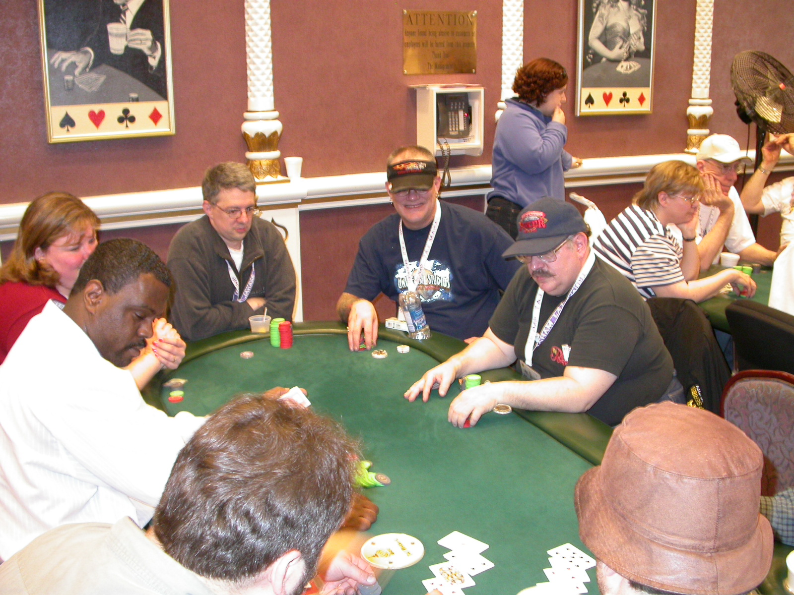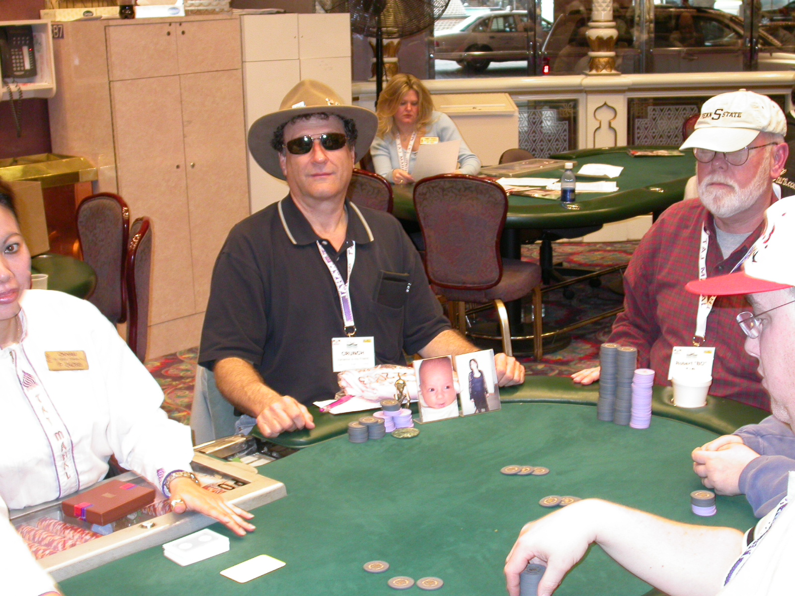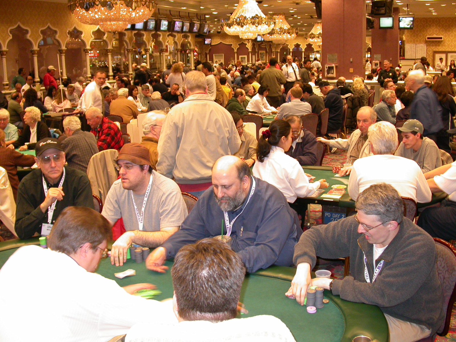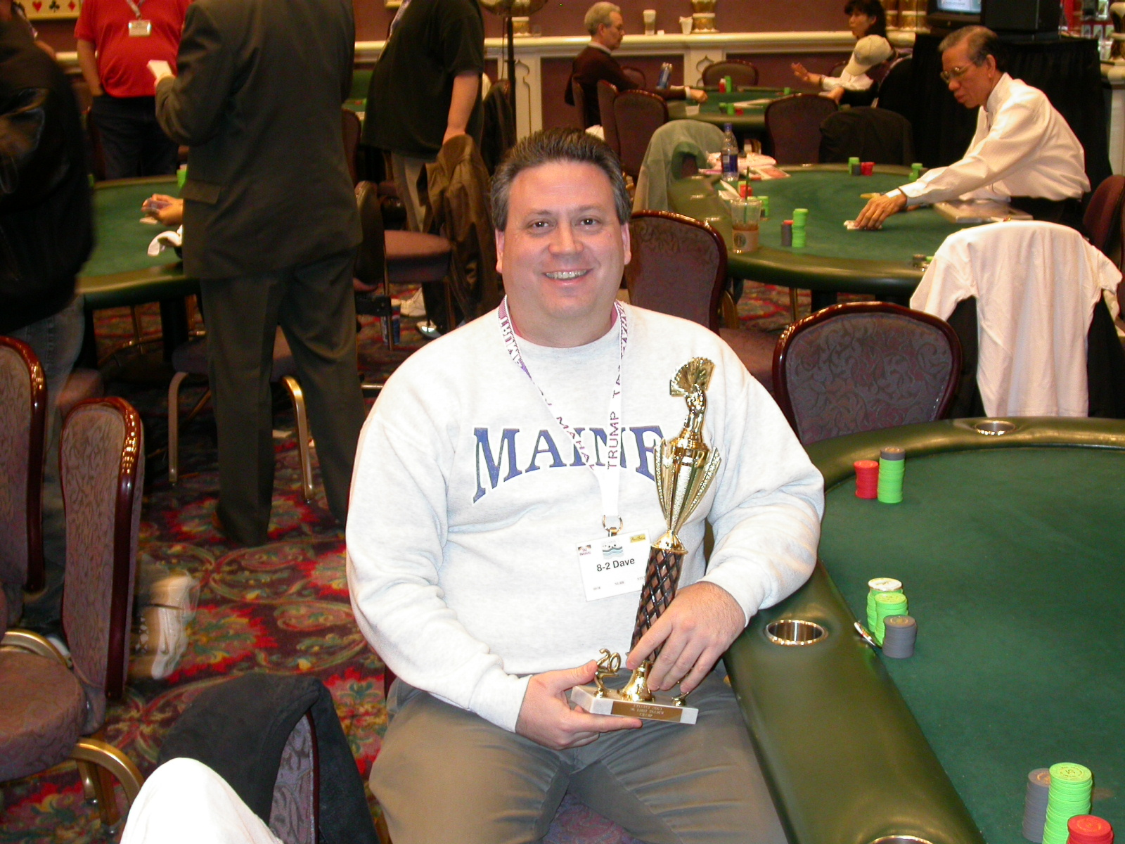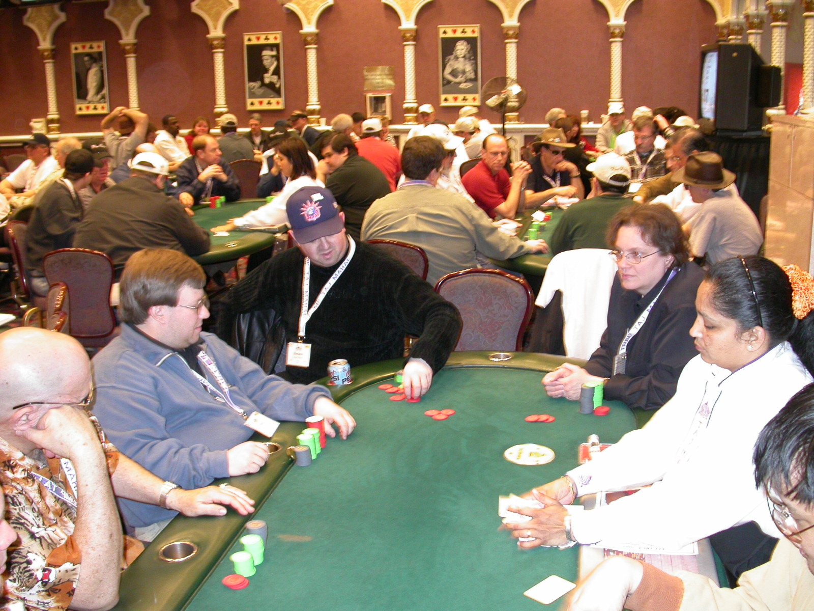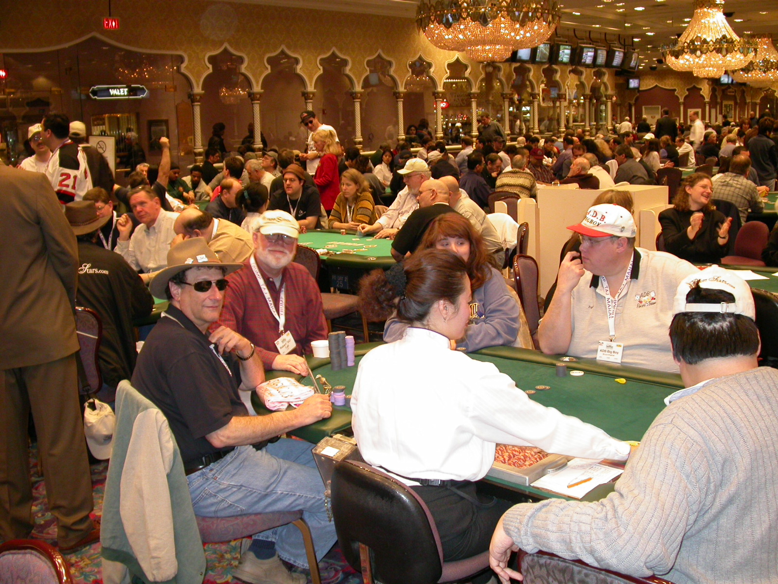 Standard trip report disclaimer: All events are reconstructed to the best of my memory; however, my memory seemed far worse this trip than others. I am a very poor person with both names and faces. As a point of fact, I may be the worst poker player there is when it comes to remembering names and faces. If I screw up your name, confuse you for someone else, make an inaccurate physical description of you, or completely forget about you, rest assured that it's my fault and I enjoyed your company. Russ Rosenblum -- whom I introduced myself to twice in three hours -- can attest to the complete ineptitude of my facial recognition skills. My severe sleep deprivation made my normally poor memory even worse both with regards to faces and incidents. For those of you who like lots of detailed poker action, I can't remember the hands well enough for you to get a lot out of this report. For those of you who like wacky antics outside of the poker room, there are none. For those of you who like meandering, vague recollections of crap...man, you're in luck! Monday, March 17 It was with my great anticipation that I embarked on a number of firsts. Not only was this to be my first ARG event, this was to be my first trip to the East Coast, my first time leaving Costa Rica (albeit since arriving last September), my first trip to New York, my first trip to the arena of the New Jersey Devils, a team I've had an affinity for since 1988. It was thus with no slight disappointment that my trip was delayed leaving Costa Rica, both boarding and departing. However, this was a very minor commuting bad beat, as the pilot evidently gunned it, or the winds were in our favour, or something, arriving just a few minutes late. Once in Newark, New Jersey, I was greeting by my excellent Newark-area hostess Christine Gonzalez and her red Jeep. We commuted quickly back to her place and to Continental Airlines Arena for a much anticipated game between the Devils and the rival Philadelphia Flyers. First place in the NHL's Atlantic Division was up for grabs, but the Devils didn't play like it, putting up a dispirited effort in a disappointing 4-2 loss. The game was not sold out, but the crowd was sufficiently rowdy to make up for the vacant seats. That it was St. Patrick's Day likely didn't hurt. Of note, President Bush's speech was broadcast in the stadium. Despite what seems to be a fair bit of anti-war sentiment in the area, the speech received four loud ovations. Tuesday, March 18 Today was my one day to do what I think everyone else in the world but me has done already -- tour New York City. What a vibrant city, so full of life, so...purposeful. I felt almost ashamed to be a tourist, since those around me all seemed to have somewhere to go; I felt as though I were a parasite, sucking time and leisure out of a city which had precious little of either to spare. New Yorkers, contrary to their reputation (or what I thought was their reputation), are a friendly species, but in a different sort of friendliness. After taking a two-hour cruise around Manhattan Island, I visited (in order) Times Square, Rockefeller Plaza, the New York Stock Exchange, the WTC site. Although I'd been told that there isn't much to see at the WTC site -- and in fact, this is true enough -- I felt very much compelled to see it, and am very much glad I did. I didn't do so to pay my respects to the victims and heroes of 9/11 (btw, I dislike how these are considered equivalent sets), although I did. I mused how odd it was that an event so horrific, tragic and damaging to the world could paradoxically bring forth so much positivity and strength, as we somehow find a profound connection with complete strangers. It is strange. I returned via subway to the port authority terminal, where I embarked back to Tina's. We went out for dinner, then to a bus station named Cheesequake (there has to be some interesting etymology surrounding that name) for the 2-hour bus to Atlantic City. One thing I don't ever think I've done before is travel a very long time and distance to a major cardroom and not play that first night, regardless of how tired I'd been. Unfortunately (perhaps), I did have to do this on Tuesday night. The Taj has a weird policy regarding opening new games and changing and breaking existing games. There were some 14 or 15 names on the 10/20 list, but no game opened for over two hours. When I realized I was falling asleep at the table waiting for games, I decided that sleep to start again in the morning would be the better play. Wednesday, March 19 / early Thursday, March 20 The waiting list strangeness continued Monday. I started playing a must-move 10/20 game at around 8am (and it was a surprisingly good 8am game), and also had my name on 15/30. There were two 10/20s and a number of players there were also on the 15 list, like me. At some point, a floorwoman goes to the main 10/20 and says that she knows a number of players from that game are also on the 15/30 list, so instead of breaking the game and starting a 15/30, she asks if anyone objects to making this game a 15/30. Sounds reasonable enough. Two players object, so the game does not change. Again, reasonable enough. However, the policy is that despite the fact there are well over 10 players actually playing 10/20 who are on the 15/30 list, they do not open a 15/30 game! Evidently, the rationale is that opening a 15/30 would break up the 10/20 -- the same 10/20 in which eight of ten players would rather play at 15/30, despite a huge 15/30 list. This all seemed par for the course to the locals, but seemed simply quite nuts to me. I also had my introduction to time pots Wednesday. For those who do not know, a time pot is where instead of all active players paying the time charge on the half hour, one player fronts the entire amount for the table. For example, time in a 10/20 game is $5 on the half hour, so at a full table, the table's time is $50. The time is then returned to the player posting the ti