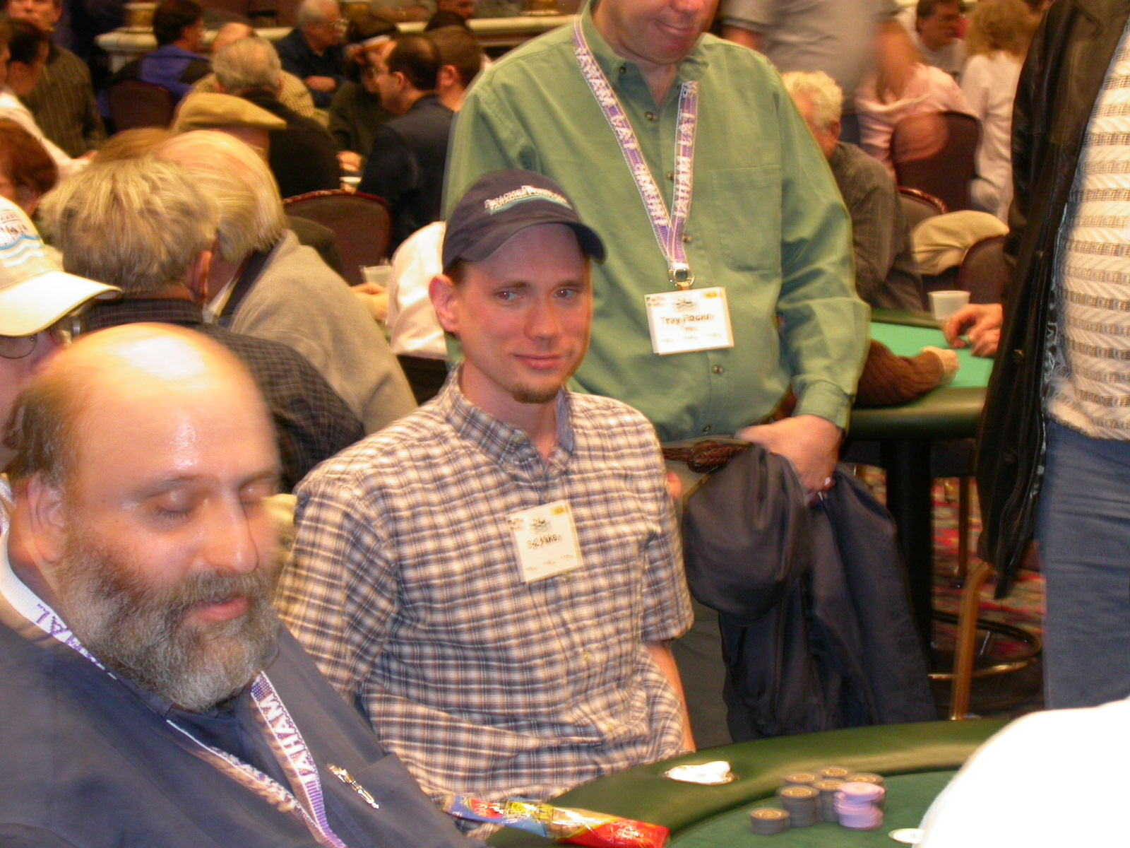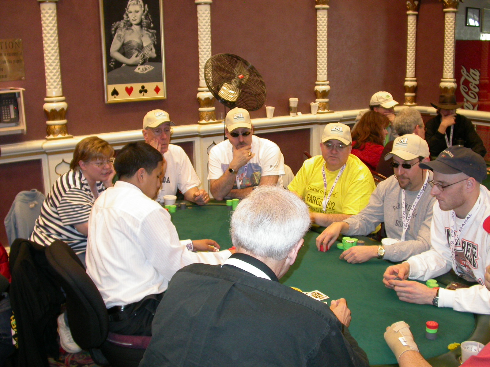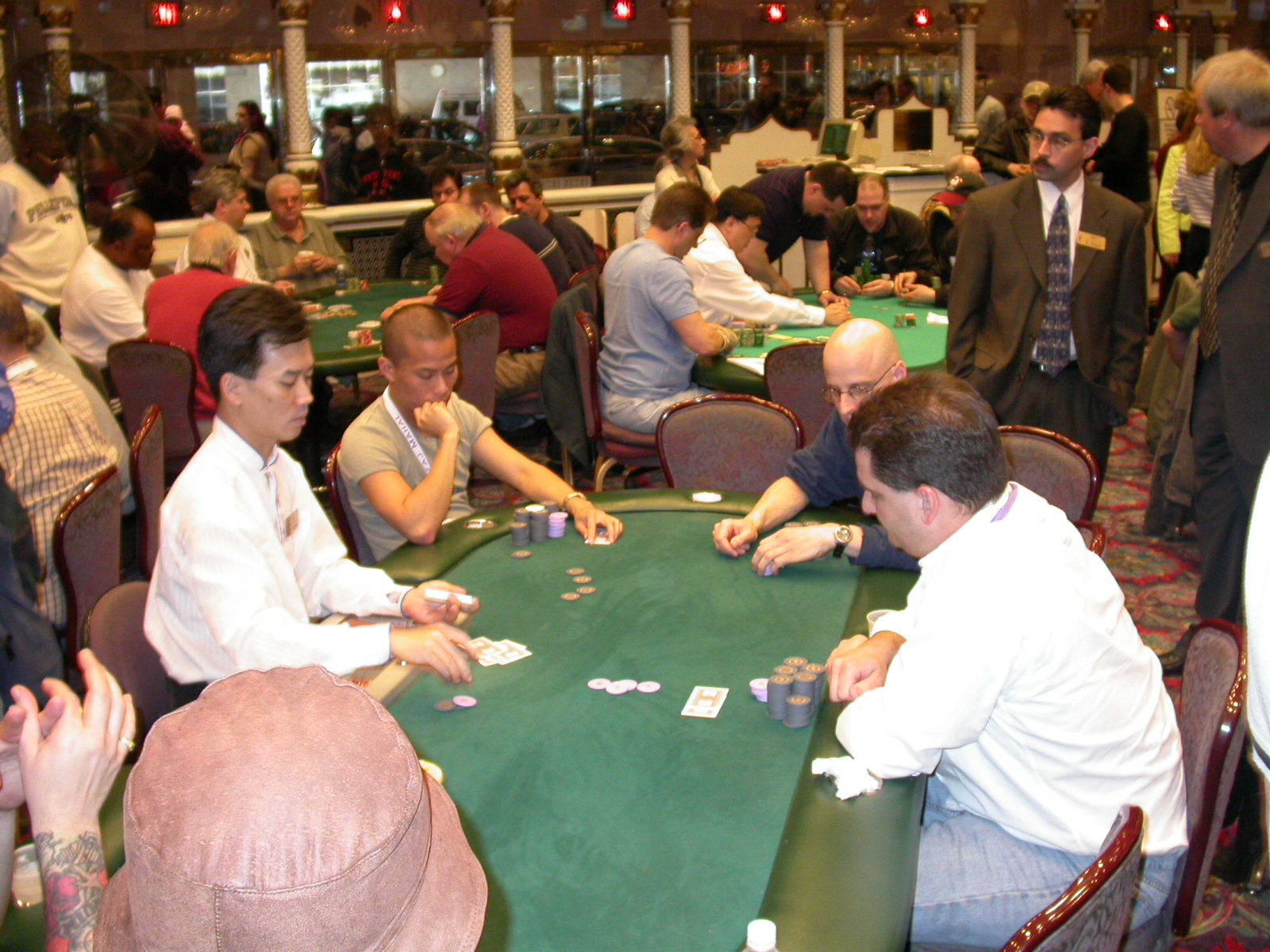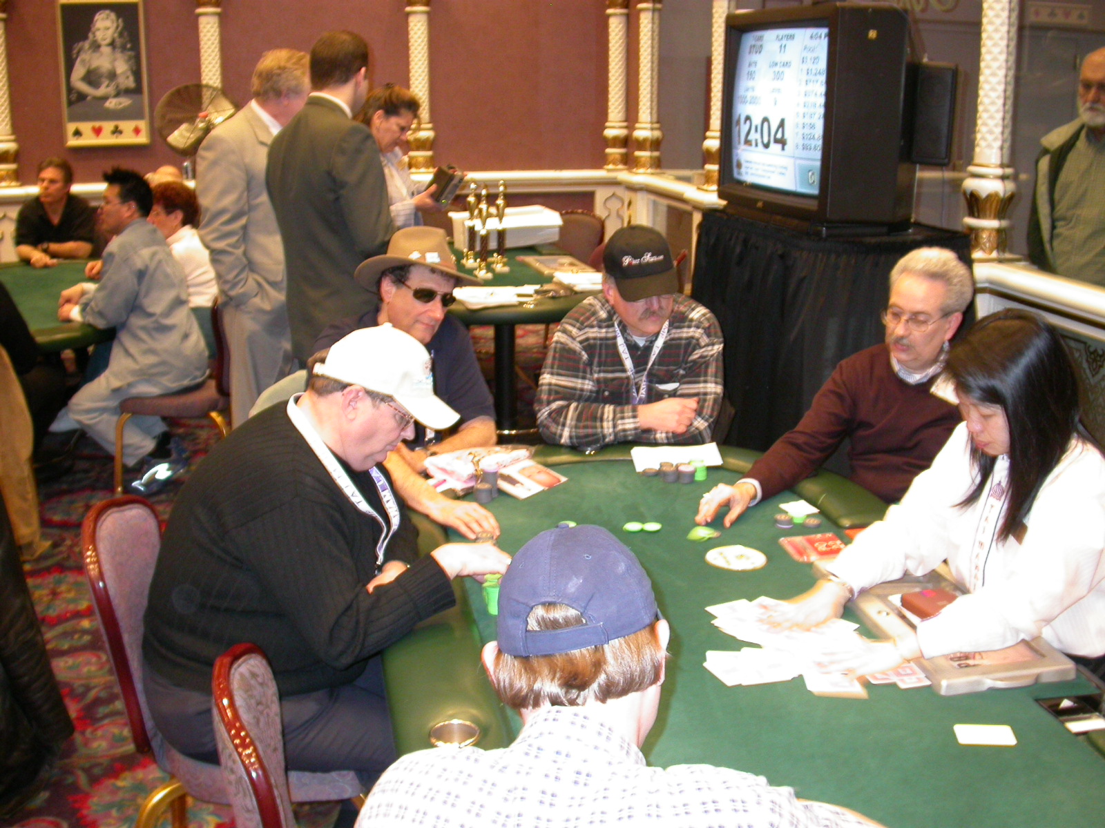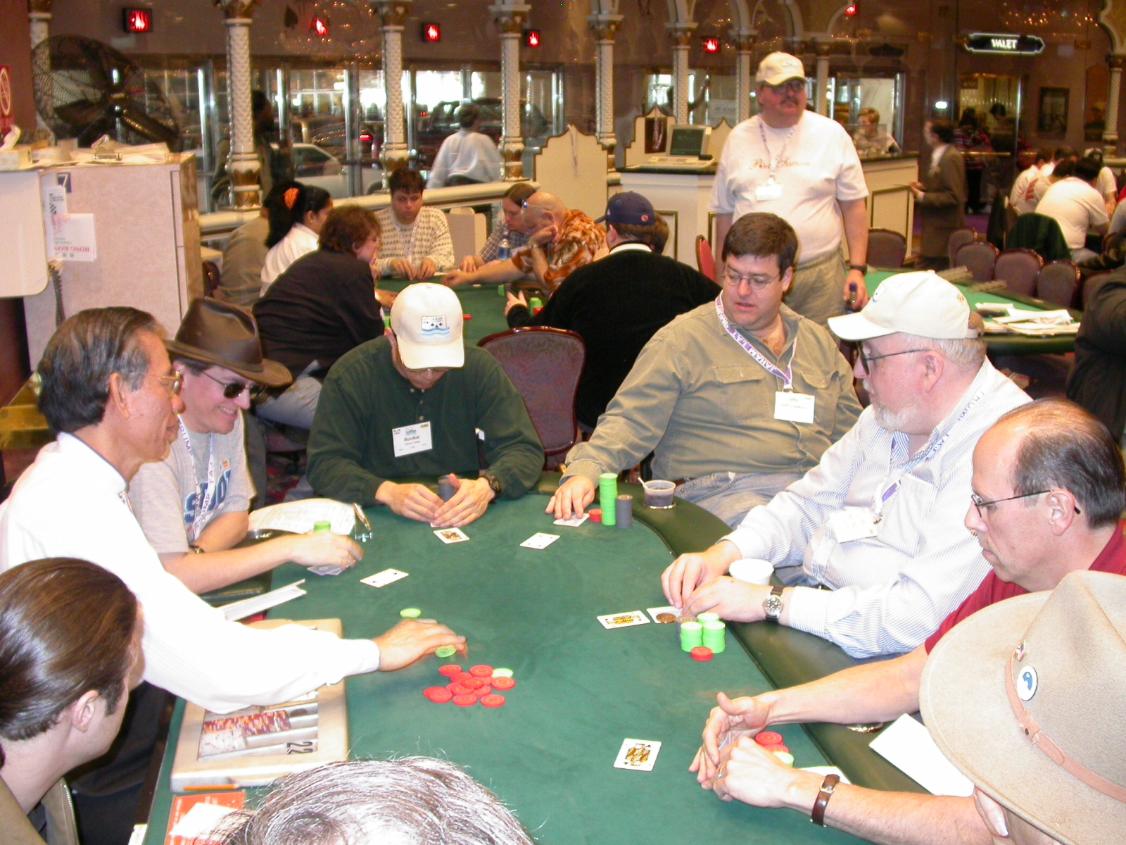 Standard trip report disclaimer: All events are reconstructed to the best of my memory; however, my memory seemed far worse this trip than others. I am a very poor person with both names and faces. As a point of fact, I may be the worst poker player there is when it comes to remembering names and faces. If I screw up your name, confuse you for someone else, make an inaccurate physical description of you, or completely forget about you, rest assured that it's my fault and I enjoyed your company. Russ Rosenblum -- whom I introduced myself to twice in three hours -- can attest to the complete ineptitude of my facial recognition skills. My severe sleep deprivation made my normally poor memory even worse both with regards to faces and incidents. For those of you who like lots of detailed poker action, I can't remember the hands well enough for you to get a lot out of this report. For those of you who like wacky antics outside of the poker room, there are none. For those of you who like meandering, vague recollections of crap...man, you're in luck! Monday, March 17 It was with my great anticipation that I embarked on a number of firsts. Not only was this to be my first ARG event, this was to be my first trip to the East Coast, my first time leaving Costa Rica (albeit since arriving last September), my first trip to New York, my first trip to the arena of the New Jersey Devils, a team I've had an affinity for since 1988. It was thus with no slight disappointment that my trip was delayed leaving Costa Rica, both boarding and departing. However, this was a very minor commuting bad beat, as the pilot evidently gunned it, or the winds were in our favour, or something, arriving just a few minutes late. Once in Newark, New Jersey, I was greeting by my excellent Newark-area hostess Christine Gonzalez and her red Jeep. We commuted quickly back to her place and to Continental Airlines Arena for a much anticipated game between the Devils and the rival Philadelphia Flyers. First place in the NHL's Atlantic Division was up for grabs, but the Devils didn't play like it, putting up a dispirited effort in a disappointing 4-2 loss. The game was not sold out, but the crowd was sufficiently rowdy to make up for the vacant seats. That it was St. Patrick's Day likely didn't hurt. Of note, President Bush's speech was broadcast in the stadium. Despite what seems to be a fair bit of anti-war sentiment in the area, the speech received four loud ovations. Tuesday, March 18 Today was my one day to do what I think everyone else in the world but me has done already -- tour New York City. What a vibrant city, so full of life, so...purposeful. I felt almost ashamed to be a tourist, since those around me all seemed to have somewhere to go; I felt as though I were a parasite, sucking time and leisure out of a city which had precious little of either to spare. New Yorkers, contrary to their reputation (or what I thought was their reputation), are a friendly species, but in a different sort of friendliness. After taking a two-hour cruise around Manhattan Island, I visited (in order) Times Square, Rockefeller Plaza, the New York Stock Exchange, the WTC site. Although I'd been told that there isn't much to see at the WTC site -- and in fact, this is true enough -- I felt very much compelled to see it, and am very much glad I did. I didn't do so to pay my respects to the victims and heroes of 9/11 (btw, I dislike how these are considered equivalent sets), although I did. I mused how odd it was that an event so horrific, tragic and damaging to the world could paradoxically bring forth so much positivity and strength, as we somehow find a profound connection with complete strangers. It is strange. I returned via subway to the port authority terminal, where I embarked back to Tina's. We went out for dinner, then to a bus station named Cheesequake (there has to be some interesting etymology surrounding that name) for the 2-hour bus to Atlantic City. One thing I don't ever think I've done before is travel a very long time and distance to a major cardroom and not play that first night, regardless of how tired I'd been. Unfortunately (perhaps), I did have to do this on Tuesday night. The Taj has a weird policy regarding opening new games and changing and breaking existing games. There were some 14 or 15 names on the 10/20 list, but no game opened for over two hours. When I realized I was falling asleep at the table waiting for games, I decided that sleep to start again in the morning would be the better play. Wednesday, March 19 / early Thursday, March 20 The waiting list strangeness continued Monday. I started playing a must-move 10/20 game at around 8am (and it was a surprisingly good 8am game), and also had my name on 15/30. There were two 10/20s and a number of players there were also on the 15 list, like me. At some point, a floorwoman goes to the main 10/20 and says that she knows a number of players from that game are also on the 15/30 list, so instead of breaking the game and starting a 15/30, she asks if anyone objects to making this game a 15/30. Sounds reasonable enough. Two players object, so the game does not change. Again, reasonable enough. However, the policy is that despite the fact there are well over 10 players actually playing 10/20 who are on the 15/30 list, they do not open a 15/30 game! Evidently, the rationale is that opening a 15/30 would break up the 10/20 -- the same 10/20 in which eight of ten players would rather play at 15/30, despite a huge 15/30 list. This all seemed par for the course to the locals, but seemed simply quite nuts to me. I also had my introduction to time pots Wednesday. For those who do not know, a time pot is where instead of all active players paying the time charge on the half hour, one player fronts the entire amount for the table. For example, time in a 10/20 game is $5 on the half hour, so at a full table, the table's time is $50. The time is then returned to the player posting the ti