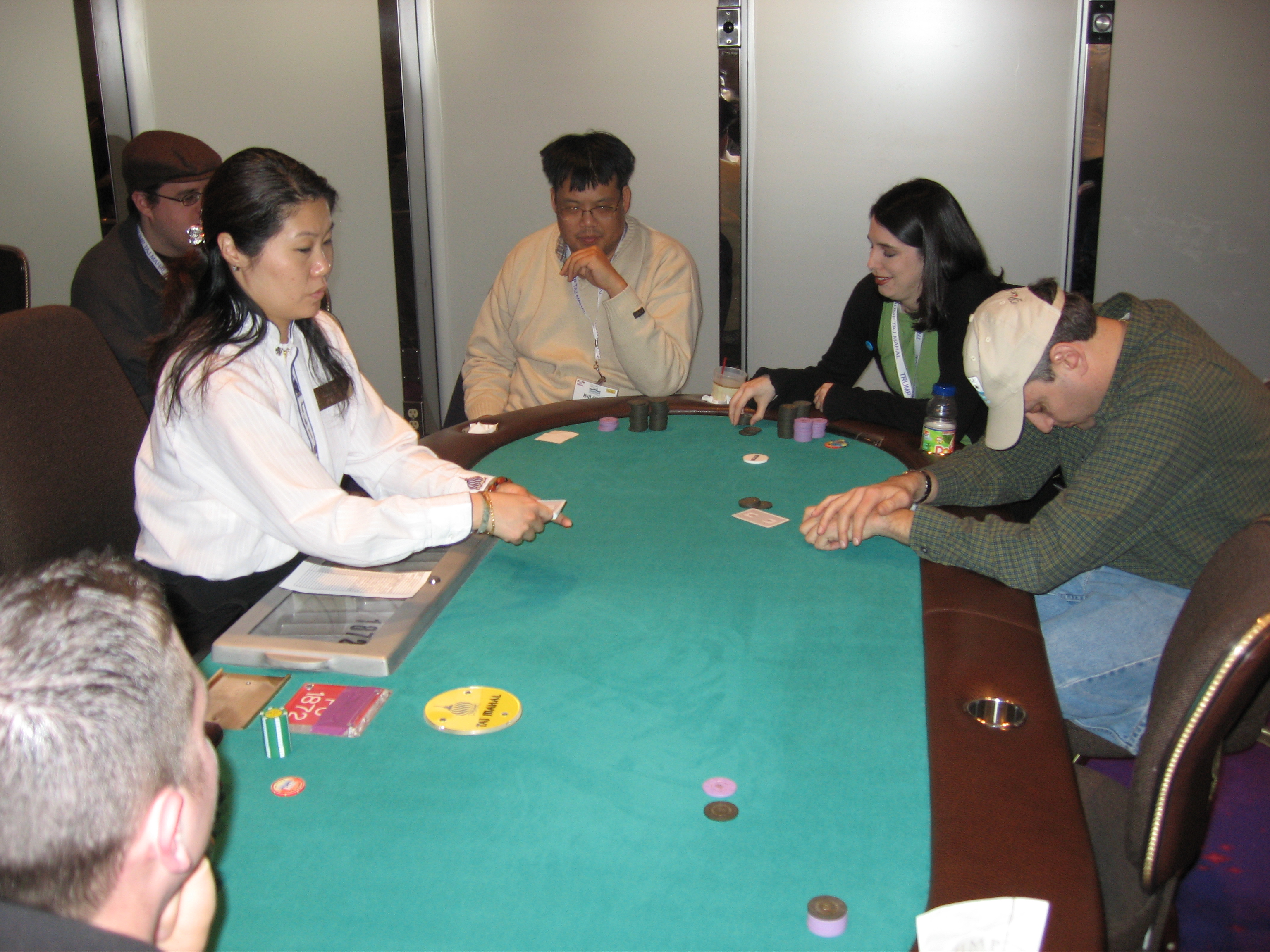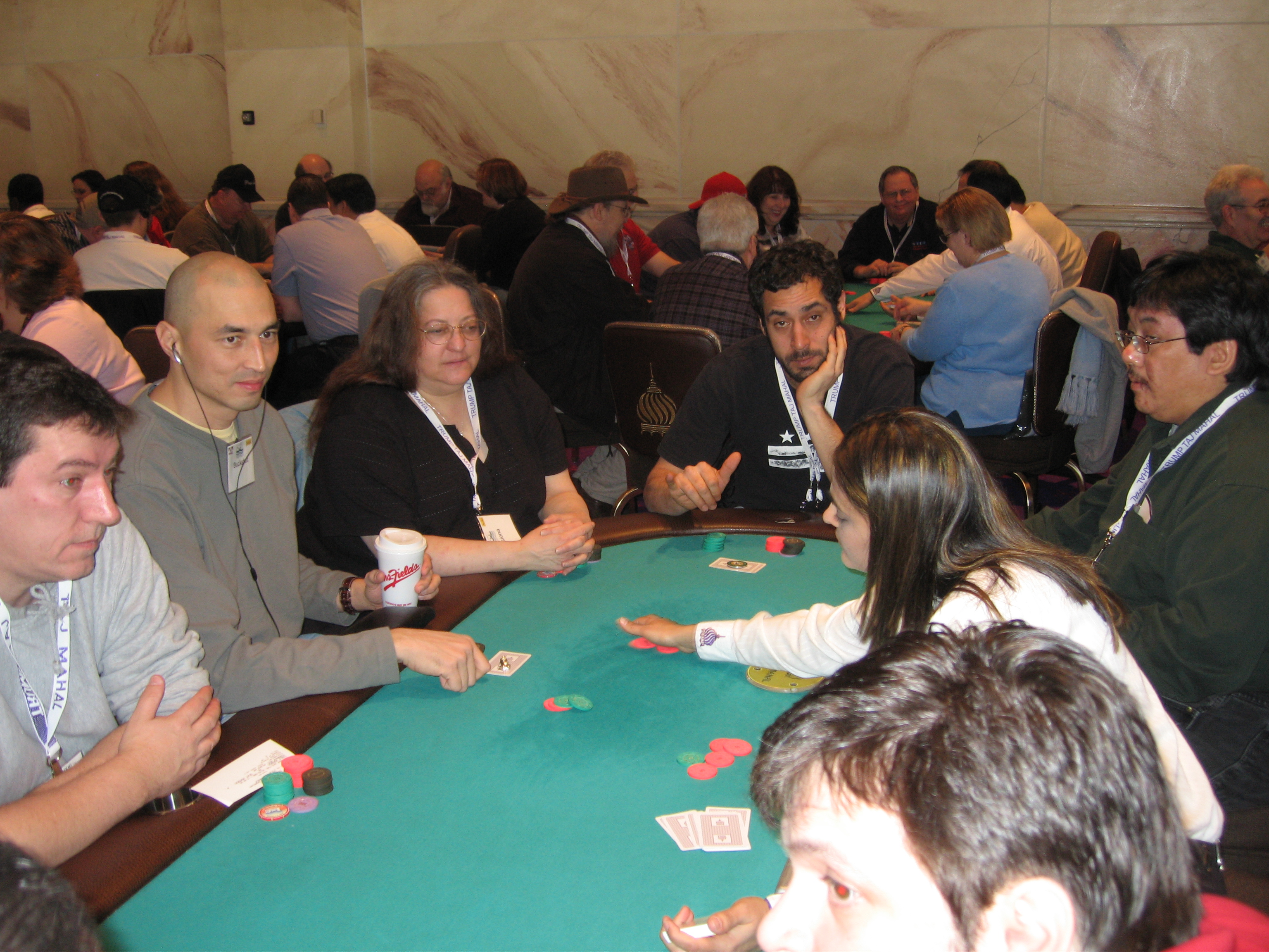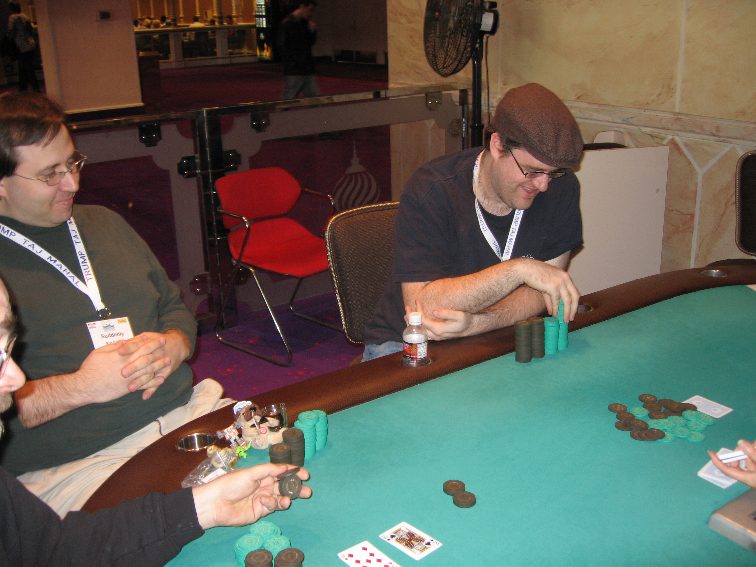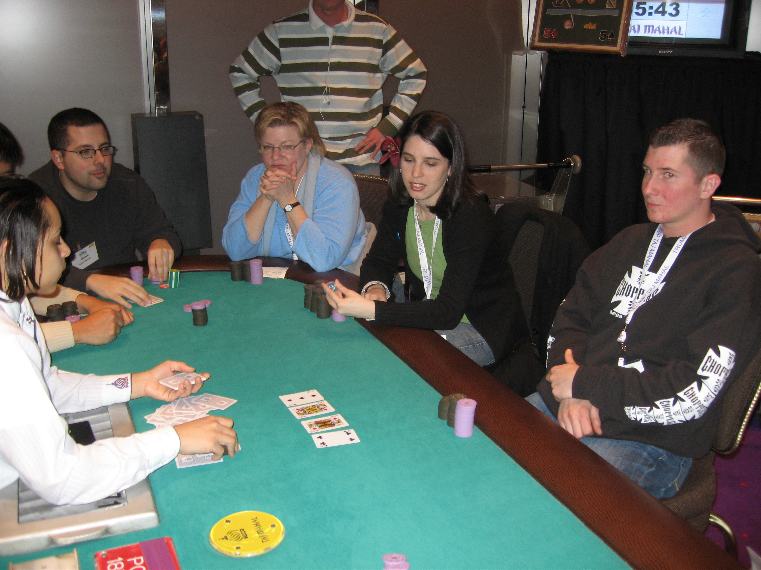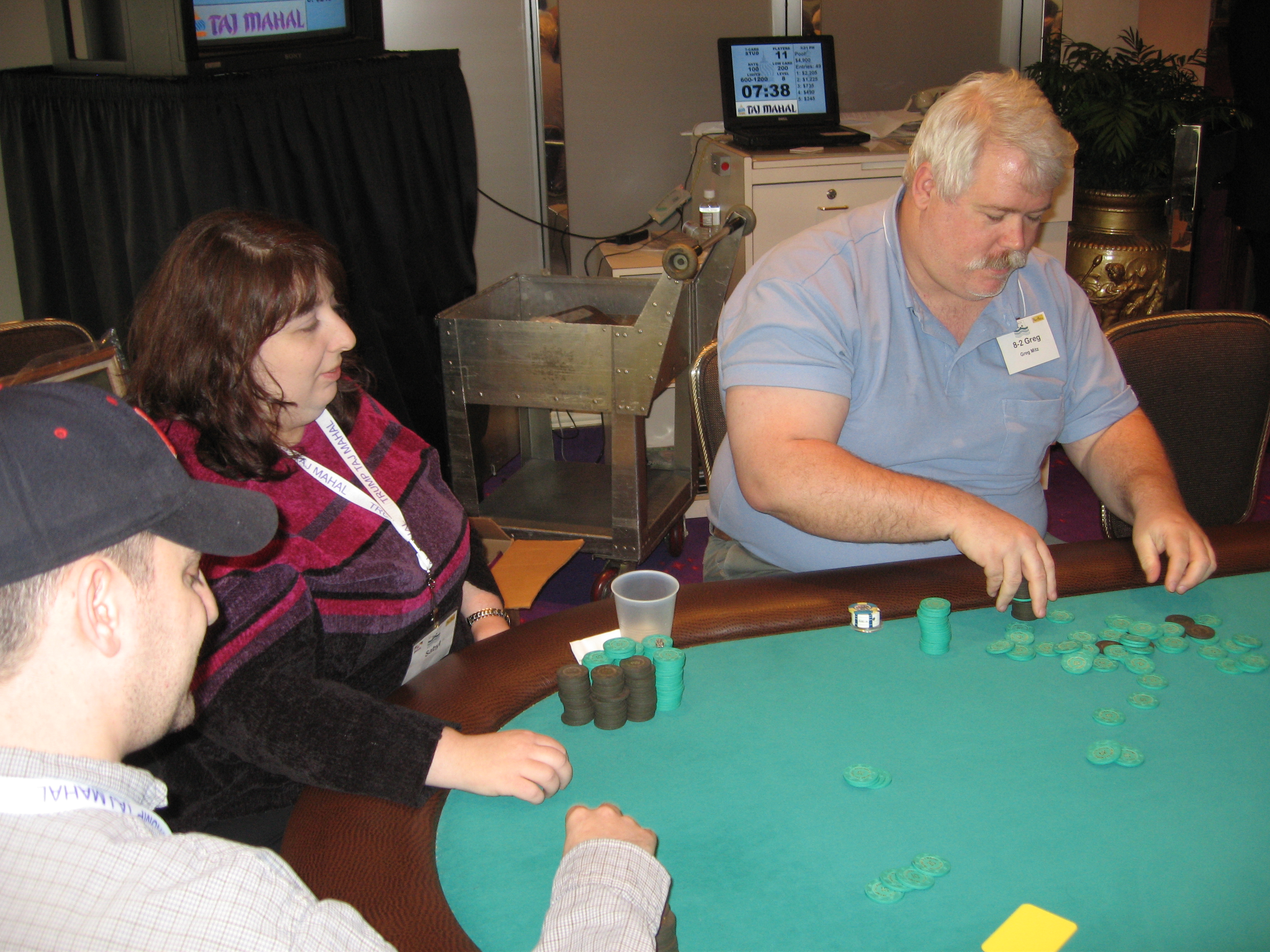 (From her blog: http://www.noninetofive.blogspot.com/ [dead link --Ed.]) Matt and Ivy picked me up bright and early and we left Brooklyn for AC. The first thing Matt told me when we got in the car was that the gas gauge was broken (permanently stuck on "E"). He then informed me of something even more hysterical: that I would be playing the H.O.E. tournament when we arrived at the Taj. I hadn't planned on playing this event. I've had historically abysmal results in limit hold 'em tourneys. My Omaha game is so-so on a good day. And before this weekend, I had played Stud O8 exactly once in my life. Overall, not a lot of reasons to play a $120 tournament involving these three games. We arrived just as the tournament registration was finishing up, and since I couldn't check into my room until noon I decided I might as well pass the time reuniting with fellow ARGErs at the poker table. Matt finally convinced me by offering to take half my action. I told him it was a lousy investment, outlining my reasons from above, but the long drive and lack of breakfast must have addled his brain because we ended up making this deal anyway. After a mad scramble to get a Taj card, I signed up for the tourney and took my seat. I was about to play my first H.O.E. tournament. I played at so many tables in this tourney that it's hard to recall who was at each one. Please yell at me if I forget you or get this wrong. Players I remember from my first table were Kenny, Matt, and Laurie Caulkins. Laurie had a nice set of chopsticks from her recent trip to China as her bust-out prize and I eyed them covetously. I don't remember any hands from this table, and in fact the most memorable thing that happened was Ivy Janet bringing us all a box of sinfully delicious Krispy Kream doughnuts. Mmmm, doughnuts.....argharhgahrargh. I found that the rotation game format really kept me paying attention in this tournament. Having to think about a different game every half hour or so kept things interesting, and I really enjoyed it. (Anyone know of any rotation tourneys online?) I found that my Omaha game was on par with the players around me, and I muddled through the Stud rounds without spewing too many chips. My basic strategy in Stud early on was to fold almost every hand except the ones I was 100% sure were playable, pinpoint the players at my table who seemed to understand the game, and watch them play theirs. (I also saw a fair number of examples of what not to do...) My stack remained healthy through most of the early rounds. As the blinds increased, I started to worry more about the fact that I would not be able to make it deep in this tournament without winning some Stud hands. The pots in Stud were the largest being played, and I needed to get my hands on those chips sooner or later. My first huge pot was not in Stud, but in Omaha. One player limped and I limped behind with A4xx double-suited (sorry I don't have more precise hand histories). The flop came with two low cards and one diamond. I held the Ax of diamonds. The turn paired the board, and I donked along to the river, where I hit my flush. I called one bet, as did the limper behind me, and when we turned up our hands I was up against a smaller flush for the high and ended up with half the low as well. I was accumulating chips nicely and never had much concern for my chip stack. Until I was moved yet again and found myself with Jeff Caulkins and Bill Chen on my right and Rob "ActionBob" Hwang on my left. And oh, good, the Stud round was beginning. Bill wonders if he'll make it to his speech on time. I don't know much about Stud O8, but it seemed to me that as long as I went for the low, I could sometimes back into a decent high and still win. I scooped two huge Stud pots at this table, both with two pair. How could this be?? On one hand, no one had a low, so and on the other my two small pair were good. Is this common in Stud? My only other experience with split games is Omaha, and two pair are rarely good for the high in that game. Stacking my chips, I looked up and saw that Jeff had a pair of chopsticks as his bust-out prize just as Laurie had. I wanted them. During the Hold 'Em round, I looked down at two red sevens. Jeff was short-stacked and called my pre-flop raise. The flop came ten-high and he moved in. I wanted those chopsticks real bad so I called. Jeff showed two overs (ace-jack, I think?) and got no love from the turn or river. Jeff was out and the chopsticks were mine! Woot! Now I had a serious stack, and entered my favorite part of a tournament: the part where I have chips and start raising like it's going out of style. During the course of this tournament, someone gave me the nickname, "Raising Station." I took that as a compliment. I was able to steal some blinds/antes/pots during the next few rounds (and to be fair, I was also getting smacked with the deck) and built my stack even bigger. One by one, players were getting knocked out around me (and sometimes, *by* me!). I started to think I might have a shot at going really deep in this thing. The raising station (center). Thank goodness I've built up my tourney stamina online during the past few months, and thank goodness that the deeper you get in a tournament, the less the specific game matters. Nine hours after we began, I found myself at the final table. The blinds were insane, and any given hand could turn the short stack into the chip leader (and vice versa). I made this swing a couple of times myself as we remained eight-handed for nearly an hour. Then there was a rapid series of bust-outs and we were four-handed: Rob "Suddenly" Catlett, Bill Chen, Gabe DeVitto, and me. It was approaching 8pm, when the banquet was supposed to begin, so we had a pitiful number of sweaters. They were busy admiring the Poker Stars ice sculpture upstairs. Since I was a moron and didn't record any of this sooner, I have no remarkable hands to report. Bill busted fourth, followed by Rob, and that left Gabe and me