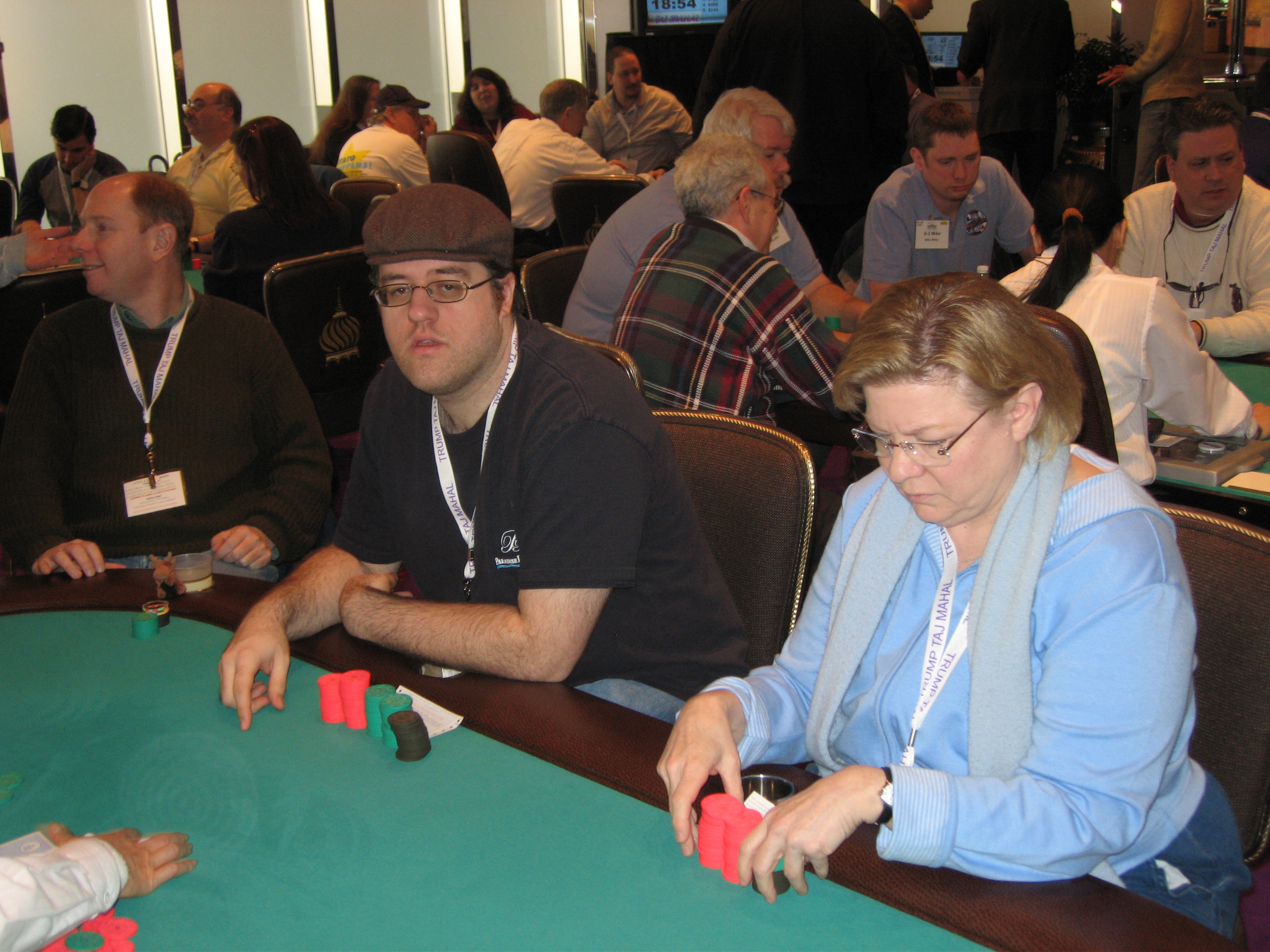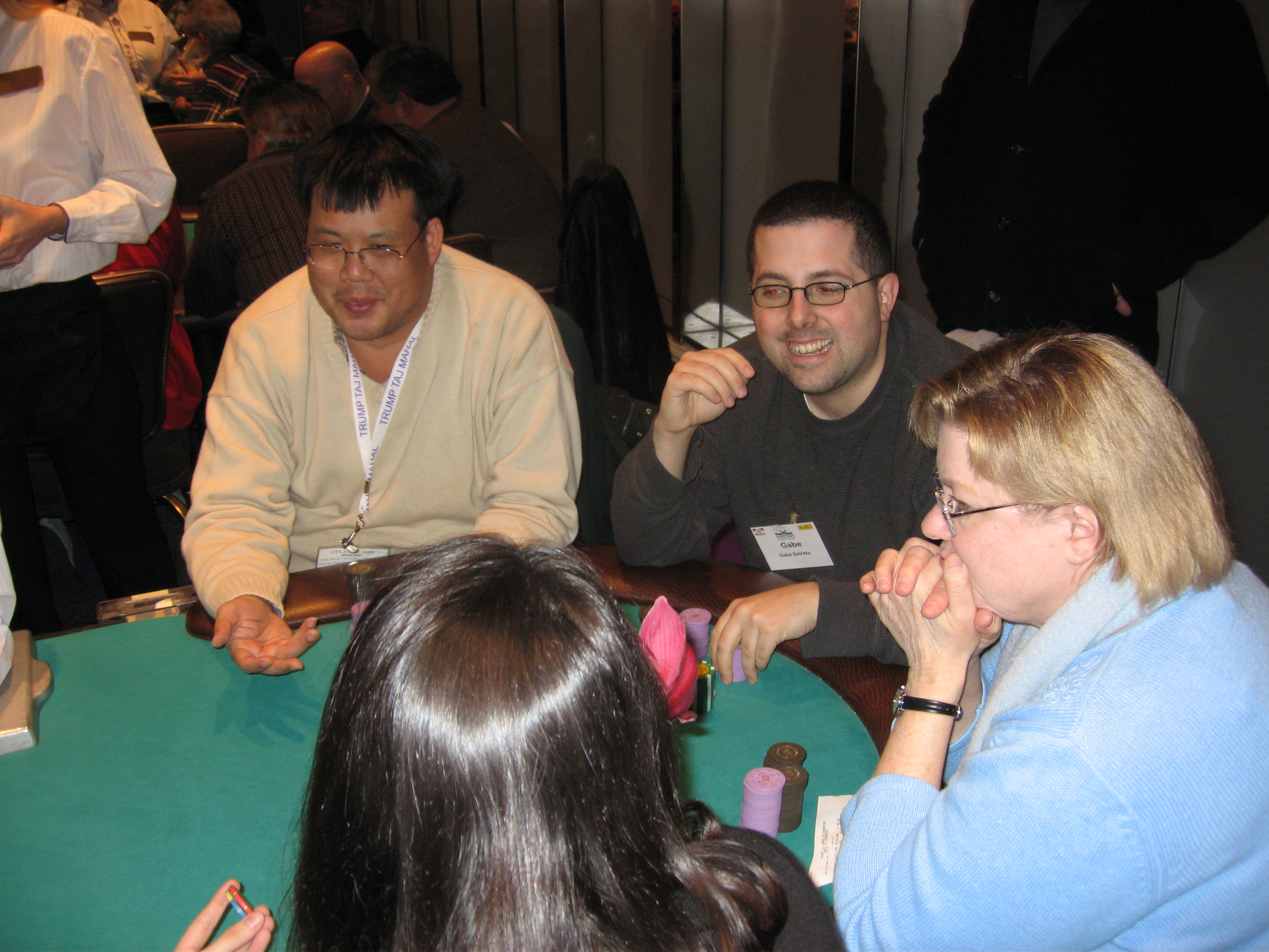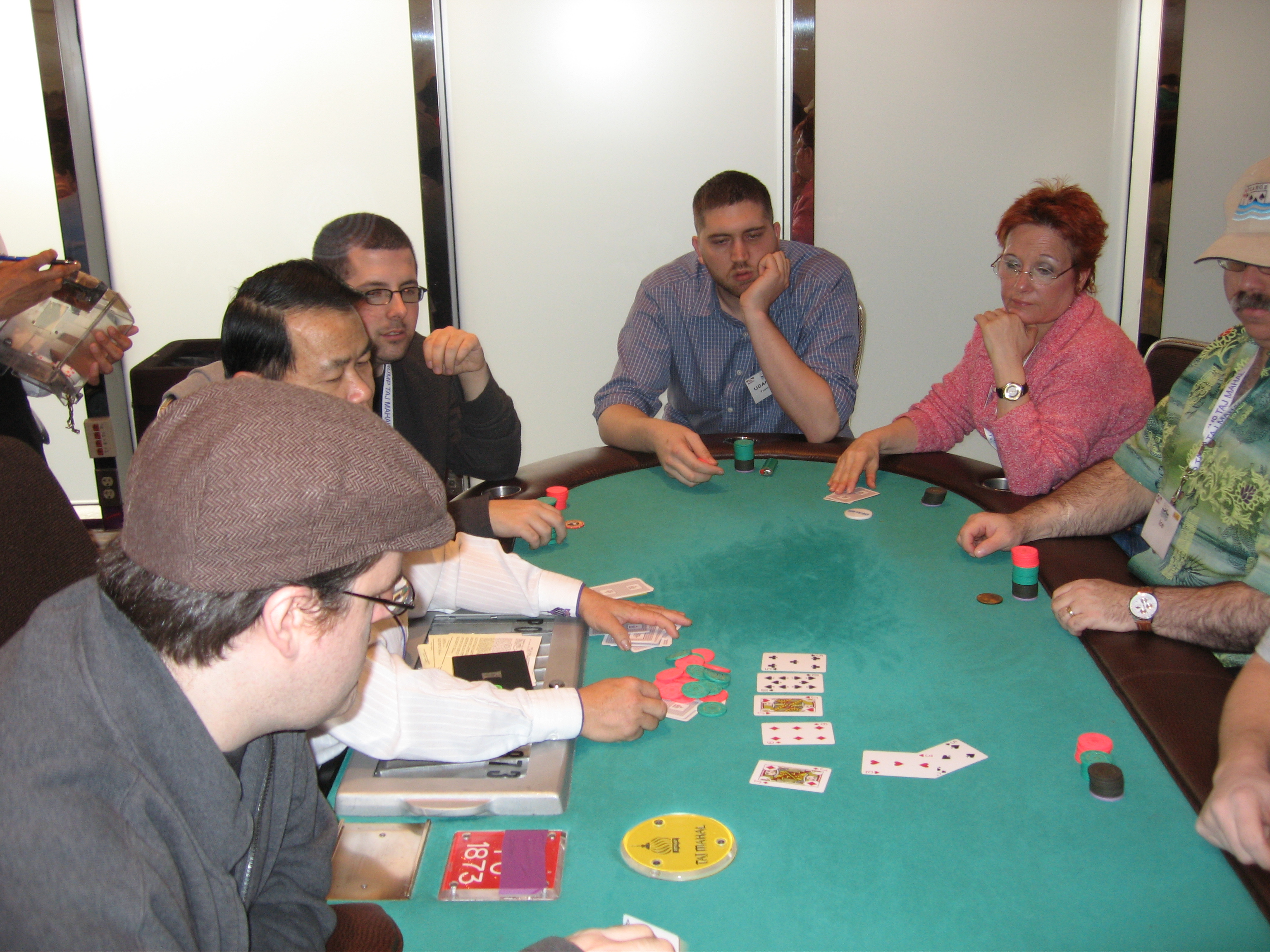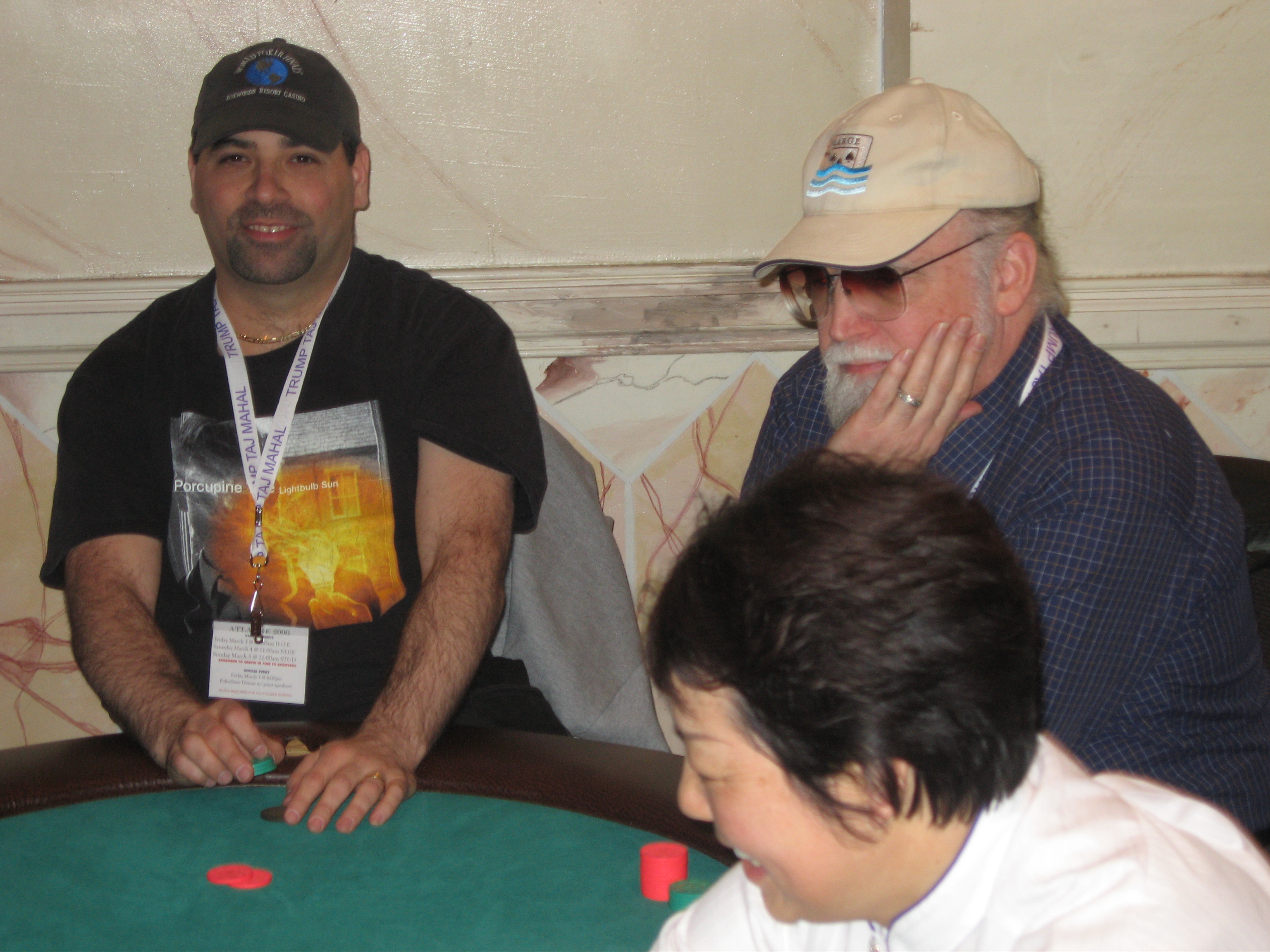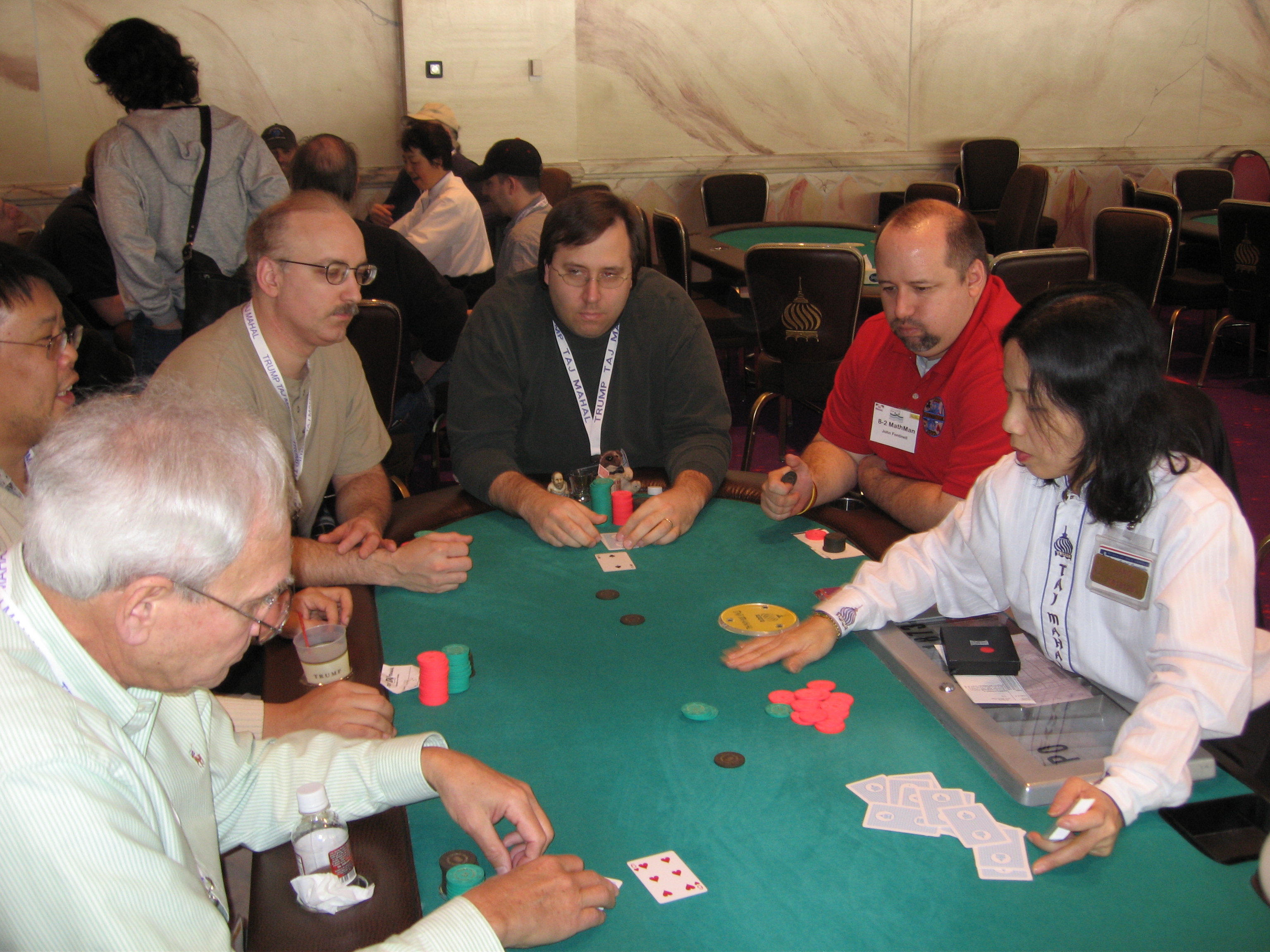 (From her blog: http://www.noninetofive.blogspot.com/ [dead link --Ed.]) Matt and Ivy picked me up bright and early and we left Brooklyn for AC. The first thing Matt told me when we got in the car was that the gas gauge was broken (permanently stuck on "E"). He then informed me of something even more hysterical: that I would be playing the H.O.E. tournament when we arrived at the Taj. I hadn't planned on playing this event. I've had historically abysmal results in limit hold 'em tourneys. My Omaha game is so-so on a good day. And before this weekend, I had played Stud O8 exactly once in my life. Overall, not a lot of reasons to play a $120 tournament involving these three games. We arrived just as the tournament registration was finishing up, and since I couldn't check into my room until noon I decided I might as well pass the time reuniting with fellow ARGErs at the poker table. Matt finally convinced me by offering to take half my action. I told him it was a lousy investment, outlining my reasons from above, but the long drive and lack of breakfast must have addled his brain because we ended up making this deal anyway. After a mad scramble to get a Taj card, I signed up for the tourney and took my seat. I was about to play my first H.O.E. tournament. I played at so many tables in this tourney that it's hard to recall who was at each one. Please yell at me if I forget you or get this wrong. Players I remember from my first table were Kenny, Matt, and Laurie Caulkins. Laurie had a nice set of chopsticks from her recent trip to China as her bust-out prize and I eyed them covetously. I don't remember any hands from this table, and in fact the most memorable thing that happened was Ivy Janet bringing us all a box of sinfully delicious Krispy Kream doughnuts. Mmmm, doughnuts.....argharhgahrargh. I found that the rotation game format really kept me paying attention in this tournament. Having to think about a different game every half hour or so kept things interesting, and I really enjoyed it. (Anyone know of any rotation tourneys online?) I found that my Omaha game was on par with the players around me, and I muddled through the Stud rounds without spewing too many chips. My basic strategy in Stud early on was to fold almost every hand except the ones I was 100% sure were playable, pinpoint the players at my table who seemed to understand the game, and watch them play theirs. (I also saw a fair number of examples of what not to do...) My stack remained healthy through most of the early rounds. As the blinds increased, I started to worry more about the fact that I would not be able to make it deep in this tournament without winning some Stud hands. The pots in Stud were the largest being played, and I needed to get my hands on those chips sooner or later. My first huge pot was not in Stud, but in Omaha. One player limped and I limped behind with A4xx double-suited (sorry I don't have more precise hand histories). The flop came with two low cards and one diamond. I held the Ax of diamonds. The turn paired the board, and I donked along to the river, where I hit my flush. I called one bet, as did the limper behind me, and when we turned up our hands I was up against a smaller flush for the high and ended up with half the low as well. I was accumulating chips nicely and never had much concern for my chip stack. Until I was moved yet again and found myself with Jeff Caulkins and Bill Chen on my right and Rob "ActionBob" Hwang on my left. And oh, good, the Stud round was beginning. Bill wonders if he'll make it to his speech on time. I don't know much about Stud O8, but it seemed to me that as long as I went for the low, I could sometimes back into a decent high and still win. I scooped two huge Stud pots at this table, both with two pair. How could this be?? On one hand, no one had a low, so and on the other my two small pair were good. Is this common in Stud? My only other experience with split games is Omaha, and two pair are rarely good for the high in that game. Stacking my chips, I looked up and saw that Jeff had a pair of chopsticks as his bust-out prize just as Laurie had. I wanted them. During the Hold 'Em round, I looked down at two red sevens. Jeff was short-stacked and called my pre-flop raise. The flop came ten-high and he moved in. I wanted those chopsticks real bad so I called. Jeff showed two overs (ace-jack, I think?) and got no love from the turn or river. Jeff was out and the chopsticks were mine! Woot! Now I had a serious stack, and entered my favorite part of a tournament: the part where I have chips and start raising like it's going out of style. During the course of this tournament, someone gave me the nickname, "Raising Station." I took that as a compliment. I was able to steal some blinds/antes/pots during the next few rounds (and to be fair, I was also getting smacked with the deck) and built my stack even bigger. One by one, players were getting knocked out around me (and sometimes, *by* me!). I started to think I might have a shot at going really deep in this thing. The raising station (center). Thank goodness I've built up my tourney stamina online during the past few months, and thank goodness that the deeper you get in a tournament, the less the specific game matters. Nine hours after we began, I found myself at the final table. The blinds were insane, and any given hand could turn the short stack into the chip leader (and vice versa). I made this swing a couple of times myself as we remained eight-handed for nearly an hour. Then there was a rapid series of bust-outs and we were four-handed: Rob "Suddenly" Catlett, Bill Chen, Gabe DeVitto, and me. It was approaching 8pm, when the banquet was supposed to begin, so we had a pitiful number of sweaters. They were busy admiring the Poker Stars ice sculpture upstairs. Since I was a moron and didn't record any of this sooner, I have no remarkable hands to report. Bill busted fourth, followed by Rob, and that left Gabe and me