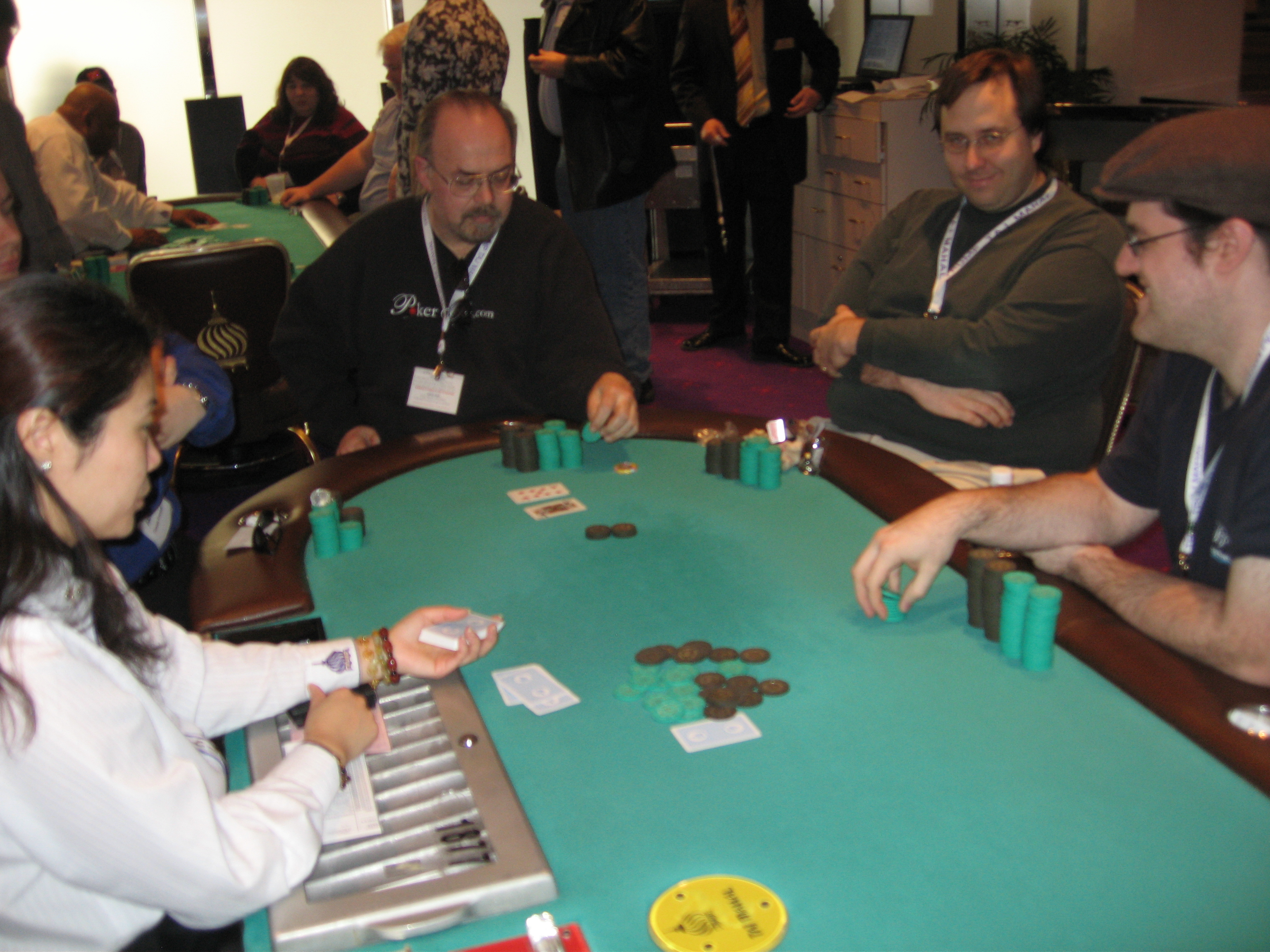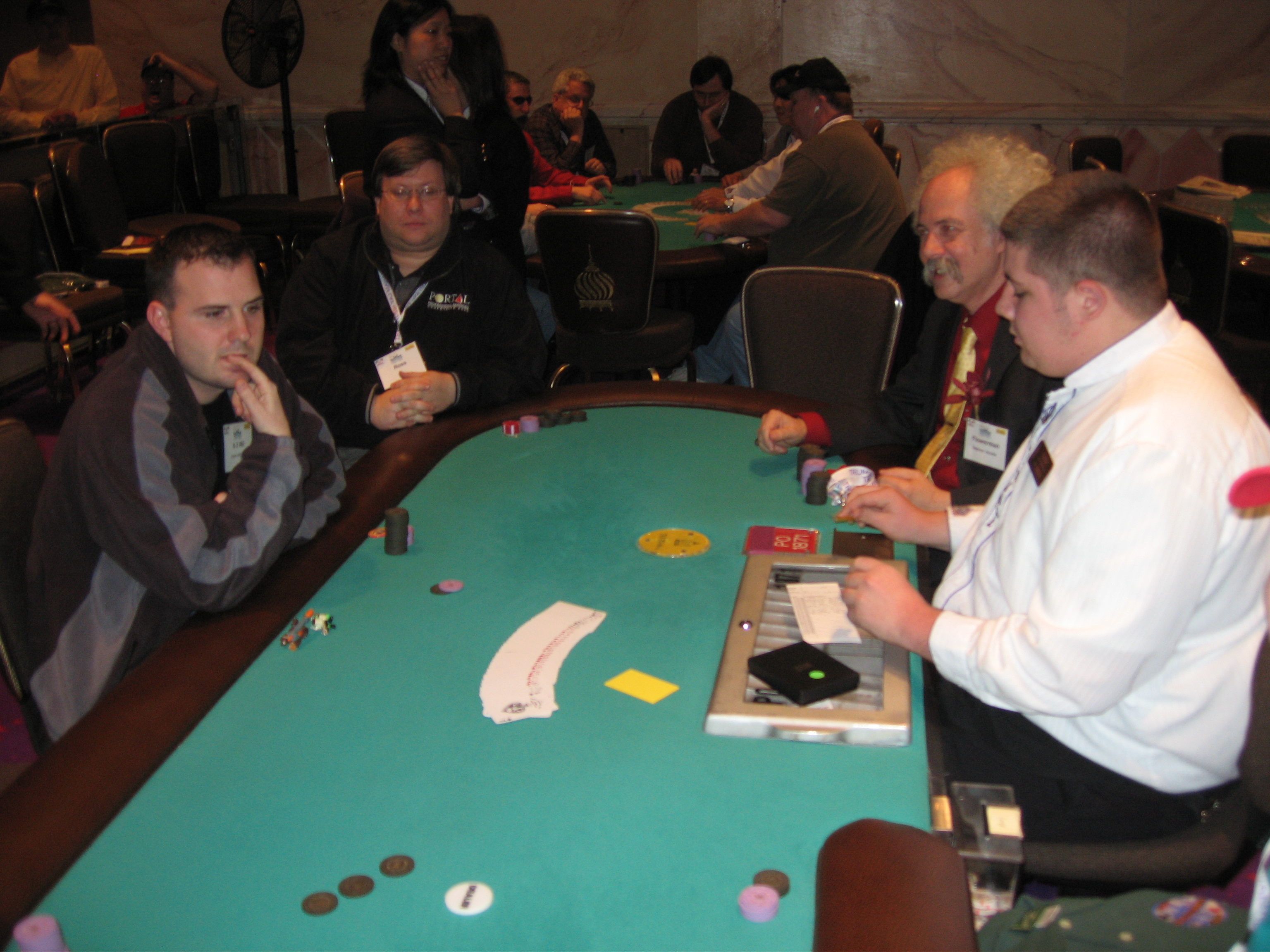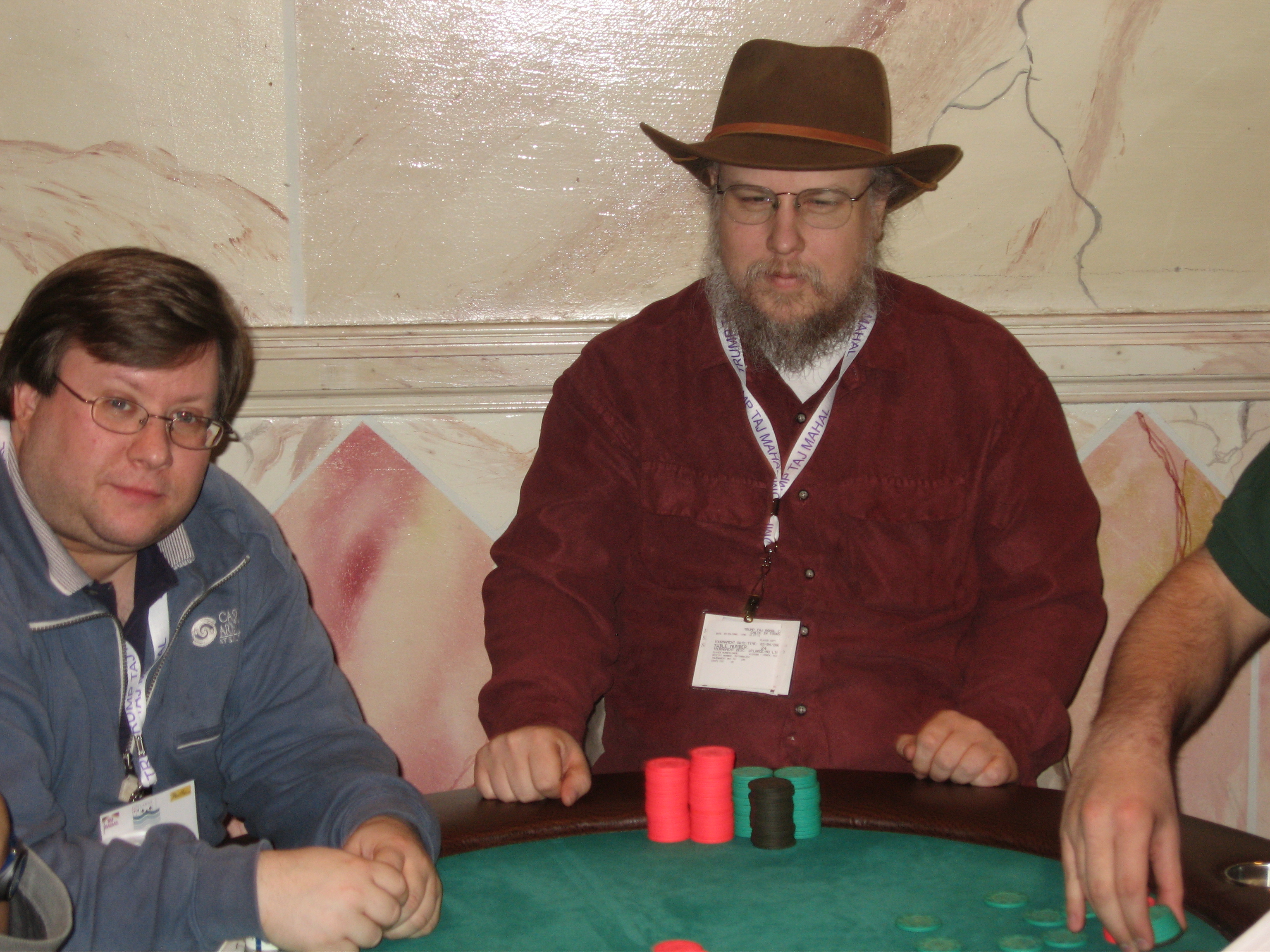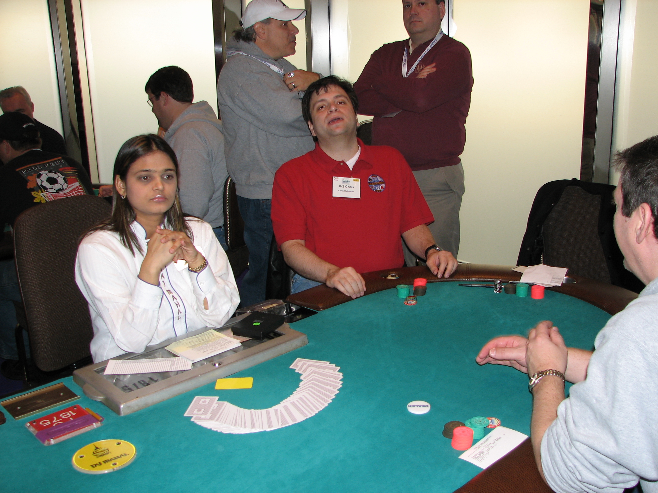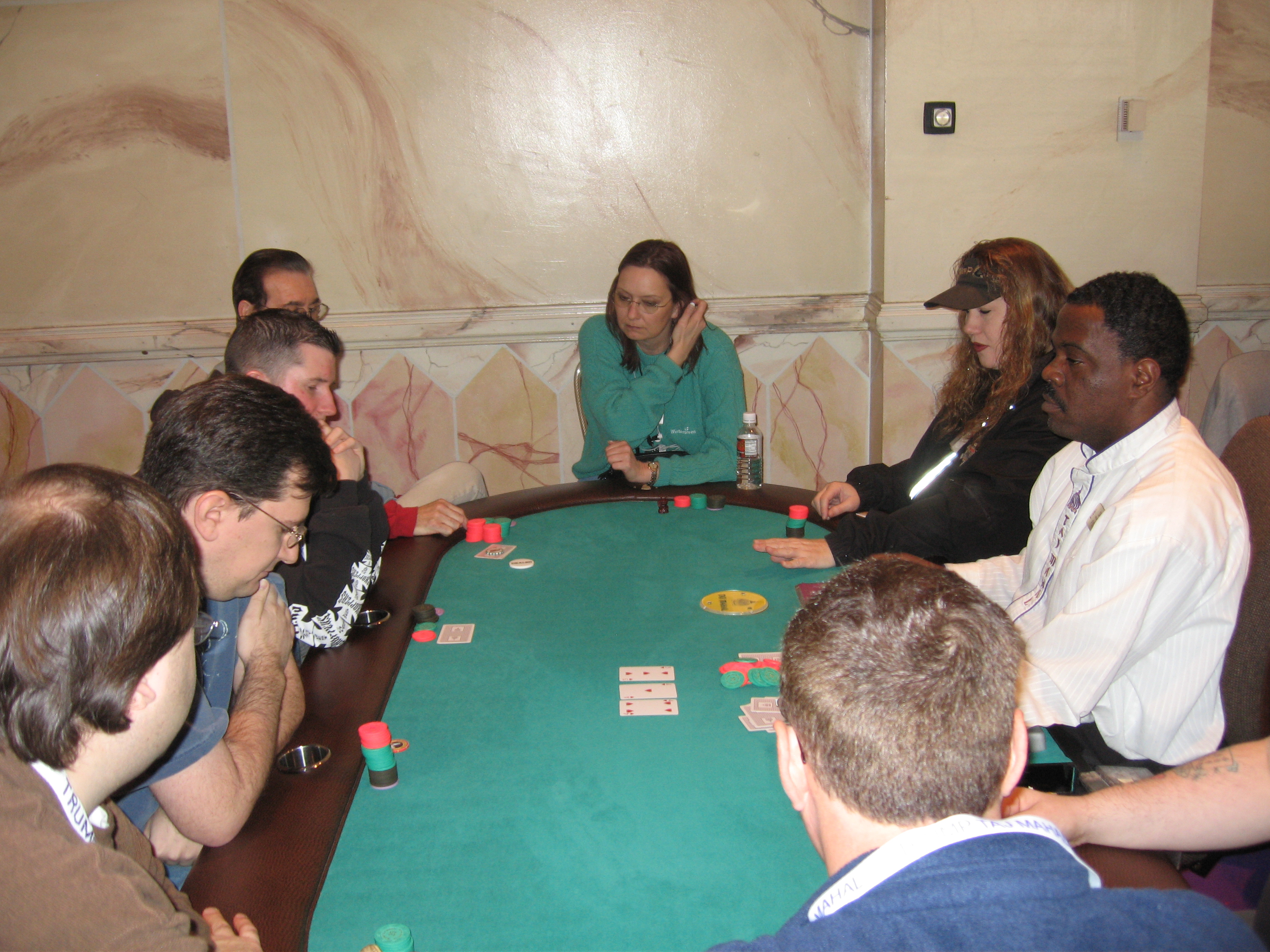 (From her blog: http://www.noninetofive.blogspot.com/ [dead link --Ed.]) Matt and Ivy picked me up bright and early and we left Brooklyn for AC. The first thing Matt told me when we got in the car was that the gas gauge was broken (permanently stuck on "E"). He then informed me of something even more hysterical: that I would be playing the H.O.E. tournament when we arrived at the Taj. I hadn't planned on playing this event. I've had historically abysmal results in limit hold 'em tourneys. My Omaha game is so-so on a good day. And before this weekend, I had played Stud O8 exactly once in my life. Overall, not a lot of reasons to play a $120 tournament involving these three games. We arrived just as the tournament registration was finishing up, and since I couldn't check into my room until noon I decided I might as well pass the time reuniting with fellow ARGErs at the poker table. Matt finally convinced me by offering to take half my action. I told him it was a lousy investment, outlining my reasons from above, but the long drive and lack of breakfast must have addled his brain because we ended up making this deal anyway. After a mad scramble to get a Taj card, I signed up for the tourney and took my seat. I was about to play my first H.O.E. tournament. I played at so many tables in this tourney that it's hard to recall who was at each one. Please yell at me if I forget you or get this wrong. Players I remember from my first table were Kenny, Matt, and Laurie Caulkins. Laurie had a nice set of chopsticks from her recent trip to China as her bust-out prize and I eyed them covetously. I don't remember any hands from this table, and in fact the most memorable thing that happened was Ivy Janet bringing us all a box of sinfully delicious Krispy Kream doughnuts. Mmmm, doughnuts.....argharhgahrargh. I found that the rotation game format really kept me paying attention in this tournament. Having to think about a different game every half hour or so kept things interesting, and I really enjoyed it. (Anyone know of any rotation tourneys online?) I found that my Omaha game was on par with the players around me, and I muddled through the Stud rounds without spewing too many chips. My basic strategy in Stud early on was to fold almost every hand except the ones I was 100% sure were playable, pinpoint the players at my table who seemed to understand the game, and watch them play theirs. (I also saw a fair number of examples of what not to do...) My stack remained healthy through most of the early rounds. As the blinds increased, I started to worry more about the fact that I would not be able to make it deep in this tournament without winning some Stud hands. The pots in Stud were the largest being played, and I needed to get my hands on those chips sooner or later. My first huge pot was not in Stud, but in Omaha. One player limped and I limped behind with A4xx double-suited (sorry I don't have more precise hand histories). The flop came with two low cards and one diamond. I held the Ax of diamonds. The turn paired the board, and I donked along to the river, where I hit my flush. I called one bet, as did the limper behind me, and when we turned up our hands I was up against a smaller flush for the high and ended up with half the low as well. I was accumulating chips nicely and never had much concern for my chip stack. Until I was moved yet again and found myself with Jeff Caulkins and Bill Chen on my right and Rob "ActionBob" Hwang on my left. And oh, good, the Stud round was beginning. Bill wonders if he'll make it to his speech on time. I don't know much about Stud O8, but it seemed to me that as long as I went for the low, I could sometimes back into a decent high and still win. I scooped two huge Stud pots at this table, both with two pair. How could this be?? On one hand, no one had a low, so and on the other my two small pair were good. Is this common in Stud? My only other experience with split games is Omaha, and two pair are rarely good for the high in that game. Stacking my chips, I looked up and saw that Jeff had a pair of chopsticks as his bust-out prize just as Laurie had. I wanted them. During the Hold 'Em round, I looked down at two red sevens. Jeff was short-stacked and called my pre-flop raise. The flop came ten-high and he moved in. I wanted those chopsticks real bad so I called. Jeff showed two overs (ace-jack, I think?) and got no love from the turn or river. Jeff was out and the chopsticks were mine! Woot! Now I had a serious stack, and entered my favorite part of a tournament: the part where I have chips and start raising like it's going out of style. During the course of this tournament, someone gave me the nickname, "Raising Station." I took that as a compliment. I was able to steal some blinds/antes/pots during the next few rounds (and to be fair, I was also getting smacked with the deck) and built my stack even bigger. One by one, players were getting knocked out around me (and sometimes, *by* me!). I started to think I might have a shot at going really deep in this thing. The raising station (center). Thank goodness I've built up my tourney stamina online during the past few months, and thank goodness that the deeper you get in a tournament, the less the specific game matters. Nine hours after we began, I found myself at the final table. The blinds were insane, and any given hand could turn the short stack into the chip leader (and vice versa). I made this swing a couple of times myself as we remained eight-handed for nearly an hour. Then there was a rapid series of bust-outs and we were four-handed: Rob "Suddenly" Catlett, Bill Chen, Gabe DeVitto, and me. It was approaching 8pm, when the banquet was supposed to begin, so we had a pitiful number of sweaters. They were busy admiring the Poker Stars ice sculpture upstairs. Since I was a moron and didn't record any of this sooner, I have no remarkable hands to report. Bill busted fourth, followed by Rob, and that left Gabe and me