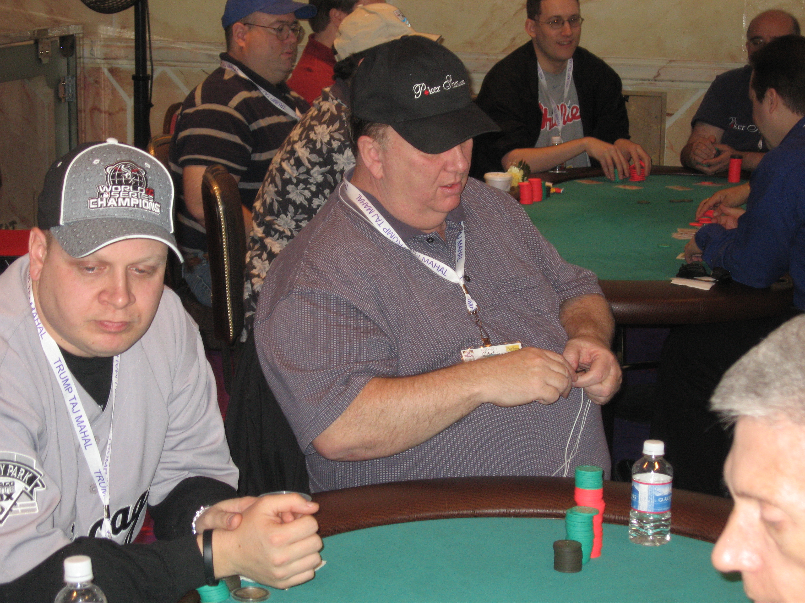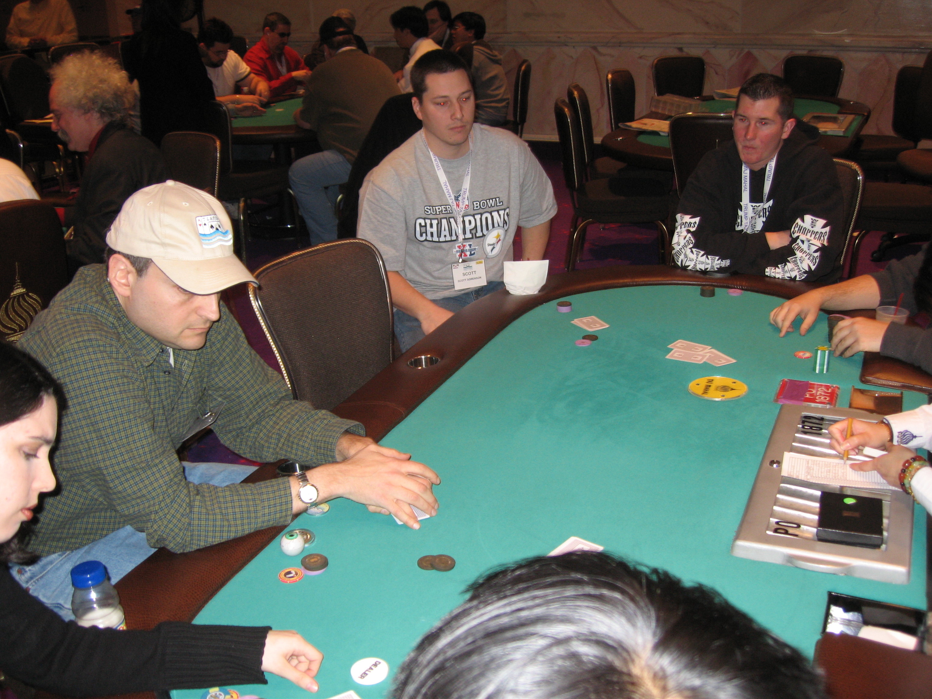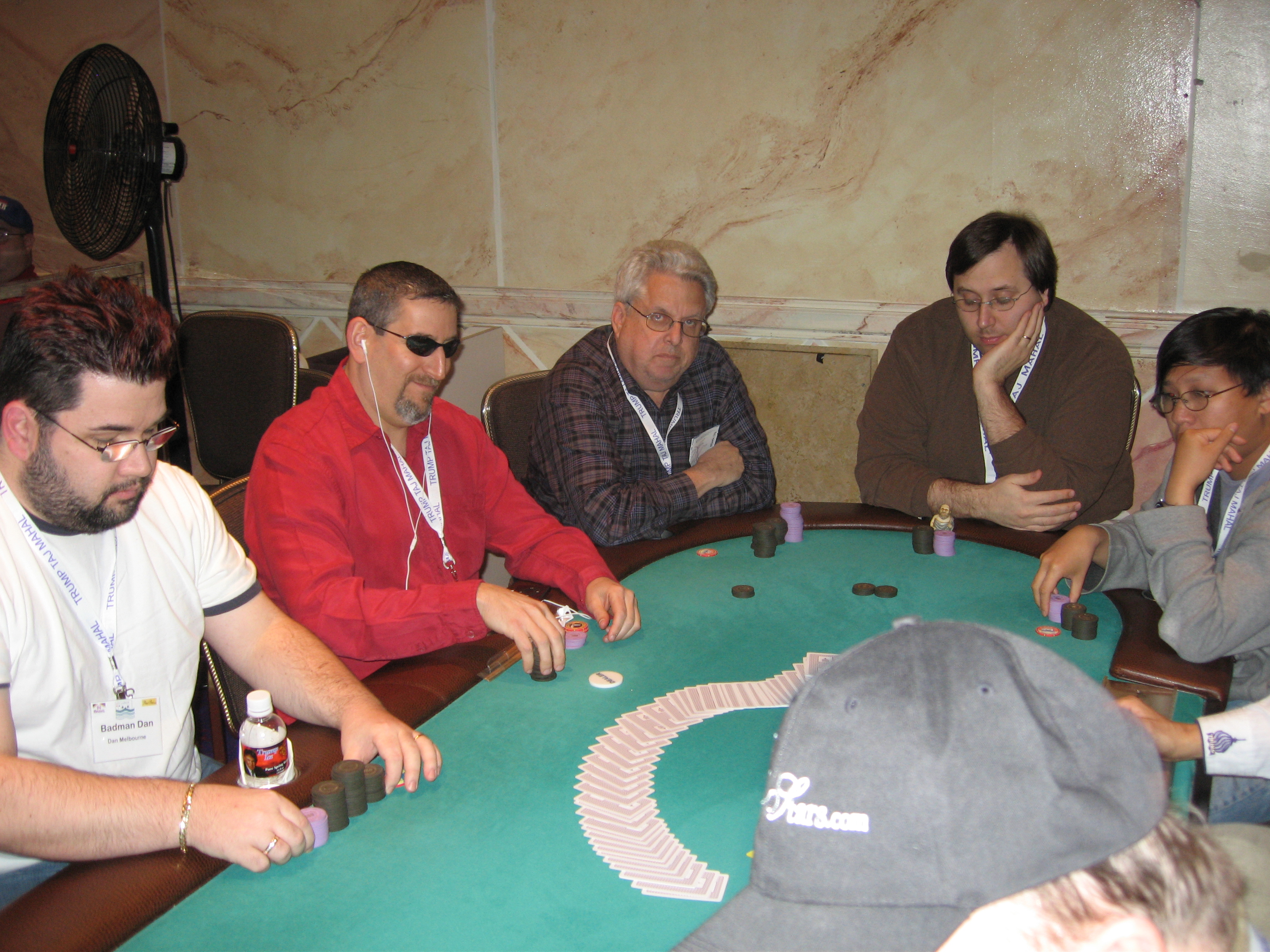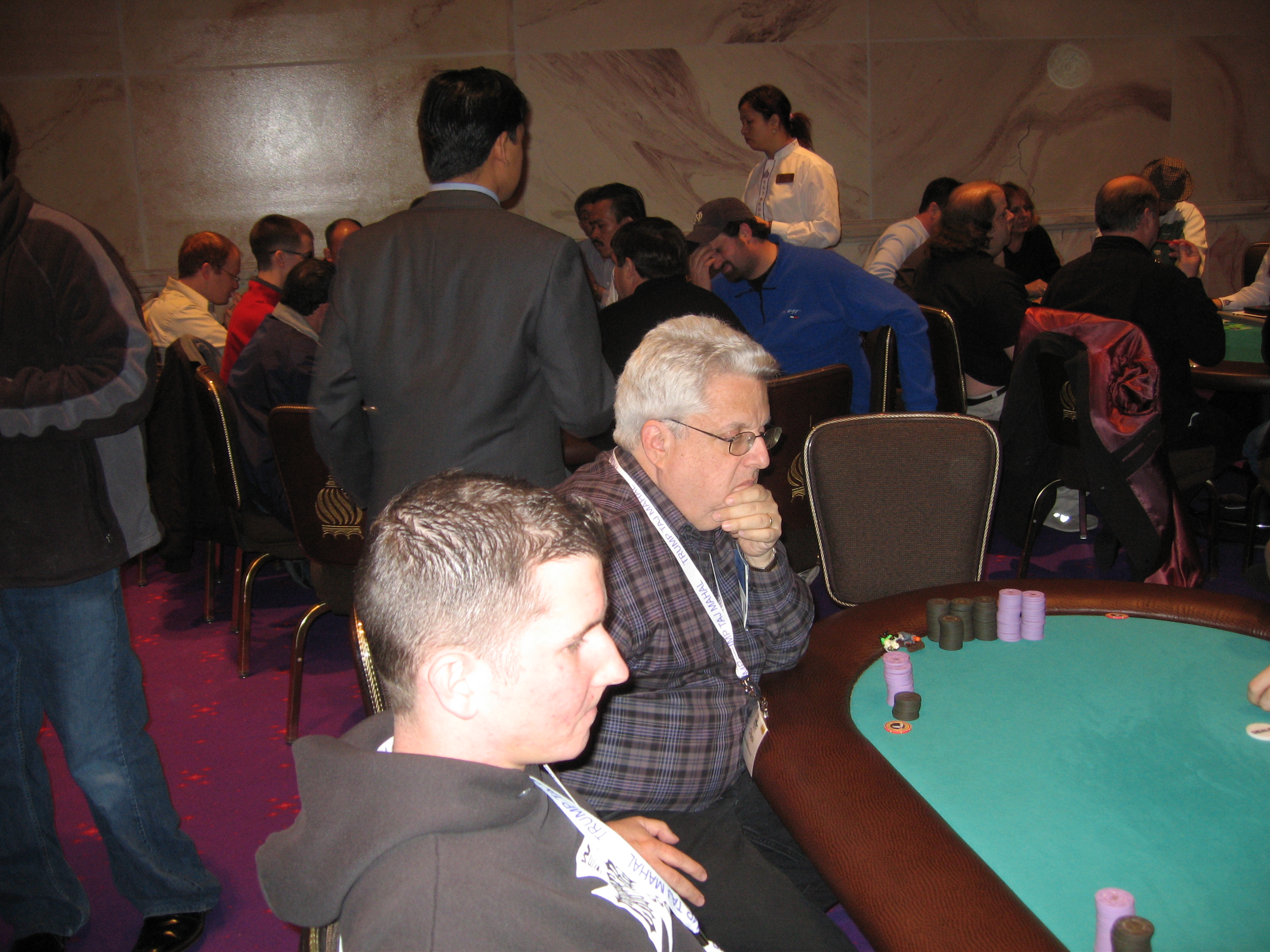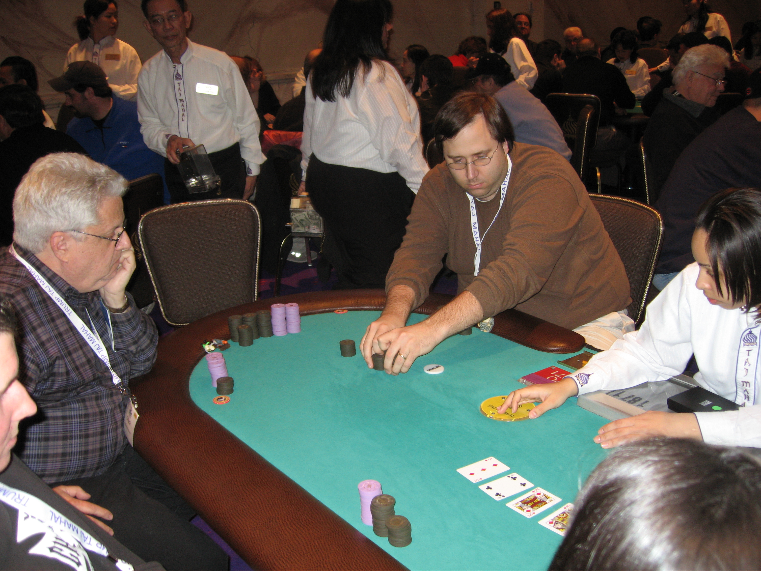 (From her blog: http://www.noninetofive.blogspot.com/ [dead link --Ed.]) Matt and Ivy picked me up bright and early and we left Brooklyn for AC. The first thing Matt told me when we got in the car was that the gas gauge was broken (permanently stuck on "E"). He then informed me of something even more hysterical: that I would be playing the H.O.E. tournament when we arrived at the Taj. I hadn't planned on playing this event. I've had historically abysmal results in limit hold 'em tourneys. My Omaha game is so-so on a good day. And before this weekend, I had played Stud O8 exactly once in my life. Overall, not a lot of reasons to play a $120 tournament involving these three games. We arrived just as the tournament registration was finishing up, and since I couldn't check into my room until noon I decided I might as well pass the time reuniting with fellow ARGErs at the poker table. Matt finally convinced me by offering to take half my action. I told him it was a lousy investment, outlining my reasons from above, but the long drive and lack of breakfast must have addled his brain because we ended up making this deal anyway. After a mad scramble to get a Taj card, I signed up for the tourney and took my seat. I was about to play my first H.O.E. tournament. I played at so many tables in this tourney that it's hard to recall who was at each one. Please yell at me if I forget you or get this wrong. Players I remember from my first table were Kenny, Matt, and Laurie Caulkins. Laurie had a nice set of chopsticks from her recent trip to China as her bust-out prize and I eyed them covetously. I don't remember any hands from this table, and in fact the most memorable thing that happened was Ivy Janet bringing us all a box of sinfully delicious Krispy Kream doughnuts. Mmmm, doughnuts.....argharhgahrargh. I found that the rotation game format really kept me paying attention in this tournament. Having to think about a different game every half hour or so kept things interesting, and I really enjoyed it. (Anyone know of any rotation tourneys online?) I found that my Omaha game was on par with the players around me, and I muddled through the Stud rounds without spewing too many chips. My basic strategy in Stud early on was to fold almost every hand except the ones I was 100% sure were playable, pinpoint the players at my table who seemed to understand the game, and watch them play theirs. (I also saw a fair number of examples of what not to do...) My stack remained healthy through most of the early rounds. As the blinds increased, I started to worry more about the fact that I would not be able to make it deep in this tournament without winning some Stud hands. The pots in Stud were the largest being played, and I needed to get my hands on those chips sooner or later. My first huge pot was not in Stud, but in Omaha. One player limped and I limped behind with A4xx double-suited (sorry I don't have more precise hand histories). The flop came with two low cards and one diamond. I held the Ax of diamonds. The turn paired the board, and I donked along to the river, where I hit my flush. I called one bet, as did the limper behind me, and when we turned up our hands I was up against a smaller flush for the high and ended up with half the low as well. I was accumulating chips nicely and never had much concern for my chip stack. Until I was moved yet again and found myself with Jeff Caulkins and Bill Chen on my right and Rob "ActionBob" Hwang on my left. And oh, good, the Stud round was beginning. Bill wonders if he'll make it to his speech on time. I don't know much about Stud O8, but it seemed to me that as long as I went for the low, I could sometimes back into a decent high and still win. I scooped two huge Stud pots at this table, both with two pair. How could this be?? On one hand, no one had a low, so and on the other my two small pair were good. Is this common in Stud? My only other experience with split games is Omaha, and two pair are rarely good for the high in that game. Stacking my chips, I looked up and saw that Jeff had a pair of chopsticks as his bust-out prize just as Laurie had. I wanted them. During the Hold 'Em round, I looked down at two red sevens. Jeff was short-stacked and called my pre-flop raise. The flop came ten-high and he moved in. I wanted those chopsticks real bad so I called. Jeff showed two overs (ace-jack, I think?) and got no love from the turn or river. Jeff was out and the chopsticks were mine! Woot! Now I had a serious stack, and entered my favorite part of a tournament: the part where I have chips and start raising like it's going out of style. During the course of this tournament, someone gave me the nickname, "Raising Station." I took that as a compliment. I was able to steal some blinds/antes/pots during the next few rounds (and to be fair, I was also getting smacked with the deck) and built my stack even bigger. One by one, players were getting knocked out around me (and sometimes, *by* me!). I started to think I might have a shot at going really deep in this thing. The raising station (center). Thank goodness I've built up my tourney stamina online during the past few months, and thank goodness that the deeper you get in a tournament, the less the specific game matters. Nine hours after we began, I found myself at the final table. The blinds were insane, and any given hand could turn the short stack into the chip leader (and vice versa). I made this swing a couple of times myself as we remained eight-handed for nearly an hour. Then there was a rapid series of bust-outs and we were four-handed: Rob "Suddenly" Catlett, Bill Chen, Gabe DeVitto, and me. It was approaching 8pm, when the banquet was supposed to begin, so we had a pitiful number of sweaters. They were busy admiring the Poker Stars ice sculpture upstairs. Since I was a moron and didn't record any of this sooner, I have no remarkable hands to report. Bill busted fourth, followed by Rob, and that left Gabe and me