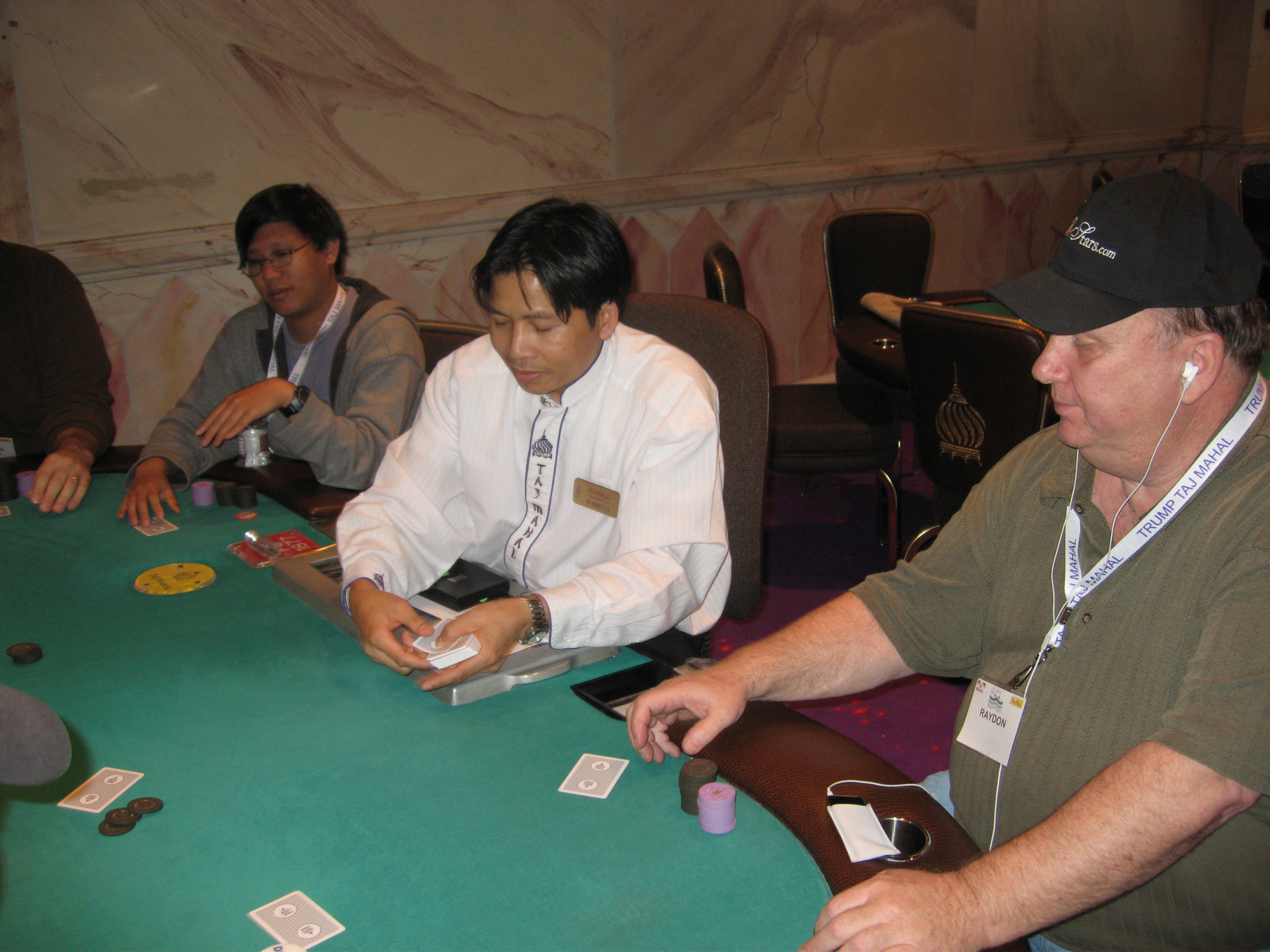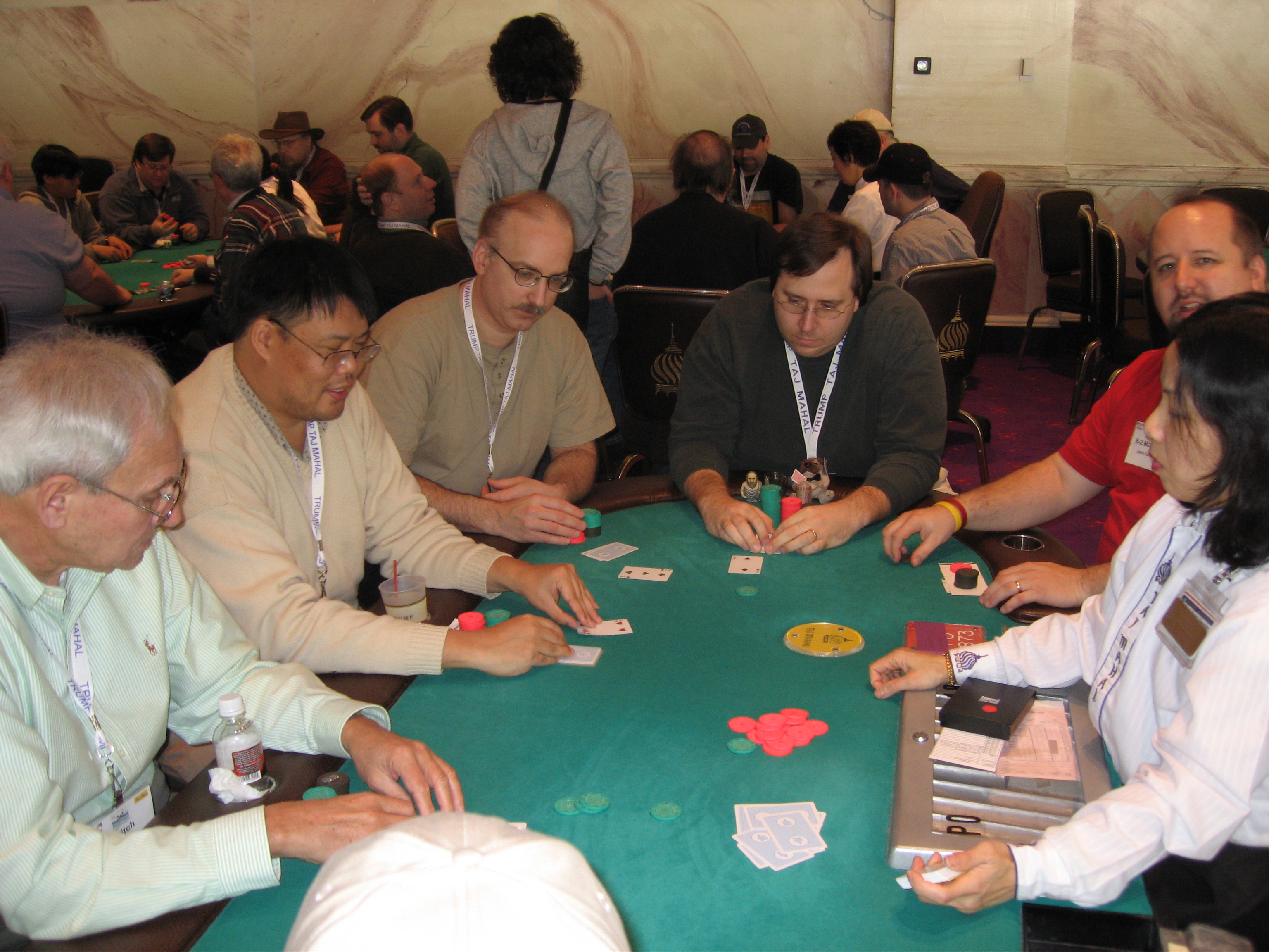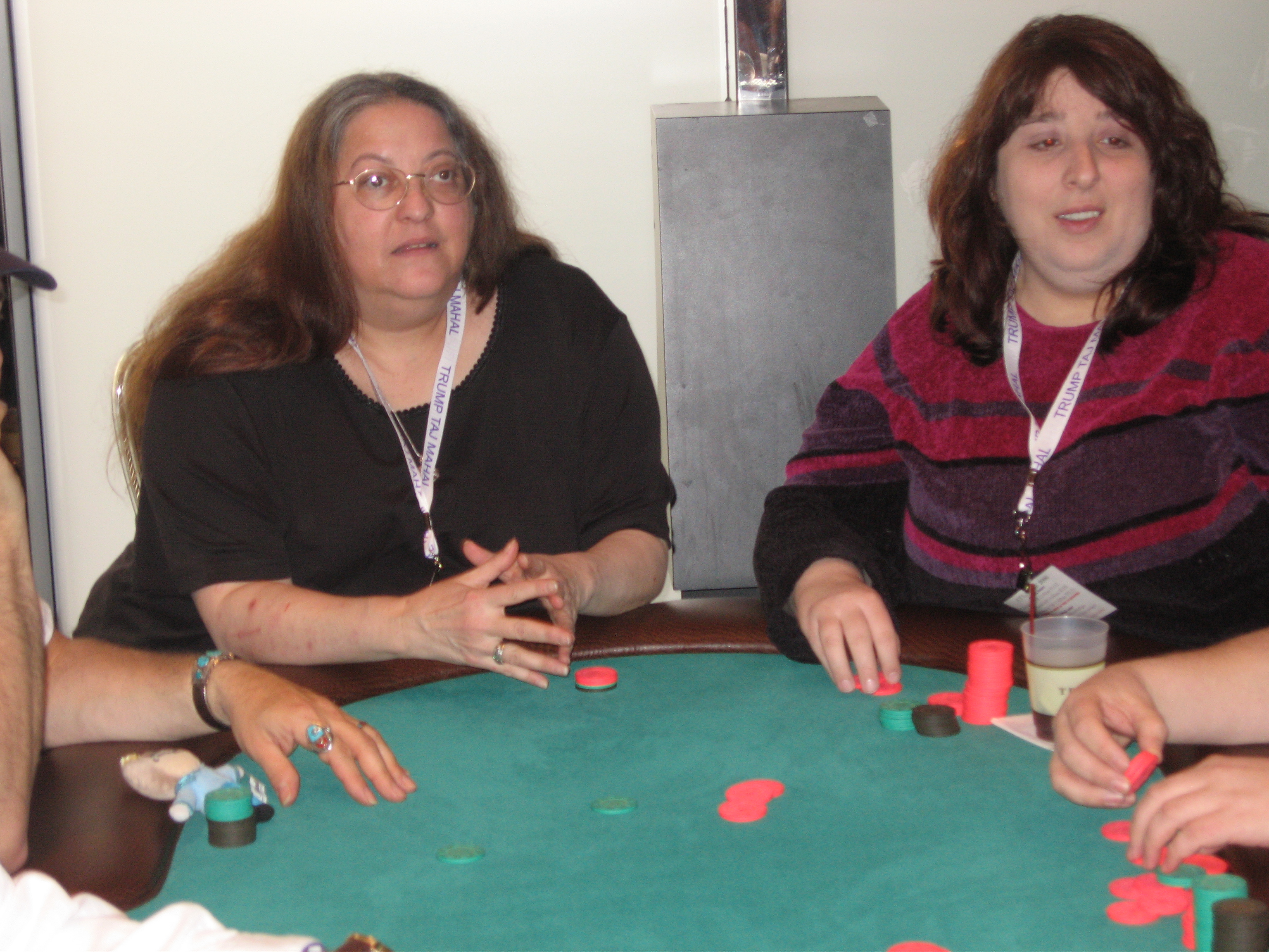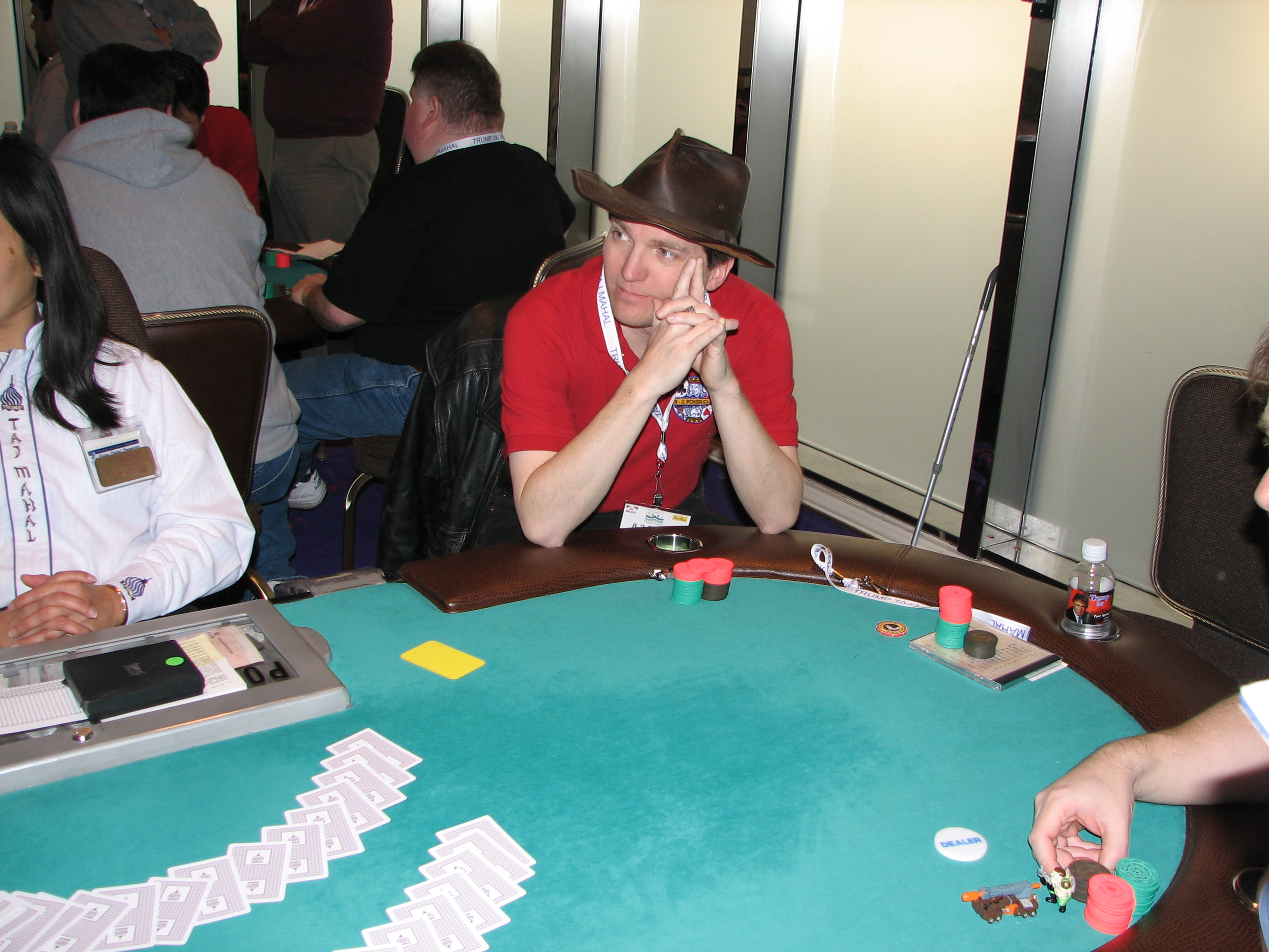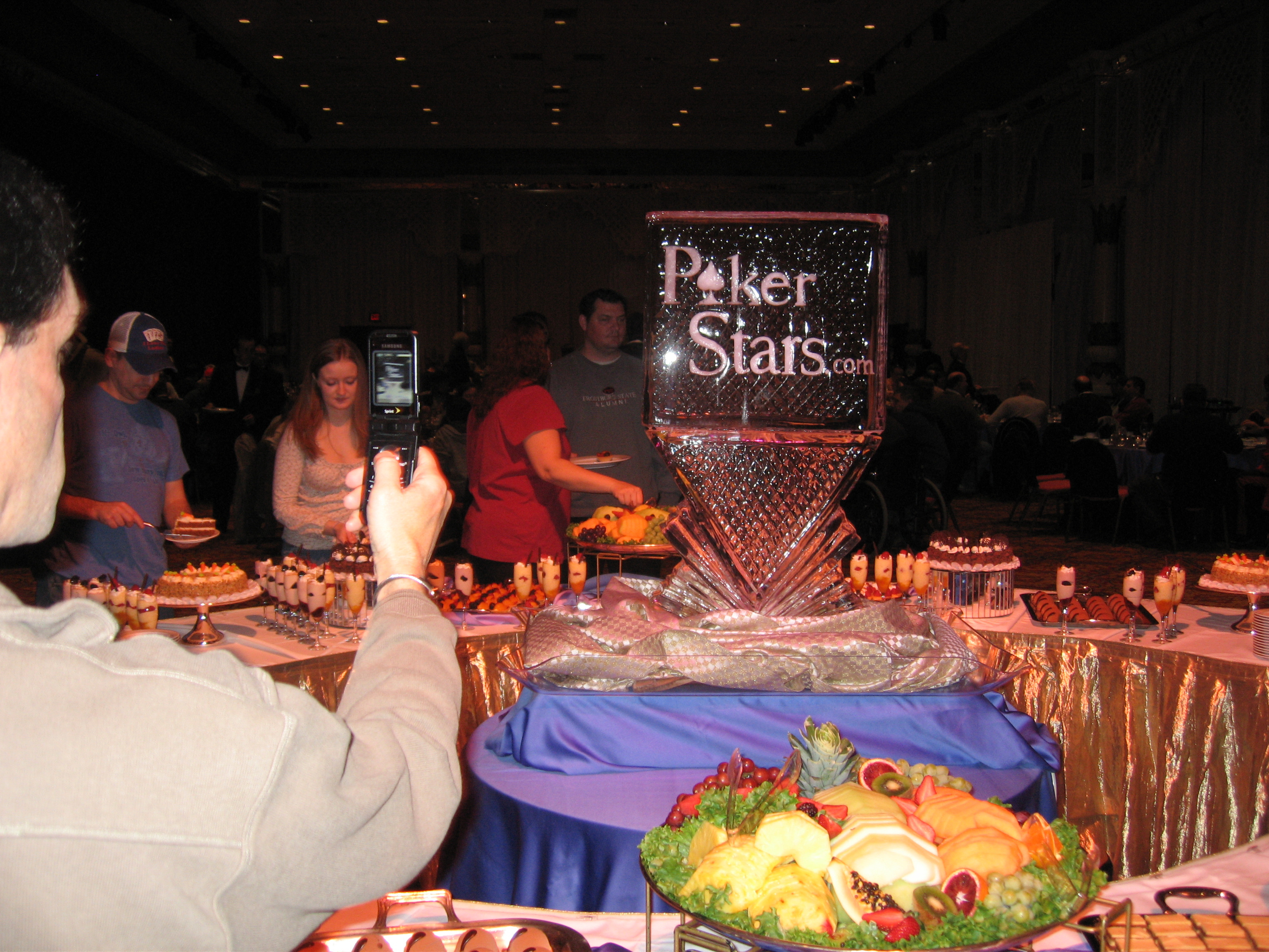 (From her blog: http://www.noninetofive.blogspot.com/ [dead link --Ed.]) Matt and Ivy picked me up bright and early and we left Brooklyn for AC. The first thing Matt told me when we got in the car was that the gas gauge was broken (permanently stuck on "E"). He then informed me of something even more hysterical: that I would be playing the H.O.E. tournament when we arrived at the Taj. I hadn't planned on playing this event. I've had historically abysmal results in limit hold 'em tourneys. My Omaha game is so-so on a good day. And before this weekend, I had played Stud O8 exactly once in my life. Overall, not a lot of reasons to play a $120 tournament involving these three games. We arrived just as the tournament registration was finishing up, and since I couldn't check into my room until noon I decided I might as well pass the time reuniting with fellow ARGErs at the poker table. Matt finally convinced me by offering to take half my action. I told him it was a lousy investment, outlining my reasons from above, but the long drive and lack of breakfast must have addled his brain because we ended up making this deal anyway. After a mad scramble to get a Taj card, I signed up for the tourney and took my seat. I was about to play my first H.O.E. tournament. I played at so many tables in this tourney that it's hard to recall who was at each one. Please yell at me if I forget you or get this wrong. Players I remember from my first table were Kenny, Matt, and Laurie Caulkins. Laurie had a nice set of chopsticks from her recent trip to China as her bust-out prize and I eyed them covetously. I don't remember any hands from this table, and in fact the most memorable thing that happened was Ivy Janet bringing us all a box of sinfully delicious Krispy Kream doughnuts. Mmmm, doughnuts.....argharhgahrargh. I found that the rotation game format really kept me paying attention in this tournament. Having to think about a different game every half hour or so kept things interesting, and I really enjoyed it. (Anyone know of any rotation tourneys online?) I found that my Omaha game was on par with the players around me, and I muddled through the Stud rounds without spewing too many chips. My basic strategy in Stud early on was to fold almost every hand except the ones I was 100% sure were playable, pinpoint the players at my table who seemed to understand the game, and watch them play theirs. (I also saw a fair number of examples of what not to do...) My stack remained healthy through most of the early rounds. As the blinds increased, I started to worry more about the fact that I would not be able to make it deep in this tournament without winning some Stud hands. The pots in Stud were the largest being played, and I needed to get my hands on those chips sooner or later. My first huge pot was not in Stud, but in Omaha. One player limped and I limped behind with A4xx double-suited (sorry I don't have more precise hand histories). The flop came with two low cards and one diamond. I held the Ax of diamonds. The turn paired the board, and I donked along to the river, where I hit my flush. I called one bet, as did the limper behind me, and when we turned up our hands I was up against a smaller flush for the high and ended up with half the low as well. I was accumulating chips nicely and never had much concern for my chip stack. Until I was moved yet again and found myself with Jeff Caulkins and Bill Chen on my right and Rob "ActionBob" Hwang on my left. And oh, good, the Stud round was beginning. Bill wonders if he'll make it to his speech on time. I don't know much about Stud O8, but it seemed to me that as long as I went for the low, I could sometimes back into a decent high and still win. I scooped two huge Stud pots at this table, both with two pair. How could this be?? On one hand, no one had a low, so and on the other my two small pair were good. Is this common in Stud? My only other experience with split games is Omaha, and two pair are rarely good for the high in that game. Stacking my chips, I looked up and saw that Jeff had a pair of chopsticks as his bust-out prize just as Laurie had. I wanted them. During the Hold 'Em round, I looked down at two red sevens. Jeff was short-stacked and called my pre-flop raise. The flop came ten-high and he moved in. I wanted those chopsticks real bad so I called. Jeff showed two overs (ace-jack, I think?) and got no love from the turn or river. Jeff was out and the chopsticks were mine! Woot! Now I had a serious stack, and entered my favorite part of a tournament: the part where I have chips and start raising like it's going out of style. During the course of this tournament, someone gave me the nickname, "Raising Station." I took that as a compliment. I was able to steal some blinds/antes/pots during the next few rounds (and to be fair, I was also getting smacked with the deck) and built my stack even bigger. One by one, players were getting knocked out around me (and sometimes, *by* me!). I started to think I might have a shot at going really deep in this thing. The raising station (center). Thank goodness I've built up my tourney stamina online during the past few months, and thank goodness that the deeper you get in a tournament, the less the specific game matters. Nine hours after we began, I found myself at the final table. The blinds were insane, and any given hand could turn the short stack into the chip leader (and vice versa). I made this swing a couple of times myself as we remained eight-handed for nearly an hour. Then there was a rapid series of bust-outs and we were four-handed: Rob "Suddenly" Catlett, Bill Chen, Gabe DeVitto, and me. It was approaching 8pm, when the banquet was supposed to begin, so we had a pitiful number of sweaters. They were busy admiring the Poker Stars ice sculpture upstairs. Since I was a moron and didn't record any of this sooner, I have no remarkable hands to report. Bill busted fourth, followed by Rob, and that left Gabe and me