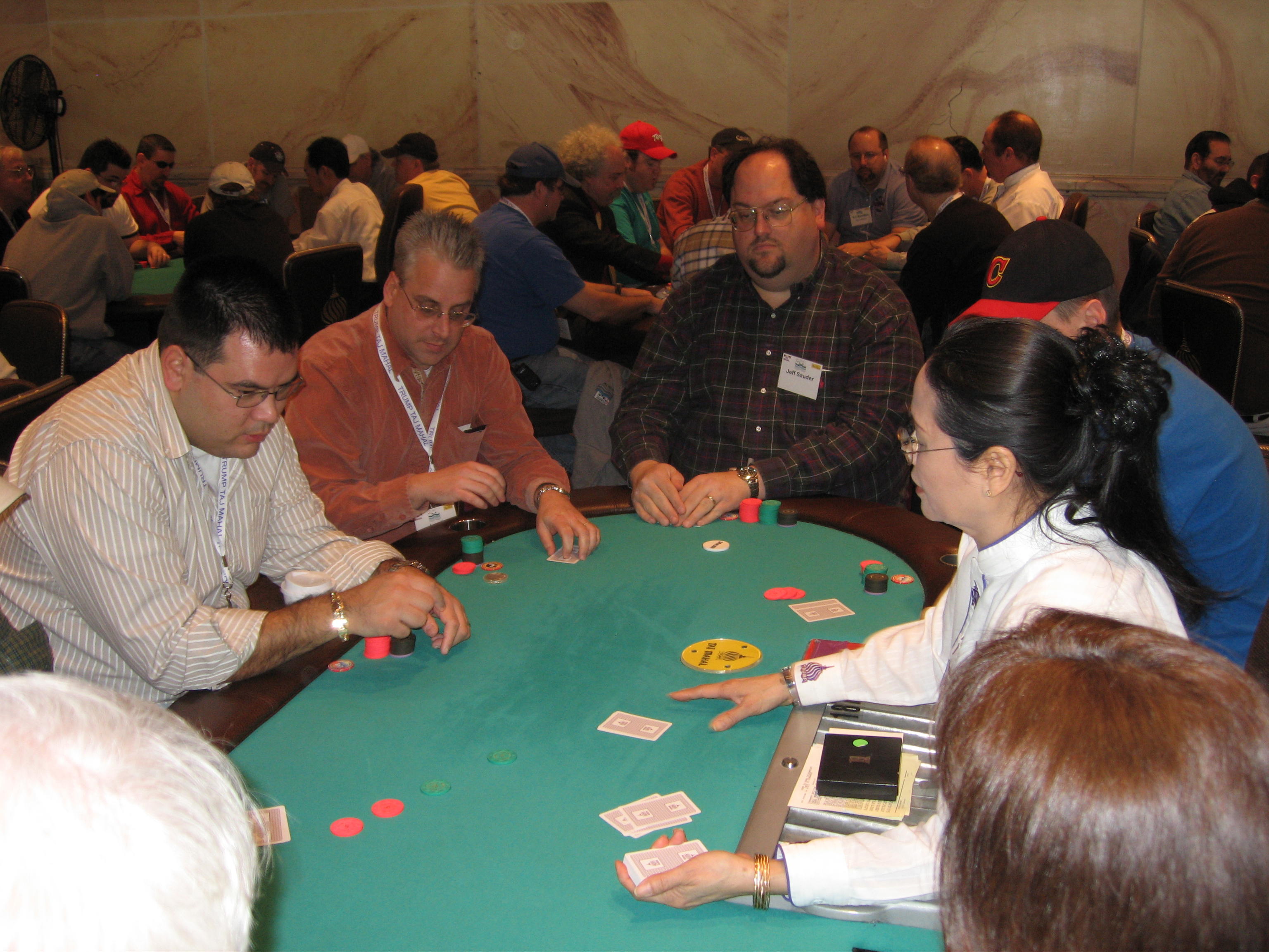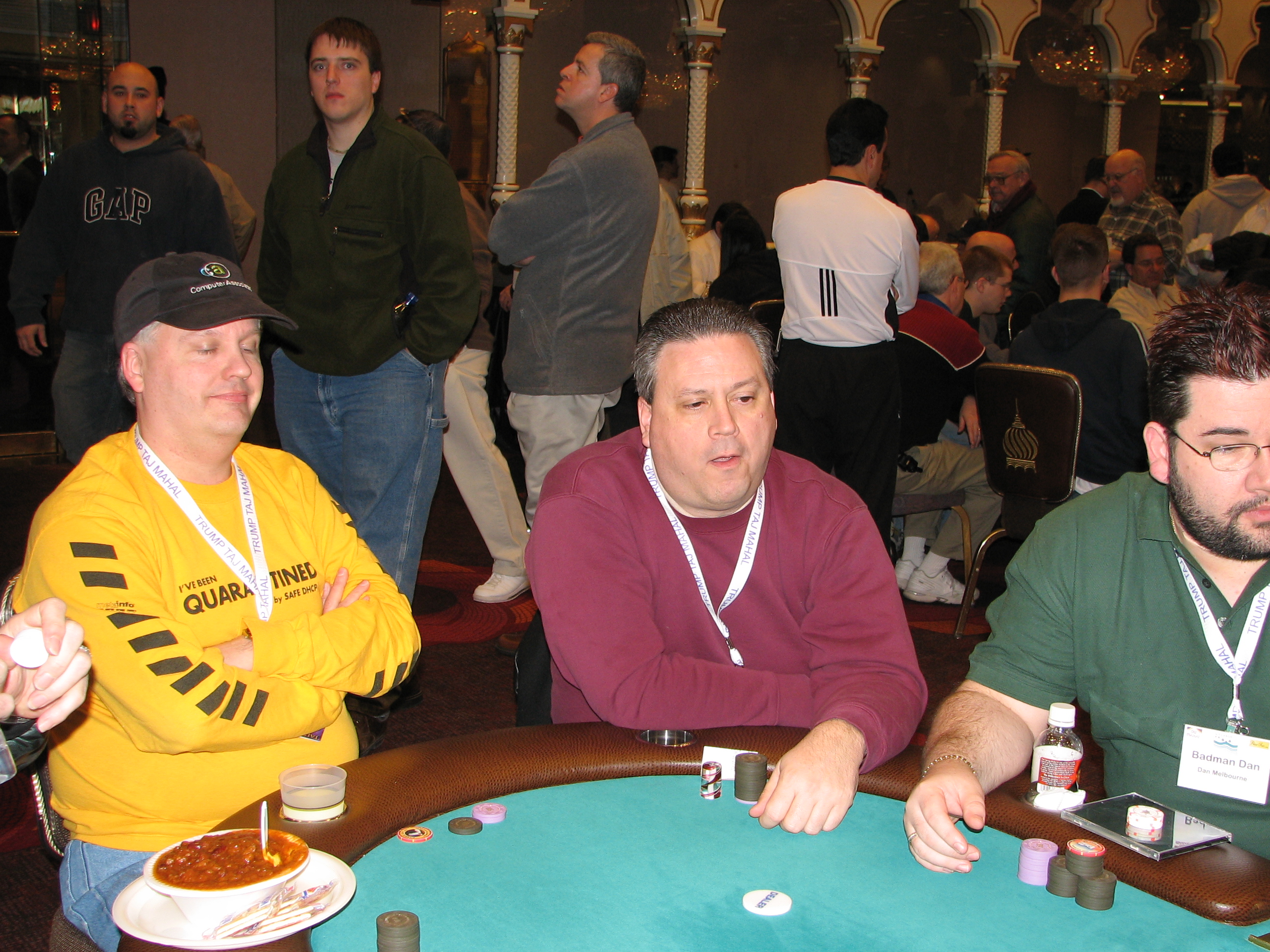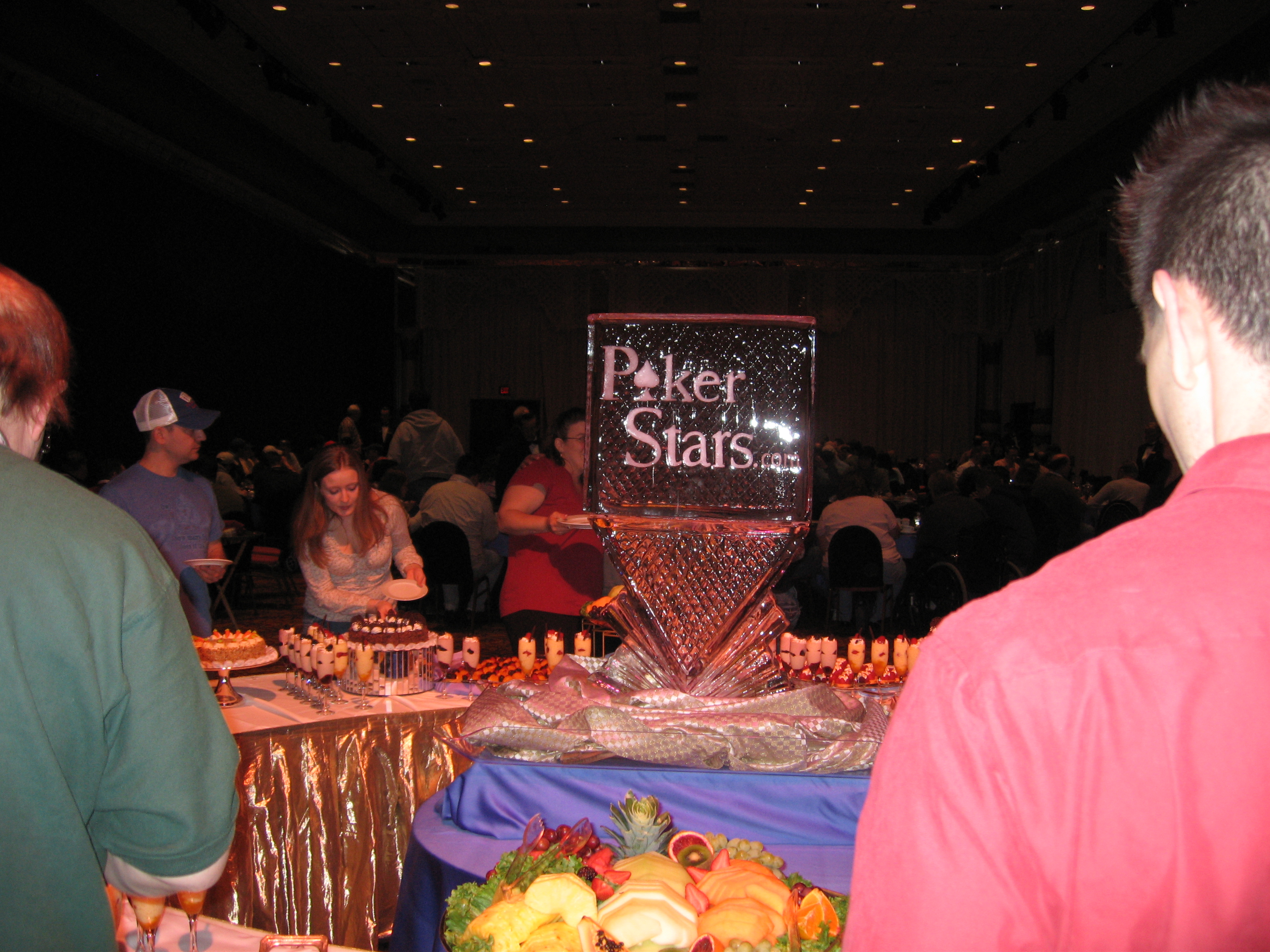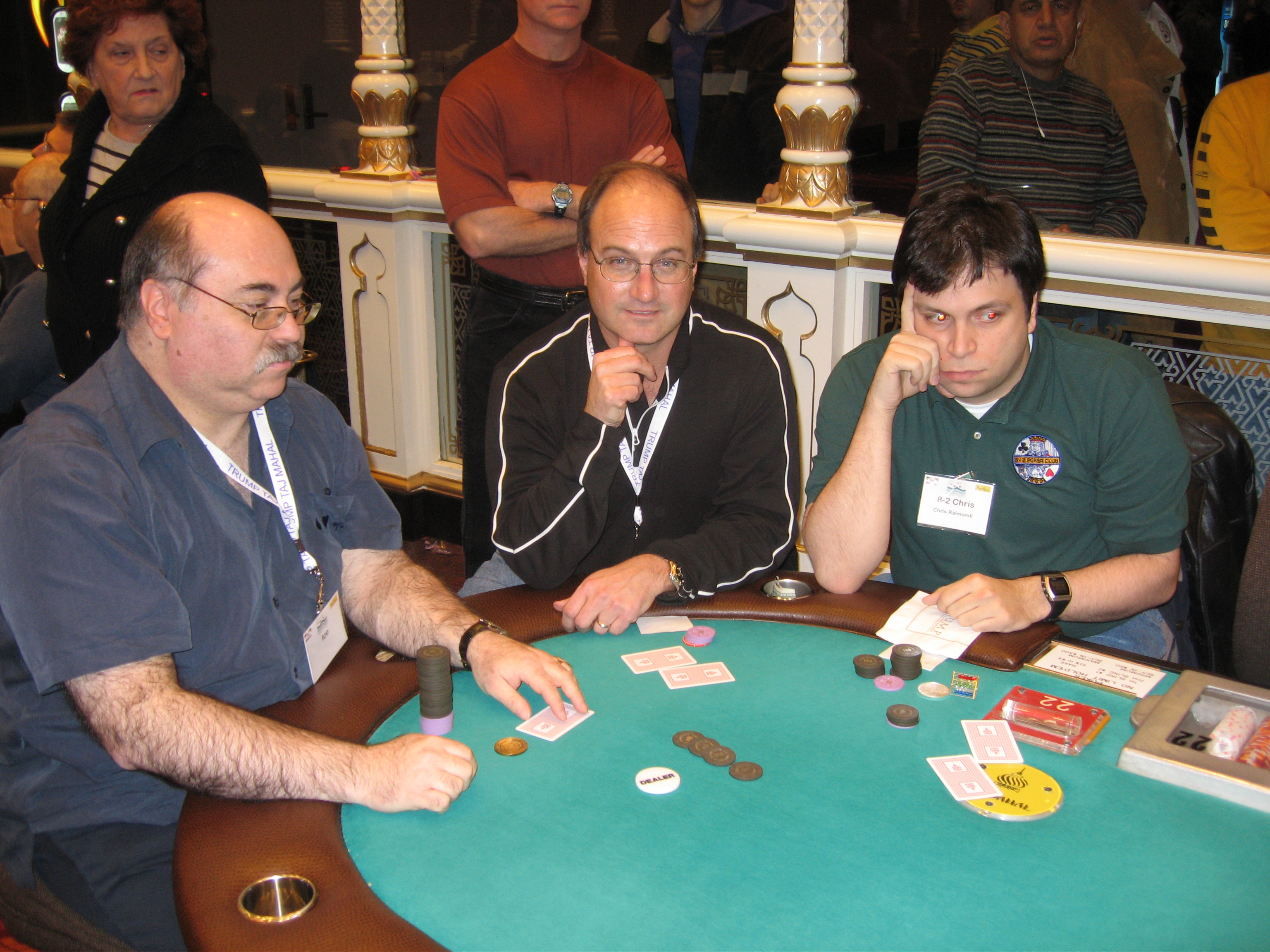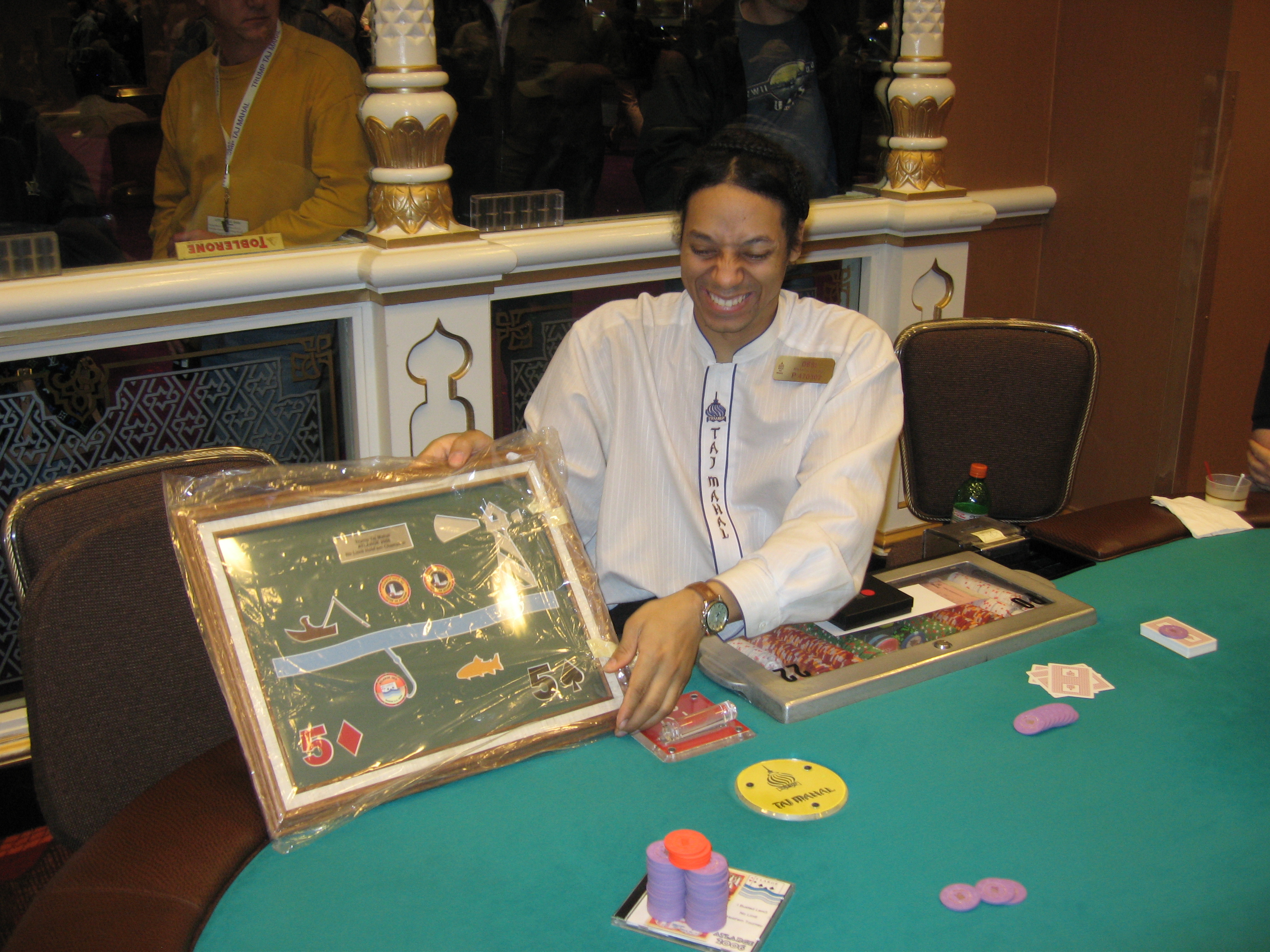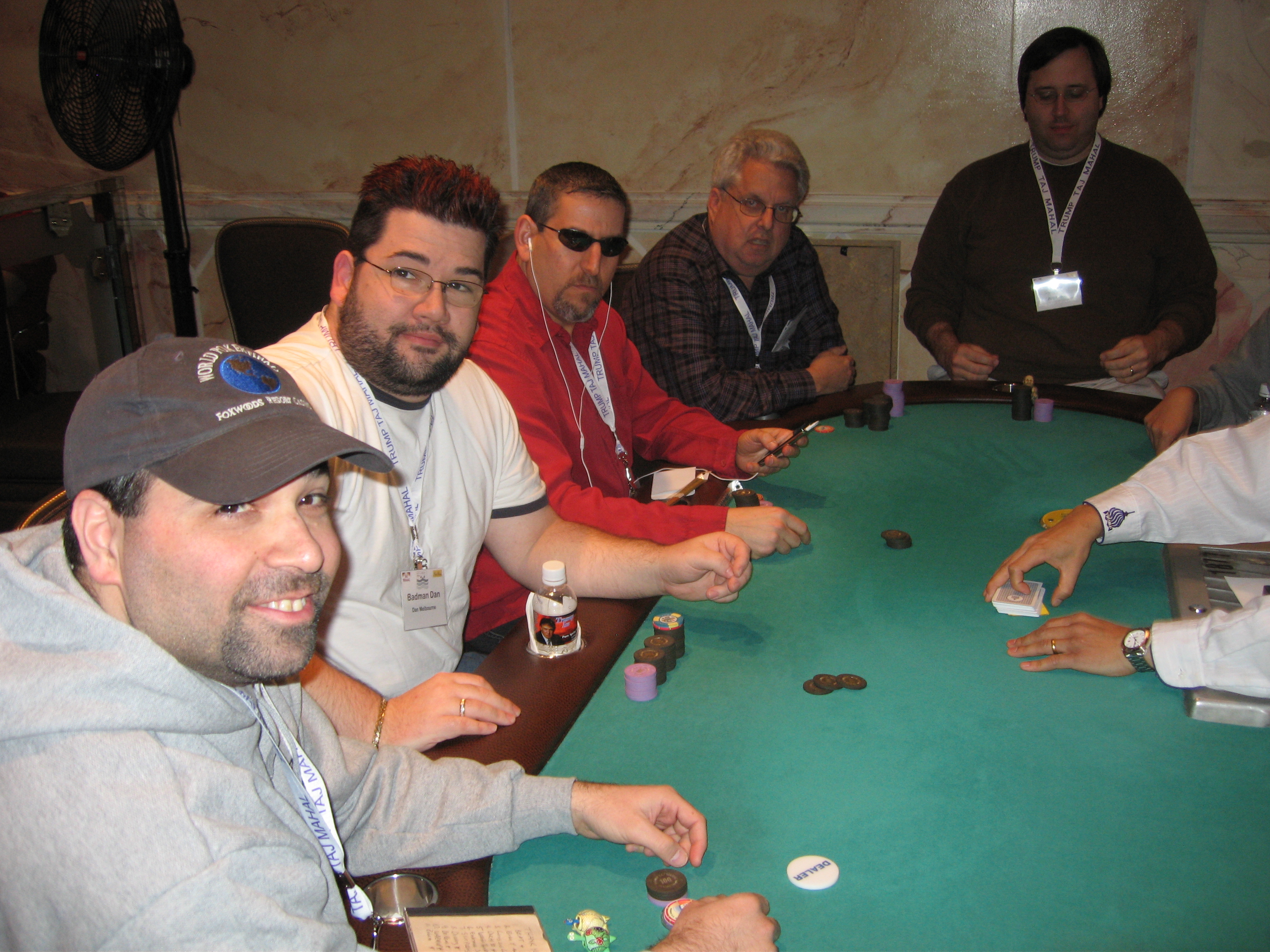 (From her blog: http://www.noninetofive.blogspot.com/ [dead link --Ed.]) Matt and Ivy picked me up bright and early and we left Brooklyn for AC. The first thing Matt told me when we got in the car was that the gas gauge was broken (permanently stuck on "E"). He then informed me of something even more hysterical: that I would be playing the H.O.E. tournament when we arrived at the Taj. I hadn't planned on playing this event. I've had historically abysmal results in limit hold 'em tourneys. My Omaha game is so-so on a good day. And before this weekend, I had played Stud O8 exactly once in my life. Overall, not a lot of reasons to play a $120 tournament involving these three games. We arrived just as the tournament registration was finishing up, and since I couldn't check into my room until noon I decided I might as well pass the time reuniting with fellow ARGErs at the poker table. Matt finally convinced me by offering to take half my action. I told him it was a lousy investment, outlining my reasons from above, but the long drive and lack of breakfast must have addled his brain because we ended up making this deal anyway. After a mad scramble to get a Taj card, I signed up for the tourney and took my seat. I was about to play my first H.O.E. tournament. I played at so many tables in this tourney that it's hard to recall who was at each one. Please yell at me if I forget you or get this wrong. Players I remember from my first table were Kenny, Matt, and Laurie Caulkins. Laurie had a nice set of chopsticks from her recent trip to China as her bust-out prize and I eyed them covetously. I don't remember any hands from this table, and in fact the most memorable thing that happened was Ivy Janet bringing us all a box of sinfully delicious Krispy Kream doughnuts. Mmmm, doughnuts.....argharhgahrargh. I found that the rotation game format really kept me paying attention in this tournament. Having to think about a different game every half hour or so kept things interesting, and I really enjoyed it. (Anyone know of any rotation tourneys online?) I found that my Omaha game was on par with the players around me, and I muddled through the Stud rounds without spewing too many chips. My basic strategy in Stud early on was to fold almost every hand except the ones I was 100% sure were playable, pinpoint the players at my table who seemed to understand the game, and watch them play theirs. (I also saw a fair number of examples of what not to do...) My stack remained healthy through most of the early rounds. As the blinds increased, I started to worry more about the fact that I would not be able to make it deep in this tournament without winning some Stud hands. The pots in Stud were the largest being played, and I needed to get my hands on those chips sooner or later. My first huge pot was not in Stud, but in Omaha. One player limped and I limped behind with A4xx double-suited (sorry I don't have more precise hand histories). The flop came with two low cards and one diamond. I held the Ax of diamonds. The turn paired the board, and I donked along to the river, where I hit my flush. I called one bet, as did the limper behind me, and when we turned up our hands I was up against a smaller flush for the high and ended up with half the low as well. I was accumulating chips nicely and never had much concern for my chip stack. Until I was moved yet again and found myself with Jeff Caulkins and Bill Chen on my right and Rob "ActionBob" Hwang on my left. And oh, good, the Stud round was beginning. Bill wonders if he'll make it to his speech on time. I don't know much about Stud O8, but it seemed to me that as long as I went for the low, I could sometimes back into a decent high and still win. I scooped two huge Stud pots at this table, both with two pair. How could this be?? On one hand, no one had a low, so and on the other my two small pair were good. Is this common in Stud? My only other experience with split games is Omaha, and two pair are rarely good for the high in that game. Stacking my chips, I looked up and saw that Jeff had a pair of chopsticks as his bust-out prize just as Laurie had. I wanted them. During the Hold 'Em round, I looked down at two red sevens. Jeff was short-stacked and called my pre-flop raise. The flop came ten-high and he moved in. I wanted those chopsticks real bad so I called. Jeff showed two overs (ace-jack, I think?) and got no love from the turn or river. Jeff was out and the chopsticks were mine! Woot! Now I had a serious stack, and entered my favorite part of a tournament: the part where I have chips and start raising like it's going out of style. During the course of this tournament, someone gave me the nickname, "Raising Station." I took that as a compliment. I was able to steal some blinds/antes/pots during the next few rounds (and to be fair, I was also getting smacked with the deck) and built my stack even bigger. One by one, players were getting knocked out around me (and sometimes, *by* me!). I started to think I might have a shot at going really deep in this thing. The raising station (center). Thank goodness I've built up my tourney stamina online during the past few months, and thank goodness that the deeper you get in a tournament, the less the specific game matters. Nine hours after we began, I found myself at the final table. The blinds were insane, and any given hand could turn the short stack into the chip leader (and vice versa). I made this swing a couple of times myself as we remained eight-handed for nearly an hour. Then there was a rapid series of bust-outs and we were four-handed: Rob "Suddenly" Catlett, Bill Chen, Gabe DeVitto, and me. It was approaching 8pm, when the banquet was supposed to begin, so we had a pitiful number of sweaters. They were busy admiring the Poker Stars ice sculpture upstairs. Since I was a moron and didn't record any of this sooner, I have no remarkable hands to report. Bill busted fourth, followed by Rob, and that left Gabe and me