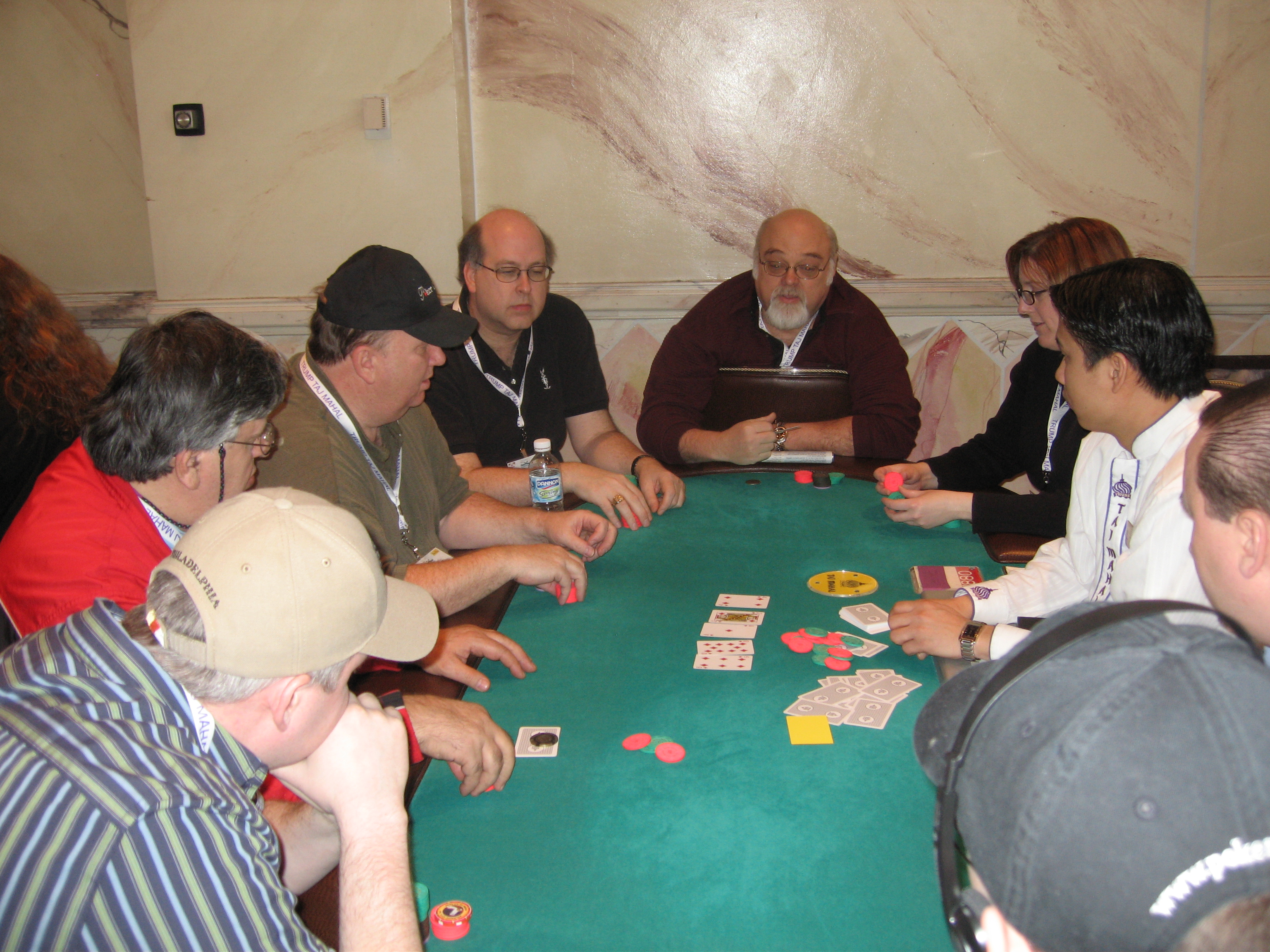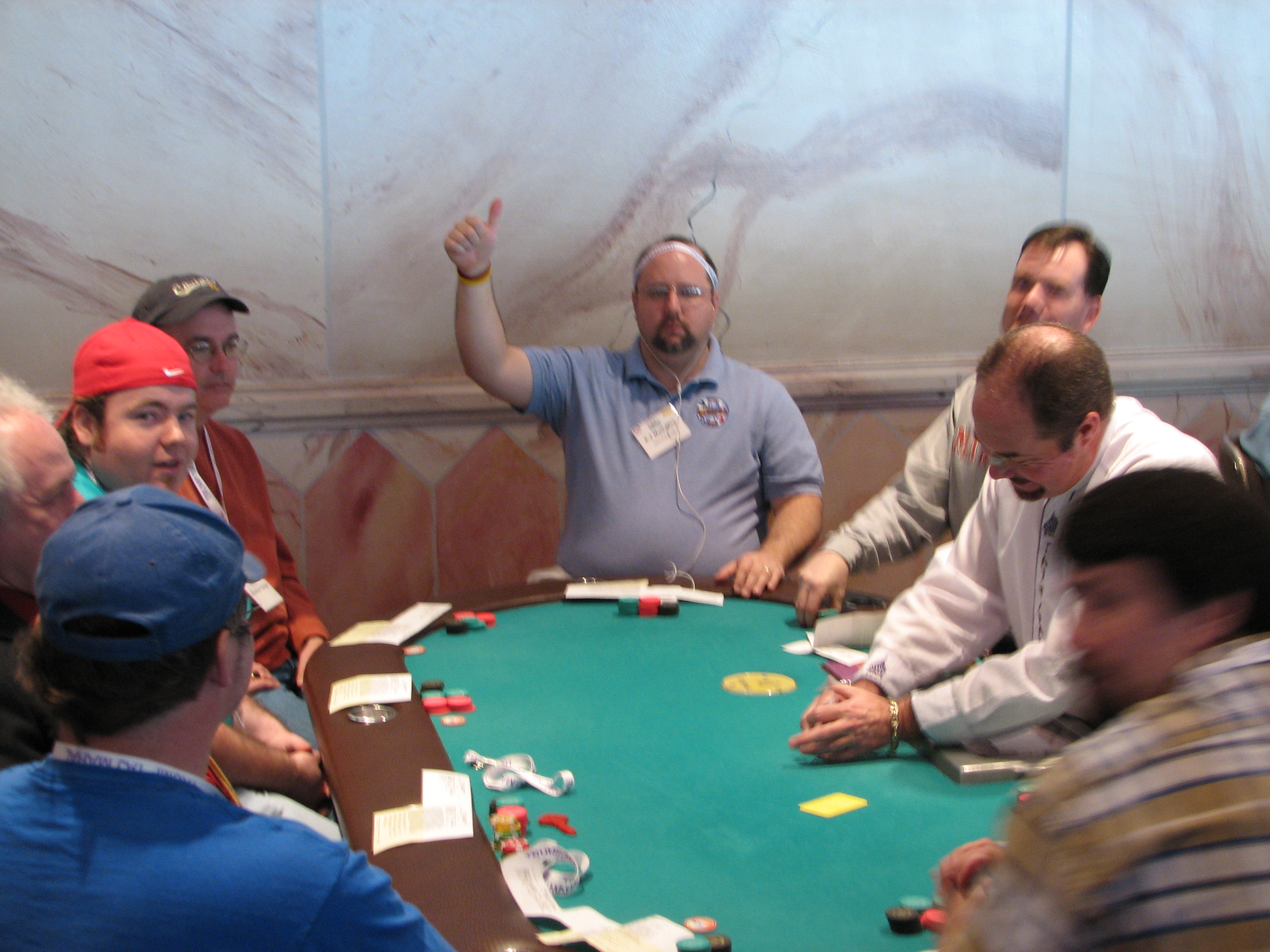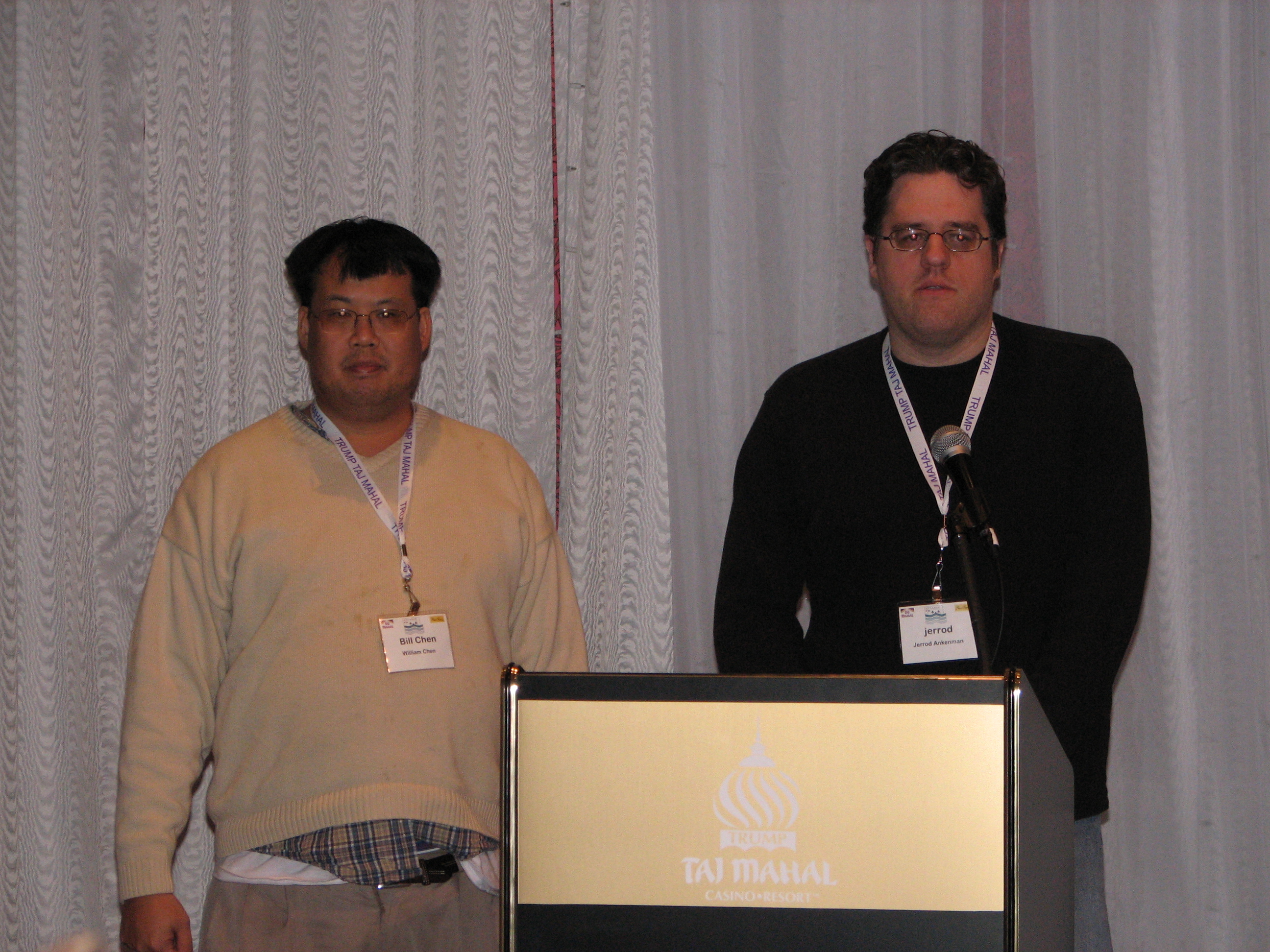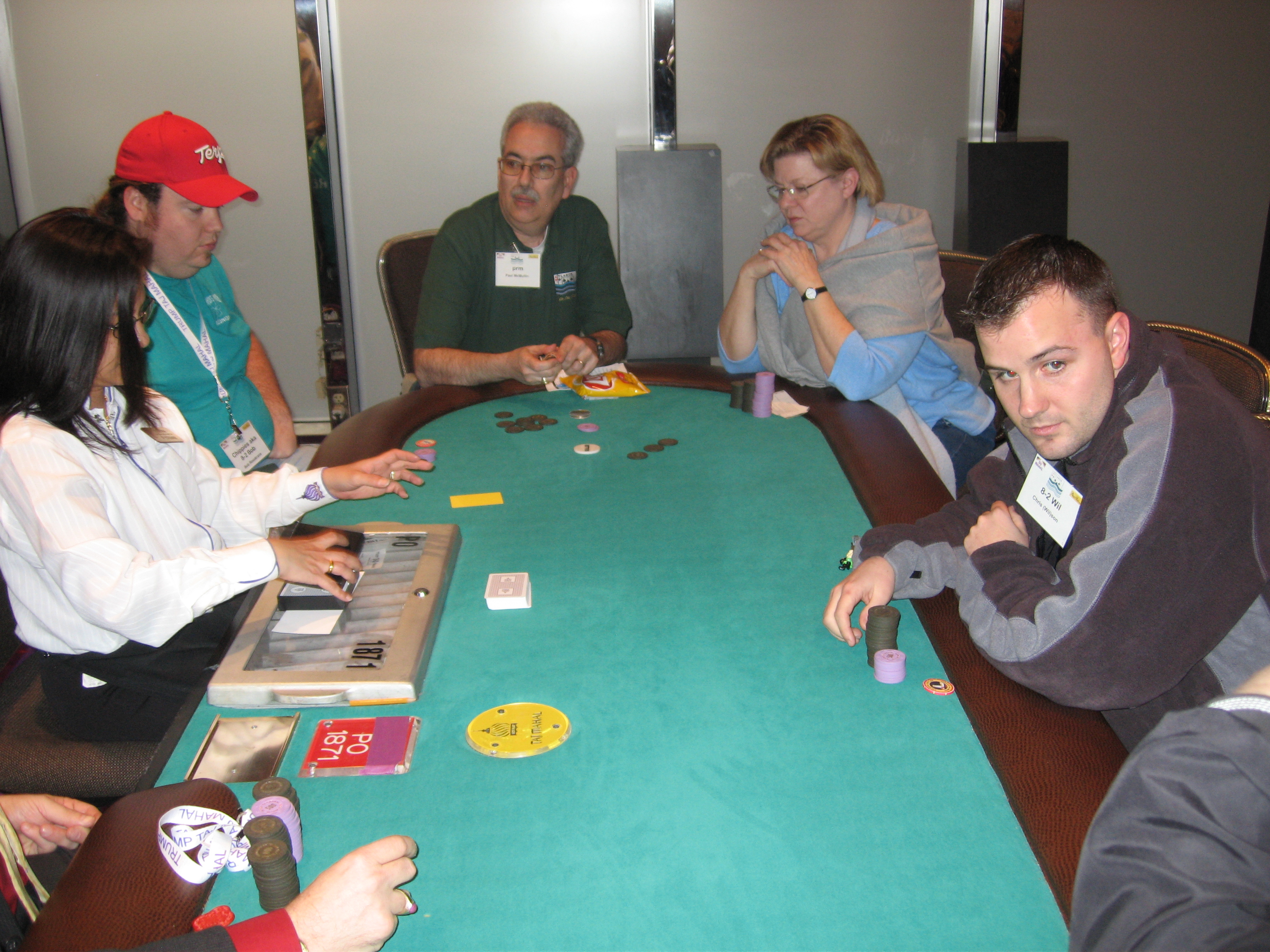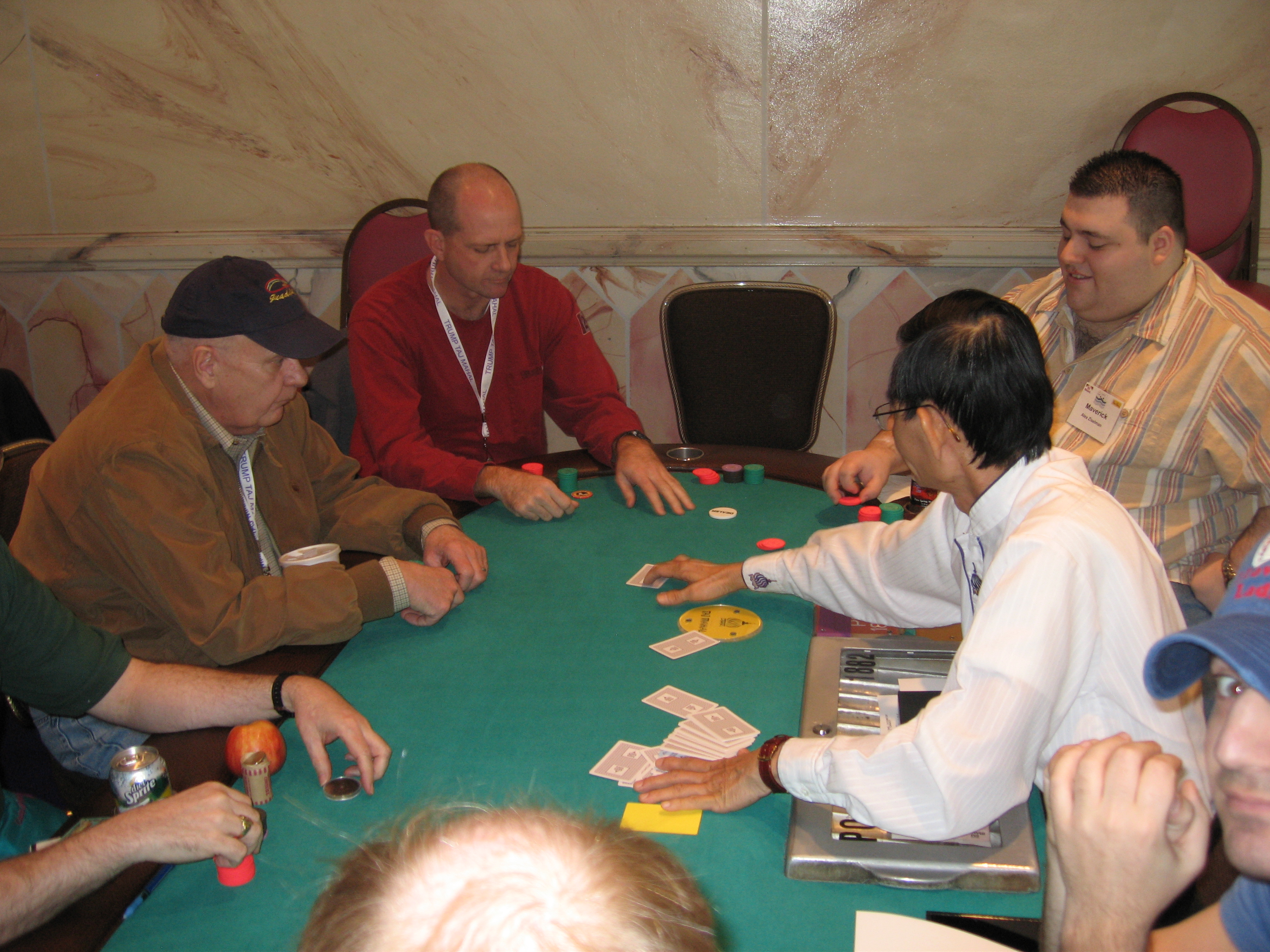 (From her blog: http://www.noninetofive.blogspot.com/ [dead link --Ed.]) Matt and Ivy picked me up bright and early and we left Brooklyn for AC. The first thing Matt told me when we got in the car was that the gas gauge was broken (permanently stuck on "E"). He then informed me of something even more hysterical: that I would be playing the H.O.E. tournament when we arrived at the Taj. I hadn't planned on playing this event. I've had historically abysmal results in limit hold 'em tourneys. My Omaha game is so-so on a good day. And before this weekend, I had played Stud O8 exactly once in my life. Overall, not a lot of reasons to play a $120 tournament involving these three games. We arrived just as the tournament registration was finishing up, and since I couldn't check into my room until noon I decided I might as well pass the time reuniting with fellow ARGErs at the poker table. Matt finally convinced me by offering to take half my action. I told him it was a lousy investment, outlining my reasons from above, but the long drive and lack of breakfast must have addled his brain because we ended up making this deal anyway. After a mad scramble to get a Taj card, I signed up for the tourney and took my seat. I was about to play my first H.O.E. tournament. I played at so many tables in this tourney that it's hard to recall who was at each one. Please yell at me if I forget you or get this wrong. Players I remember from my first table were Kenny, Matt, and Laurie Caulkins. Laurie had a nice set of chopsticks from her recent trip to China as her bust-out prize and I eyed them covetously. I don't remember any hands from this table, and in fact the most memorable thing that happened was Ivy Janet bringing us all a box of sinfully delicious Krispy Kream doughnuts. Mmmm, doughnuts.....argharhgahrargh. I found that the rotation game format really kept me paying attention in this tournament. Having to think about a different game every half hour or so kept things interesting, and I really enjoyed it. (Anyone know of any rotation tourneys online?) I found that my Omaha game was on par with the players around me, and I muddled through the Stud rounds without spewing too many chips. My basic strategy in Stud early on was to fold almost every hand except the ones I was 100% sure were playable, pinpoint the players at my table who seemed to understand the game, and watch them play theirs. (I also saw a fair number of examples of what not to do...) My stack remained healthy through most of the early rounds. As the blinds increased, I started to worry more about the fact that I would not be able to make it deep in this tournament without winning some Stud hands. The pots in Stud were the largest being played, and I needed to get my hands on those chips sooner or later. My first huge pot was not in Stud, but in Omaha. One player limped and I limped behind with A4xx double-suited (sorry I don't have more precise hand histories). The flop came with two low cards and one diamond. I held the Ax of diamonds. The turn paired the board, and I donked along to the river, where I hit my flush. I called one bet, as did the limper behind me, and when we turned up our hands I was up against a smaller flush for the high and ended up with half the low as well. I was accumulating chips nicely and never had much concern for my chip stack. Until I was moved yet again and found myself with Jeff Caulkins and Bill Chen on my right and Rob "ActionBob" Hwang on my left. And oh, good, the Stud round was beginning. Bill wonders if he'll make it to his speech on time. I don't know much about Stud O8, but it seemed to me that as long as I went for the low, I could sometimes back into a decent high and still win. I scooped two huge Stud pots at this table, both with two pair. How could this be?? On one hand, no one had a low, so and on the other my two small pair were good. Is this common in Stud? My only other experience with split games is Omaha, and two pair are rarely good for the high in that game. Stacking my chips, I looked up and saw that Jeff had a pair of chopsticks as his bust-out prize just as Laurie had. I wanted them. During the Hold 'Em round, I looked down at two red sevens. Jeff was short-stacked and called my pre-flop raise. The flop came ten-high and he moved in. I wanted those chopsticks real bad so I called. Jeff showed two overs (ace-jack, I think?) and got no love from the turn or river. Jeff was out and the chopsticks were mine! Woot! Now I had a serious stack, and entered my favorite part of a tournament: the part where I have chips and start raising like it's going out of style. During the course of this tournament, someone gave me the nickname, "Raising Station." I took that as a compliment. I was able to steal some blinds/antes/pots during the next few rounds (and to be fair, I was also getting smacked with the deck) and built my stack even bigger. One by one, players were getting knocked out around me (and sometimes, *by* me!). I started to think I might have a shot at going really deep in this thing. The raising station (center). Thank goodness I've built up my tourney stamina online during the past few months, and thank goodness that the deeper you get in a tournament, the less the specific game matters. Nine hours after we began, I found myself at the final table. The blinds were insane, and any given hand could turn the short stack into the chip leader (and vice versa). I made this swing a couple of times myself as we remained eight-handed for nearly an hour. Then there was a rapid series of bust-outs and we were four-handed: Rob "Suddenly" Catlett, Bill Chen, Gabe DeVitto, and me. It was approaching 8pm, when the banquet was supposed to begin, so we had a pitiful number of sweaters. They were busy admiring the Poker Stars ice sculpture upstairs. Since I was a moron and didn't record any of this sooner, I have no remarkable hands to report. Bill busted fourth, followed by Rob, and that left Gabe and me