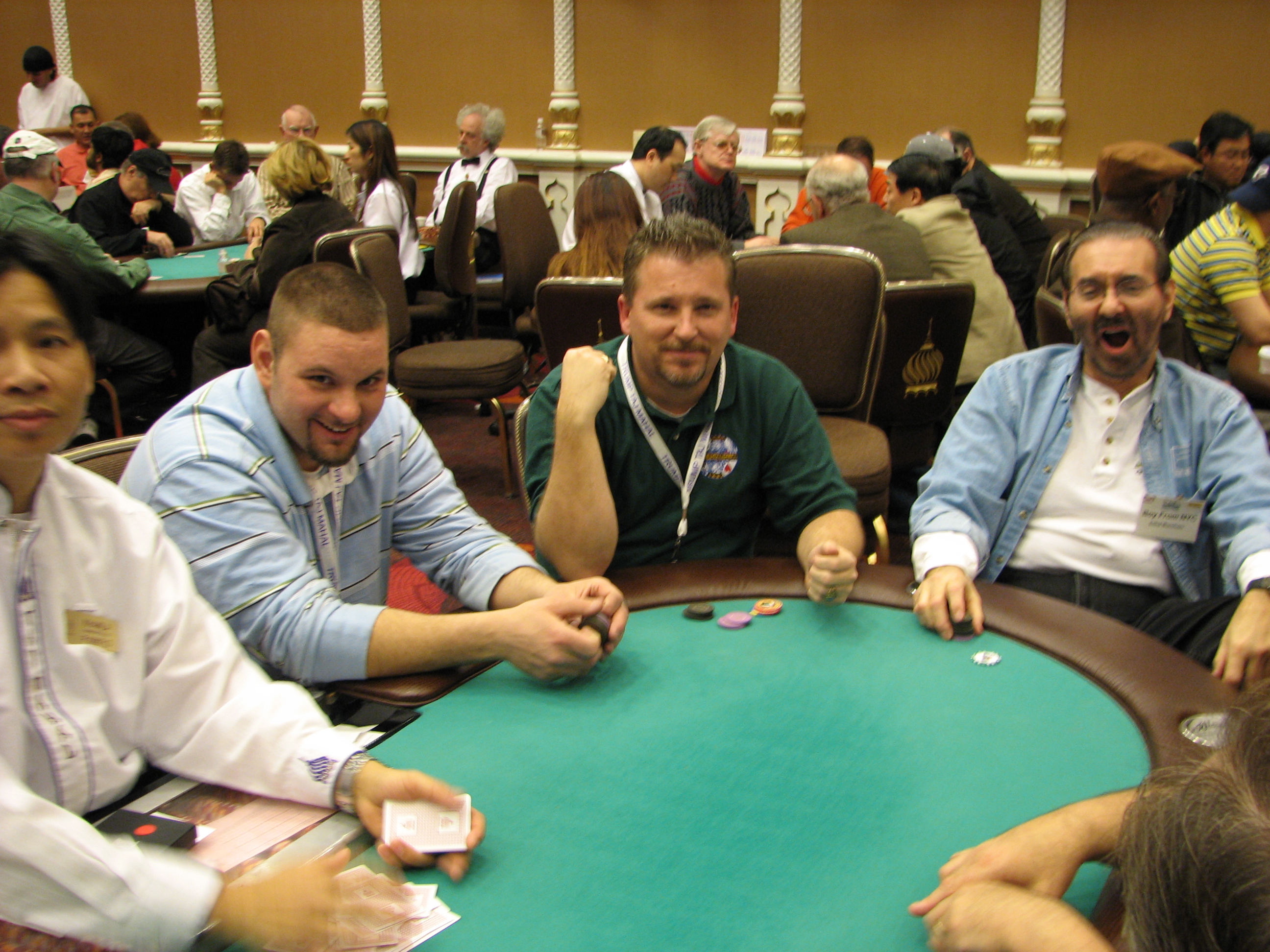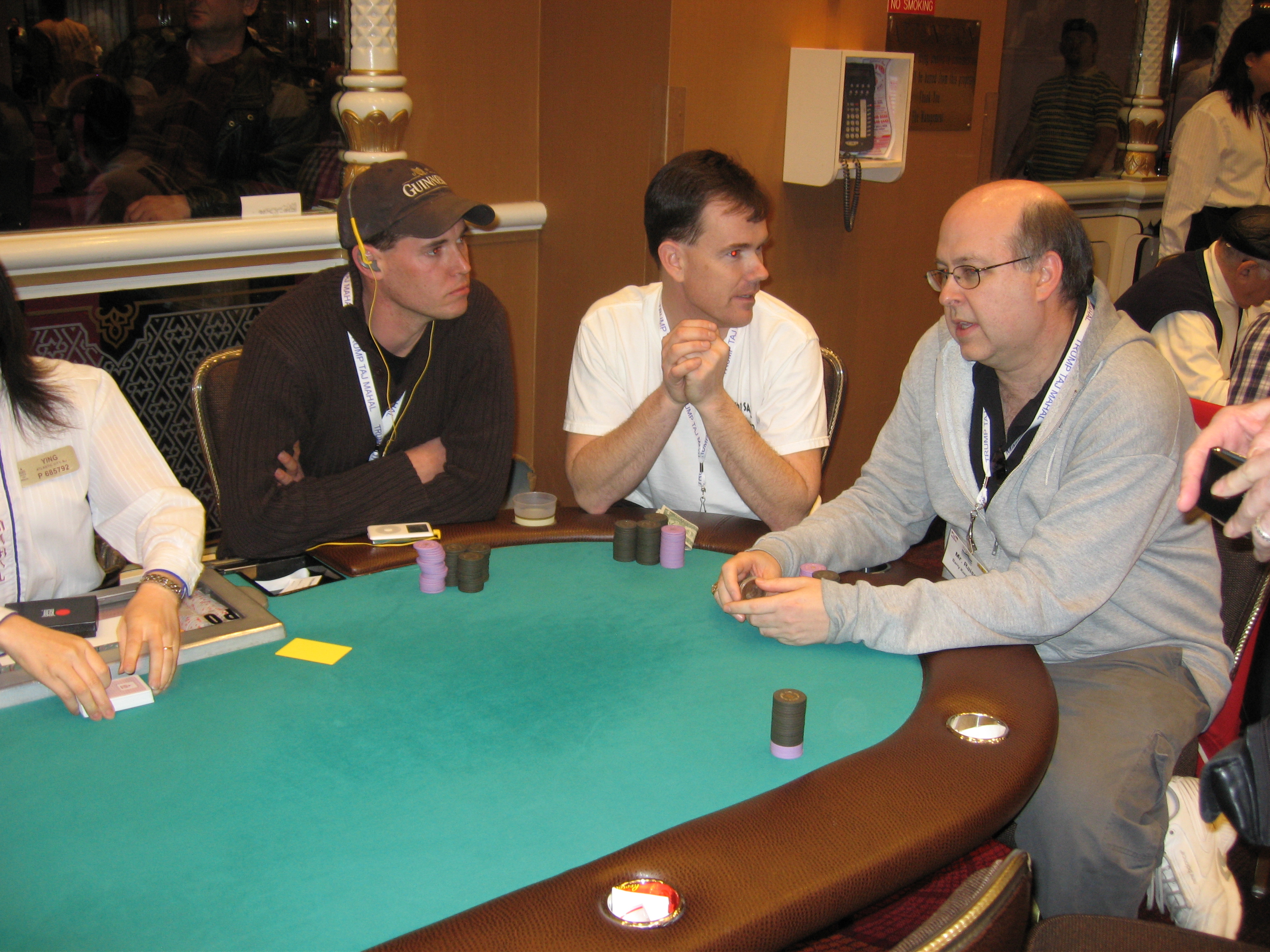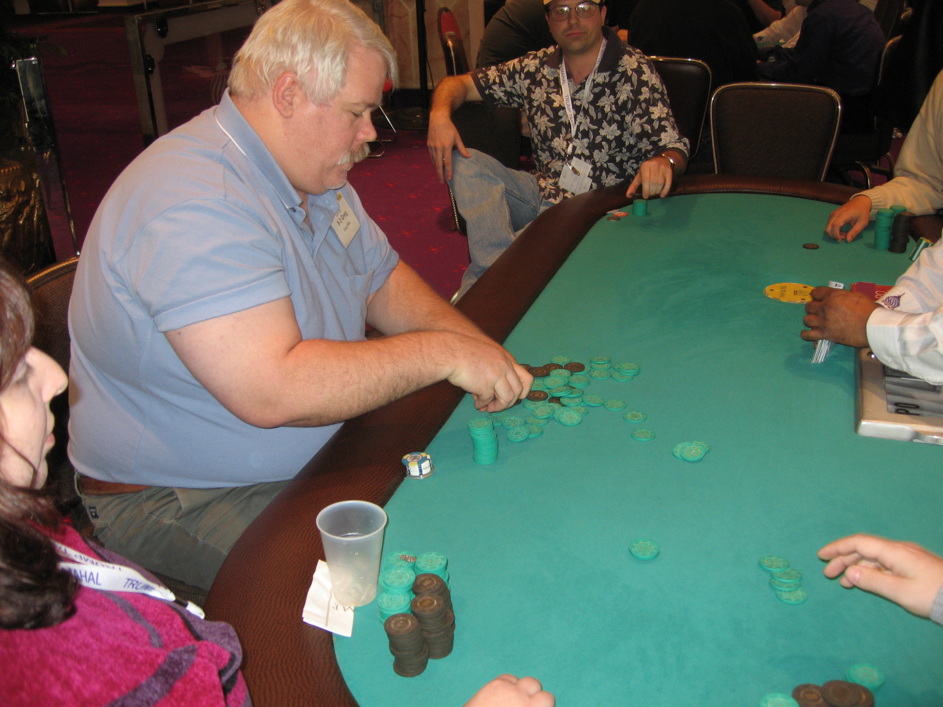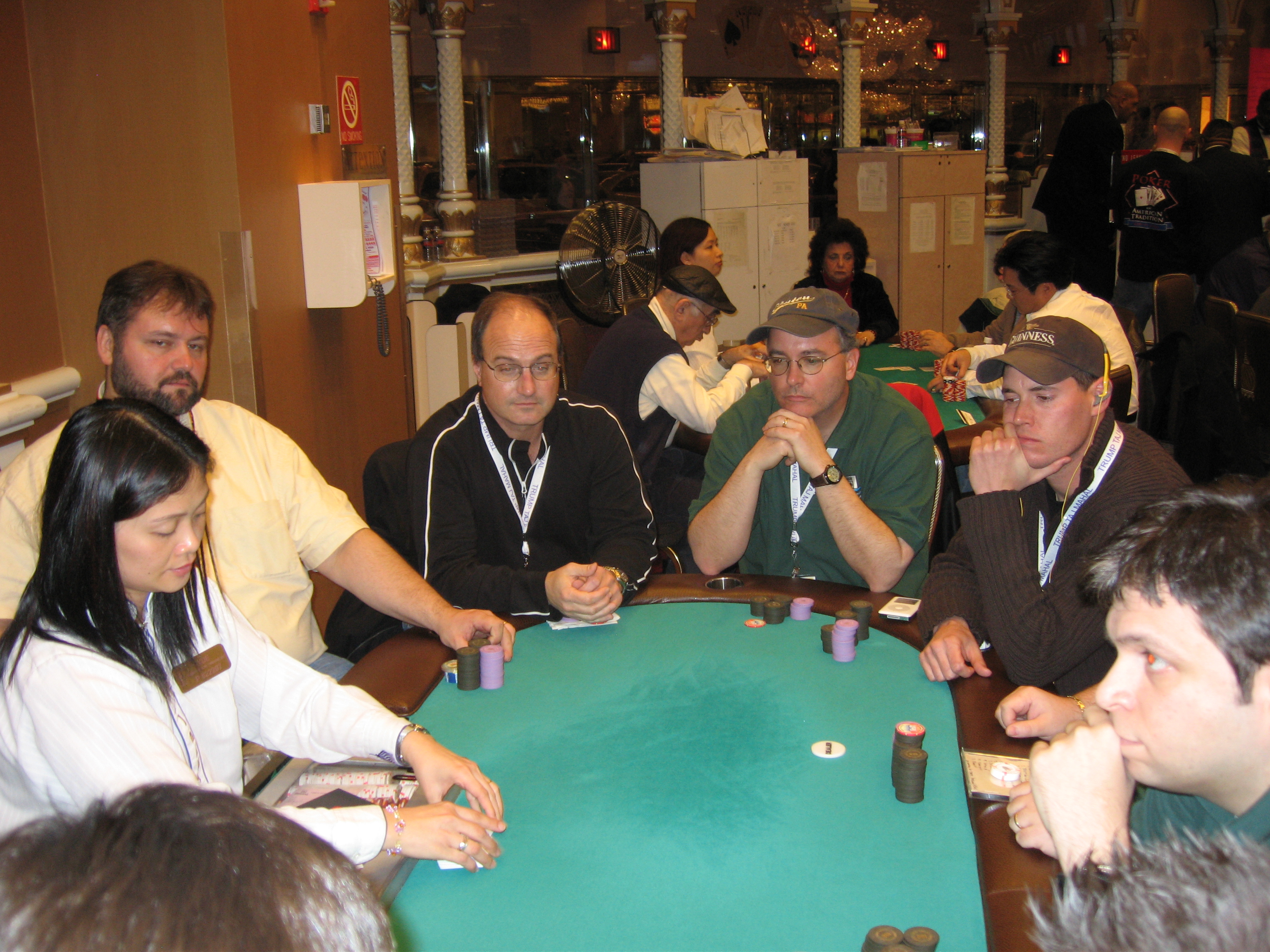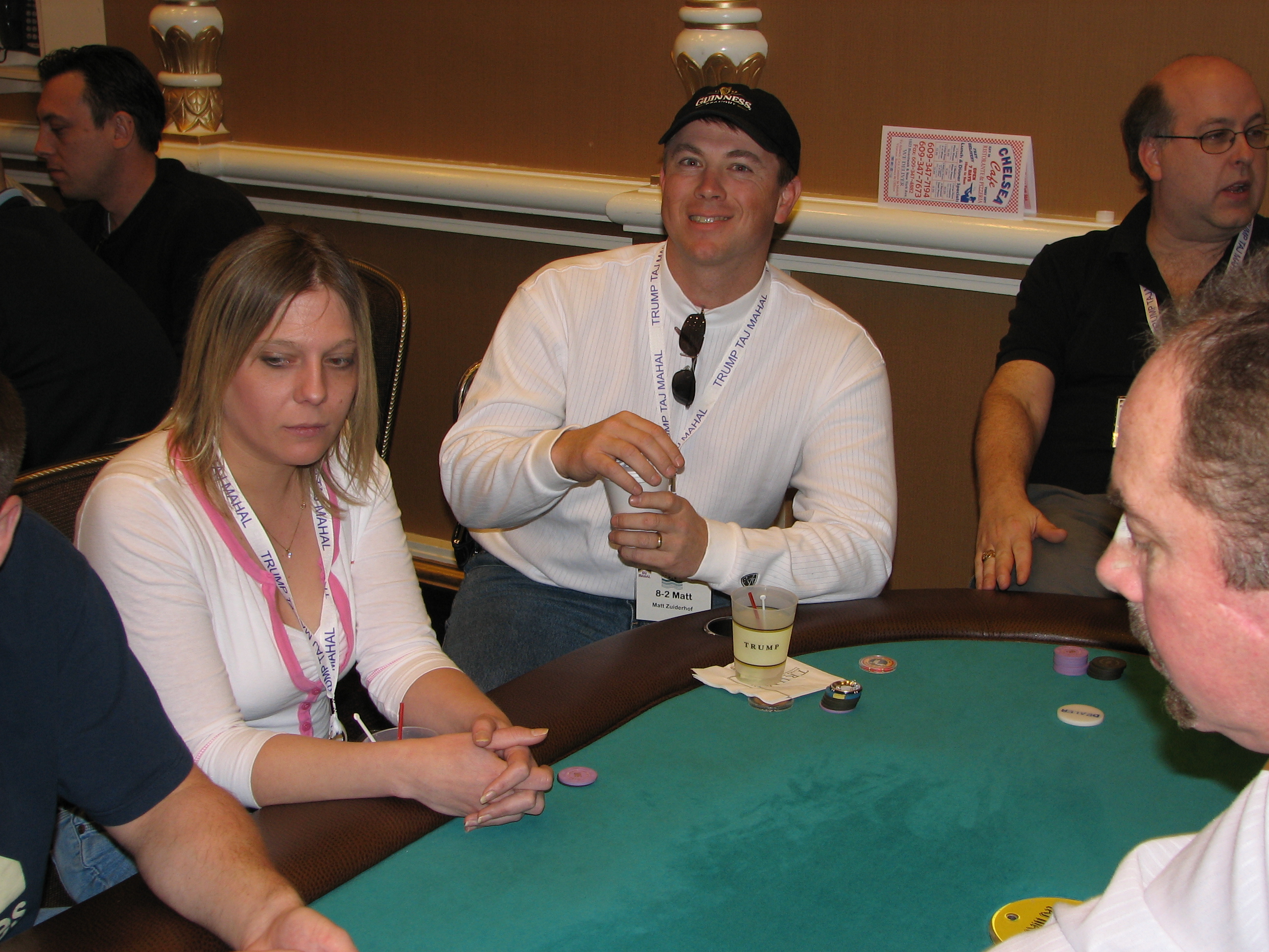 (From her blog: http://www.noninetofive.blogspot.com/ [dead link --Ed.]) Matt and Ivy picked me up bright and early and we left Brooklyn for AC. The first thing Matt told me when we got in the car was that the gas gauge was broken (permanently stuck on "E"). He then informed me of something even more hysterical: that I would be playing the H.O.E. tournament when we arrived at the Taj. I hadn't planned on playing this event. I've had historically abysmal results in limit hold 'em tourneys. My Omaha game is so-so on a good day. And before this weekend, I had played Stud O8 exactly once in my life. Overall, not a lot of reasons to play a $120 tournament involving these three games. We arrived just as the tournament registration was finishing up, and since I couldn't check into my room until noon I decided I might as well pass the time reuniting with fellow ARGErs at the poker table. Matt finally convinced me by offering to take half my action. I told him it was a lousy investment, outlining my reasons from above, but the long drive and lack of breakfast must have addled his brain because we ended up making this deal anyway. After a mad scramble to get a Taj card, I signed up for the tourney and took my seat. I was about to play my first H.O.E. tournament. I played at so many tables in this tourney that it's hard to recall who was at each one. Please yell at me if I forget you or get this wrong. Players I remember from my first table were Kenny, Matt, and Laurie Caulkins. Laurie had a nice set of chopsticks from her recent trip to China as her bust-out prize and I eyed them covetously. I don't remember any hands from this table, and in fact the most memorable thing that happened was Ivy Janet bringing us all a box of sinfully delicious Krispy Kream doughnuts. Mmmm, doughnuts.....argharhgahrargh. I found that the rotation game format really kept me paying attention in this tournament. Having to think about a different game every half hour or so kept things interesting, and I really enjoyed it. (Anyone know of any rotation tourneys online?) I found that my Omaha game was on par with the players around me, and I muddled through the Stud rounds without spewing too many chips. My basic strategy in Stud early on was to fold almost every hand except the ones I was 100% sure were playable, pinpoint the players at my table who seemed to understand the game, and watch them play theirs. (I also saw a fair number of examples of what not to do...) My stack remained healthy through most of the early rounds. As the blinds increased, I started to worry more about the fact that I would not be able to make it deep in this tournament without winning some Stud hands. The pots in Stud were the largest being played, and I needed to get my hands on those chips sooner or later. My first huge pot was not in Stud, but in Omaha. One player limped and I limped behind with A4xx double-suited (sorry I don't have more precise hand histories). The flop came with two low cards and one diamond. I held the Ax of diamonds. The turn paired the board, and I donked along to the river, where I hit my flush. I called one bet, as did the limper behind me, and when we turned up our hands I was up against a smaller flush for the high and ended up with half the low as well. I was accumulating chips nicely and never had much concern for my chip stack. Until I was moved yet again and found myself with Jeff Caulkins and Bill Chen on my right and Rob "ActionBob" Hwang on my left. And oh, good, the Stud round was beginning. Bill wonders if he'll make it to his speech on time. I don't know much about Stud O8, but it seemed to me that as long as I went for the low, I could sometimes back into a decent high and still win. I scooped two huge Stud pots at this table, both with two pair. How could this be?? On one hand, no one had a low, so and on the other my two small pair were good. Is this common in Stud? My only other experience with split games is Omaha, and two pair are rarely good for the high in that game. Stacking my chips, I looked up and saw that Jeff had a pair of chopsticks as his bust-out prize just as Laurie had. I wanted them. During the Hold 'Em round, I looked down at two red sevens. Jeff was short-stacked and called my pre-flop raise. The flop came ten-high and he moved in. I wanted those chopsticks real bad so I called. Jeff showed two overs (ace-jack, I think?) and got no love from the turn or river. Jeff was out and the chopsticks were mine! Woot! Now I had a serious stack, and entered my favorite part of a tournament: the part where I have chips and start raising like it's going out of style. During the course of this tournament, someone gave me the nickname, "Raising Station." I took that as a compliment. I was able to steal some blinds/antes/pots during the next few rounds (and to be fair, I was also getting smacked with the deck) and built my stack even bigger. One by one, players were getting knocked out around me (and sometimes, *by* me!). I started to think I might have a shot at going really deep in this thing. The raising station (center). Thank goodness I've built up my tourney stamina online during the past few months, and thank goodness that the deeper you get in a tournament, the less the specific game matters. Nine hours after we began, I found myself at the final table. The blinds were insane, and any given hand could turn the short stack into the chip leader (and vice versa). I made this swing a couple of times myself as we remained eight-handed for nearly an hour. Then there was a rapid series of bust-outs and we were four-handed: Rob "Suddenly" Catlett, Bill Chen, Gabe DeVitto, and me. It was approaching 8pm, when the banquet was supposed to begin, so we had a pitiful number of sweaters. They were busy admiring the Poker Stars ice sculpture upstairs. Since I was a moron and didn't record any of this sooner, I have no remarkable hands to report. Bill busted fourth, followed by Rob, and that left Gabe and me