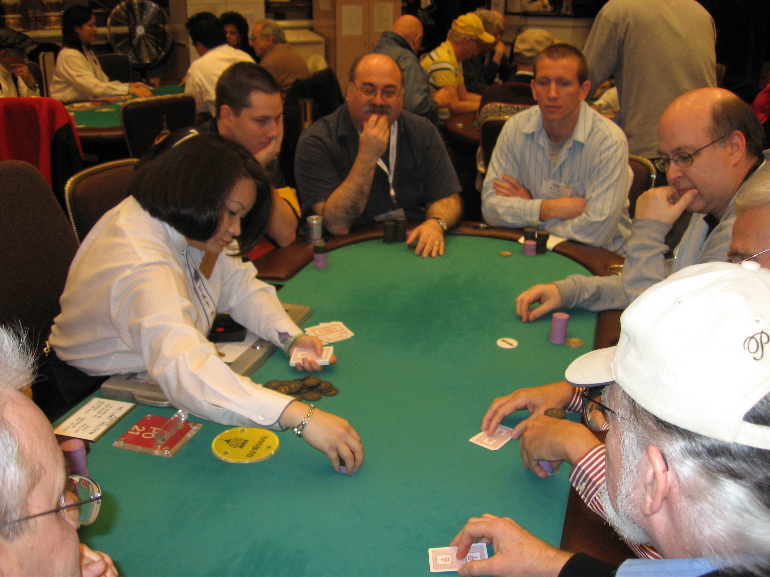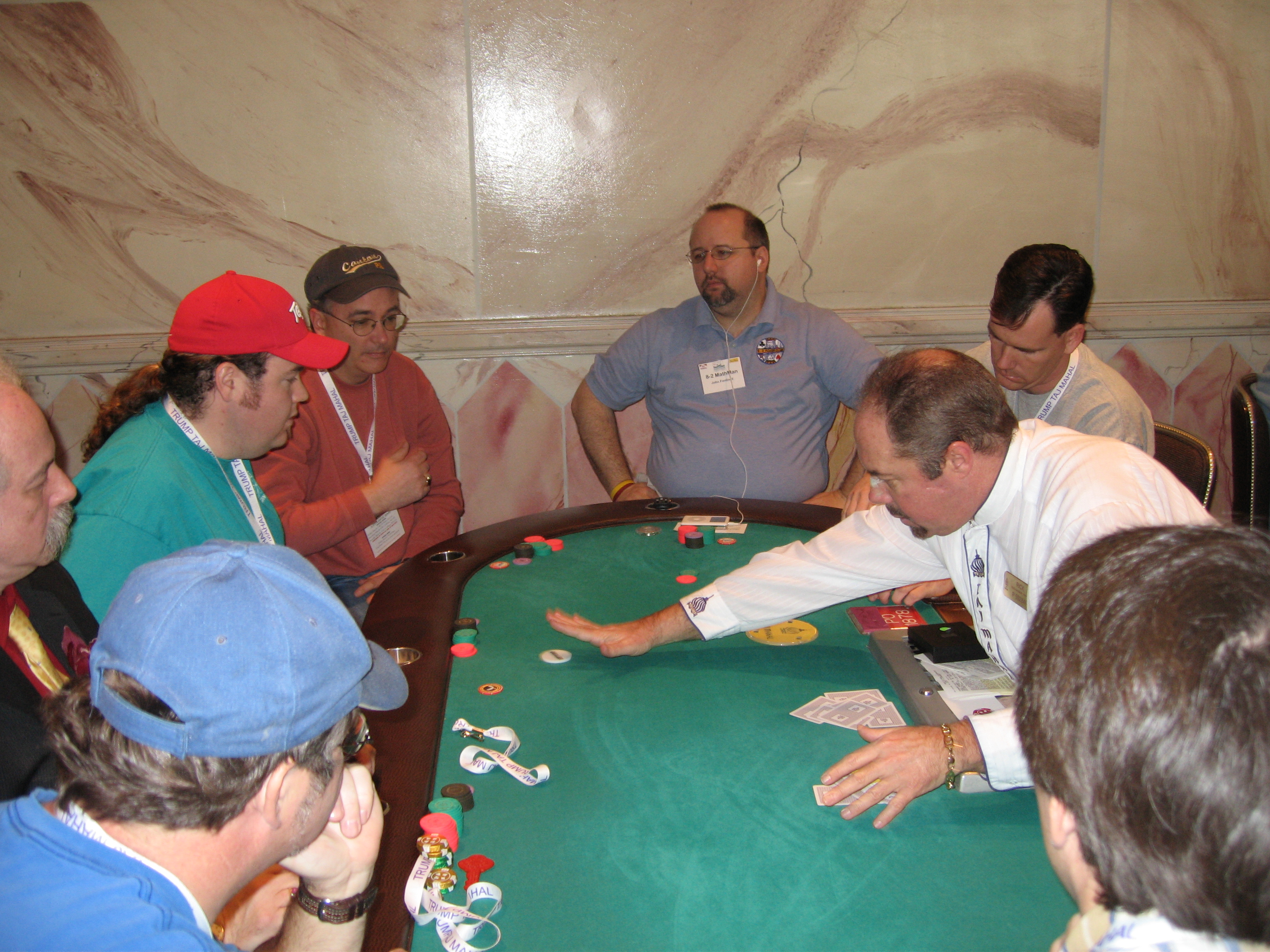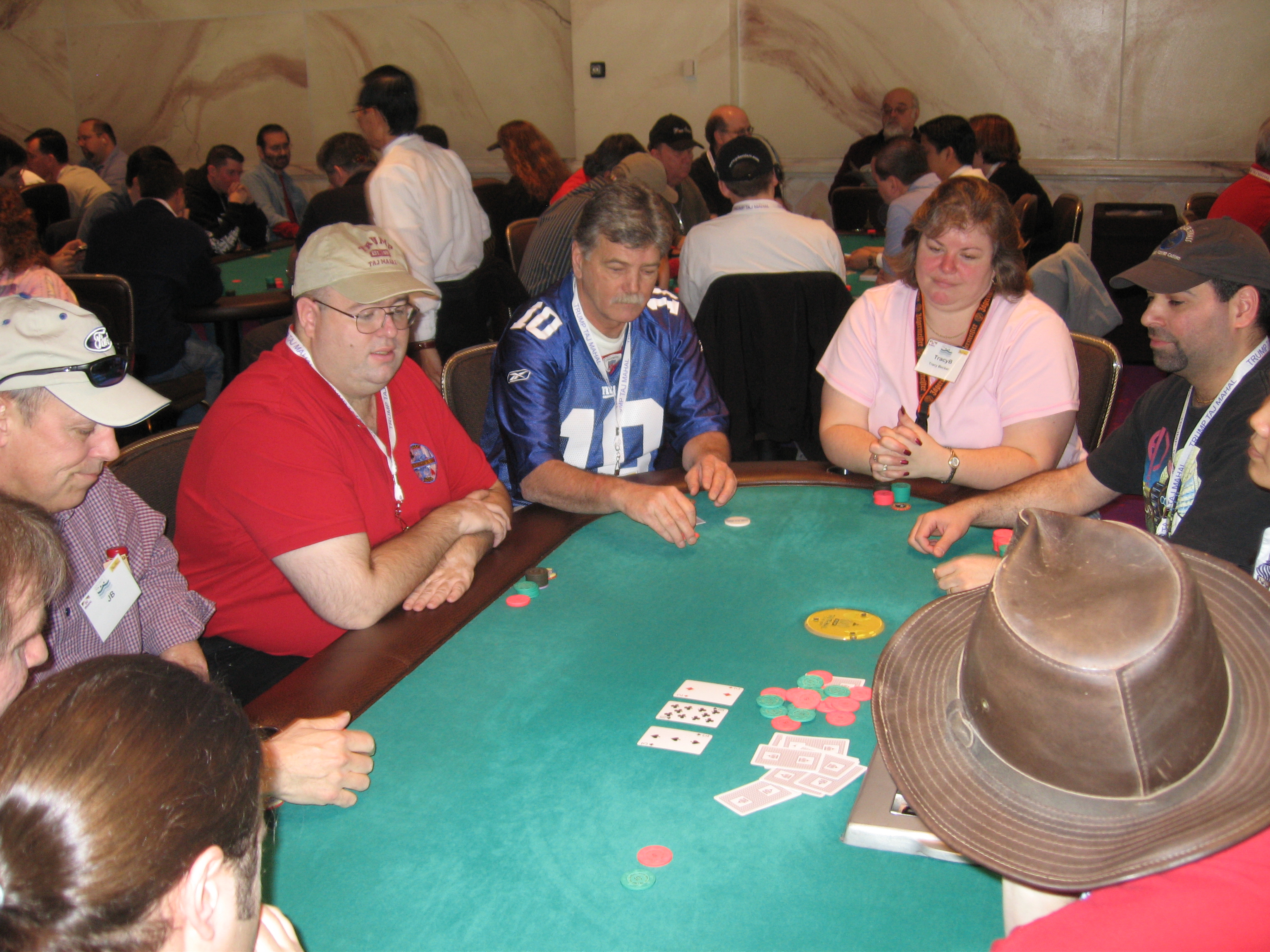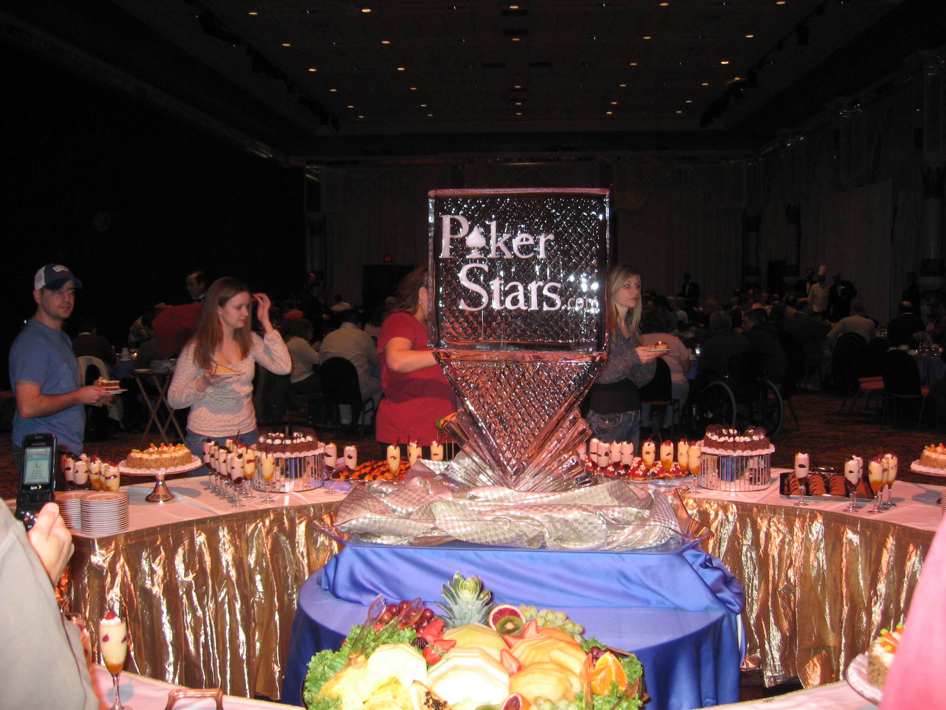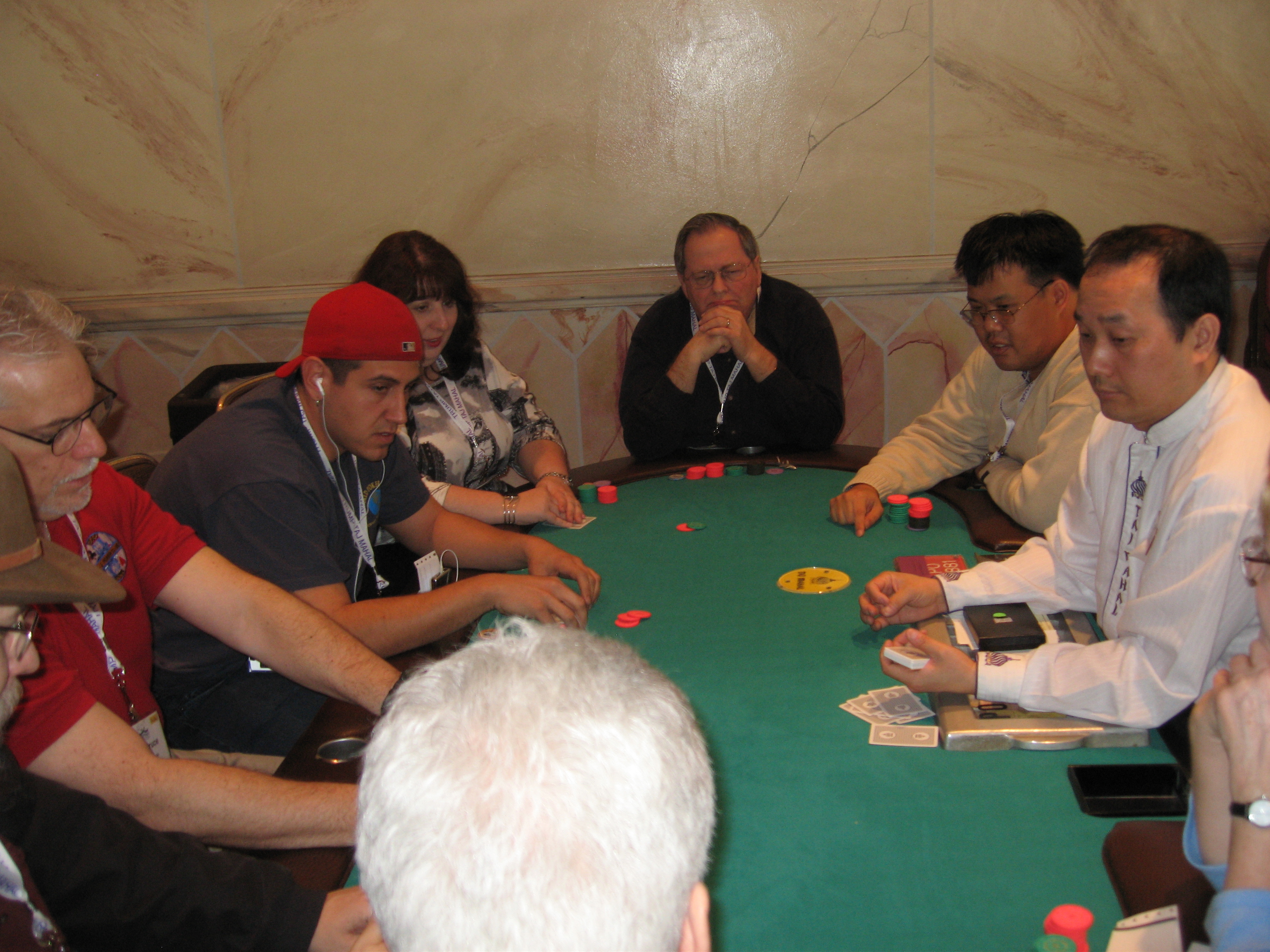 (From her blog: http://www.noninetofive.blogspot.com/ [dead link --Ed.]) Matt and Ivy picked me up bright and early and we left Brooklyn for AC. The first thing Matt told me when we got in the car was that the gas gauge was broken (permanently stuck on "E"). He then informed me of something even more hysterical: that I would be playing the H.O.E. tournament when we arrived at the Taj. I hadn't planned on playing this event. I've had historically abysmal results in limit hold 'em tourneys. My Omaha game is so-so on a good day. And before this weekend, I had played Stud O8 exactly once in my life. Overall, not a lot of reasons to play a $120 tournament involving these three games. We arrived just as the tournament registration was finishing up, and since I couldn't check into my room until noon I decided I might as well pass the time reuniting with fellow ARGErs at the poker table. Matt finally convinced me by offering to take half my action. I told him it was a lousy investment, outlining my reasons from above, but the long drive and lack of breakfast must have addled his brain because we ended up making this deal anyway. After a mad scramble to get a Taj card, I signed up for the tourney and took my seat. I was about to play my first H.O.E. tournament. I played at so many tables in this tourney that it's hard to recall who was at each one. Please yell at me if I forget you or get this wrong. Players I remember from my first table were Kenny, Matt, and Laurie Caulkins. Laurie had a nice set of chopsticks from her recent trip to China as her bust-out prize and I eyed them covetously. I don't remember any hands from this table, and in fact the most memorable thing that happened was Ivy Janet bringing us all a box of sinfully delicious Krispy Kream doughnuts. Mmmm, doughnuts.....argharhgahrargh. I found that the rotation game format really kept me paying attention in this tournament. Having to think about a different game every half hour or so kept things interesting, and I really enjoyed it. (Anyone know of any rotation tourneys online?) I found that my Omaha game was on par with the players around me, and I muddled through the Stud rounds without spewing too many chips. My basic strategy in Stud early on was to fold almost every hand except the ones I was 100% sure were playable, pinpoint the players at my table who seemed to understand the game, and watch them play theirs. (I also saw a fair number of examples of what not to do...) My stack remained healthy through most of the early rounds. As the blinds increased, I started to worry more about the fact that I would not be able to make it deep in this tournament without winning some Stud hands. The pots in Stud were the largest being played, and I needed to get my hands on those chips sooner or later. My first huge pot was not in Stud, but in Omaha. One player limped and I limped behind with A4xx double-suited (sorry I don't have more precise hand histories). The flop came with two low cards and one diamond. I held the Ax of diamonds. The turn paired the board, and I donked along to the river, where I hit my flush. I called one bet, as did the limper behind me, and when we turned up our hands I was up against a smaller flush for the high and ended up with half the low as well. I was accumulating chips nicely and never had much concern for my chip stack. Until I was moved yet again and found myself with Jeff Caulkins and Bill Chen on my right and Rob "ActionBob" Hwang on my left. And oh, good, the Stud round was beginning. Bill wonders if he'll make it to his speech on time. I don't know much about Stud O8, but it seemed to me that as long as I went for the low, I could sometimes back into a decent high and still win. I scooped two huge Stud pots at this table, both with two pair. How could this be?? On one hand, no one had a low, so and on the other my two small pair were good. Is this common in Stud? My only other experience with split games is Omaha, and two pair are rarely good for the high in that game. Stacking my chips, I looked up and saw that Jeff had a pair of chopsticks as his bust-out prize just as Laurie had. I wanted them. During the Hold 'Em round, I looked down at two red sevens. Jeff was short-stacked and called my pre-flop raise. The flop came ten-high and he moved in. I wanted those chopsticks real bad so I called. Jeff showed two overs (ace-jack, I think?) and got no love from the turn or river. Jeff was out and the chopsticks were mine! Woot! Now I had a serious stack, and entered my favorite part of a tournament: the part where I have chips and start raising like it's going out of style. During the course of this tournament, someone gave me the nickname, "Raising Station." I took that as a compliment. I was able to steal some blinds/antes/pots during the next few rounds (and to be fair, I was also getting smacked with the deck) and built my stack even bigger. One by one, players were getting knocked out around me (and sometimes, *by* me!). I started to think I might have a shot at going really deep in this thing. The raising station (center). Thank goodness I've built up my tourney stamina online during the past few months, and thank goodness that the deeper you get in a tournament, the less the specific game matters. Nine hours after we began, I found myself at the final table. The blinds were insane, and any given hand could turn the short stack into the chip leader (and vice versa). I made this swing a couple of times myself as we remained eight-handed for nearly an hour. Then there was a rapid series of bust-outs and we were four-handed: Rob "Suddenly" Catlett, Bill Chen, Gabe DeVitto, and me. It was approaching 8pm, when the banquet was supposed to begin, so we had a pitiful number of sweaters. They were busy admiring the Poker Stars ice sculpture upstairs. Since I was a moron and didn't record any of this sooner, I have no remarkable hands to report. Bill busted fourth, followed by Rob, and that left Gabe and me