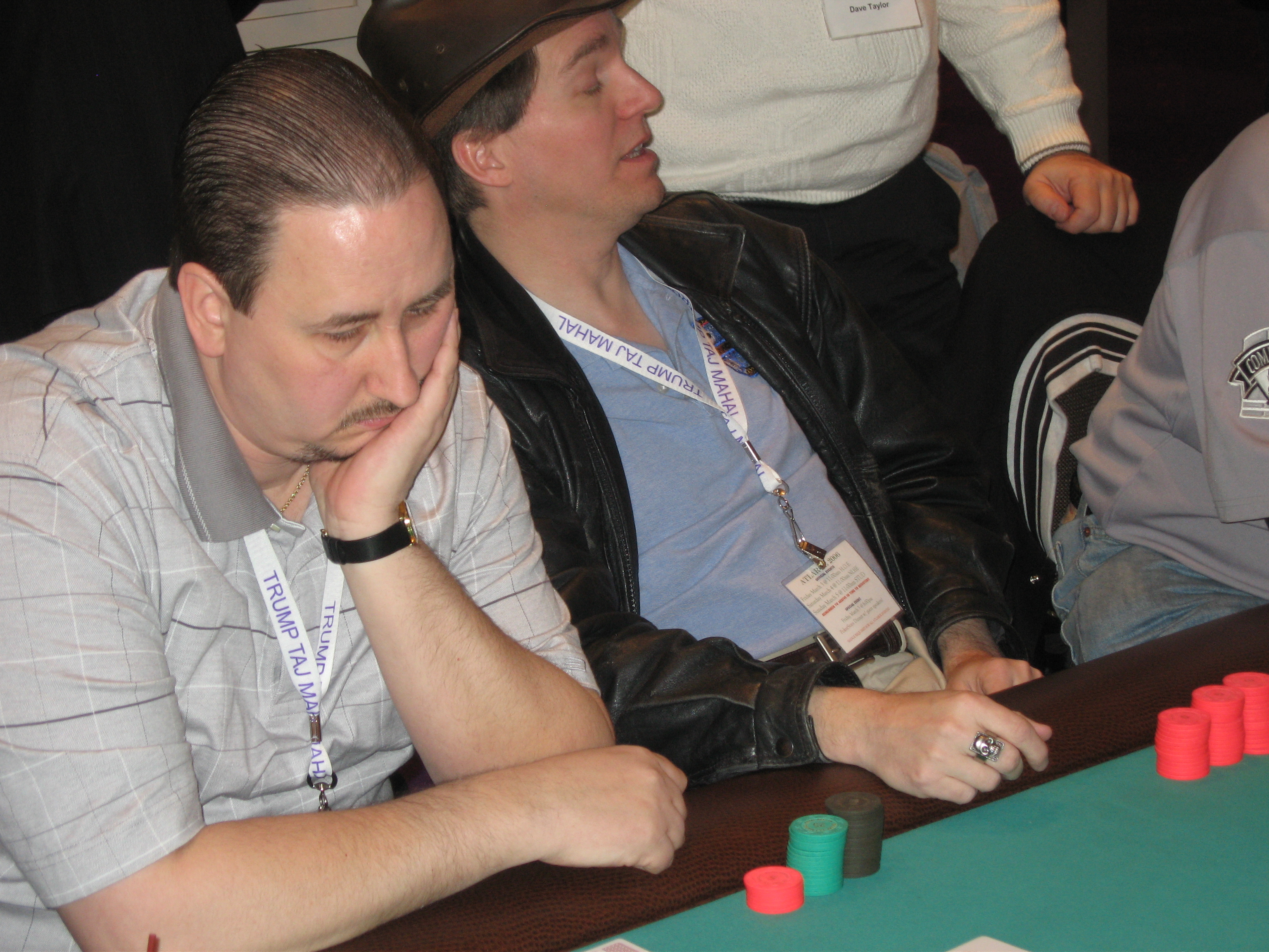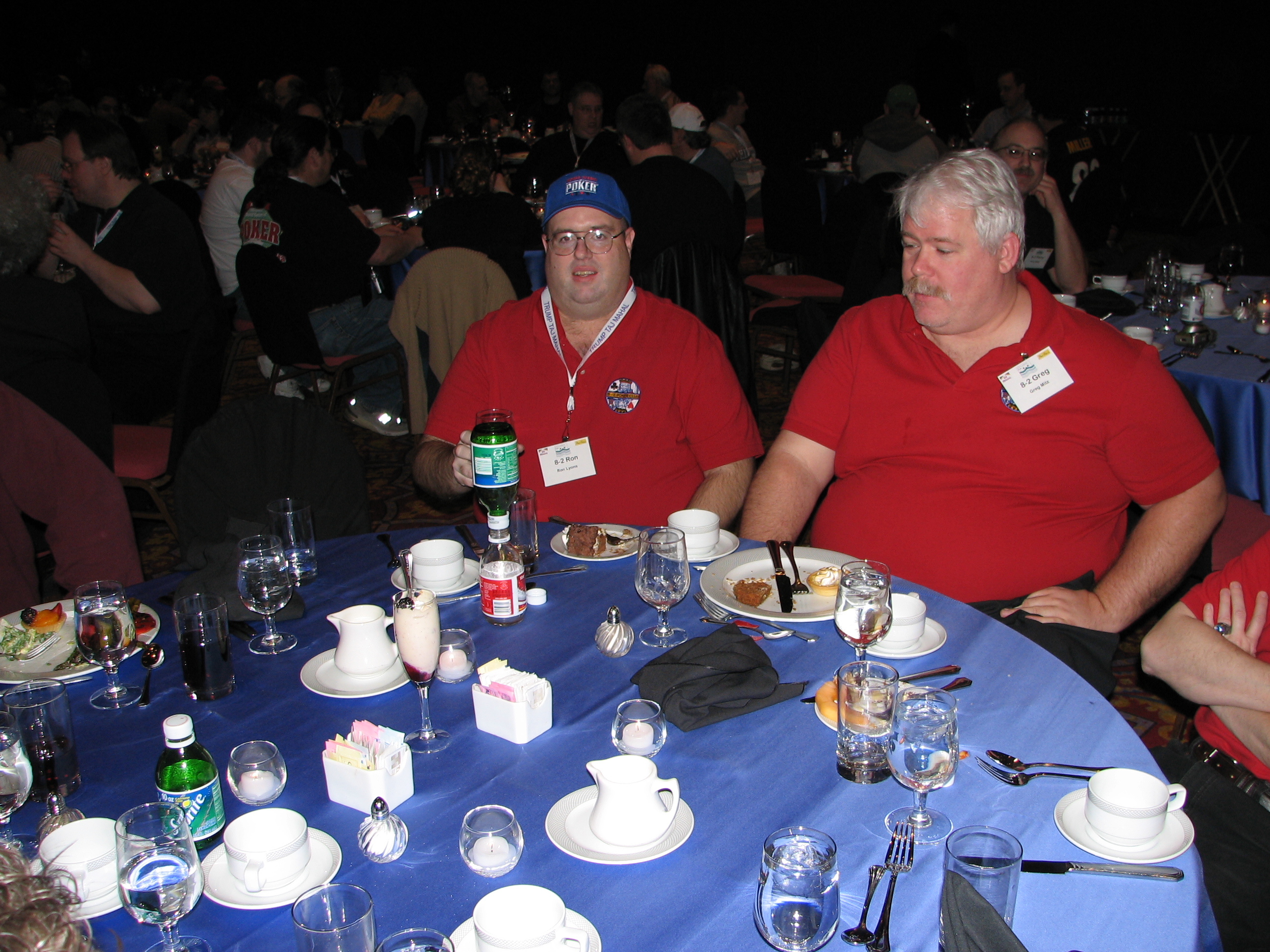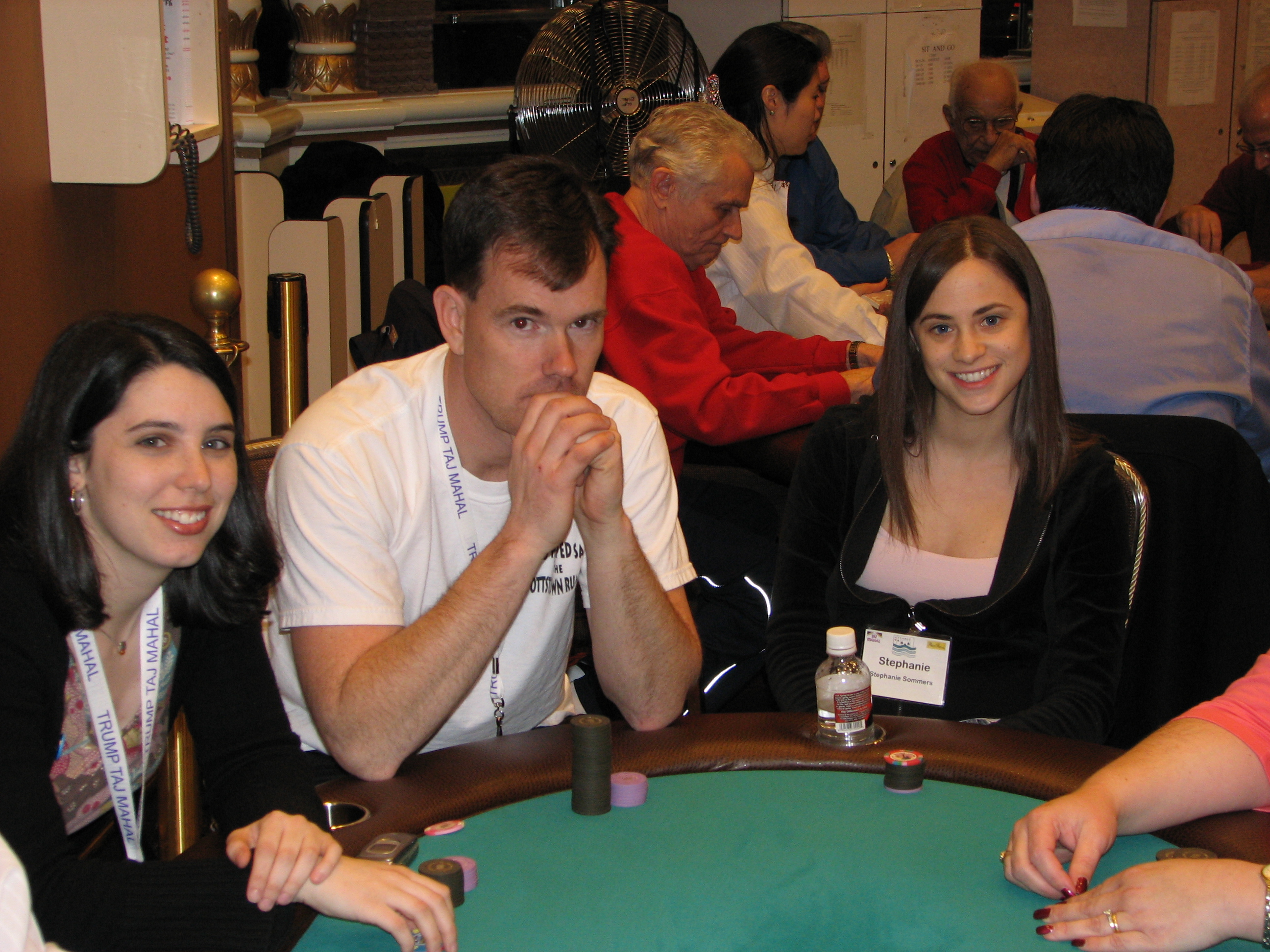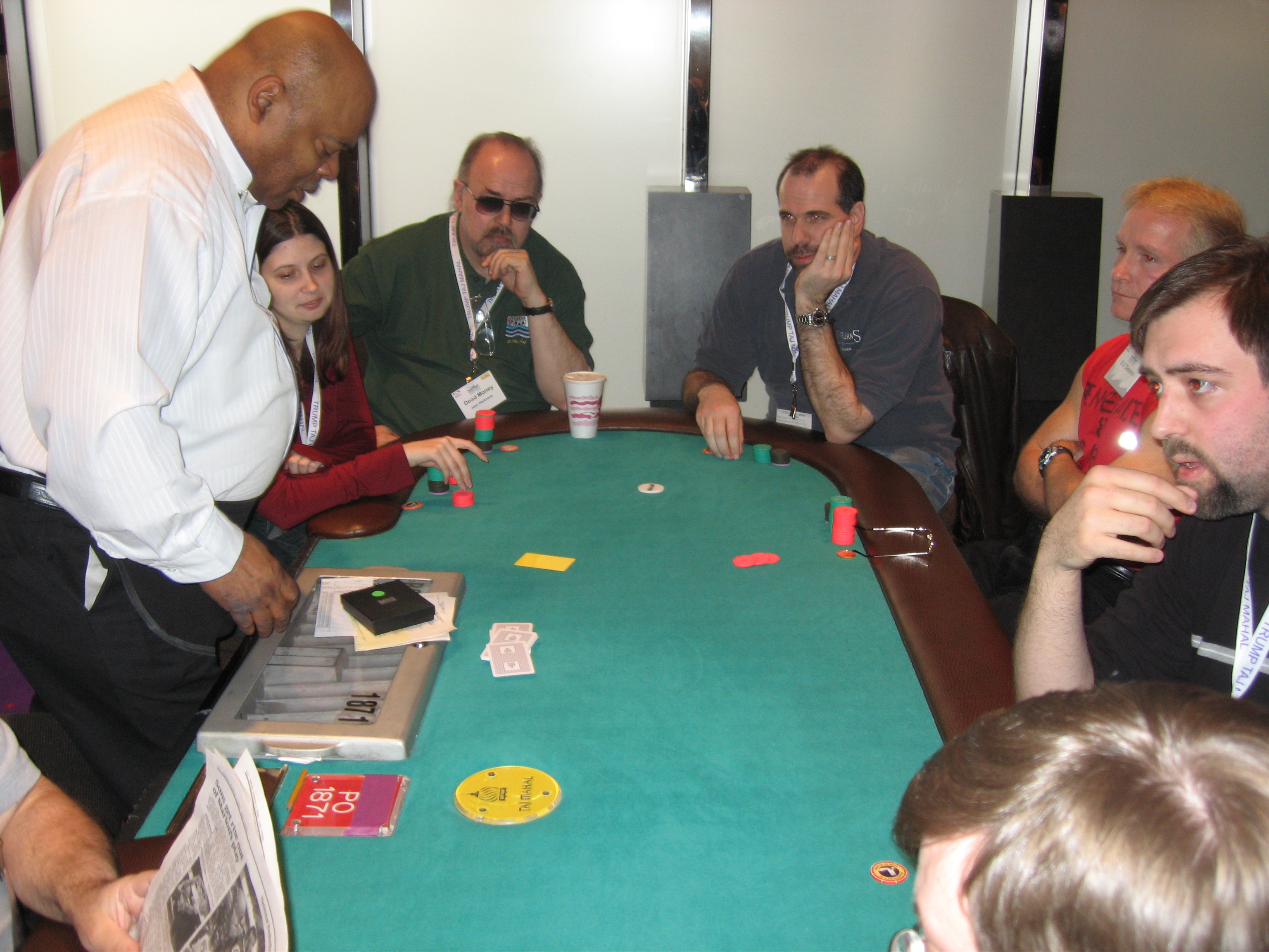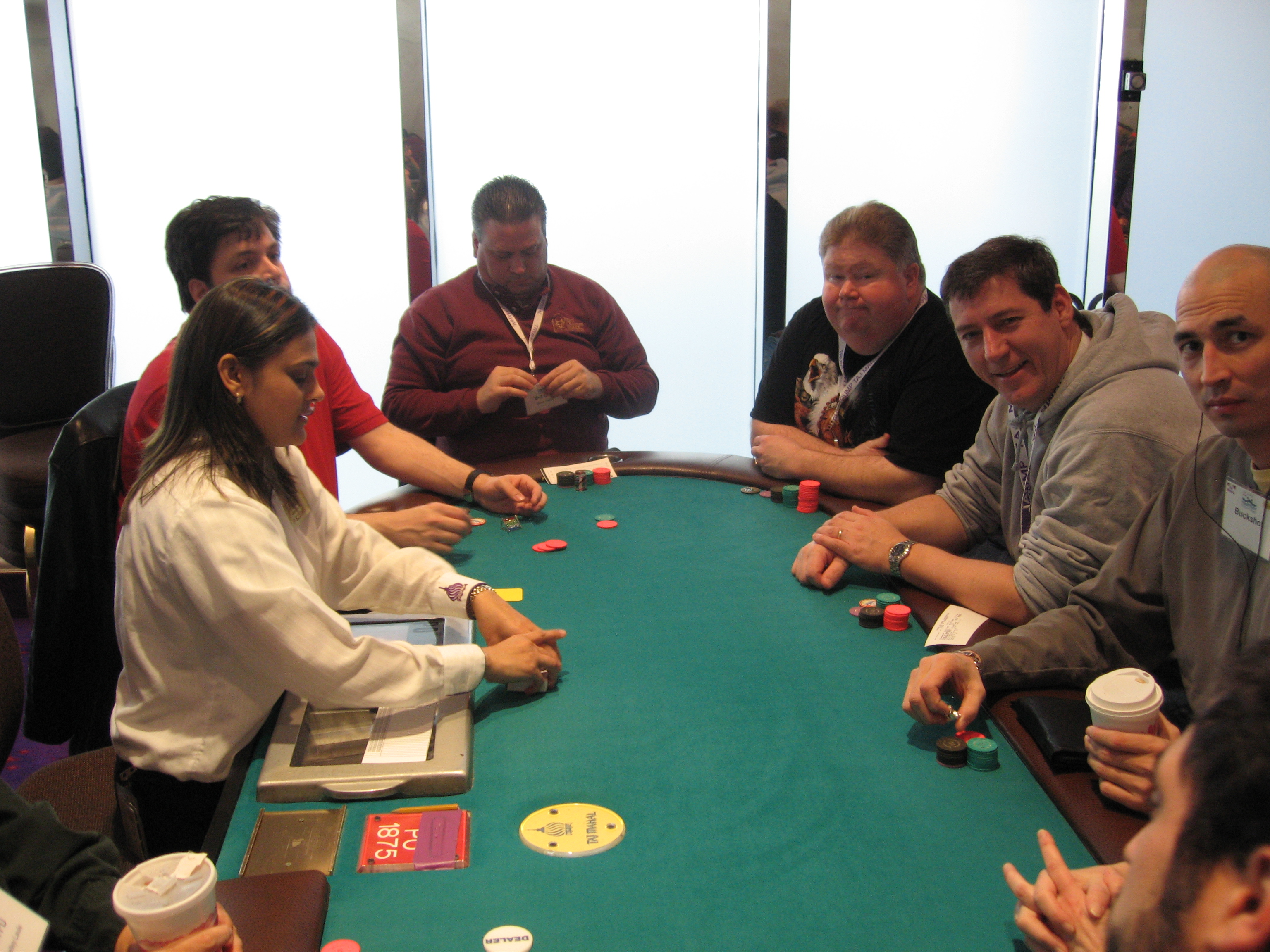 (From her blog: http://www.noninetofive.blogspot.com/ [dead link --Ed.]) Matt and Ivy picked me up bright and early and we left Brooklyn for AC. The first thing Matt told me when we got in the car was that the gas gauge was broken (permanently stuck on "E"). He then informed me of something even more hysterical: that I would be playing the H.O.E. tournament when we arrived at the Taj. I hadn't planned on playing this event. I've had historically abysmal results in limit hold 'em tourneys. My Omaha game is so-so on a good day. And before this weekend, I had played Stud O8 exactly once in my life. Overall, not a lot of reasons to play a $120 tournament involving these three games. We arrived just as the tournament registration was finishing up, and since I couldn't check into my room until noon I decided I might as well pass the time reuniting with fellow ARGErs at the poker table. Matt finally convinced me by offering to take half my action. I told him it was a lousy investment, outlining my reasons from above, but the long drive and lack of breakfast must have addled his brain because we ended up making this deal anyway. After a mad scramble to get a Taj card, I signed up for the tourney and took my seat. I was about to play my first H.O.E. tournament. I played at so many tables in this tourney that it's hard to recall who was at each one. Please yell at me if I forget you or get this wrong. Players I remember from my first table were Kenny, Matt, and Laurie Caulkins. Laurie had a nice set of chopsticks from her recent trip to China as her bust-out prize and I eyed them covetously. I don't remember any hands from this table, and in fact the most memorable thing that happened was Ivy Janet bringing us all a box of sinfully delicious Krispy Kream doughnuts. Mmmm, doughnuts.....argharhgahrargh. I found that the rotation game format really kept me paying attention in this tournament. Having to think about a different game every half hour or so kept things interesting, and I really enjoyed it. (Anyone know of any rotation tourneys online?) I found that my Omaha game was on par with the players around me, and I muddled through the Stud rounds without spewing too many chips. My basic strategy in Stud early on was to fold almost every hand except the ones I was 100% sure were playable, pinpoint the players at my table who seemed to understand the game, and watch them play theirs. (I also saw a fair number of examples of what not to do...) My stack remained healthy through most of the early rounds. As the blinds increased, I started to worry more about the fact that I would not be able to make it deep in this tournament without winning some Stud hands. The pots in Stud were the largest being played, and I needed to get my hands on those chips sooner or later. My first huge pot was not in Stud, but in Omaha. One player limped and I limped behind with A4xx double-suited (sorry I don't have more precise hand histories). The flop came with two low cards and one diamond. I held the Ax of diamonds. The turn paired the board, and I donked along to the river, where I hit my flush. I called one bet, as did the limper behind me, and when we turned up our hands I was up against a smaller flush for the high and ended up with half the low as well. I was accumulating chips nicely and never had much concern for my chip stack. Until I was moved yet again and found myself with Jeff Caulkins and Bill Chen on my right and Rob "ActionBob" Hwang on my left. And oh, good, the Stud round was beginning. Bill wonders if he'll make it to his speech on time. I don't know much about Stud O8, but it seemed to me that as long as I went for the low, I could sometimes back into a decent high and still win. I scooped two huge Stud pots at this table, both with two pair. How could this be?? On one hand, no one had a low, so and on the other my two small pair were good. Is this common in Stud? My only other experience with split games is Omaha, and two pair are rarely good for the high in that game. Stacking my chips, I looked up and saw that Jeff had a pair of chopsticks as his bust-out prize just as Laurie had. I wanted them. During the Hold 'Em round, I looked down at two red sevens. Jeff was short-stacked and called my pre-flop raise. The flop came ten-high and he moved in. I wanted those chopsticks real bad so I called. Jeff showed two overs (ace-jack, I think?) and got no love from the turn or river. Jeff was out and the chopsticks were mine! Woot! Now I had a serious stack, and entered my favorite part of a tournament: the part where I have chips and start raising like it's going out of style. During the course of this tournament, someone gave me the nickname, "Raising Station." I took that as a compliment. I was able to steal some blinds/antes/pots during the next few rounds (and to be fair, I was also getting smacked with the deck) and built my stack even bigger. One by one, players were getting knocked out around me (and sometimes, *by* me!). I started to think I might have a shot at going really deep in this thing. The raising station (center). Thank goodness I've built up my tourney stamina online during the past few months, and thank goodness that the deeper you get in a tournament, the less the specific game matters. Nine hours after we began, I found myself at the final table. The blinds were insane, and any given hand could turn the short stack into the chip leader (and vice versa). I made this swing a couple of times myself as we remained eight-handed for nearly an hour. Then there was a rapid series of bust-outs and we were four-handed: Rob "Suddenly" Catlett, Bill Chen, Gabe DeVitto, and me. It was approaching 8pm, when the banquet was supposed to begin, so we had a pitiful number of sweaters. They were busy admiring the Poker Stars ice sculpture upstairs. Since I was a moron and didn't record any of this sooner, I have no remarkable hands to report. Bill busted fourth, followed by Rob, and that left Gabe and me