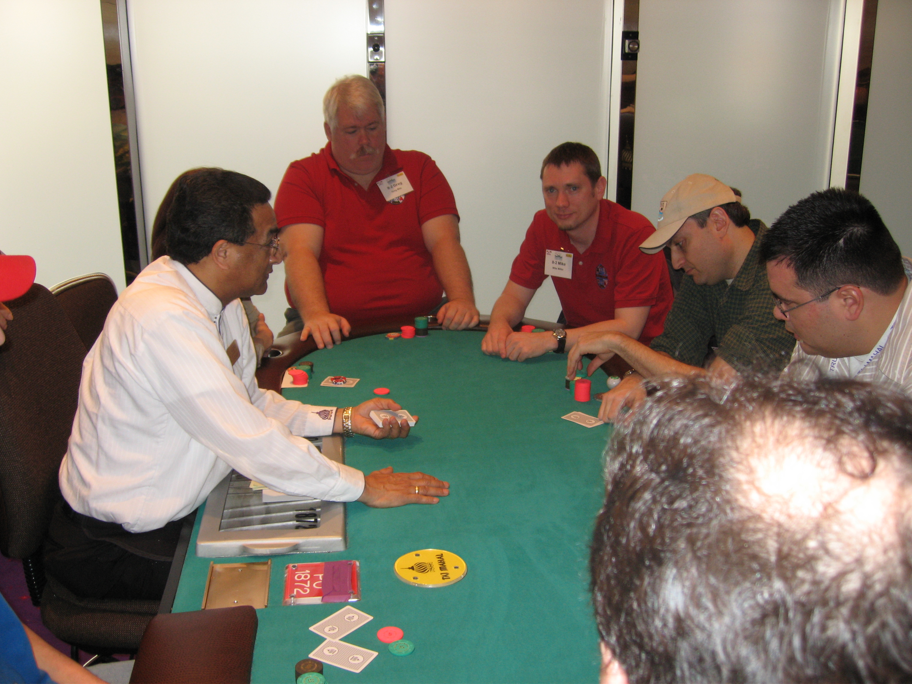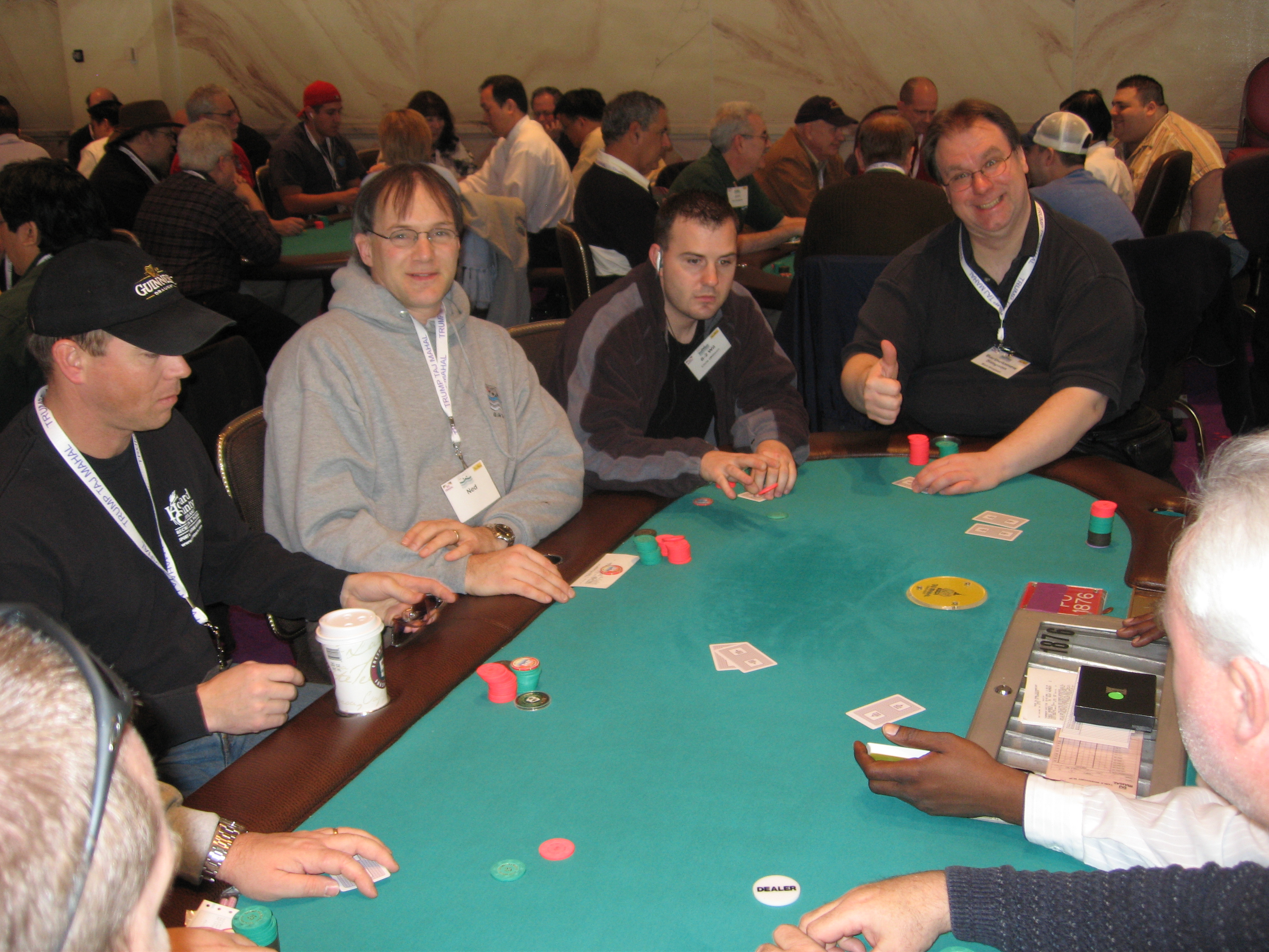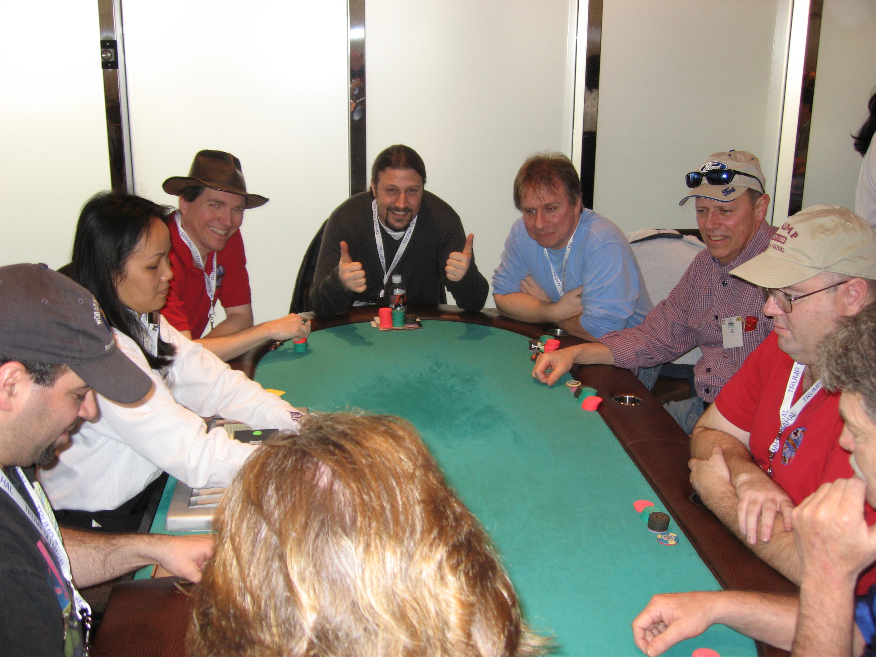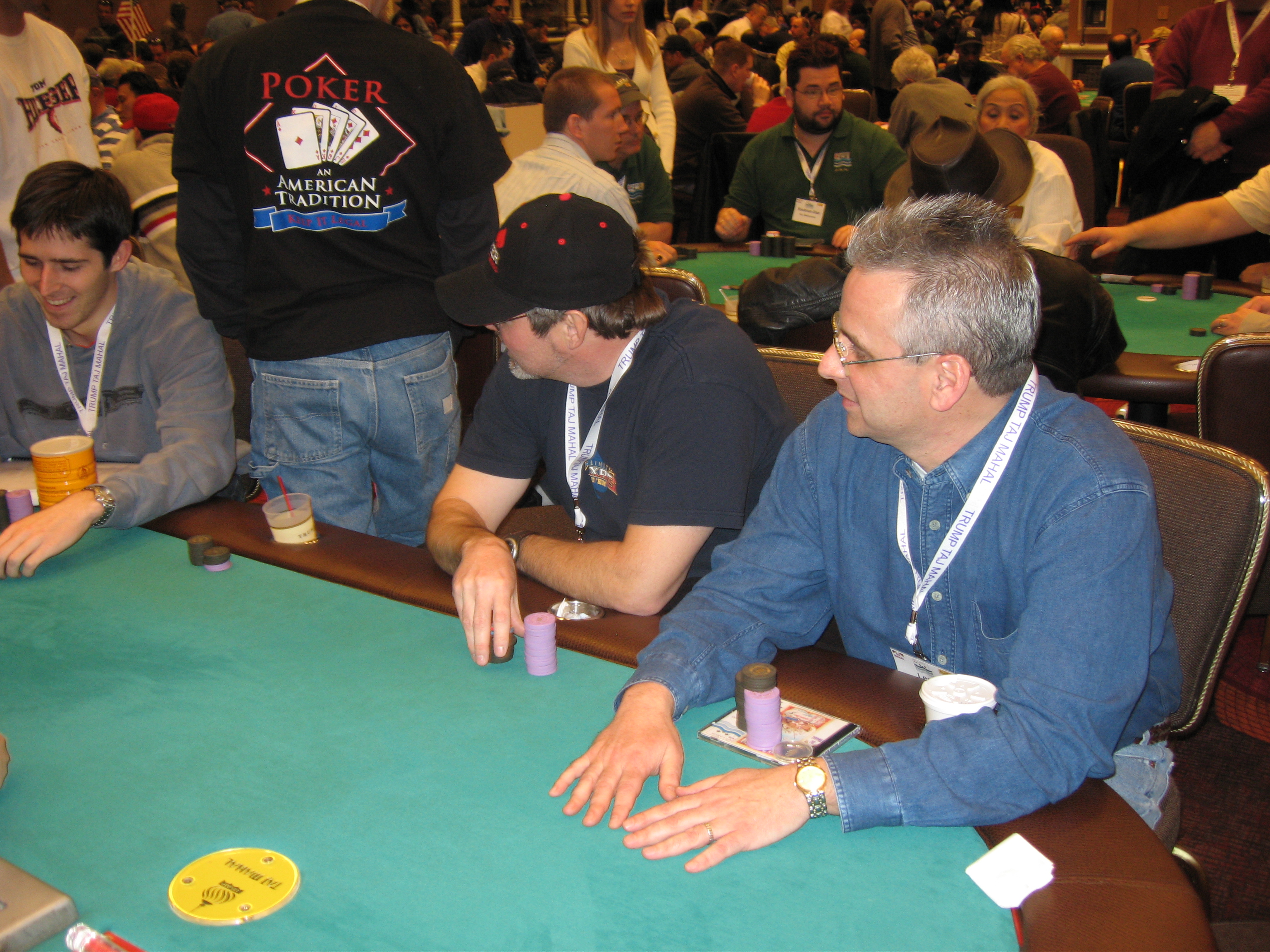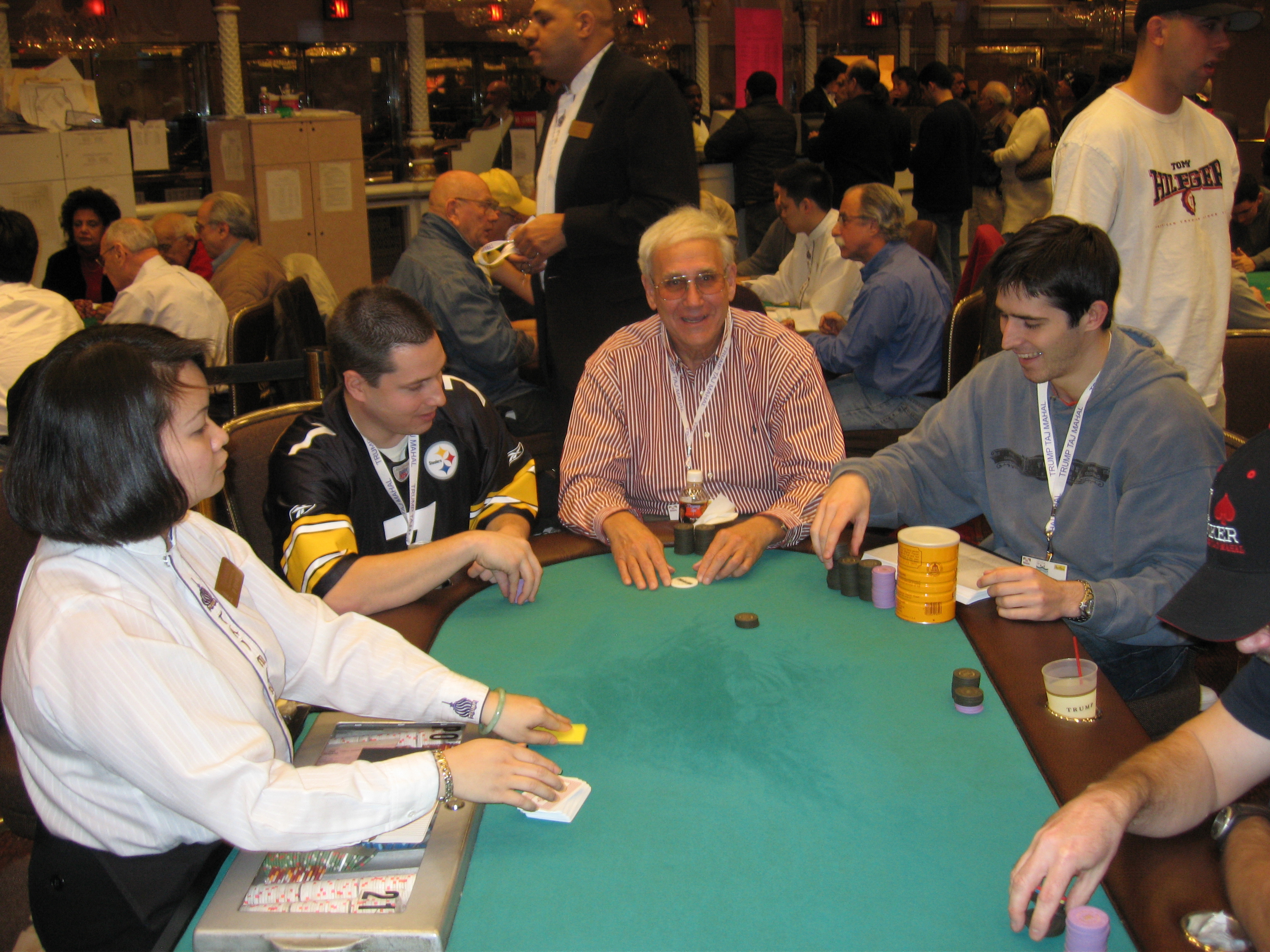 (From her blog: http://www.noninetofive.blogspot.com/ [dead link --Ed.]) Matt and Ivy picked me up bright and early and we left Brooklyn for AC. The first thing Matt told me when we got in the car was that the gas gauge was broken (permanently stuck on "E"). He then informed me of something even more hysterical: that I would be playing the H.O.E. tournament when we arrived at the Taj. I hadn't planned on playing this event. I've had historically abysmal results in limit hold 'em tourneys. My Omaha game is so-so on a good day. And before this weekend, I had played Stud O8 exactly once in my life. Overall, not a lot of reasons to play a $120 tournament involving these three games. We arrived just as the tournament registration was finishing up, and since I couldn't check into my room until noon I decided I might as well pass the time reuniting with fellow ARGErs at the poker table. Matt finally convinced me by offering to take half my action. I told him it was a lousy investment, outlining my reasons from above, but the long drive and lack of breakfast must have addled his brain because we ended up making this deal anyway. After a mad scramble to get a Taj card, I signed up for the tourney and took my seat. I was about to play my first H.O.E. tournament. I played at so many tables in this tourney that it's hard to recall who was at each one. Please yell at me if I forget you or get this wrong. Players I remember from my first table were Kenny, Matt, and Laurie Caulkins. Laurie had a nice set of chopsticks from her recent trip to China as her bust-out prize and I eyed them covetously. I don't remember any hands from this table, and in fact the most memorable thing that happened was Ivy Janet bringing us all a box of sinfully delicious Krispy Kream doughnuts. Mmmm, doughnuts.....argharhgahrargh. I found that the rotation game format really kept me paying attention in this tournament. Having to think about a different game every half hour or so kept things interesting, and I really enjoyed it. (Anyone know of any rotation tourneys online?) I found that my Omaha game was on par with the players around me, and I muddled through the Stud rounds without spewing too many chips. My basic strategy in Stud early on was to fold almost every hand except the ones I was 100% sure were playable, pinpoint the players at my table who seemed to understand the game, and watch them play theirs. (I also saw a fair number of examples of what not to do...) My stack remained healthy through most of the early rounds. As the blinds increased, I started to worry more about the fact that I would not be able to make it deep in this tournament without winning some Stud hands. The pots in Stud were the largest being played, and I needed to get my hands on those chips sooner or later. My first huge pot was not in Stud, but in Omaha. One player limped and I limped behind with A4xx double-suited (sorry I don't have more precise hand histories). The flop came with two low cards and one diamond. I held the Ax of diamonds. The turn paired the board, and I donked along to the river, where I hit my flush. I called one bet, as did the limper behind me, and when we turned up our hands I was up against a smaller flush for the high and ended up with half the low as well. I was accumulating chips nicely and never had much concern for my chip stack. Until I was moved yet again and found myself with Jeff Caulkins and Bill Chen on my right and Rob "ActionBob" Hwang on my left. And oh, good, the Stud round was beginning. Bill wonders if he'll make it to his speech on time. I don't know much about Stud O8, but it seemed to me that as long as I went for the low, I could sometimes back into a decent high and still win. I scooped two huge Stud pots at this table, both with two pair. How could this be?? On one hand, no one had a low, so and on the other my two small pair were good. Is this common in Stud? My only other experience with split games is Omaha, and two pair are rarely good for the high in that game. Stacking my chips, I looked up and saw that Jeff had a pair of chopsticks as his bust-out prize just as Laurie had. I wanted them. During the Hold 'Em round, I looked down at two red sevens. Jeff was short-stacked and called my pre-flop raise. The flop came ten-high and he moved in. I wanted those chopsticks real bad so I called. Jeff showed two overs (ace-jack, I think?) and got no love from the turn or river. Jeff was out and the chopsticks were mine! Woot! Now I had a serious stack, and entered my favorite part of a tournament: the part where I have chips and start raising like it's going out of style. During the course of this tournament, someone gave me the nickname, "Raising Station." I took that as a compliment. I was able to steal some blinds/antes/pots during the next few rounds (and to be fair, I was also getting smacked with the deck) and built my stack even bigger. One by one, players were getting knocked out around me (and sometimes, *by* me!). I started to think I might have a shot at going really deep in this thing. The raising station (center). Thank goodness I've built up my tourney stamina online during the past few months, and thank goodness that the deeper you get in a tournament, the less the specific game matters. Nine hours after we began, I found myself at the final table. The blinds were insane, and any given hand could turn the short stack into the chip leader (and vice versa). I made this swing a couple of times myself as we remained eight-handed for nearly an hour. Then there was a rapid series of bust-outs and we were four-handed: Rob "Suddenly" Catlett, Bill Chen, Gabe DeVitto, and me. It was approaching 8pm, when the banquet was supposed to begin, so we had a pitiful number of sweaters. They were busy admiring the Poker Stars ice sculpture upstairs. Since I was a moron and didn't record any of this sooner, I have no remarkable hands to report. Bill busted fourth, followed by Rob, and that left Gabe and me