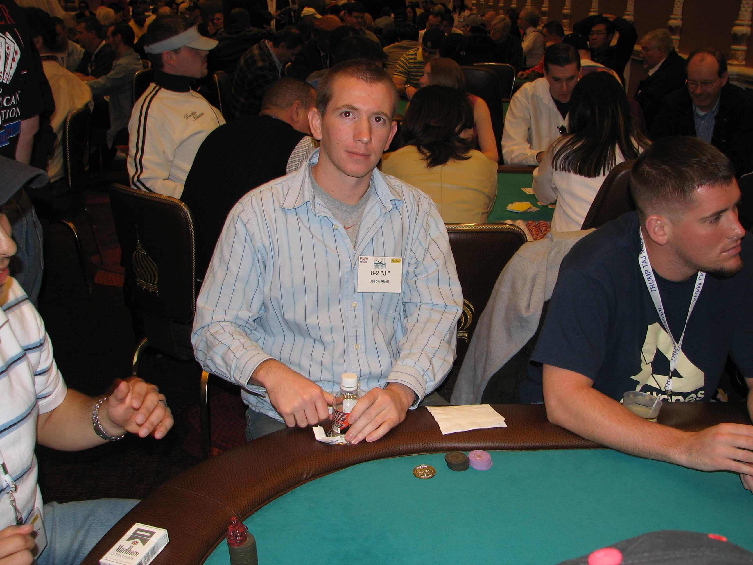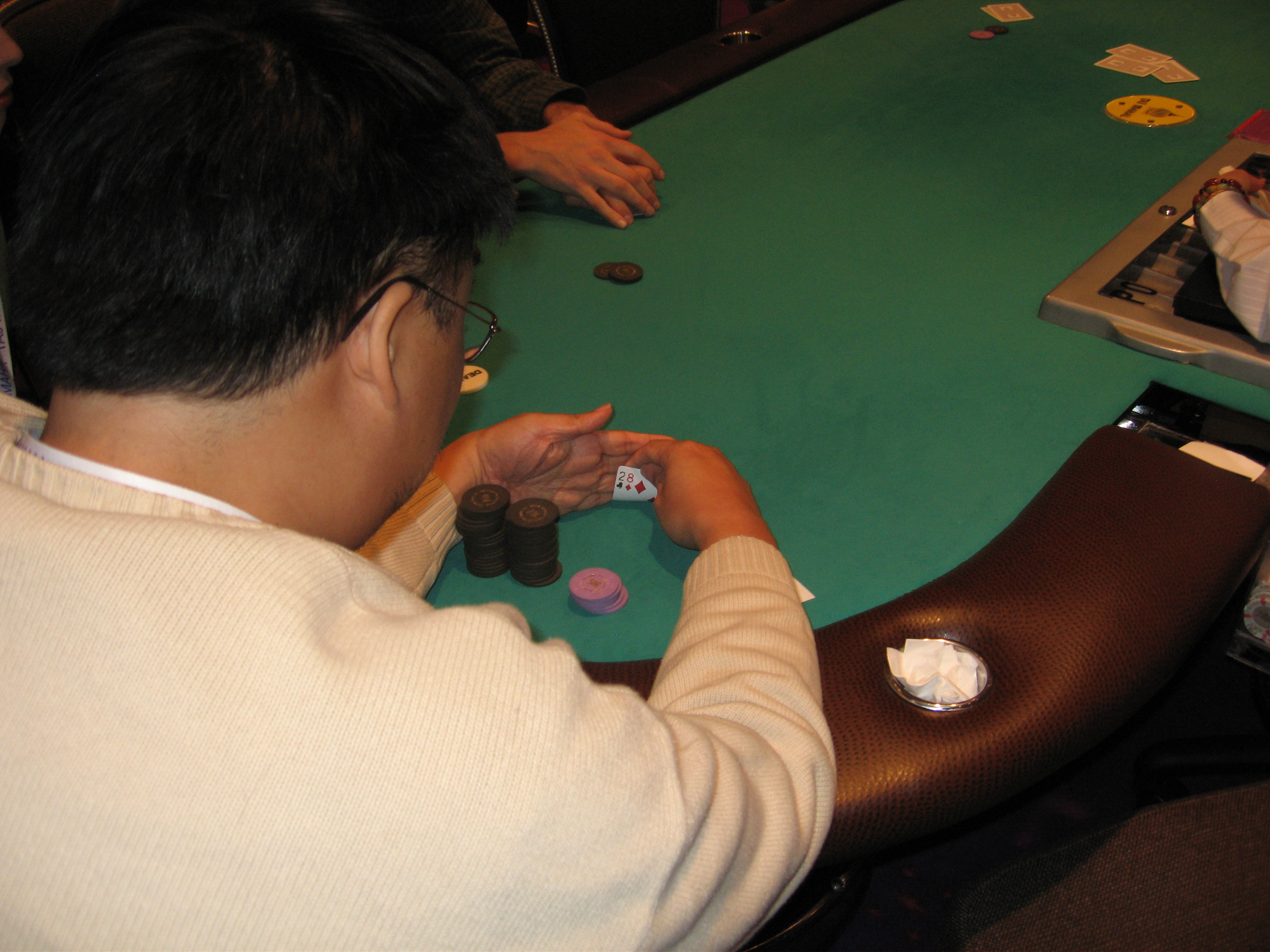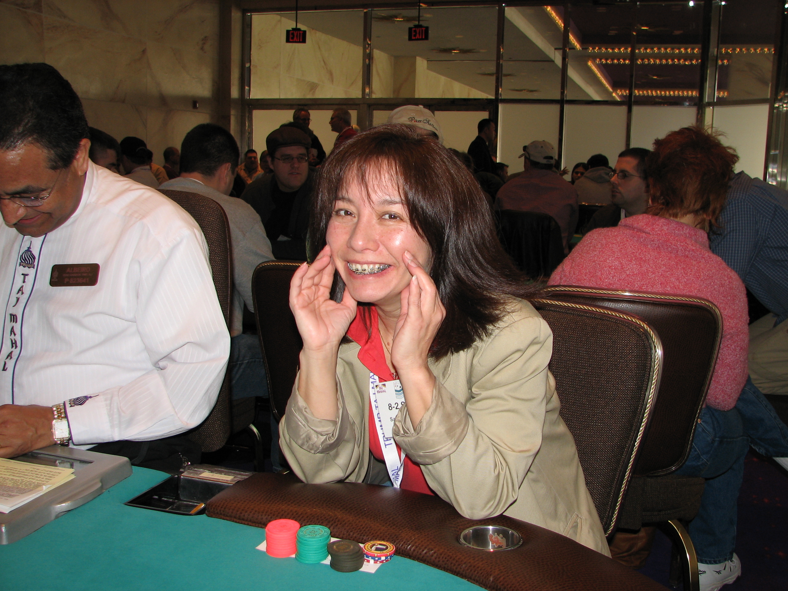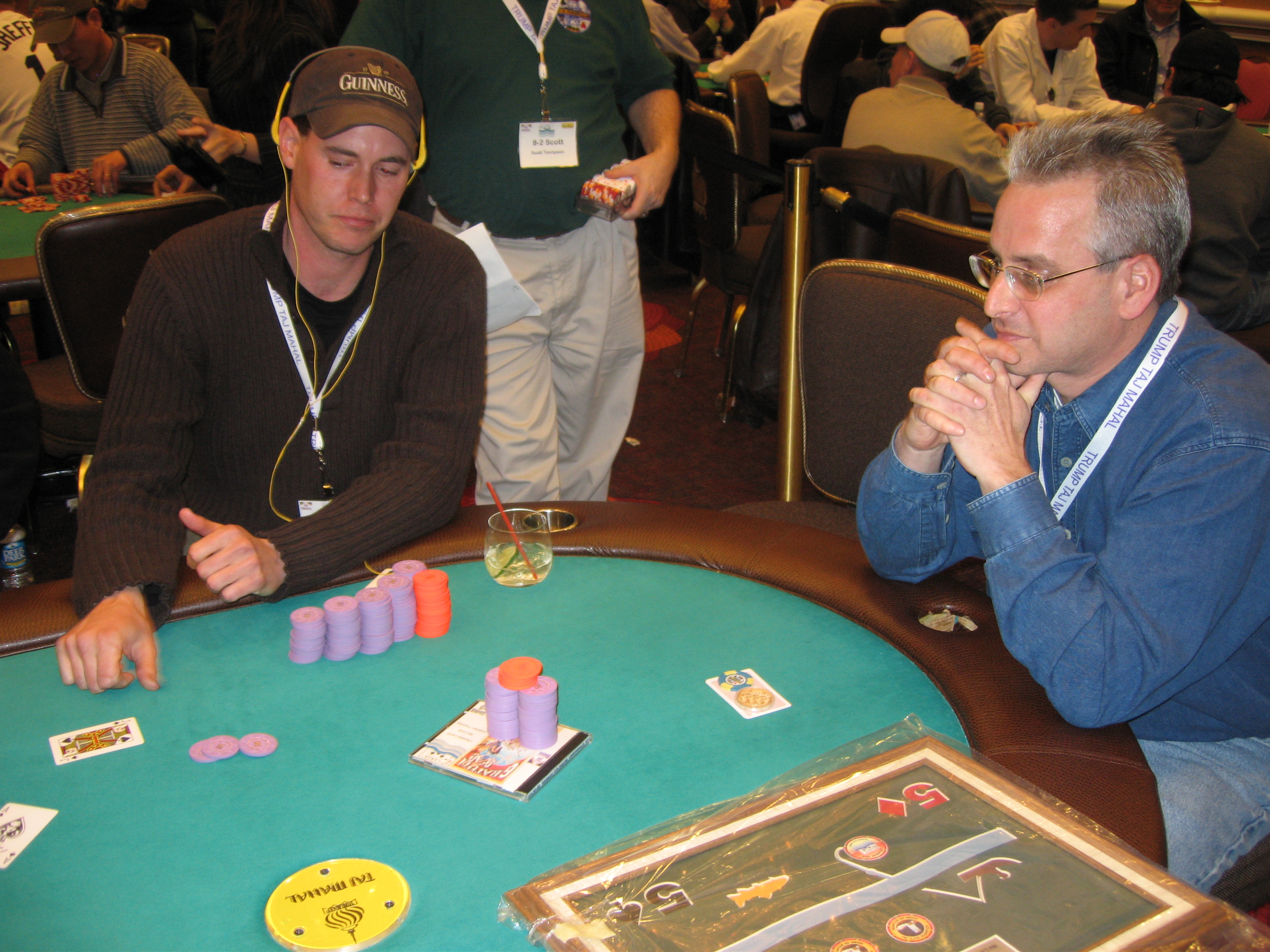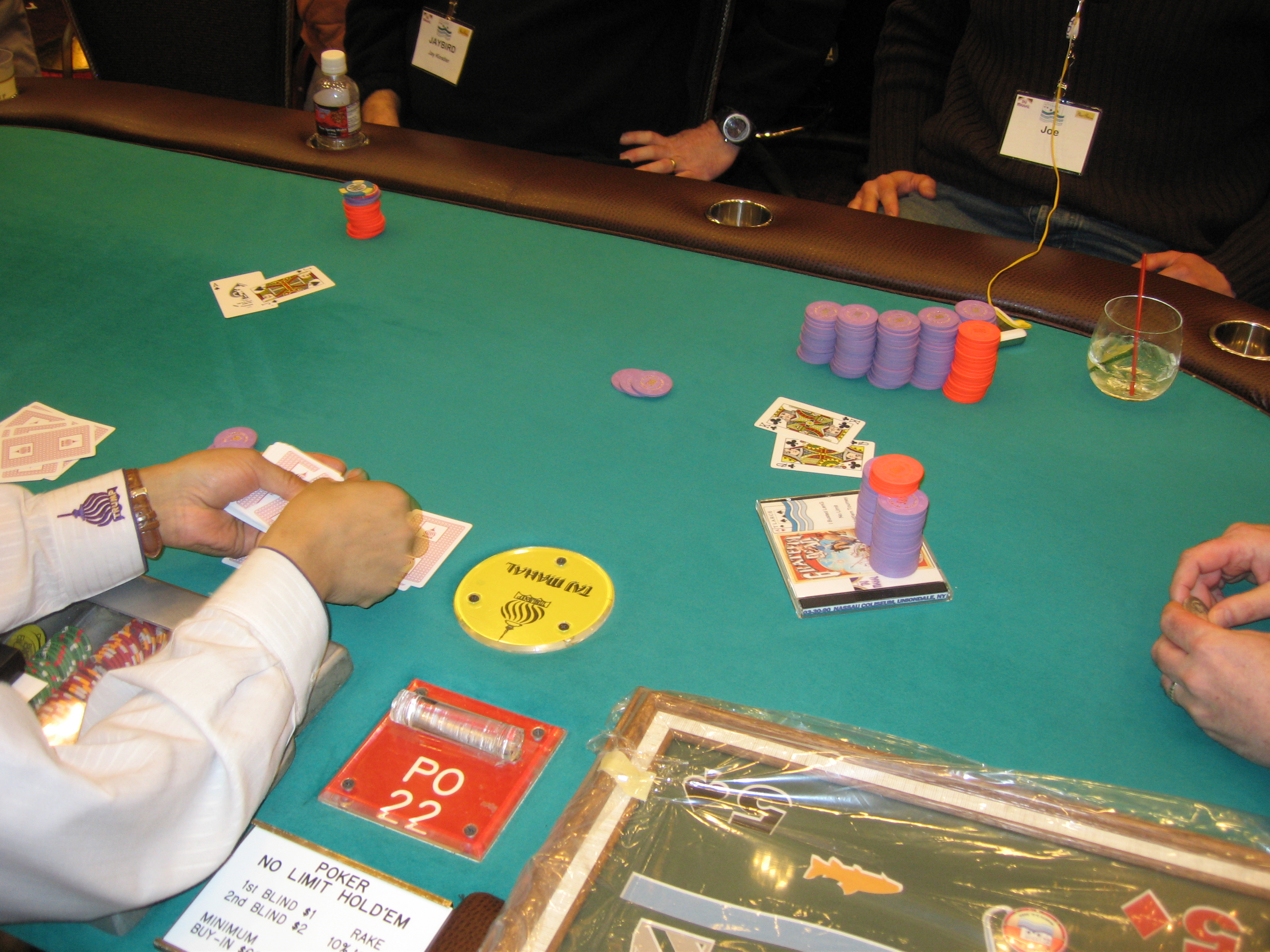 (From her blog: http://www.noninetofive.blogspot.com/ [dead link --Ed.]) Matt and Ivy picked me up bright and early and we left Brooklyn for AC. The first thing Matt told me when we got in the car was that the gas gauge was broken (permanently stuck on "E"). He then informed me of something even more hysterical: that I would be playing the H.O.E. tournament when we arrived at the Taj. I hadn't planned on playing this event. I've had historically abysmal results in limit hold 'em tourneys. My Omaha game is so-so on a good day. And before this weekend, I had played Stud O8 exactly once in my life. Overall, not a lot of reasons to play a $120 tournament involving these three games. We arrived just as the tournament registration was finishing up, and since I couldn't check into my room until noon I decided I might as well pass the time reuniting with fellow ARGErs at the poker table. Matt finally convinced me by offering to take half my action. I told him it was a lousy investment, outlining my reasons from above, but the long drive and lack of breakfast must have addled his brain because we ended up making this deal anyway. After a mad scramble to get a Taj card, I signed up for the tourney and took my seat. I was about to play my first H.O.E. tournament. I played at so many tables in this tourney that it's hard to recall who was at each one. Please yell at me if I forget you or get this wrong. Players I remember from my first table were Kenny, Matt, and Laurie Caulkins. Laurie had a nice set of chopsticks from her recent trip to China as her bust-out prize and I eyed them covetously. I don't remember any hands from this table, and in fact the most memorable thing that happened was Ivy Janet bringing us all a box of sinfully delicious Krispy Kream doughnuts. Mmmm, doughnuts.....argharhgahrargh. I found that the rotation game format really kept me paying attention in this tournament. Having to think about a different game every half hour or so kept things interesting, and I really enjoyed it. (Anyone know of any rotation tourneys online?) I found that my Omaha game was on par with the players around me, and I muddled through the Stud rounds without spewing too many chips. My basic strategy in Stud early on was to fold almost every hand except the ones I was 100% sure were playable, pinpoint the players at my table who seemed to understand the game, and watch them play theirs. (I also saw a fair number of examples of what not to do...) My stack remained healthy through most of the early rounds. As the blinds increased, I started to worry more about the fact that I would not be able to make it deep in this tournament without winning some Stud hands. The pots in Stud were the largest being played, and I needed to get my hands on those chips sooner or later. My first huge pot was not in Stud, but in Omaha. One player limped and I limped behind with A4xx double-suited (sorry I don't have more precise hand histories). The flop came with two low cards and one diamond. I held the Ax of diamonds. The turn paired the board, and I donked along to the river, where I hit my flush. I called one bet, as did the limper behind me, and when we turned up our hands I was up against a smaller flush for the high and ended up with half the low as well. I was accumulating chips nicely and never had much concern for my chip stack. Until I was moved yet again and found myself with Jeff Caulkins and Bill Chen on my right and Rob "ActionBob" Hwang on my left. And oh, good, the Stud round was beginning. Bill wonders if he'll make it to his speech on time. I don't know much about Stud O8, but it seemed to me that as long as I went for the low, I could sometimes back into a decent high and still win. I scooped two huge Stud pots at this table, both with two pair. How could this be?? On one hand, no one had a low, so and on the other my two small pair were good. Is this common in Stud? My only other experience with split games is Omaha, and two pair are rarely good for the high in that game. Stacking my chips, I looked up and saw that Jeff had a pair of chopsticks as his bust-out prize just as Laurie had. I wanted them. During the Hold 'Em round, I looked down at two red sevens. Jeff was short-stacked and called my pre-flop raise. The flop came ten-high and he moved in. I wanted those chopsticks real bad so I called. Jeff showed two overs (ace-jack, I think?) and got no love from the turn or river. Jeff was out and the chopsticks were mine! Woot! Now I had a serious stack, and entered my favorite part of a tournament: the part where I have chips and start raising like it's going out of style. During the course of this tournament, someone gave me the nickname, "Raising Station." I took that as a compliment. I was able to steal some blinds/antes/pots during the next few rounds (and to be fair, I was also getting smacked with the deck) and built my stack even bigger. One by one, players were getting knocked out around me (and sometimes, *by* me!). I started to think I might have a shot at going really deep in this thing. The raising station (center). Thank goodness I've built up my tourney stamina online during the past few months, and thank goodness that the deeper you get in a tournament, the less the specific game matters. Nine hours after we began, I found myself at the final table. The blinds were insane, and any given hand could turn the short stack into the chip leader (and vice versa). I made this swing a couple of times myself as we remained eight-handed for nearly an hour. Then there was a rapid series of bust-outs and we were four-handed: Rob "Suddenly" Catlett, Bill Chen, Gabe DeVitto, and me. It was approaching 8pm, when the banquet was supposed to begin, so we had a pitiful number of sweaters. They were busy admiring the Poker Stars ice sculpture upstairs. Since I was a moron and didn't record any of this sooner, I have no remarkable hands to report. Bill busted fourth, followed by Rob, and that left Gabe and me