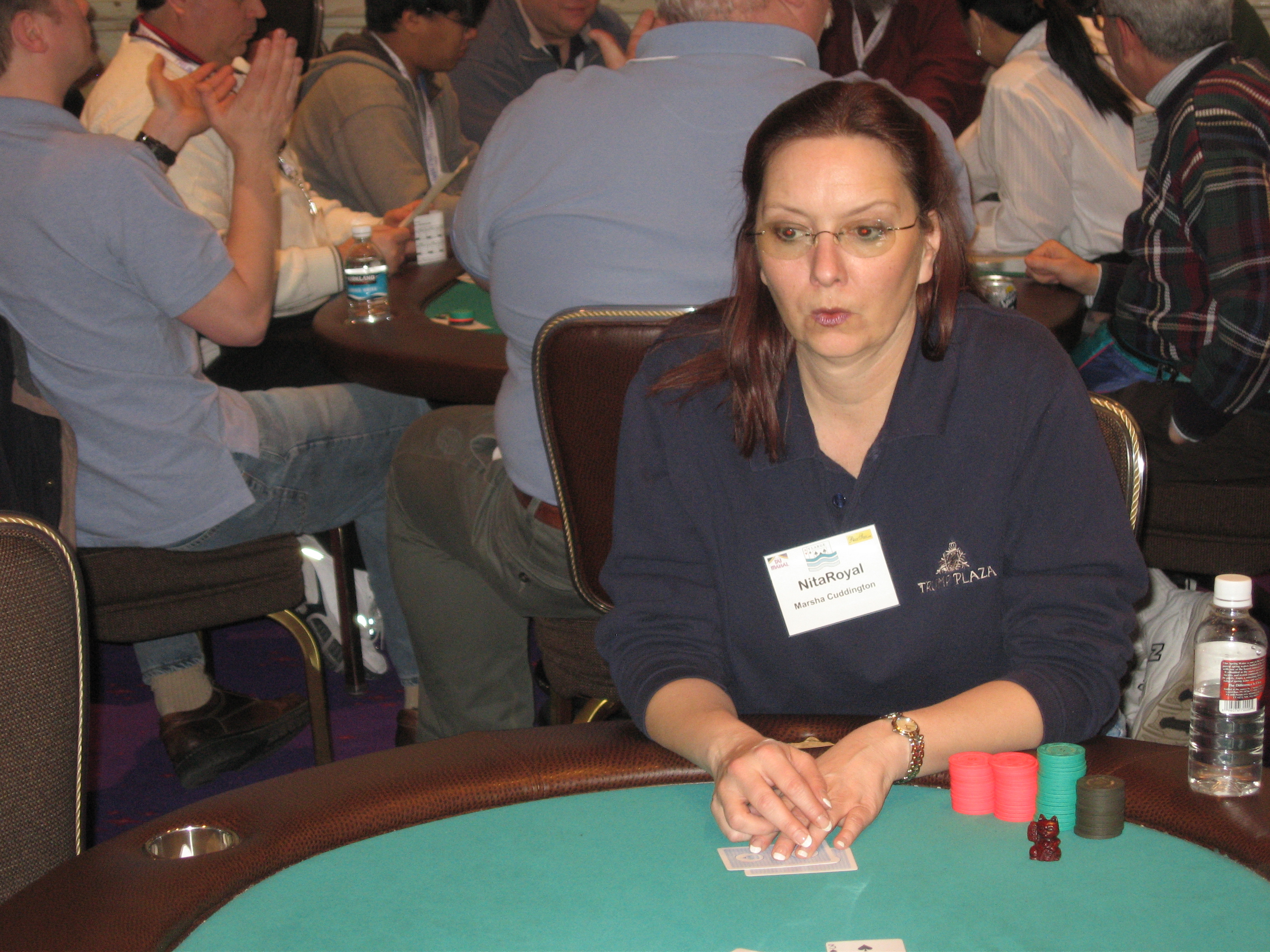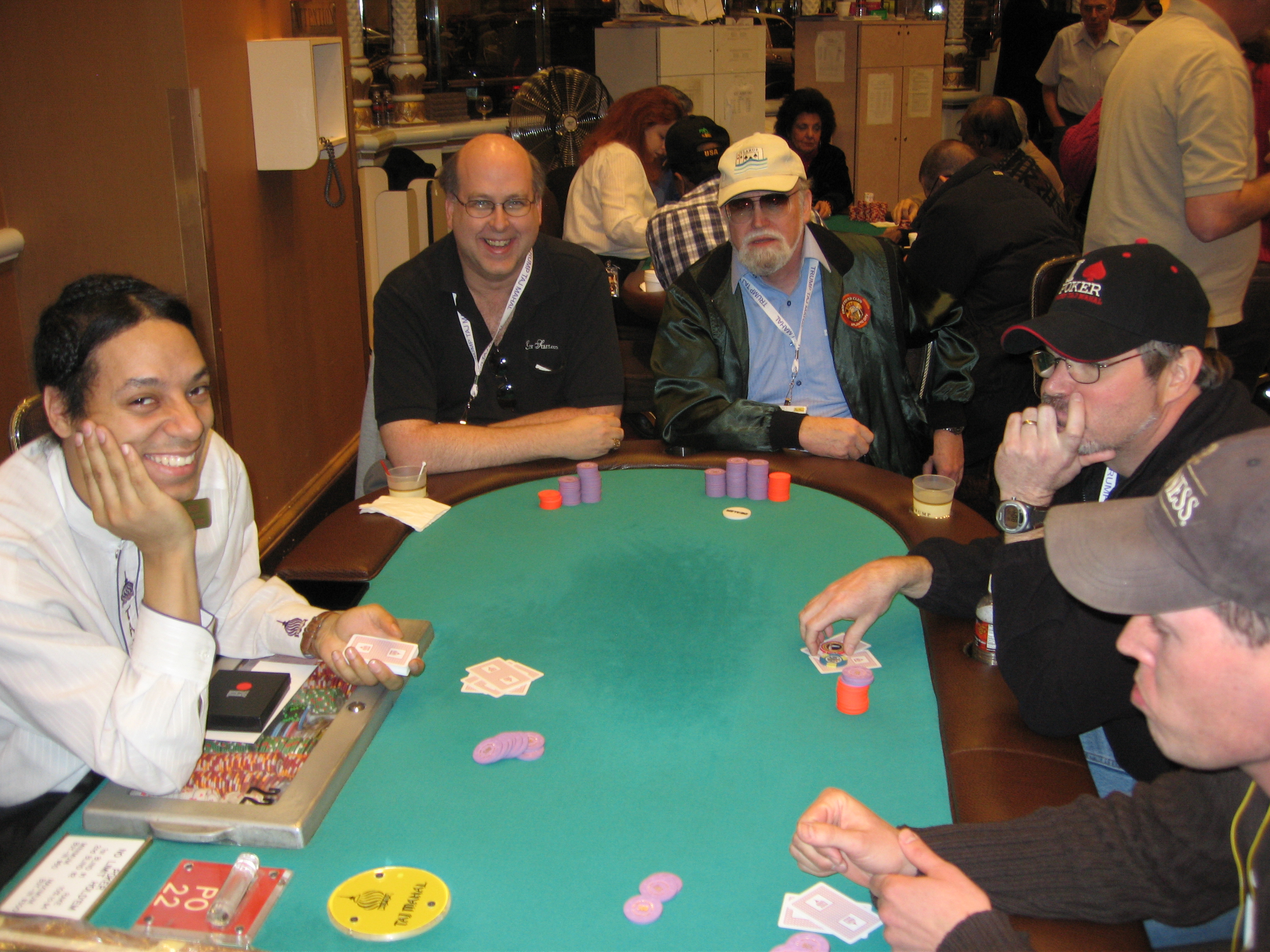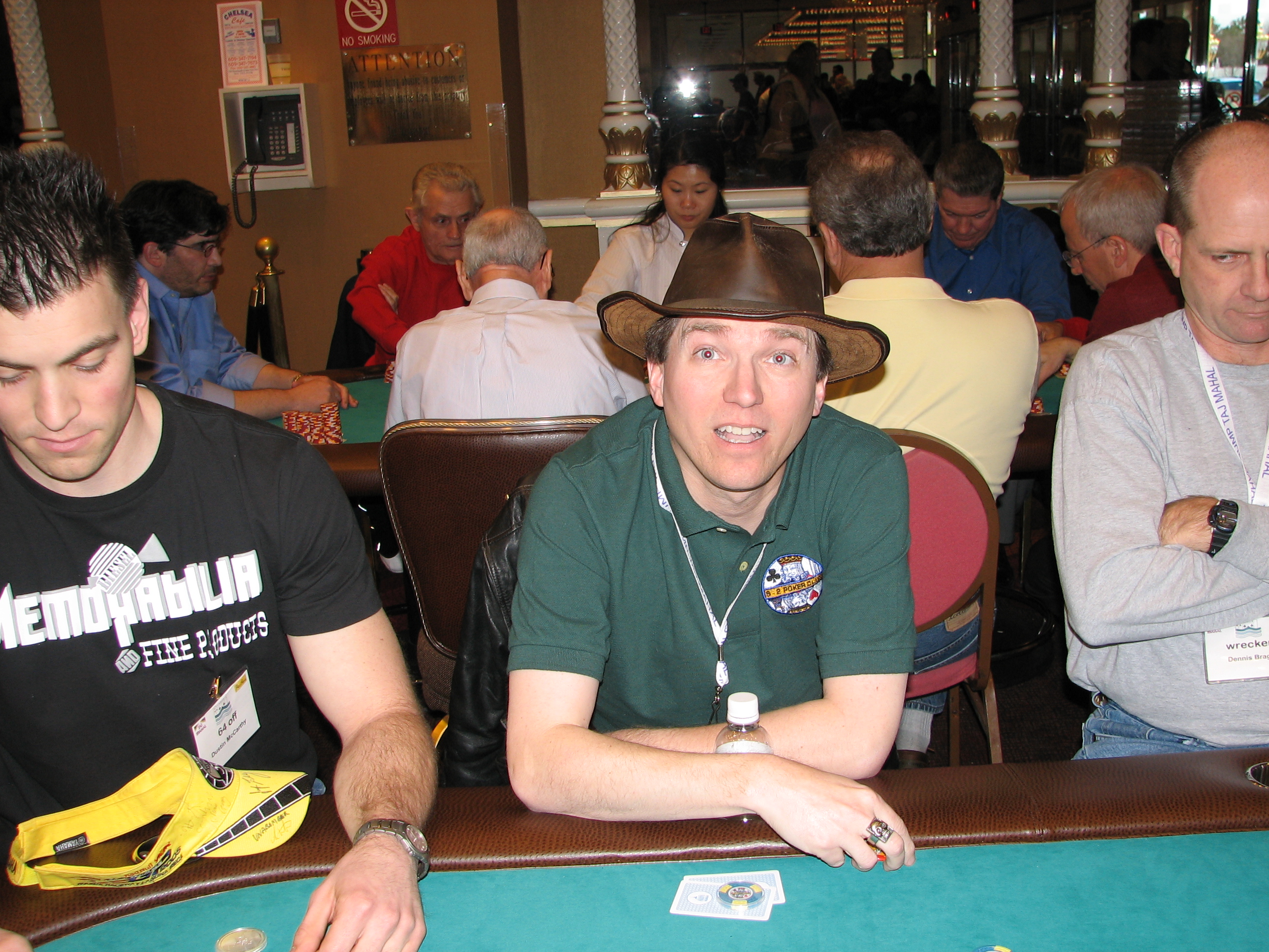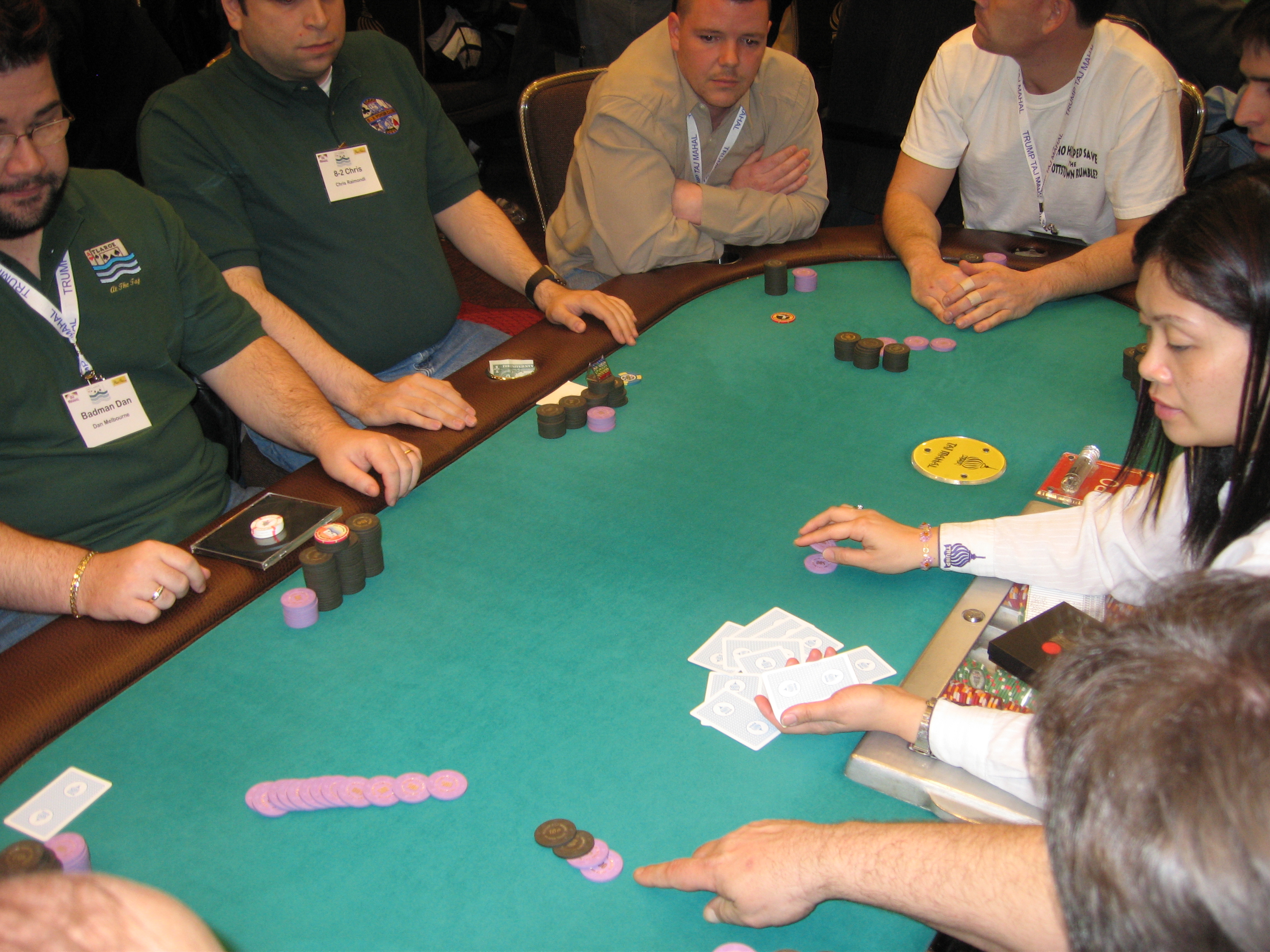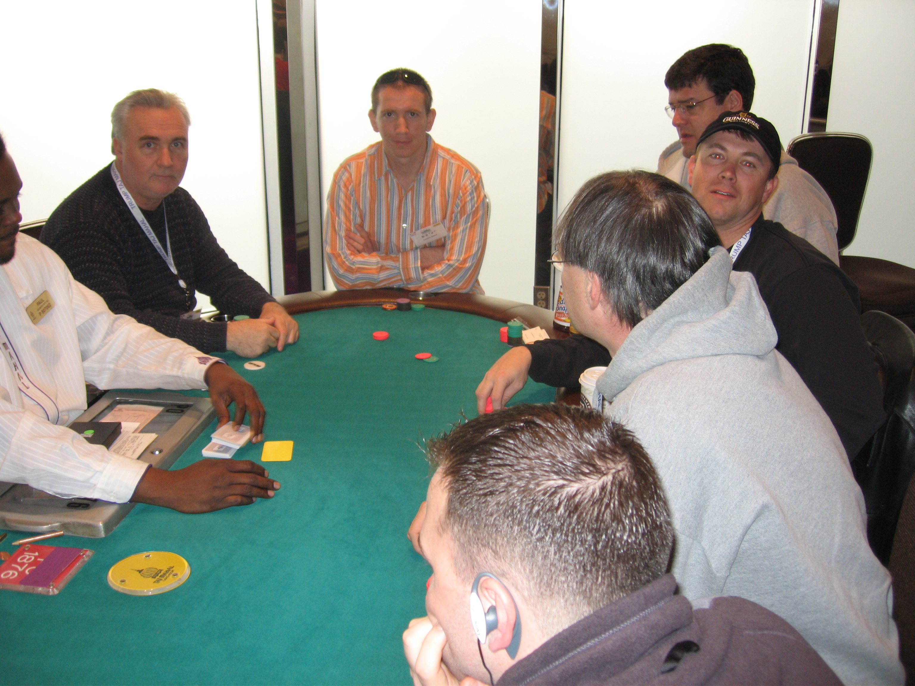 (From her blog: http://www.noninetofive.blogspot.com/ [dead link --Ed.]) Matt and Ivy picked me up bright and early and we left Brooklyn for AC. The first thing Matt told me when we got in the car was that the gas gauge was broken (permanently stuck on "E"). He then informed me of something even more hysterical: that I would be playing the H.O.E. tournament when we arrived at the Taj. I hadn't planned on playing this event. I've had historically abysmal results in limit hold 'em tourneys. My Omaha game is so-so on a good day. And before this weekend, I had played Stud O8 exactly once in my life. Overall, not a lot of reasons to play a $120 tournament involving these three games. We arrived just as the tournament registration was finishing up, and since I couldn't check into my room until noon I decided I might as well pass the time reuniting with fellow ARGErs at the poker table. Matt finally convinced me by offering to take half my action. I told him it was a lousy investment, outlining my reasons from above, but the long drive and lack of breakfast must have addled his brain because we ended up making this deal anyway. After a mad scramble to get a Taj card, I signed up for the tourney and took my seat. I was about to play my first H.O.E. tournament. I played at so many tables in this tourney that it's hard to recall who was at each one. Please yell at me if I forget you or get this wrong. Players I remember from my first table were Kenny, Matt, and Laurie Caulkins. Laurie had a nice set of chopsticks from her recent trip to China as her bust-out prize and I eyed them covetously. I don't remember any hands from this table, and in fact the most memorable thing that happened was Ivy Janet bringing us all a box of sinfully delicious Krispy Kream doughnuts. Mmmm, doughnuts.....argharhgahrargh. I found that the rotation game format really kept me paying attention in this tournament. Having to think about a different game every half hour or so kept things interesting, and I really enjoyed it. (Anyone know of any rotation tourneys online?) I found that my Omaha game was on par with the players around me, and I muddled through the Stud rounds without spewing too many chips. My basic strategy in Stud early on was to fold almost every hand except the ones I was 100% sure were playable, pinpoint the players at my table who seemed to understand the game, and watch them play theirs. (I also saw a fair number of examples of what not to do...) My stack remained healthy through most of the early rounds. As the blinds increased, I started to worry more about the fact that I would not be able to make it deep in this tournament without winning some Stud hands. The pots in Stud were the largest being played, and I needed to get my hands on those chips sooner or later. My first huge pot was not in Stud, but in Omaha. One player limped and I limped behind with A4xx double-suited (sorry I don't have more precise hand histories). The flop came with two low cards and one diamond. I held the Ax of diamonds. The turn paired the board, and I donked along to the river, where I hit my flush. I called one bet, as did the limper behind me, and when we turned up our hands I was up against a smaller flush for the high and ended up with half the low as well. I was accumulating chips nicely and never had much concern for my chip stack. Until I was moved yet again and found myself with Jeff Caulkins and Bill Chen on my right and Rob "ActionBob" Hwang on my left. And oh, good, the Stud round was beginning. Bill wonders if he'll make it to his speech on time. I don't know much about Stud O8, but it seemed to me that as long as I went for the low, I could sometimes back into a decent high and still win. I scooped two huge Stud pots at this table, both with two pair. How could this be?? On one hand, no one had a low, so and on the other my two small pair were good. Is this common in Stud? My only other experience with split games is Omaha, and two pair are rarely good for the high in that game. Stacking my chips, I looked up and saw that Jeff had a pair of chopsticks as his bust-out prize just as Laurie had. I wanted them. During the Hold 'Em round, I looked down at two red sevens. Jeff was short-stacked and called my pre-flop raise. The flop came ten-high and he moved in. I wanted those chopsticks real bad so I called. Jeff showed two overs (ace-jack, I think?) and got no love from the turn or river. Jeff was out and the chopsticks were mine! Woot! Now I had a serious stack, and entered my favorite part of a tournament: the part where I have chips and start raising like it's going out of style. During the course of this tournament, someone gave me the nickname, "Raising Station." I took that as a compliment. I was able to steal some blinds/antes/pots during the next few rounds (and to be fair, I was also getting smacked with the deck) and built my stack even bigger. One by one, players were getting knocked out around me (and sometimes, *by* me!). I started to think I might have a shot at going really deep in this thing. The raising station (center). Thank goodness I've built up my tourney stamina online during the past few months, and thank goodness that the deeper you get in a tournament, the less the specific game matters. Nine hours after we began, I found myself at the final table. The blinds were insane, and any given hand could turn the short stack into the chip leader (and vice versa). I made this swing a couple of times myself as we remained eight-handed for nearly an hour. Then there was a rapid series of bust-outs and we were four-handed: Rob "Suddenly" Catlett, Bill Chen, Gabe DeVitto, and me. It was approaching 8pm, when the banquet was supposed to begin, so we had a pitiful number of sweaters. They were busy admiring the Poker Stars ice sculpture upstairs. Since I was a moron and didn't record any of this sooner, I have no remarkable hands to report. Bill busted fourth, followed by Rob, and that left Gabe and me