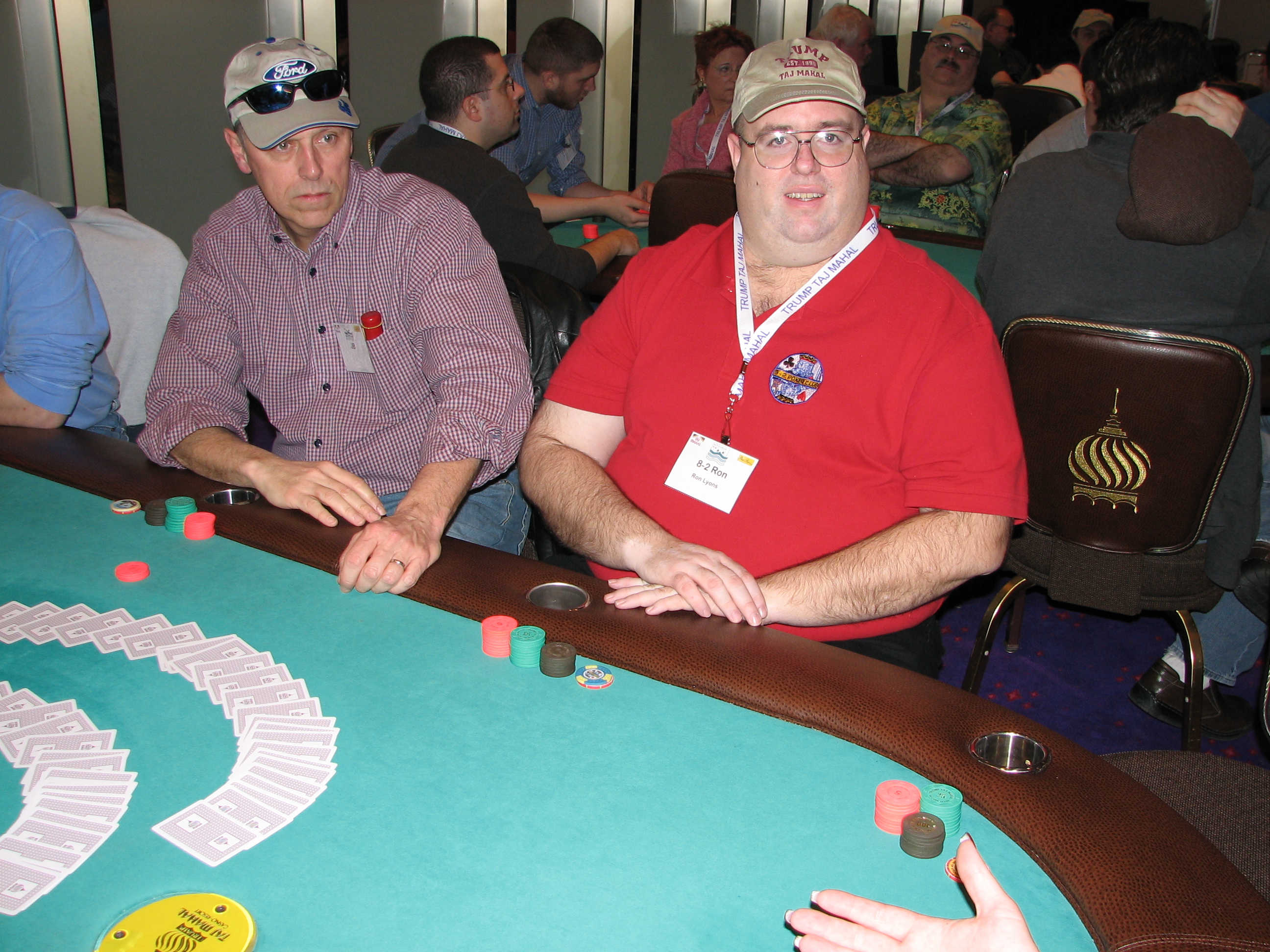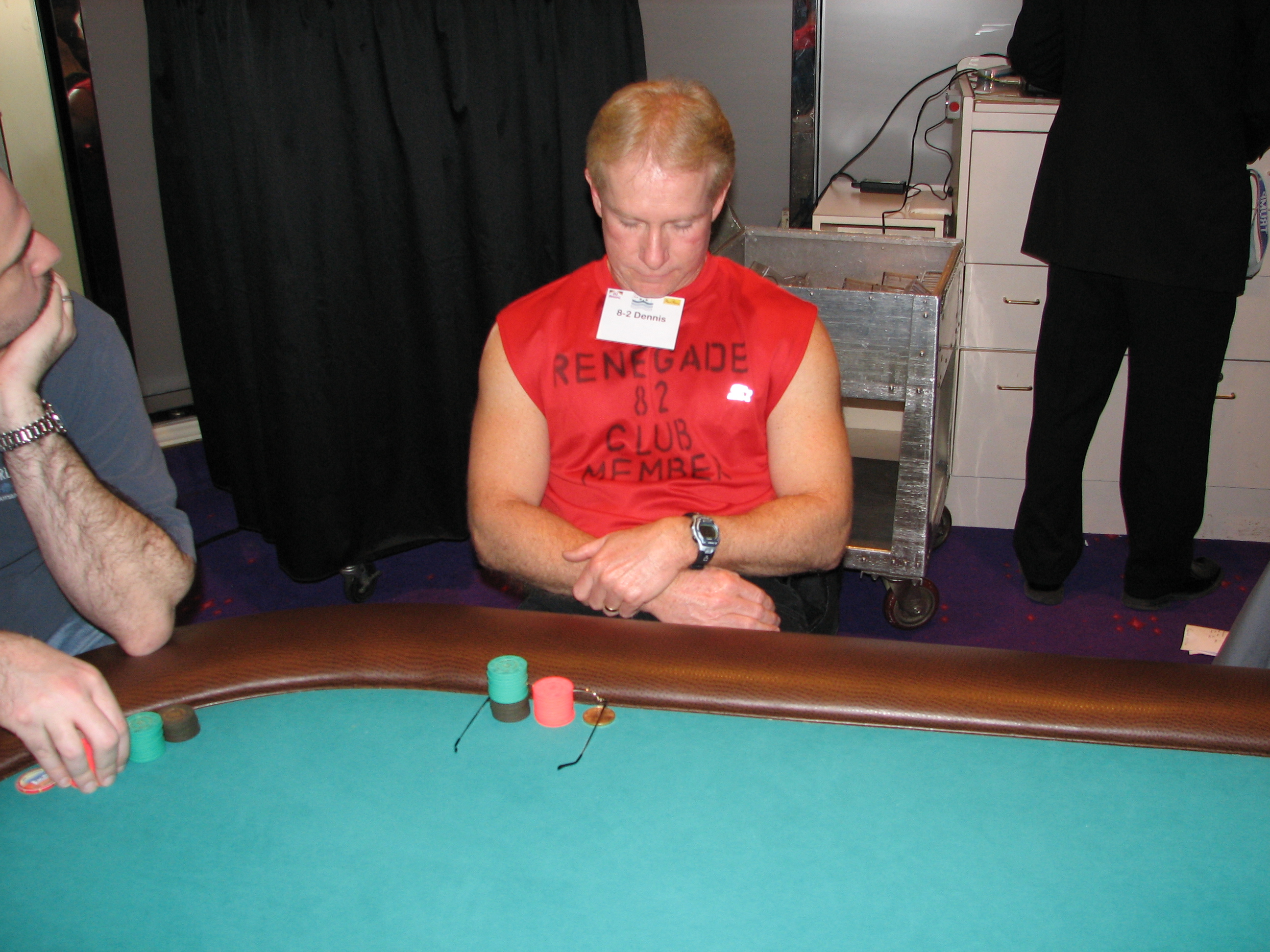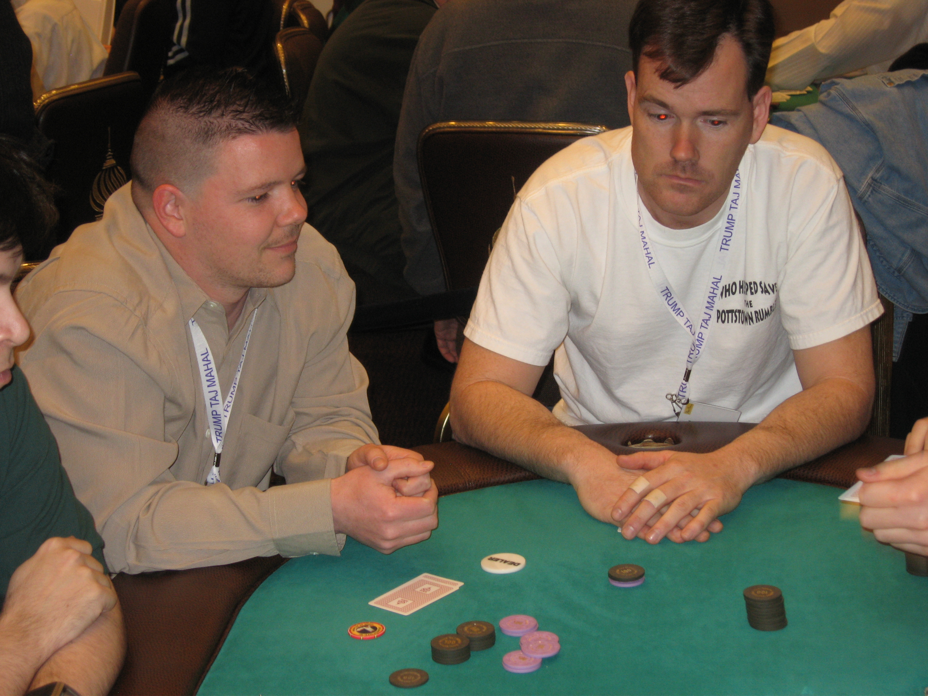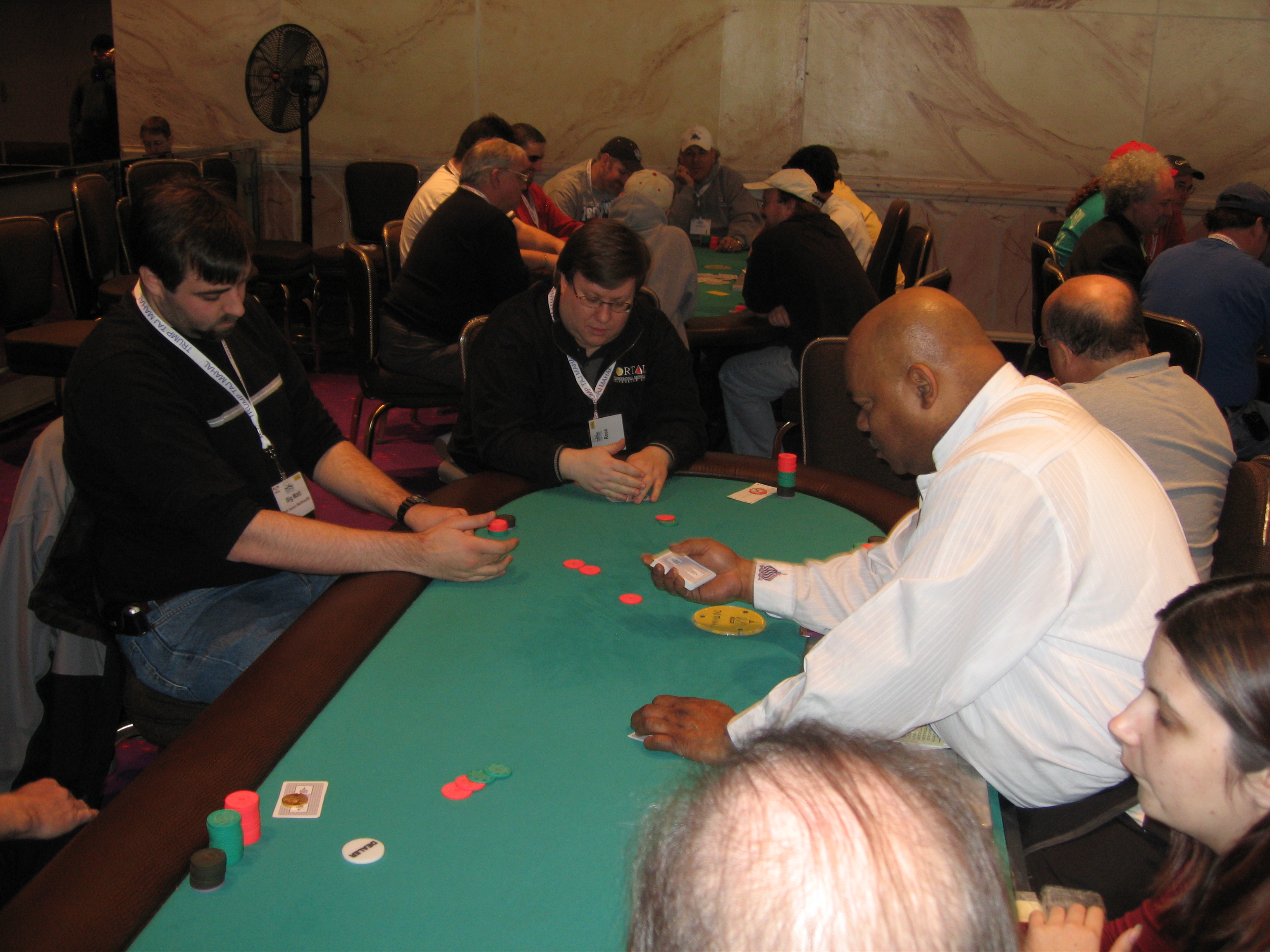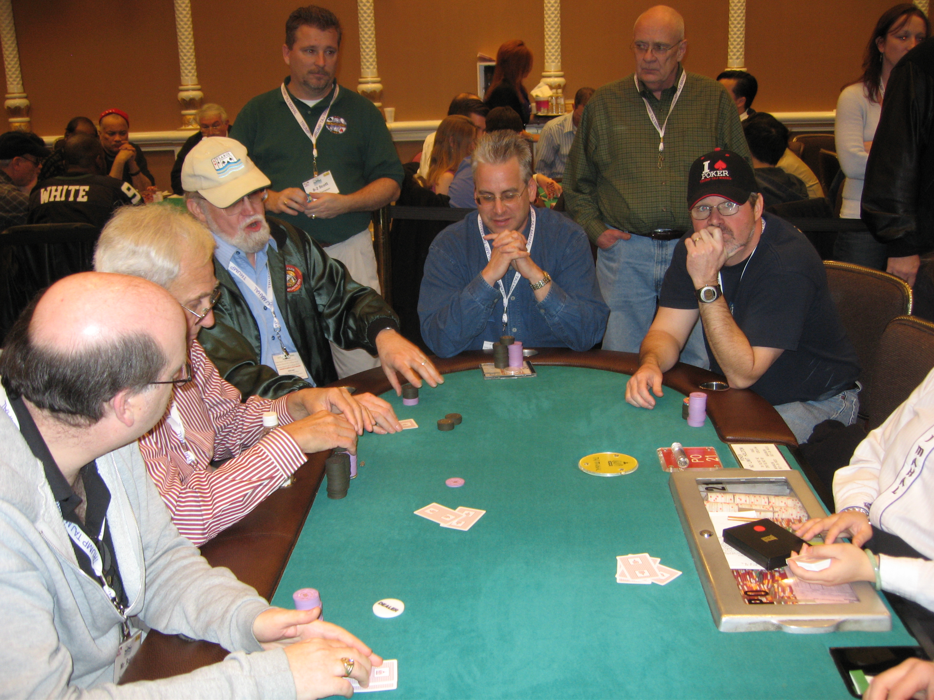 (From her blog: http://www.noninetofive.blogspot.com/ [dead link --Ed.]) Matt and Ivy picked me up bright and early and we left Brooklyn for AC. The first thing Matt told me when we got in the car was that the gas gauge was broken (permanently stuck on "E"). He then informed me of something even more hysterical: that I would be playing the H.O.E. tournament when we arrived at the Taj. I hadn't planned on playing this event. I've had historically abysmal results in limit hold 'em tourneys. My Omaha game is so-so on a good day. And before this weekend, I had played Stud O8 exactly once in my life. Overall, not a lot of reasons to play a $120 tournament involving these three games. We arrived just as the tournament registration was finishing up, and since I couldn't check into my room until noon I decided I might as well pass the time reuniting with fellow ARGErs at the poker table. Matt finally convinced me by offering to take half my action. I told him it was a lousy investment, outlining my reasons from above, but the long drive and lack of breakfast must have addled his brain because we ended up making this deal anyway. After a mad scramble to get a Taj card, I signed up for the tourney and took my seat. I was about to play my first H.O.E. tournament. I played at so many tables in this tourney that it's hard to recall who was at each one. Please yell at me if I forget you or get this wrong. Players I remember from my first table were Kenny, Matt, and Laurie Caulkins. Laurie had a nice set of chopsticks from her recent trip to China as her bust-out prize and I eyed them covetously. I don't remember any hands from this table, and in fact the most memorable thing that happened was Ivy Janet bringing us all a box of sinfully delicious Krispy Kream doughnuts. Mmmm, doughnuts.....argharhgahrargh. I found that the rotation game format really kept me paying attention in this tournament. Having to think about a different game every half hour or so kept things interesting, and I really enjoyed it. (Anyone know of any rotation tourneys online?) I found that my Omaha game was on par with the players around me, and I muddled through the Stud rounds without spewing too many chips. My basic strategy in Stud early on was to fold almost every hand except the ones I was 100% sure were playable, pinpoint the players at my table who seemed to understand the game, and watch them play theirs. (I also saw a fair number of examples of what not to do...) My stack remained healthy through most of the early rounds. As the blinds increased, I started to worry more about the fact that I would not be able to make it deep in this tournament without winning some Stud hands. The pots in Stud were the largest being played, and I needed to get my hands on those chips sooner or later. My first huge pot was not in Stud, but in Omaha. One player limped and I limped behind with A4xx double-suited (sorry I don't have more precise hand histories). The flop came with two low cards and one diamond. I held the Ax of diamonds. The turn paired the board, and I donked along to the river, where I hit my flush. I called one bet, as did the limper behind me, and when we turned up our hands I was up against a smaller flush for the high and ended up with half the low as well. I was accumulating chips nicely and never had much concern for my chip stack. Until I was moved yet again and found myself with Jeff Caulkins and Bill Chen on my right and Rob "ActionBob" Hwang on my left. And oh, good, the Stud round was beginning. Bill wonders if he'll make it to his speech on time. I don't know much about Stud O8, but it seemed to me that as long as I went for the low, I could sometimes back into a decent high and still win. I scooped two huge Stud pots at this table, both with two pair. How could this be?? On one hand, no one had a low, so and on the other my two small pair were good. Is this common in Stud? My only other experience with split games is Omaha, and two pair are rarely good for the high in that game. Stacking my chips, I looked up and saw that Jeff had a pair of chopsticks as his bust-out prize just as Laurie had. I wanted them. During the Hold 'Em round, I looked down at two red sevens. Jeff was short-stacked and called my pre-flop raise. The flop came ten-high and he moved in. I wanted those chopsticks real bad so I called. Jeff showed two overs (ace-jack, I think?) and got no love from the turn or river. Jeff was out and the chopsticks were mine! Woot! Now I had a serious stack, and entered my favorite part of a tournament: the part where I have chips and start raising like it's going out of style. During the course of this tournament, someone gave me the nickname, "Raising Station." I took that as a compliment. I was able to steal some blinds/antes/pots during the next few rounds (and to be fair, I was also getting smacked with the deck) and built my stack even bigger. One by one, players were getting knocked out around me (and sometimes, *by* me!). I started to think I might have a shot at going really deep in this thing. The raising station (center). Thank goodness I've built up my tourney stamina online during the past few months, and thank goodness that the deeper you get in a tournament, the less the specific game matters. Nine hours after we began, I found myself at the final table. The blinds were insane, and any given hand could turn the short stack into the chip leader (and vice versa). I made this swing a couple of times myself as we remained eight-handed for nearly an hour. Then there was a rapid series of bust-outs and we were four-handed: Rob "Suddenly" Catlett, Bill Chen, Gabe DeVitto, and me. It was approaching 8pm, when the banquet was supposed to begin, so we had a pitiful number of sweaters. They were busy admiring the Poker Stars ice sculpture upstairs. Since I was a moron and didn't record any of this sooner, I have no remarkable hands to report. Bill busted fourth, followed by Rob, and that left Gabe and me