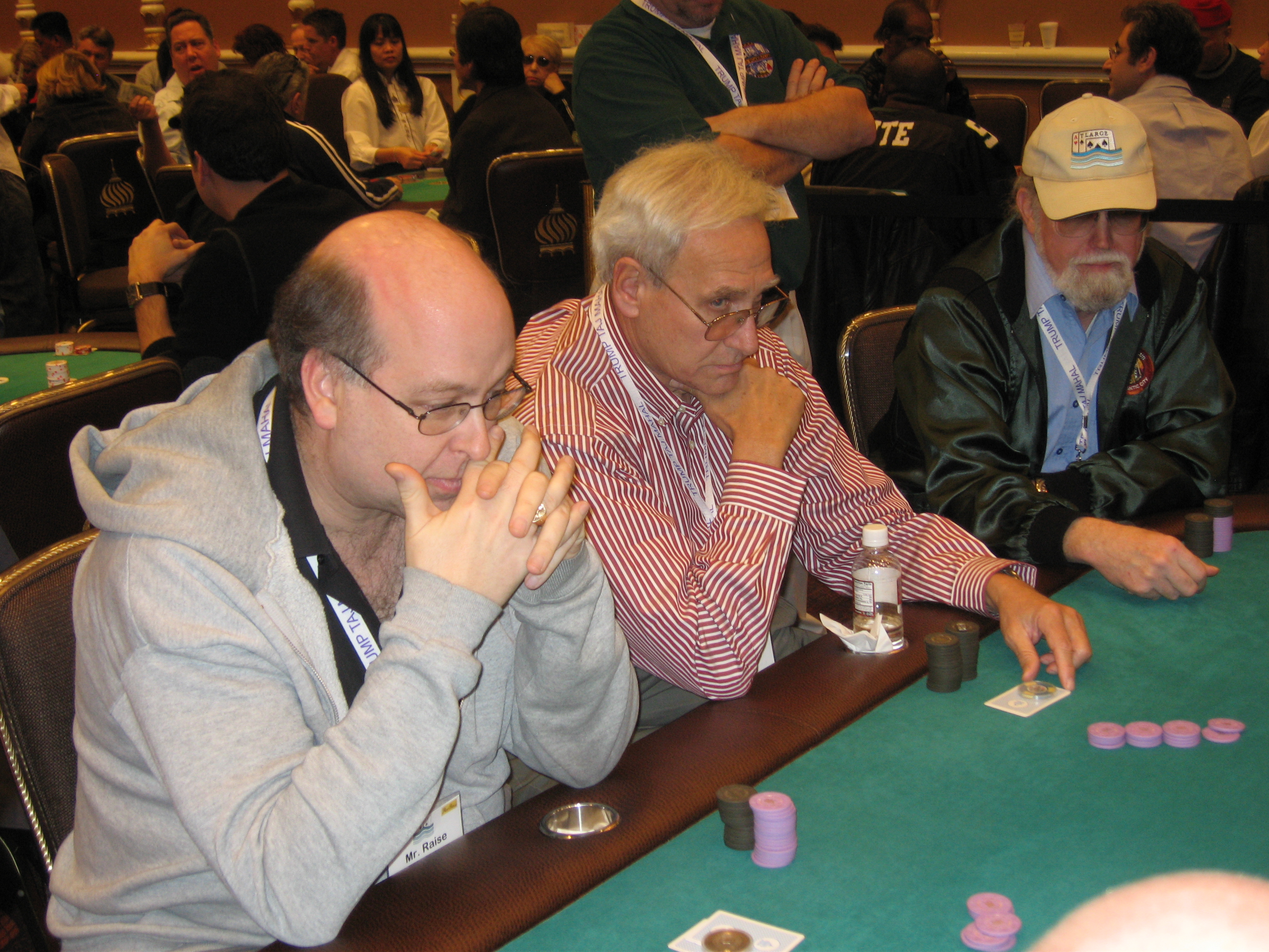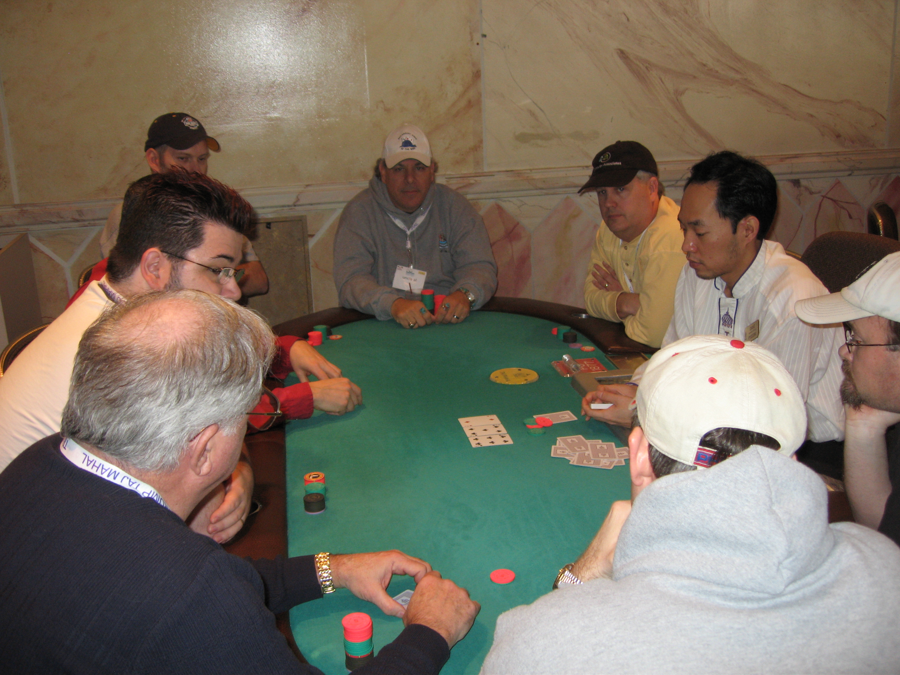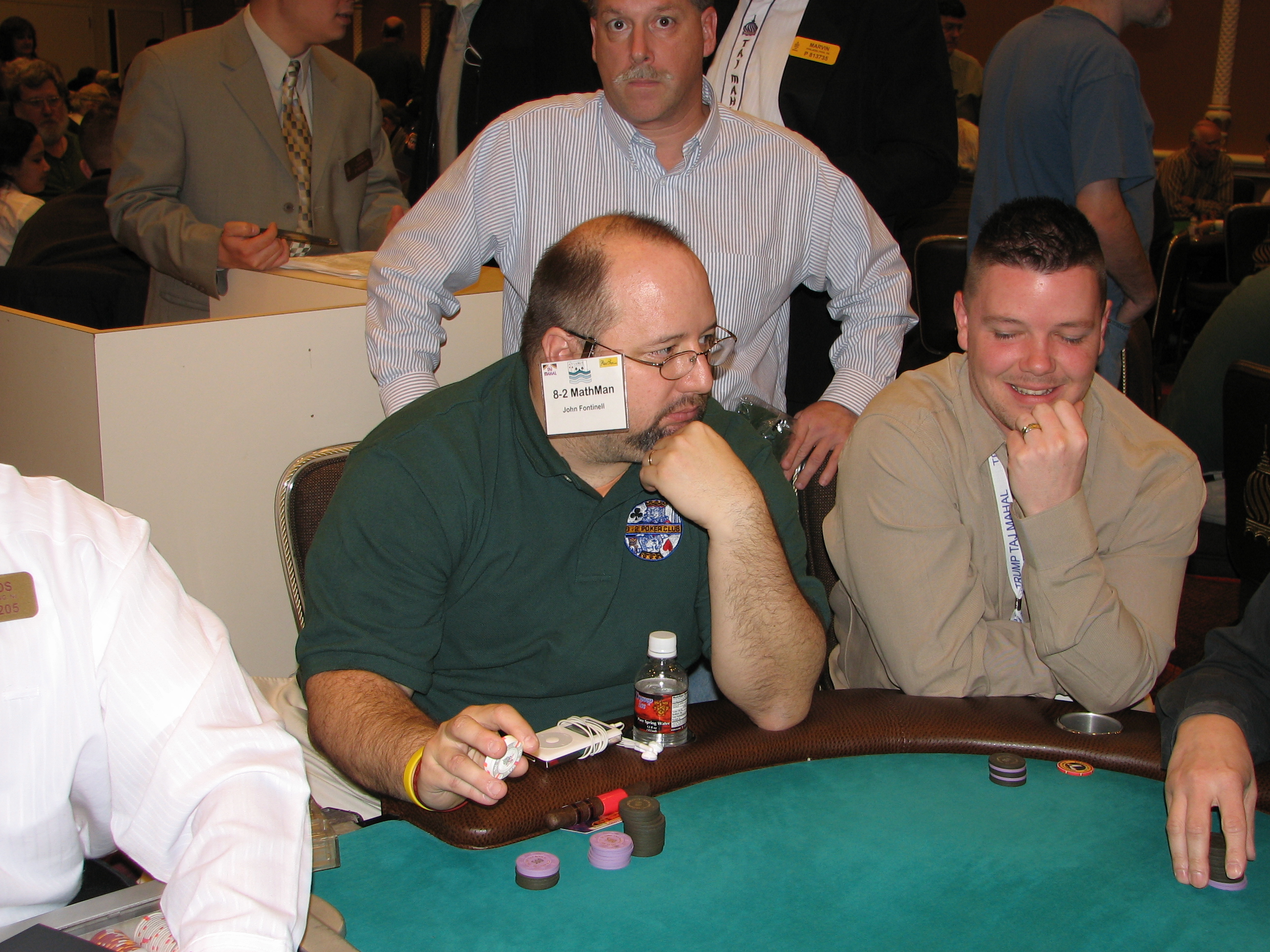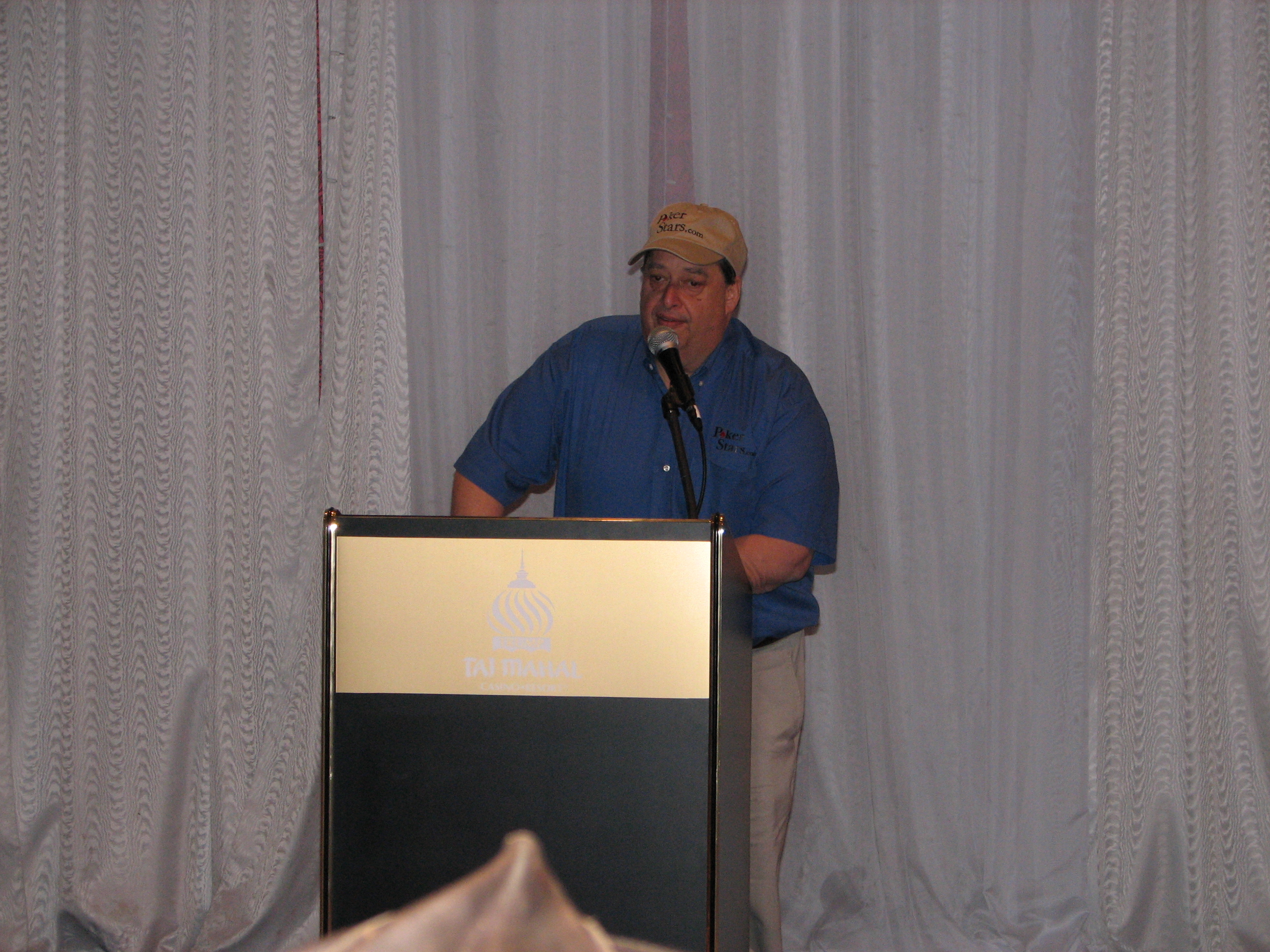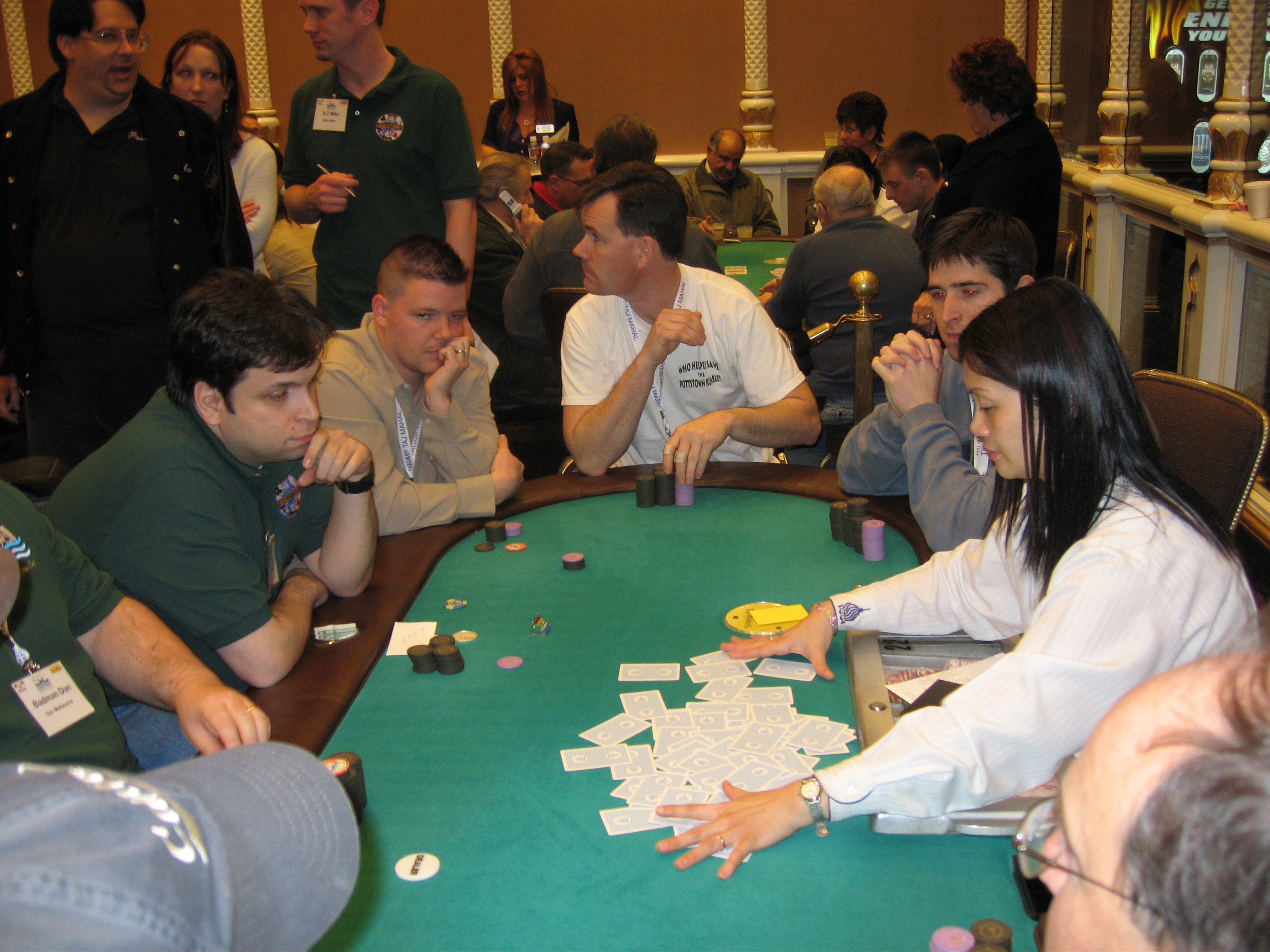 (From her blog: http://www.noninetofive.blogspot.com/ [dead link --Ed.]) Matt and Ivy picked me up bright and early and we left Brooklyn for AC. The first thing Matt told me when we got in the car was that the gas gauge was broken (permanently stuck on "E"). He then informed me of something even more hysterical: that I would be playing the H.O.E. tournament when we arrived at the Taj. I hadn't planned on playing this event. I've had historically abysmal results in limit hold 'em tourneys. My Omaha game is so-so on a good day. And before this weekend, I had played Stud O8 exactly once in my life. Overall, not a lot of reasons to play a $120 tournament involving these three games. We arrived just as the tournament registration was finishing up, and since I couldn't check into my room until noon I decided I might as well pass the time reuniting with fellow ARGErs at the poker table. Matt finally convinced me by offering to take half my action. I told him it was a lousy investment, outlining my reasons from above, but the long drive and lack of breakfast must have addled his brain because we ended up making this deal anyway. After a mad scramble to get a Taj card, I signed up for the tourney and took my seat. I was about to play my first H.O.E. tournament. I played at so many tables in this tourney that it's hard to recall who was at each one. Please yell at me if I forget you or get this wrong. Players I remember from my first table were Kenny, Matt, and Laurie Caulkins. Laurie had a nice set of chopsticks from her recent trip to China as her bust-out prize and I eyed them covetously. I don't remember any hands from this table, and in fact the most memorable thing that happened was Ivy Janet bringing us all a box of sinfully delicious Krispy Kream doughnuts. Mmmm, doughnuts.....argharhgahrargh. I found that the rotation game format really kept me paying attention in this tournament. Having to think about a different game every half hour or so kept things interesting, and I really enjoyed it. (Anyone know of any rotation tourneys online?) I found that my Omaha game was on par with the players around me, and I muddled through the Stud rounds without spewing too many chips. My basic strategy in Stud early on was to fold almost every hand except the ones I was 100% sure were playable, pinpoint the players at my table who seemed to understand the game, and watch them play theirs. (I also saw a fair number of examples of what not to do...) My stack remained healthy through most of the early rounds. As the blinds increased, I started to worry more about the fact that I would not be able to make it deep in this tournament without winning some Stud hands. The pots in Stud were the largest being played, and I needed to get my hands on those chips sooner or later. My first huge pot was not in Stud, but in Omaha. One player limped and I limped behind with A4xx double-suited (sorry I don't have more precise hand histories). The flop came with two low cards and one diamond. I held the Ax of diamonds. The turn paired the board, and I donked along to the river, where I hit my flush. I called one bet, as did the limper behind me, and when we turned up our hands I was up against a smaller flush for the high and ended up with half the low as well. I was accumulating chips nicely and never had much concern for my chip stack. Until I was moved yet again and found myself with Jeff Caulkins and Bill Chen on my right and Rob "ActionBob" Hwang on my left. And oh, good, the Stud round was beginning. Bill wonders if he'll make it to his speech on time. I don't know much about Stud O8, but it seemed to me that as long as I went for the low, I could sometimes back into a decent high and still win. I scooped two huge Stud pots at this table, both with two pair. How could this be?? On one hand, no one had a low, so and on the other my two small pair were good. Is this common in Stud? My only other experience with split games is Omaha, and two pair are rarely good for the high in that game. Stacking my chips, I looked up and saw that Jeff had a pair of chopsticks as his bust-out prize just as Laurie had. I wanted them. During the Hold 'Em round, I looked down at two red sevens. Jeff was short-stacked and called my pre-flop raise. The flop came ten-high and he moved in. I wanted those chopsticks real bad so I called. Jeff showed two overs (ace-jack, I think?) and got no love from the turn or river. Jeff was out and the chopsticks were mine! Woot! Now I had a serious stack, and entered my favorite part of a tournament: the part where I have chips and start raising like it's going out of style. During the course of this tournament, someone gave me the nickname, "Raising Station." I took that as a compliment. I was able to steal some blinds/antes/pots during the next few rounds (and to be fair, I was also getting smacked with the deck) and built my stack even bigger. One by one, players were getting knocked out around me (and sometimes, *by* me!). I started to think I might have a shot at going really deep in this thing. The raising station (center). Thank goodness I've built up my tourney stamina online during the past few months, and thank goodness that the deeper you get in a tournament, the less the specific game matters. Nine hours after we began, I found myself at the final table. The blinds were insane, and any given hand could turn the short stack into the chip leader (and vice versa). I made this swing a couple of times myself as we remained eight-handed for nearly an hour. Then there was a rapid series of bust-outs and we were four-handed: Rob "Suddenly" Catlett, Bill Chen, Gabe DeVitto, and me. It was approaching 8pm, when the banquet was supposed to begin, so we had a pitiful number of sweaters. They were busy admiring the Poker Stars ice sculpture upstairs. Since I was a moron and didn't record any of this sooner, I have no remarkable hands to report. Bill busted fourth, followed by Rob, and that left Gabe and me