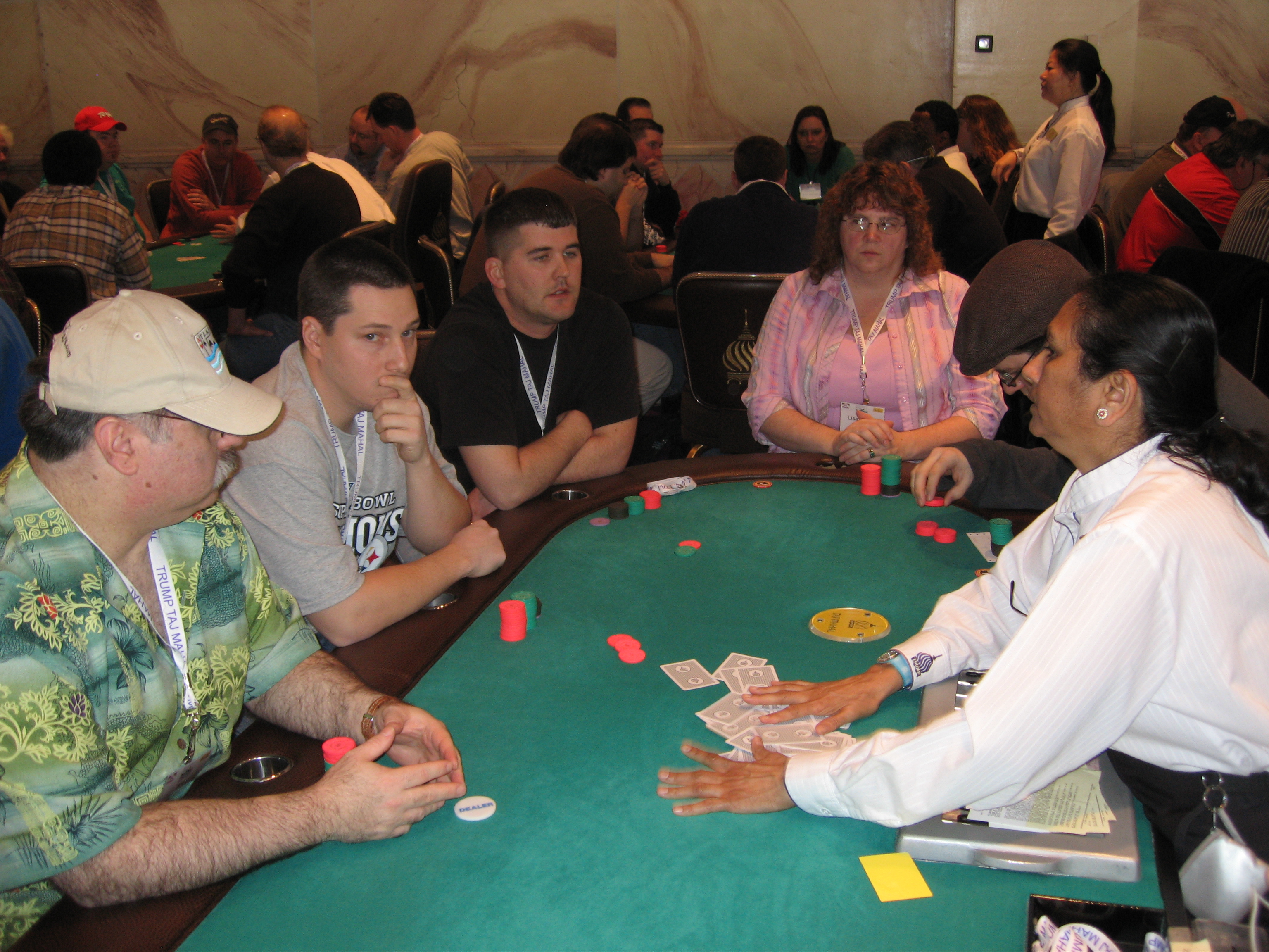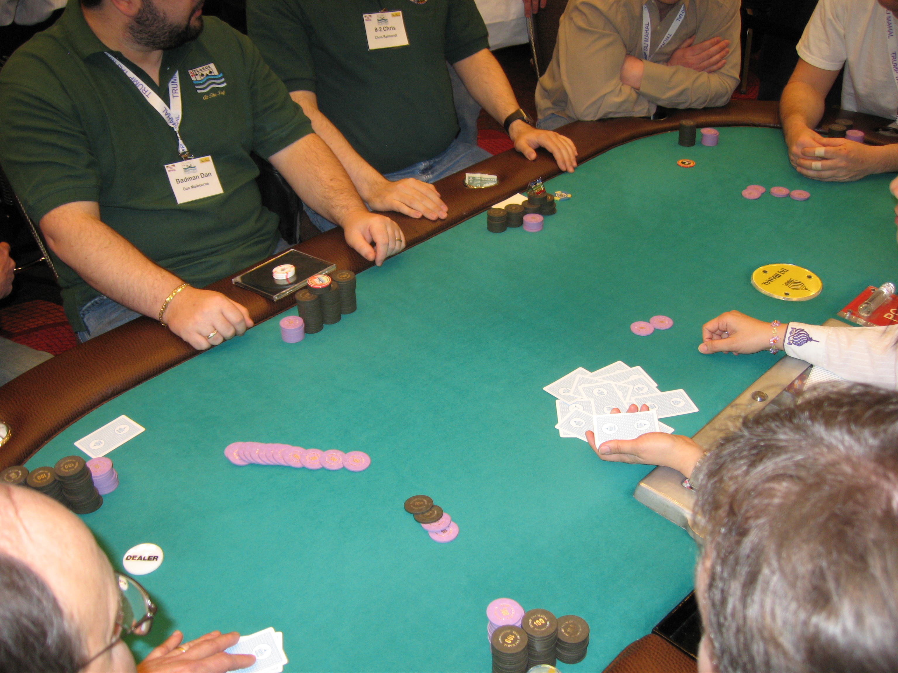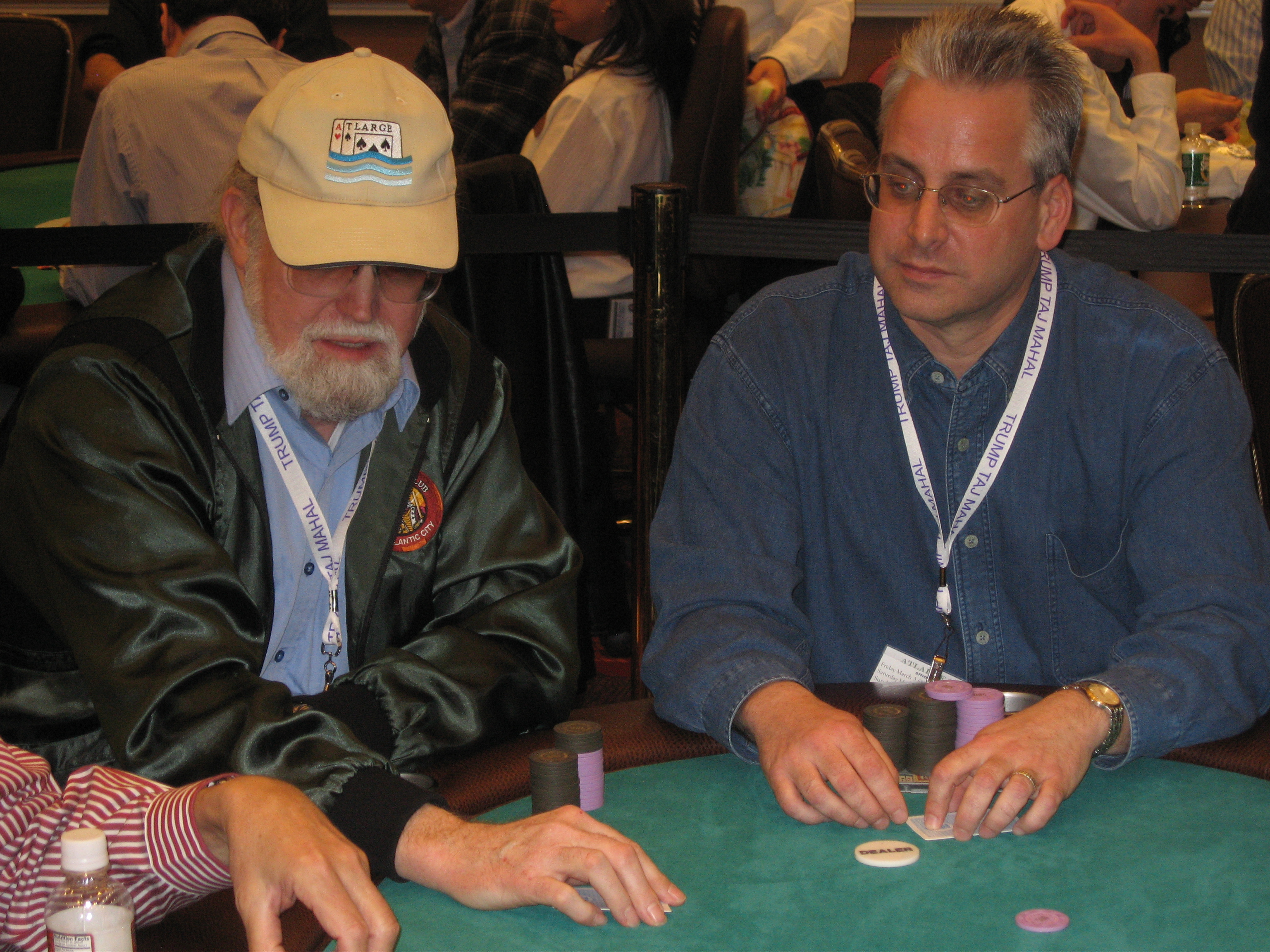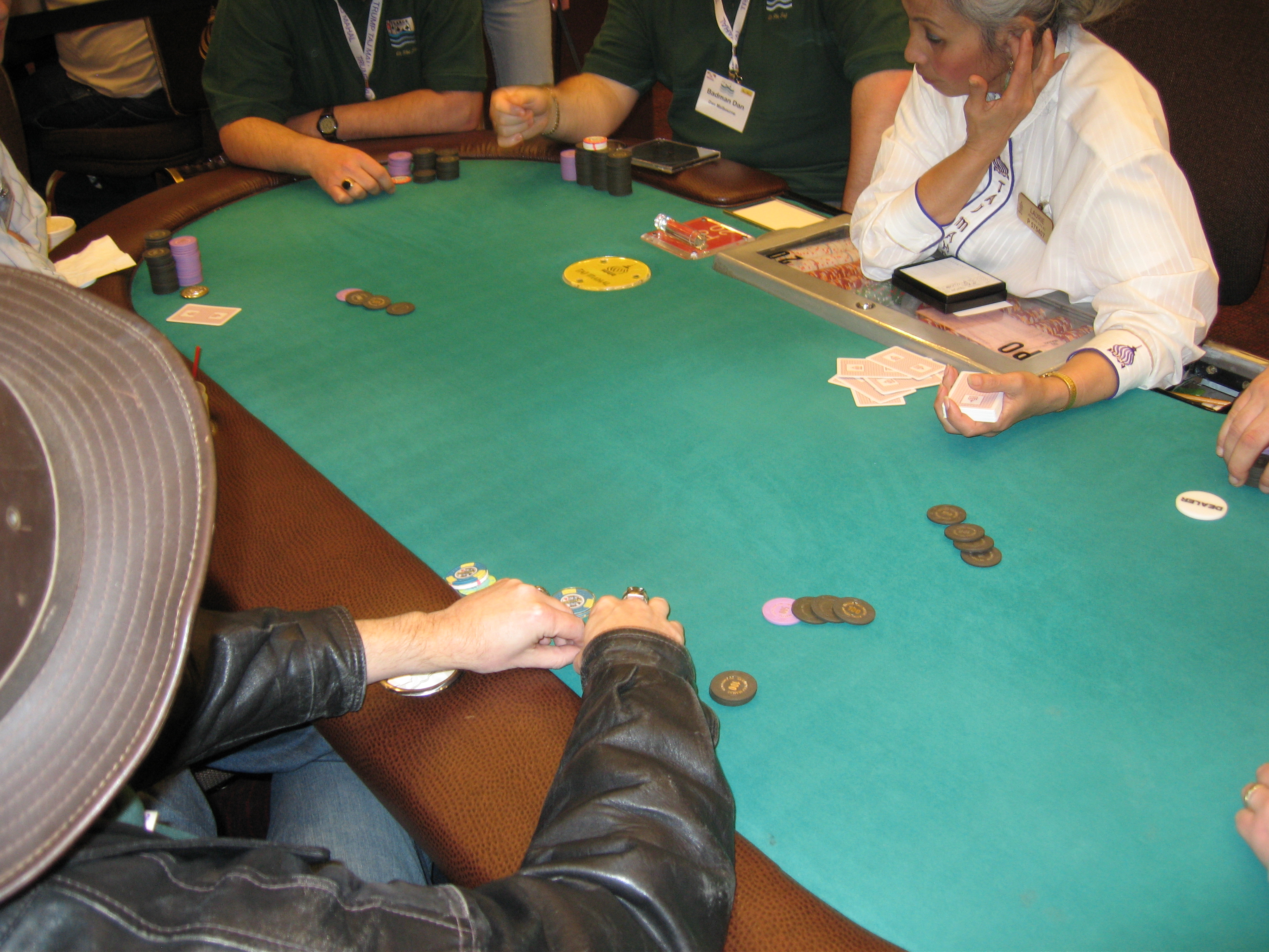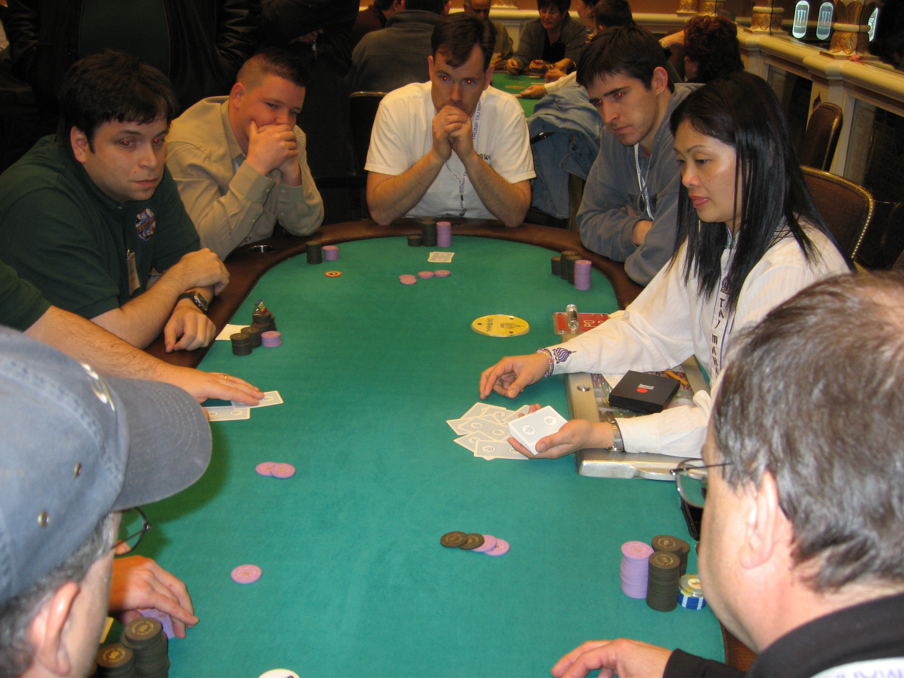 (From her blog: http://www.noninetofive.blogspot.com/ [dead link --Ed.]) Matt and Ivy picked me up bright and early and we left Brooklyn for AC. The first thing Matt told me when we got in the car was that the gas gauge was broken (permanently stuck on "E"). He then informed me of something even more hysterical: that I would be playing the H.O.E. tournament when we arrived at the Taj. I hadn't planned on playing this event. I've had historically abysmal results in limit hold 'em tourneys. My Omaha game is so-so on a good day. And before this weekend, I had played Stud O8 exactly once in my life. Overall, not a lot of reasons to play a $120 tournament involving these three games. We arrived just as the tournament registration was finishing up, and since I couldn't check into my room until noon I decided I might as well pass the time reuniting with fellow ARGErs at the poker table. Matt finally convinced me by offering to take half my action. I told him it was a lousy investment, outlining my reasons from above, but the long drive and lack of breakfast must have addled his brain because we ended up making this deal anyway. After a mad scramble to get a Taj card, I signed up for the tourney and took my seat. I was about to play my first H.O.E. tournament. I played at so many tables in this tourney that it's hard to recall who was at each one. Please yell at me if I forget you or get this wrong. Players I remember from my first table were Kenny, Matt, and Laurie Caulkins. Laurie had a nice set of chopsticks from her recent trip to China as her bust-out prize and I eyed them covetously. I don't remember any hands from this table, and in fact the most memorable thing that happened was Ivy Janet bringing us all a box of sinfully delicious Krispy Kream doughnuts. Mmmm, doughnuts.....argharhgahrargh. I found that the rotation game format really kept me paying attention in this tournament. Having to think about a different game every half hour or so kept things interesting, and I really enjoyed it. (Anyone know of any rotation tourneys online?) I found that my Omaha game was on par with the players around me, and I muddled through the Stud rounds without spewing too many chips. My basic strategy in Stud early on was to fold almost every hand except the ones I was 100% sure were playable, pinpoint the players at my table who seemed to understand the game, and watch them play theirs. (I also saw a fair number of examples of what not to do...) My stack remained healthy through most of the early rounds. As the blinds increased, I started to worry more about the fact that I would not be able to make it deep in this tournament without winning some Stud hands. The pots in Stud were the largest being played, and I needed to get my hands on those chips sooner or later. My first huge pot was not in Stud, but in Omaha. One player limped and I limped behind with A4xx double-suited (sorry I don't have more precise hand histories). The flop came with two low cards and one diamond. I held the Ax of diamonds. The turn paired the board, and I donked along to the river, where I hit my flush. I called one bet, as did the limper behind me, and when we turned up our hands I was up against a smaller flush for the high and ended up with half the low as well. I was accumulating chips nicely and never had much concern for my chip stack. Until I was moved yet again and found myself with Jeff Caulkins and Bill Chen on my right and Rob "ActionBob" Hwang on my left. And oh, good, the Stud round was beginning. Bill wonders if he'll make it to his speech on time. I don't know much about Stud O8, but it seemed to me that as long as I went for the low, I could sometimes back into a decent high and still win. I scooped two huge Stud pots at this table, both with two pair. How could this be?? On one hand, no one had a low, so and on the other my two small pair were good. Is this common in Stud? My only other experience with split games is Omaha, and two pair are rarely good for the high in that game. Stacking my chips, I looked up and saw that Jeff had a pair of chopsticks as his bust-out prize just as Laurie had. I wanted them. During the Hold 'Em round, I looked down at two red sevens. Jeff was short-stacked and called my pre-flop raise. The flop came ten-high and he moved in. I wanted those chopsticks real bad so I called. Jeff showed two overs (ace-jack, I think?) and got no love from the turn or river. Jeff was out and the chopsticks were mine! Woot! Now I had a serious stack, and entered my favorite part of a tournament: the part where I have chips and start raising like it's going out of style. During the course of this tournament, someone gave me the nickname, "Raising Station." I took that as a compliment. I was able to steal some blinds/antes/pots during the next few rounds (and to be fair, I was also getting smacked with the deck) and built my stack even bigger. One by one, players were getting knocked out around me (and sometimes, *by* me!). I started to think I might have a shot at going really deep in this thing. The raising station (center). Thank goodness I've built up my tourney stamina online during the past few months, and thank goodness that the deeper you get in a tournament, the less the specific game matters. Nine hours after we began, I found myself at the final table. The blinds were insane, and any given hand could turn the short stack into the chip leader (and vice versa). I made this swing a couple of times myself as we remained eight-handed for nearly an hour. Then there was a rapid series of bust-outs and we were four-handed: Rob "Suddenly" Catlett, Bill Chen, Gabe DeVitto, and me. It was approaching 8pm, when the banquet was supposed to begin, so we had a pitiful number of sweaters. They were busy admiring the Poker Stars ice sculpture upstairs. Since I was a moron and didn't record any of this sooner, I have no remarkable hands to report. Bill busted fourth, followed by Rob, and that left Gabe and me