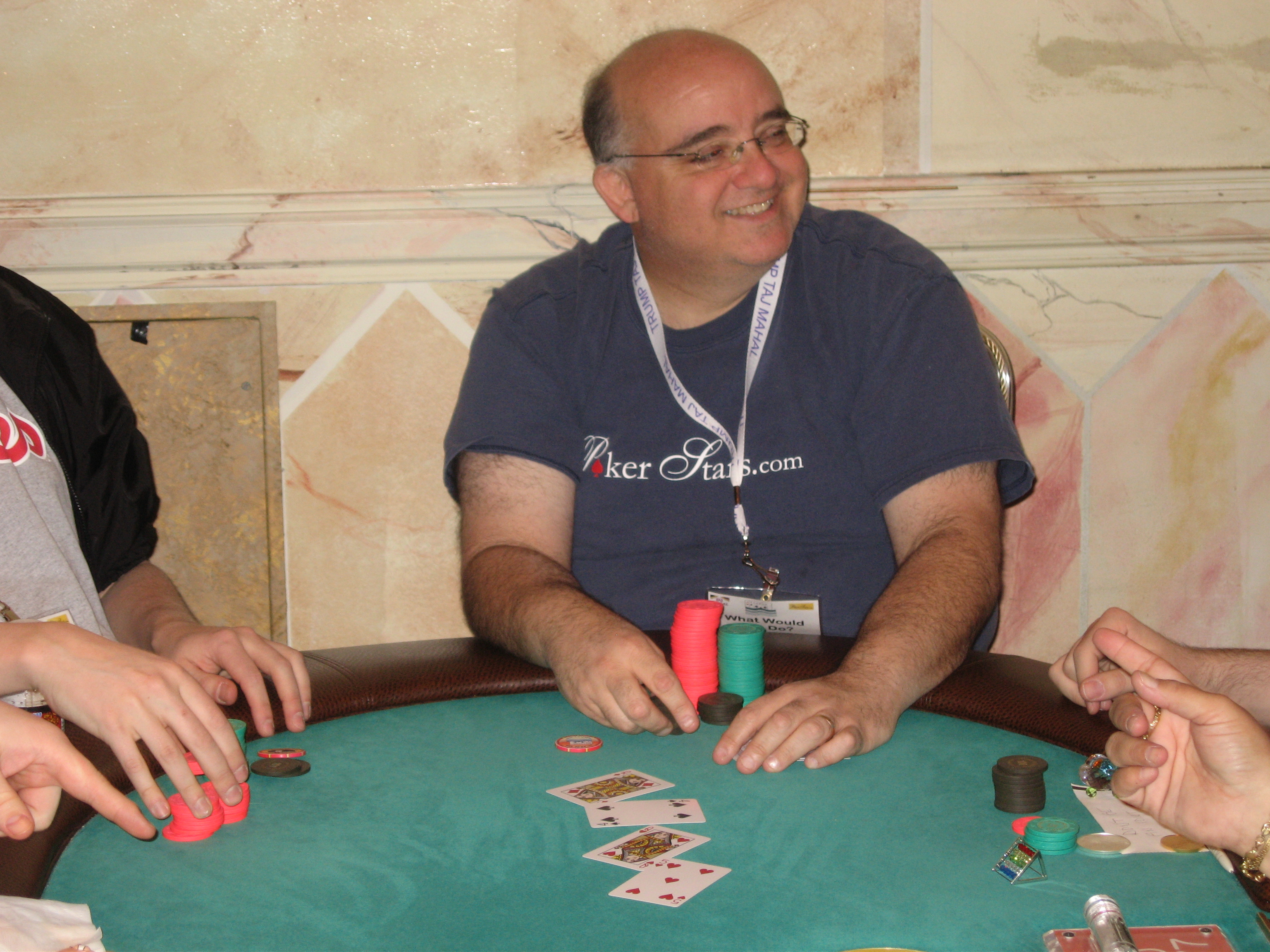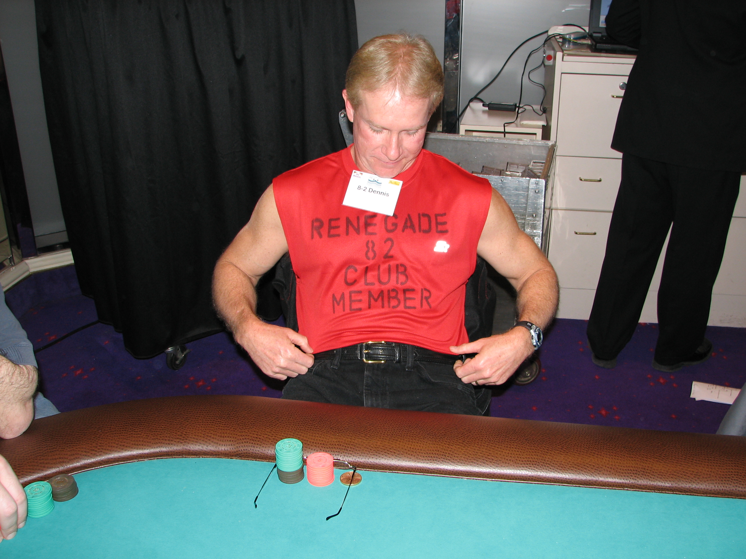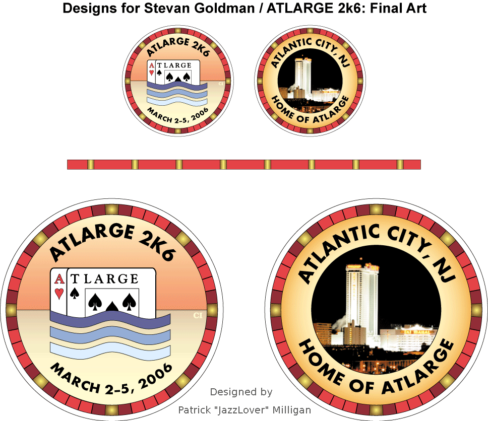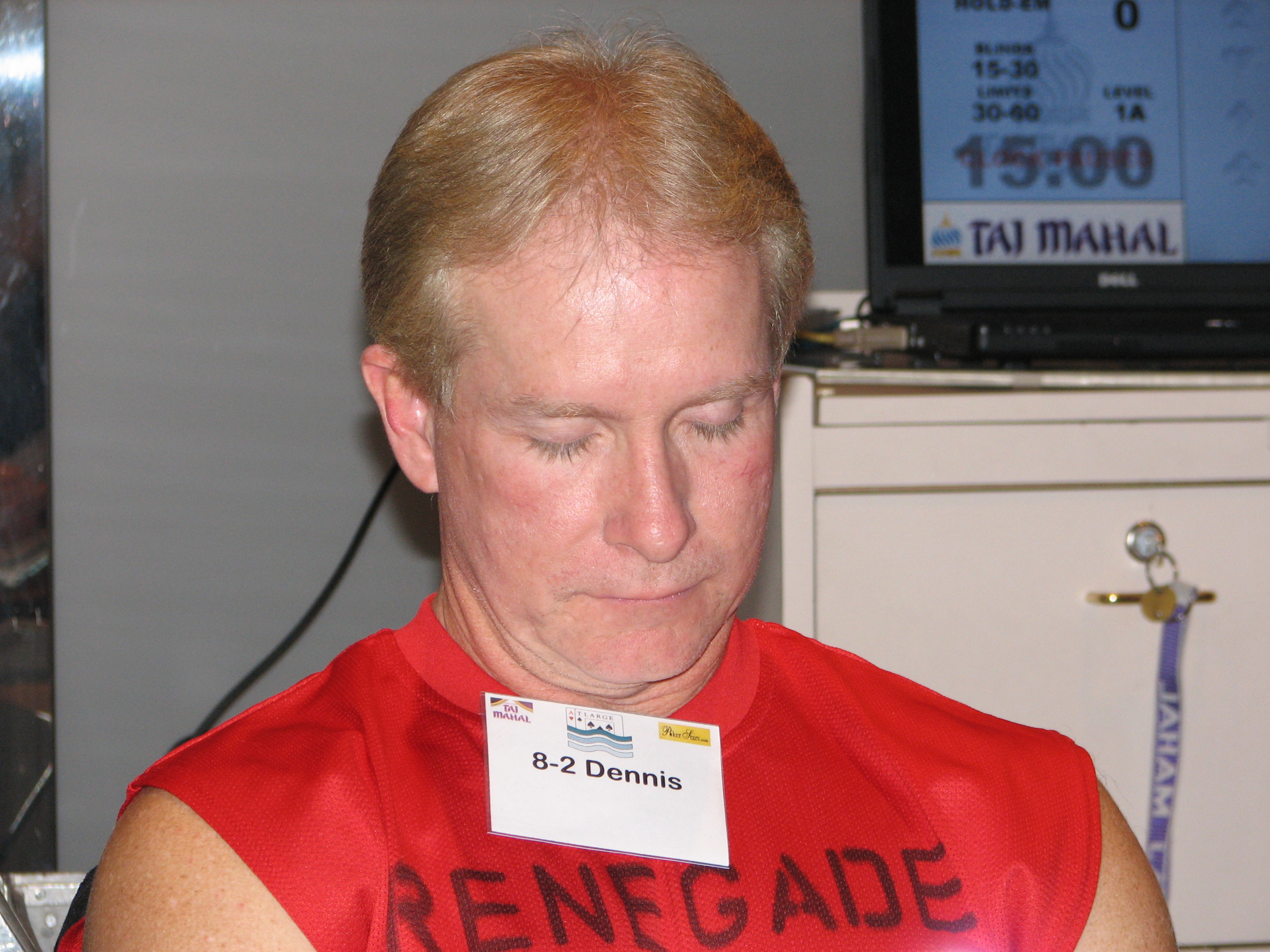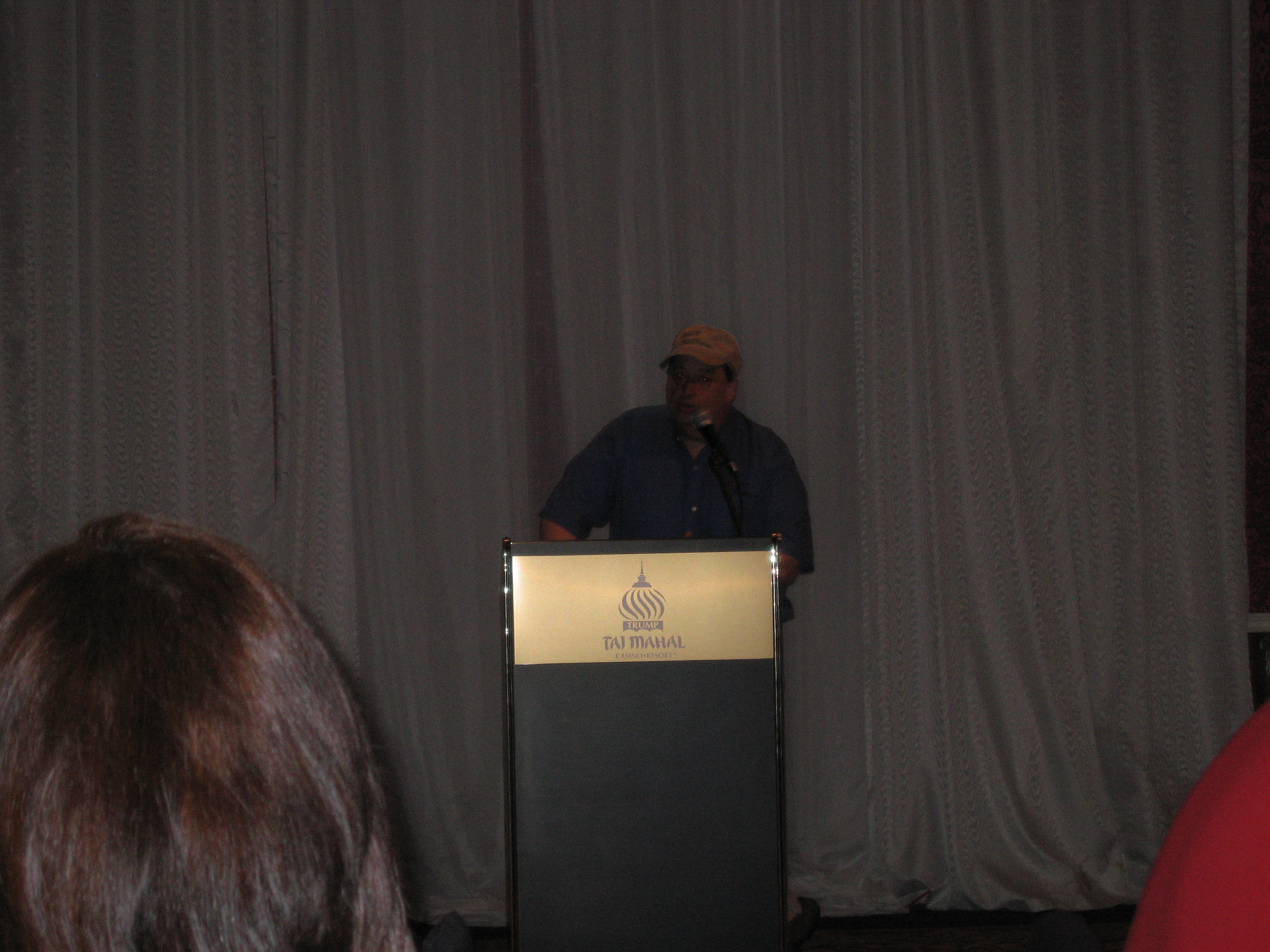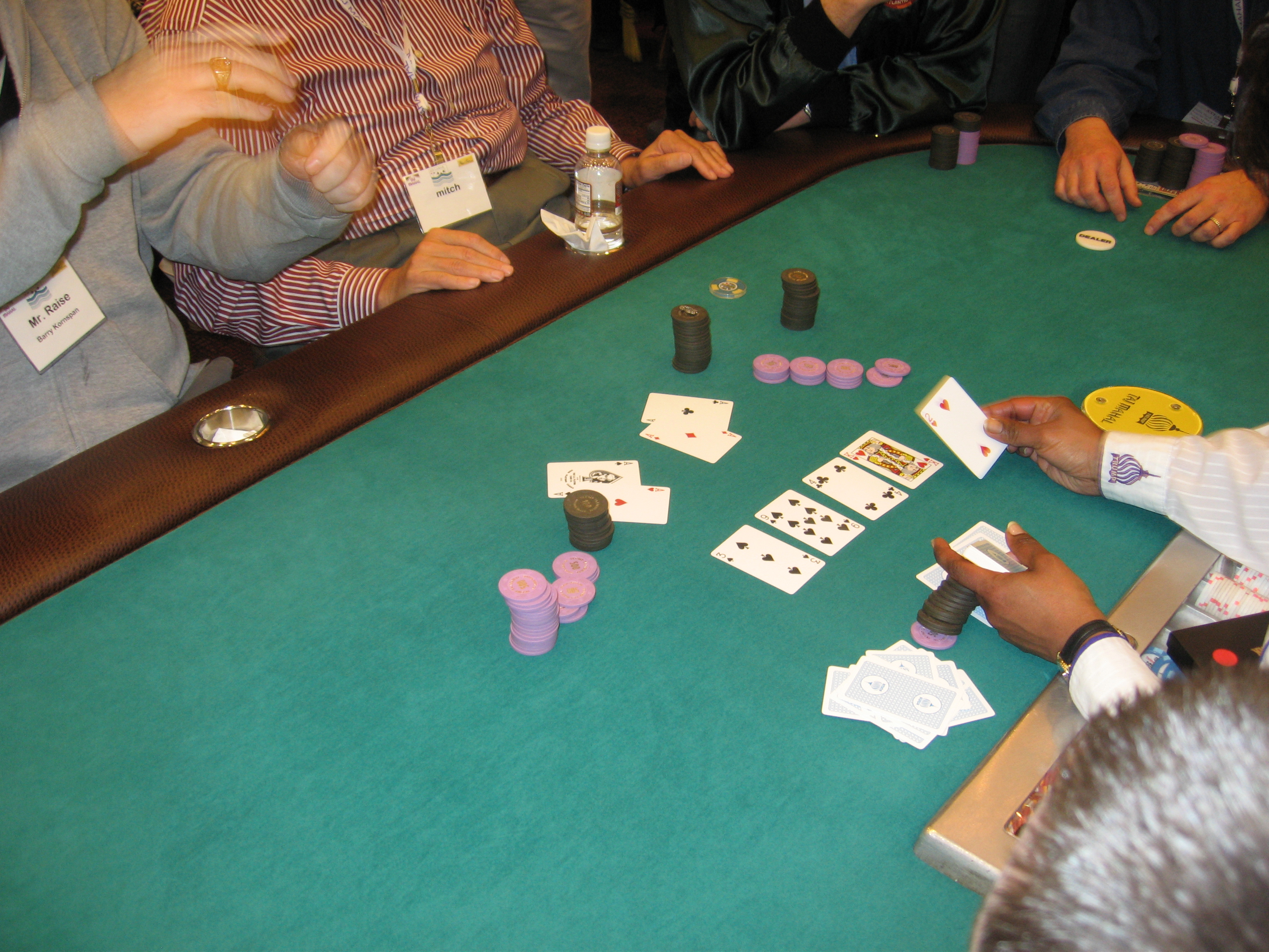 (From her blog: http://www.noninetofive.blogspot.com/ [dead link --Ed.]) Matt and Ivy picked me up bright and early and we left Brooklyn for AC. The first thing Matt told me when we got in the car was that the gas gauge was broken (permanently stuck on "E"). He then informed me of something even more hysterical: that I would be playing the H.O.E. tournament when we arrived at the Taj. I hadn't planned on playing this event. I've had historically abysmal results in limit hold 'em tourneys. My Omaha game is so-so on a good day. And before this weekend, I had played Stud O8 exactly once in my life. Overall, not a lot of reasons to play a $120 tournament involving these three games. We arrived just as the tournament registration was finishing up, and since I couldn't check into my room until noon I decided I might as well pass the time reuniting with fellow ARGErs at the poker table. Matt finally convinced me by offering to take half my action. I told him it was a lousy investment, outlining my reasons from above, but the long drive and lack of breakfast must have addled his brain because we ended up making this deal anyway. After a mad scramble to get a Taj card, I signed up for the tourney and took my seat. I was about to play my first H.O.E. tournament. I played at so many tables in this tourney that it's hard to recall who was at each one. Please yell at me if I forget you or get this wrong. Players I remember from my first table were Kenny, Matt, and Laurie Caulkins. Laurie had a nice set of chopsticks from her recent trip to China as her bust-out prize and I eyed them covetously. I don't remember any hands from this table, and in fact the most memorable thing that happened was Ivy Janet bringing us all a box of sinfully delicious Krispy Kream doughnuts. Mmmm, doughnuts.....argharhgahrargh. I found that the rotation game format really kept me paying attention in this tournament. Having to think about a different game every half hour or so kept things interesting, and I really enjoyed it. (Anyone know of any rotation tourneys online?) I found that my Omaha game was on par with the players around me, and I muddled through the Stud rounds without spewing too many chips. My basic strategy in Stud early on was to fold almost every hand except the ones I was 100% sure were playable, pinpoint the players at my table who seemed to understand the game, and watch them play theirs. (I also saw a fair number of examples of what not to do...) My stack remained healthy through most of the early rounds. As the blinds increased, I started to worry more about the fact that I would not be able to make it deep in this tournament without winning some Stud hands. The pots in Stud were the largest being played, and I needed to get my hands on those chips sooner or later. My first huge pot was not in Stud, but in Omaha. One player limped and I limped behind with A4xx double-suited (sorry I don't have more precise hand histories). The flop came with two low cards and one diamond. I held the Ax of diamonds. The turn paired the board, and I donked along to the river, where I hit my flush. I called one bet, as did the limper behind me, and when we turned up our hands I was up against a smaller flush for the high and ended up with half the low as well. I was accumulating chips nicely and never had much concern for my chip stack. Until I was moved yet again and found myself with Jeff Caulkins and Bill Chen on my right and Rob "ActionBob" Hwang on my left. And oh, good, the Stud round was beginning. Bill wonders if he'll make it to his speech on time. I don't know much about Stud O8, but it seemed to me that as long as I went for the low, I could sometimes back into a decent high and still win. I scooped two huge Stud pots at this table, both with two pair. How could this be?? On one hand, no one had a low, so and on the other my two small pair were good. Is this common in Stud? My only other experience with split games is Omaha, and two pair are rarely good for the high in that game. Stacking my chips, I looked up and saw that Jeff had a pair of chopsticks as his bust-out prize just as Laurie had. I wanted them. During the Hold 'Em round, I looked down at two red sevens. Jeff was short-stacked and called my pre-flop raise. The flop came ten-high and he moved in. I wanted those chopsticks real bad so I called. Jeff showed two overs (ace-jack, I think?) and got no love from the turn or river. Jeff was out and the chopsticks were mine! Woot! Now I had a serious stack, and entered my favorite part of a tournament: the part where I have chips and start raising like it's going out of style. During the course of this tournament, someone gave me the nickname, "Raising Station." I took that as a compliment. I was able to steal some blinds/antes/pots during the next few rounds (and to be fair, I was also getting smacked with the deck) and built my stack even bigger. One by one, players were getting knocked out around me (and sometimes, *by* me!). I started to think I might have a shot at going really deep in this thing. The raising station (center). Thank goodness I've built up my tourney stamina online during the past few months, and thank goodness that the deeper you get in a tournament, the less the specific game matters. Nine hours after we began, I found myself at the final table. The blinds were insane, and any given hand could turn the short stack into the chip leader (and vice versa). I made this swing a couple of times myself as we remained eight-handed for nearly an hour. Then there was a rapid series of bust-outs and we were four-handed: Rob "Suddenly" Catlett, Bill Chen, Gabe DeVitto, and me. It was approaching 8pm, when the banquet was supposed to begin, so we had a pitiful number of sweaters. They were busy admiring the Poker Stars ice sculpture upstairs. Since I was a moron and didn't record any of this sooner, I have no remarkable hands to report. Bill busted fourth, followed by Rob, and that left Gabe and me