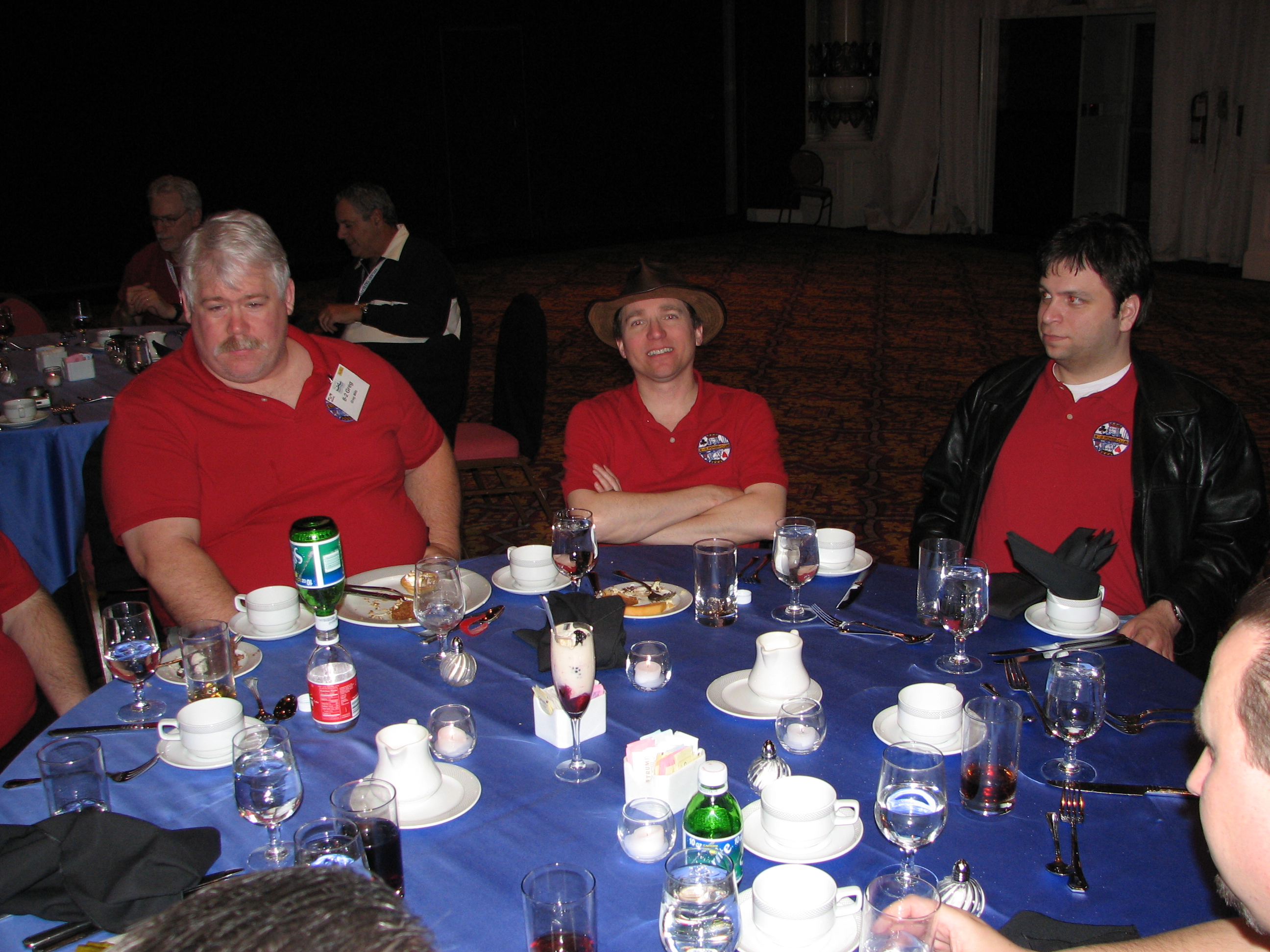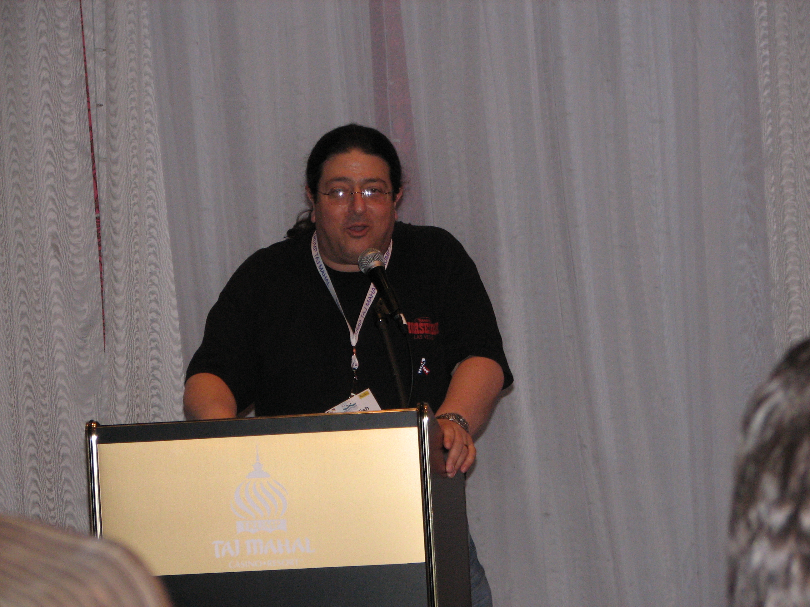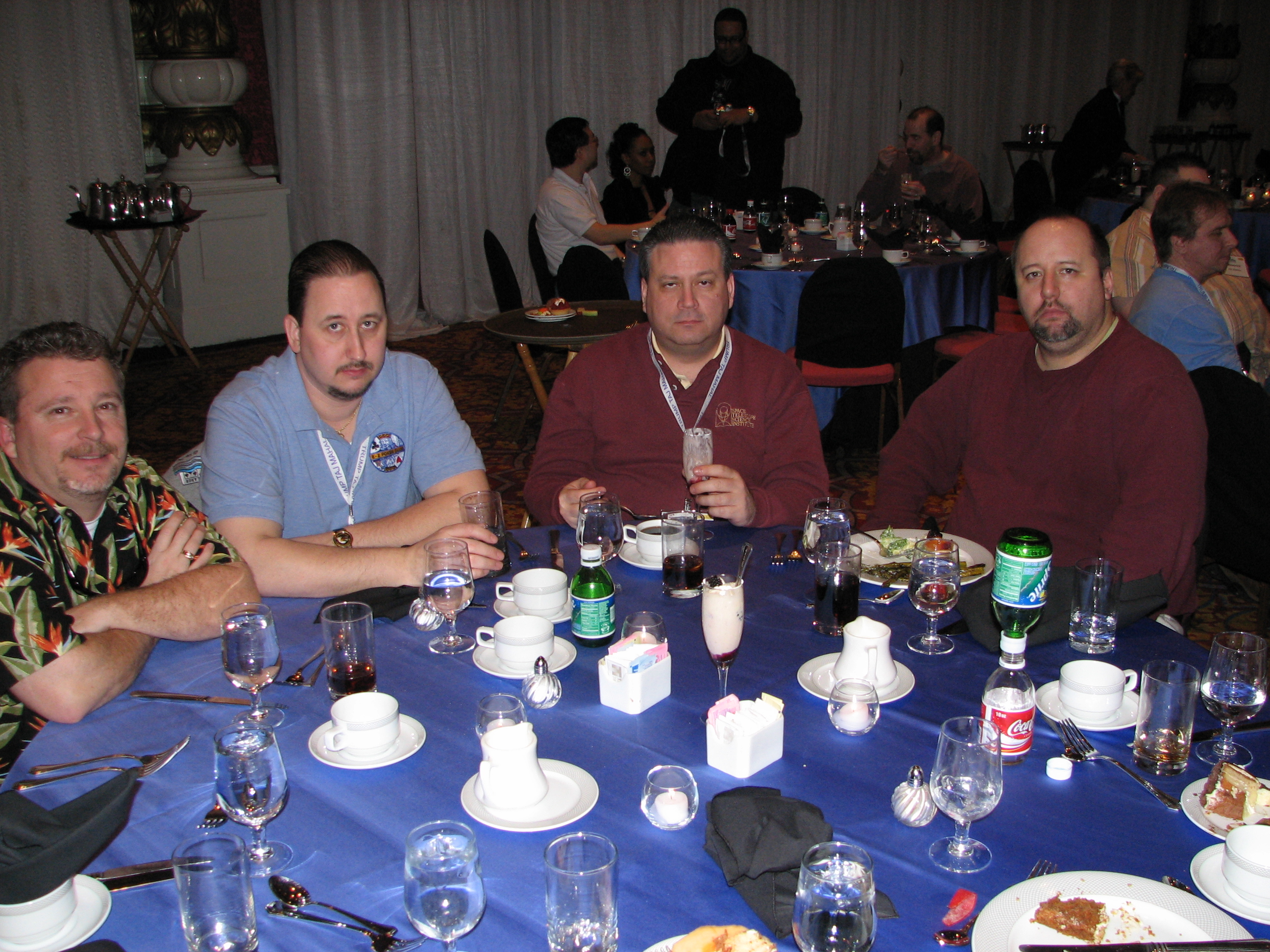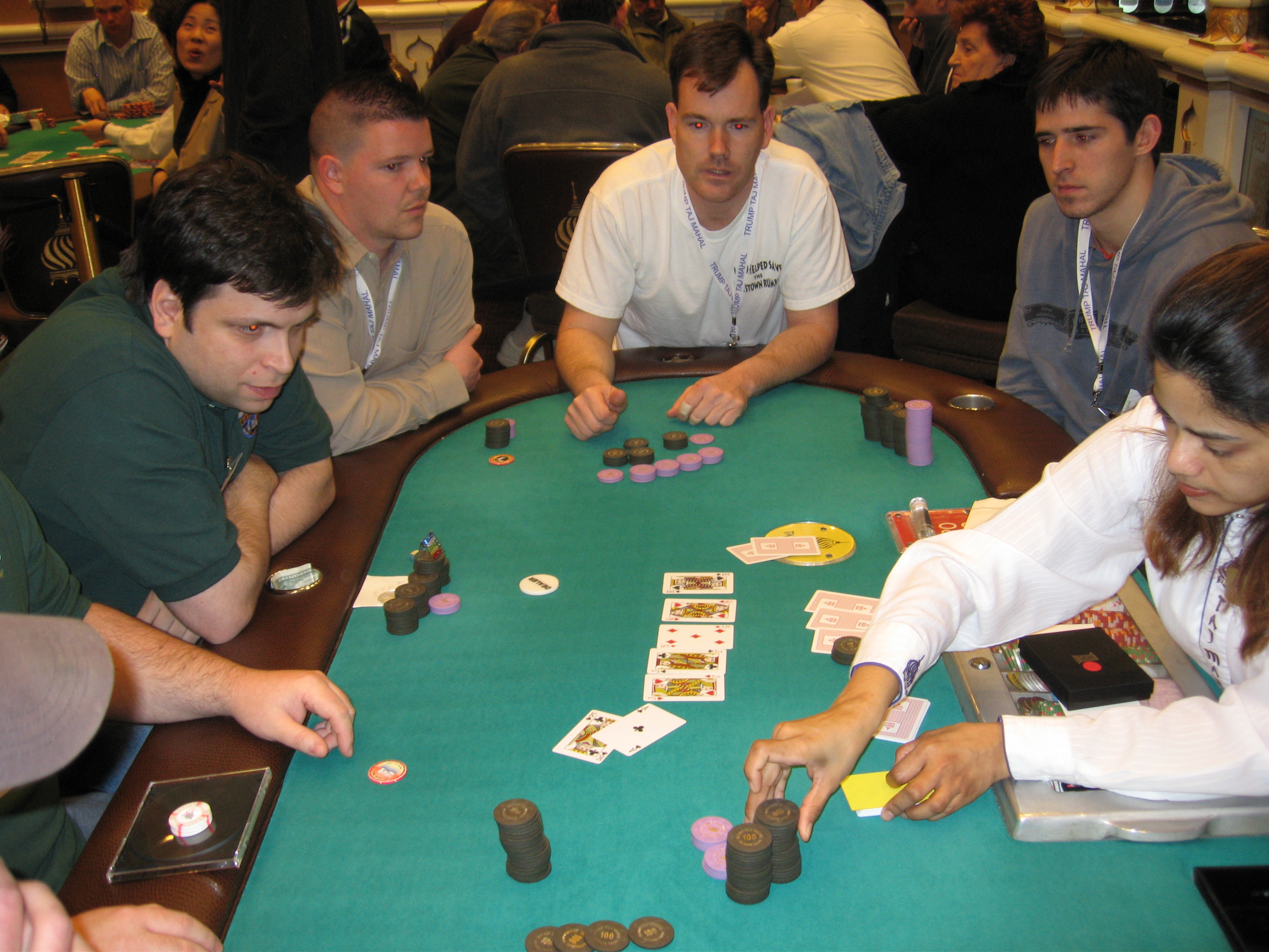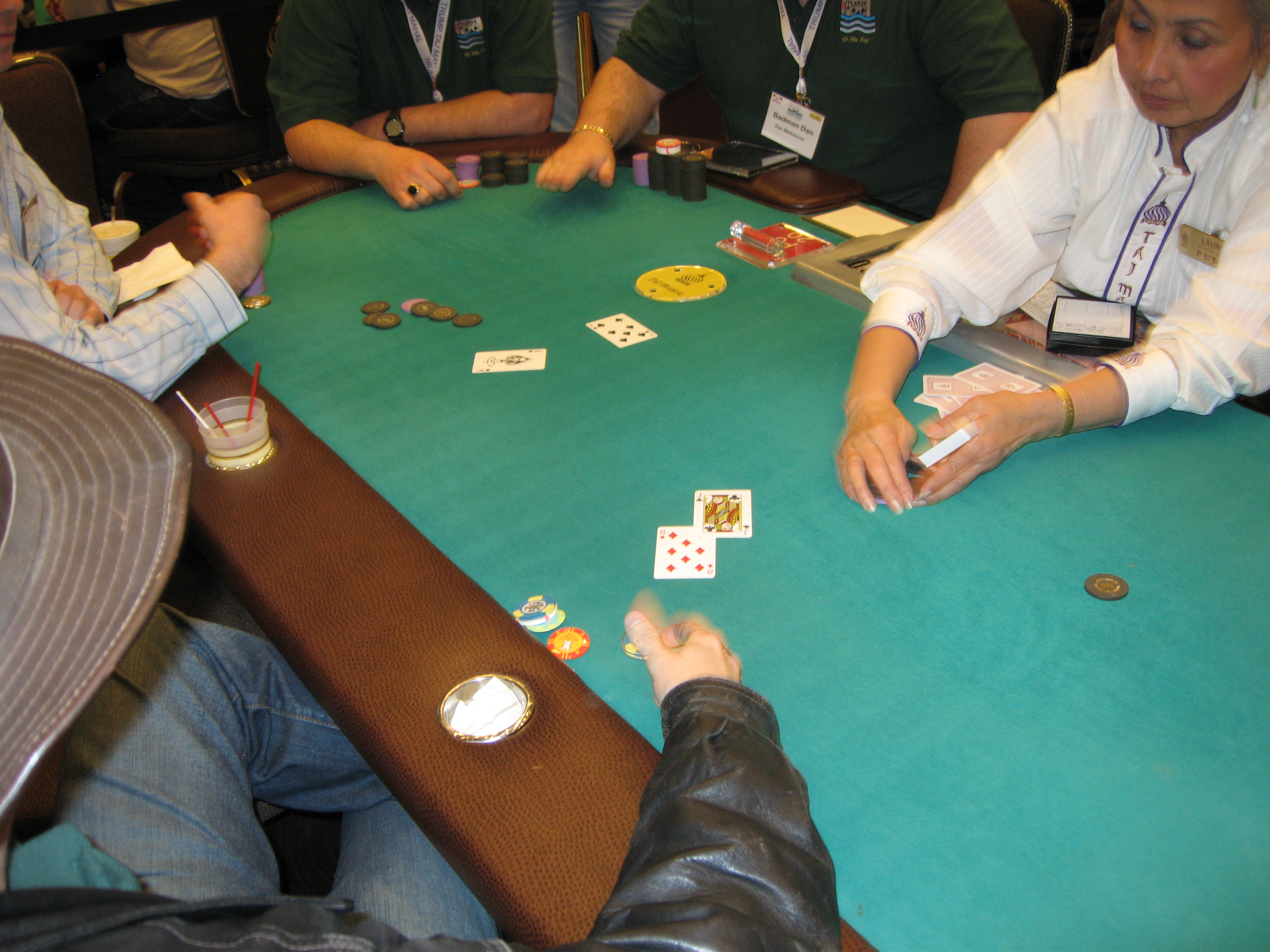 (From her blog: http://www.noninetofive.blogspot.com/ [dead link --Ed.]) Matt and Ivy picked me up bright and early and we left Brooklyn for AC. The first thing Matt told me when we got in the car was that the gas gauge was broken (permanently stuck on "E"). He then informed me of something even more hysterical: that I would be playing the H.O.E. tournament when we arrived at the Taj. I hadn't planned on playing this event. I've had historically abysmal results in limit hold 'em tourneys. My Omaha game is so-so on a good day. And before this weekend, I had played Stud O8 exactly once in my life. Overall, not a lot of reasons to play a $120 tournament involving these three games. We arrived just as the tournament registration was finishing up, and since I couldn't check into my room until noon I decided I might as well pass the time reuniting with fellow ARGErs at the poker table. Matt finally convinced me by offering to take half my action. I told him it was a lousy investment, outlining my reasons from above, but the long drive and lack of breakfast must have addled his brain because we ended up making this deal anyway. After a mad scramble to get a Taj card, I signed up for the tourney and took my seat. I was about to play my first H.O.E. tournament. I played at so many tables in this tourney that it's hard to recall who was at each one. Please yell at me if I forget you or get this wrong. Players I remember from my first table were Kenny, Matt, and Laurie Caulkins. Laurie had a nice set of chopsticks from her recent trip to China as her bust-out prize and I eyed them covetously. I don't remember any hands from this table, and in fact the most memorable thing that happened was Ivy Janet bringing us all a box of sinfully delicious Krispy Kream doughnuts. Mmmm, doughnuts.....argharhgahrargh. I found that the rotation game format really kept me paying attention in this tournament. Having to think about a different game every half hour or so kept things interesting, and I really enjoyed it. (Anyone know of any rotation tourneys online?) I found that my Omaha game was on par with the players around me, and I muddled through the Stud rounds without spewing too many chips. My basic strategy in Stud early on was to fold almost every hand except the ones I was 100% sure were playable, pinpoint the players at my table who seemed to understand the game, and watch them play theirs. (I also saw a fair number of examples of what not to do...) My stack remained healthy through most of the early rounds. As the blinds increased, I started to worry more about the fact that I would not be able to make it deep in this tournament without winning some Stud hands. The pots in Stud were the largest being played, and I needed to get my hands on those chips sooner or later. My first huge pot was not in Stud, but in Omaha. One player limped and I limped behind with A4xx double-suited (sorry I don't have more precise hand histories). The flop came with two low cards and one diamond. I held the Ax of diamonds. The turn paired the board, and I donked along to the river, where I hit my flush. I called one bet, as did the limper behind me, and when we turned up our hands I was up against a smaller flush for the high and ended up with half the low as well. I was accumulating chips nicely and never had much concern for my chip stack. Until I was moved yet again and found myself with Jeff Caulkins and Bill Chen on my right and Rob "ActionBob" Hwang on my left. And oh, good, the Stud round was beginning. Bill wonders if he'll make it to his speech on time. I don't know much about Stud O8, but it seemed to me that as long as I went for the low, I could sometimes back into a decent high and still win. I scooped two huge Stud pots at this table, both with two pair. How could this be?? On one hand, no one had a low, so and on the other my two small pair were good. Is this common in Stud? My only other experience with split games is Omaha, and two pair are rarely good for the high in that game. Stacking my chips, I looked up and saw that Jeff had a pair of chopsticks as his bust-out prize just as Laurie had. I wanted them. During the Hold 'Em round, I looked down at two red sevens. Jeff was short-stacked and called my pre-flop raise. The flop came ten-high and he moved in. I wanted those chopsticks real bad so I called. Jeff showed two overs (ace-jack, I think?) and got no love from the turn or river. Jeff was out and the chopsticks were mine! Woot! Now I had a serious stack, and entered my favorite part of a tournament: the part where I have chips and start raising like it's going out of style. During the course of this tournament, someone gave me the nickname, "Raising Station." I took that as a compliment. I was able to steal some blinds/antes/pots during the next few rounds (and to be fair, I was also getting smacked with the deck) and built my stack even bigger. One by one, players were getting knocked out around me (and sometimes, *by* me!). I started to think I might have a shot at going really deep in this thing. The raising station (center). Thank goodness I've built up my tourney stamina online during the past few months, and thank goodness that the deeper you get in a tournament, the less the specific game matters. Nine hours after we began, I found myself at the final table. The blinds were insane, and any given hand could turn the short stack into the chip leader (and vice versa). I made this swing a couple of times myself as we remained eight-handed for nearly an hour. Then there was a rapid series of bust-outs and we were four-handed: Rob "Suddenly" Catlett, Bill Chen, Gabe DeVitto, and me. It was approaching 8pm, when the banquet was supposed to begin, so we had a pitiful number of sweaters. They were busy admiring the Poker Stars ice sculpture upstairs. Since I was a moron and didn't record any of this sooner, I have no remarkable hands to report. Bill busted fourth, followed by Rob, and that left Gabe and me