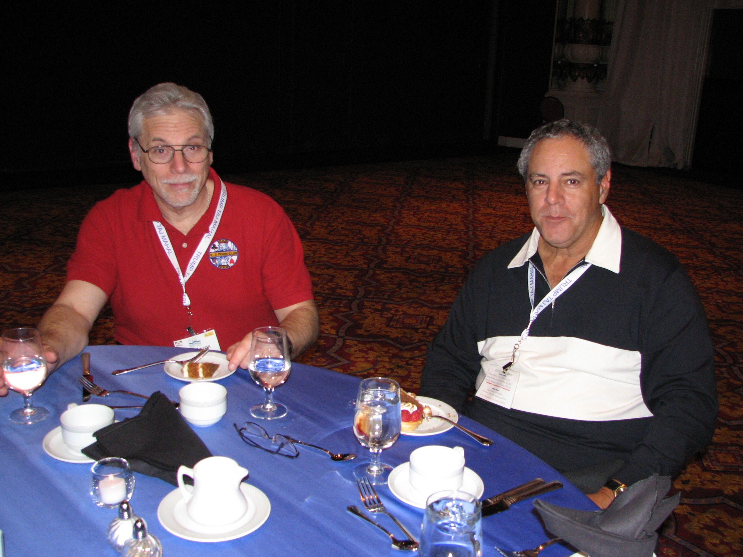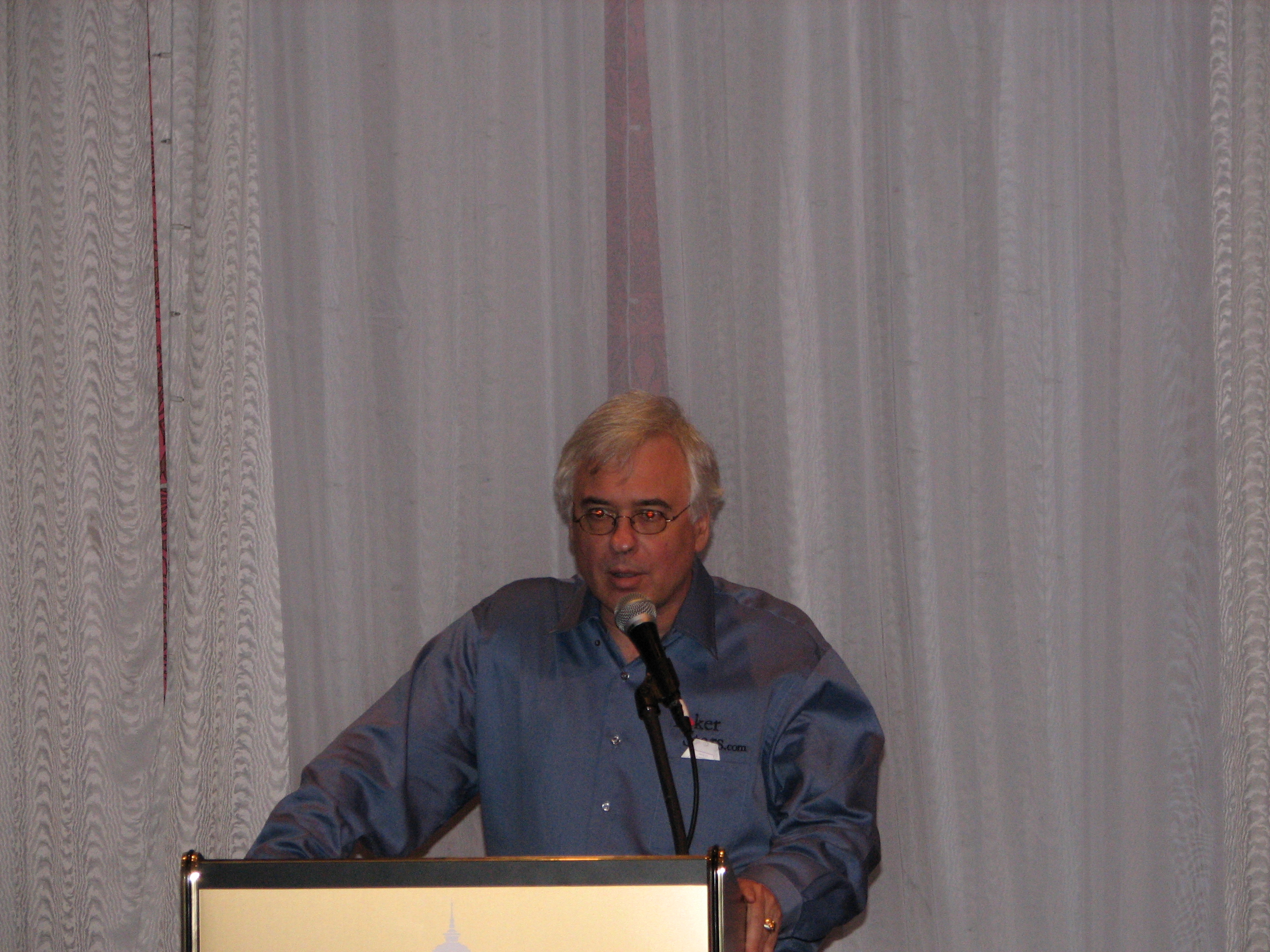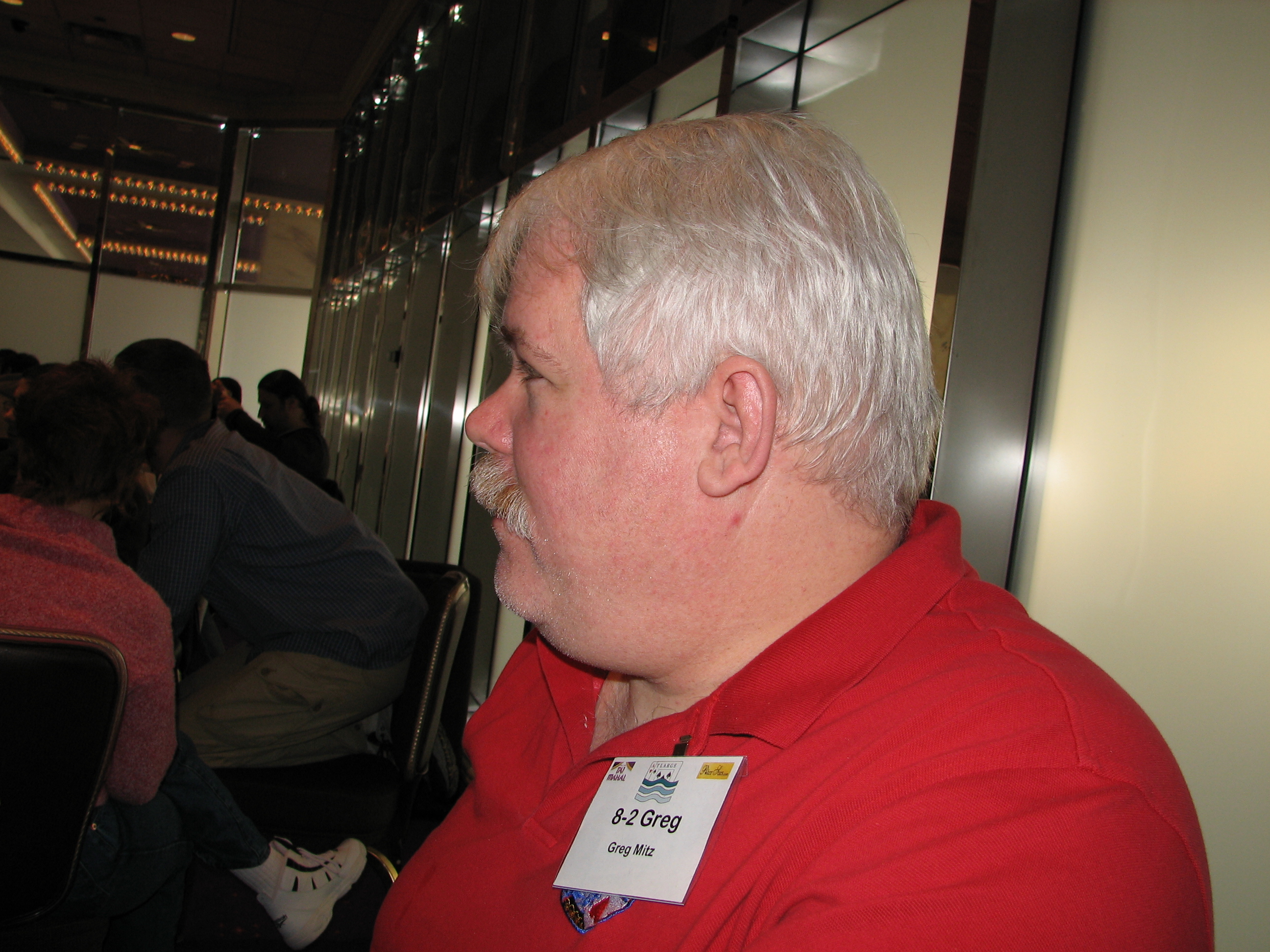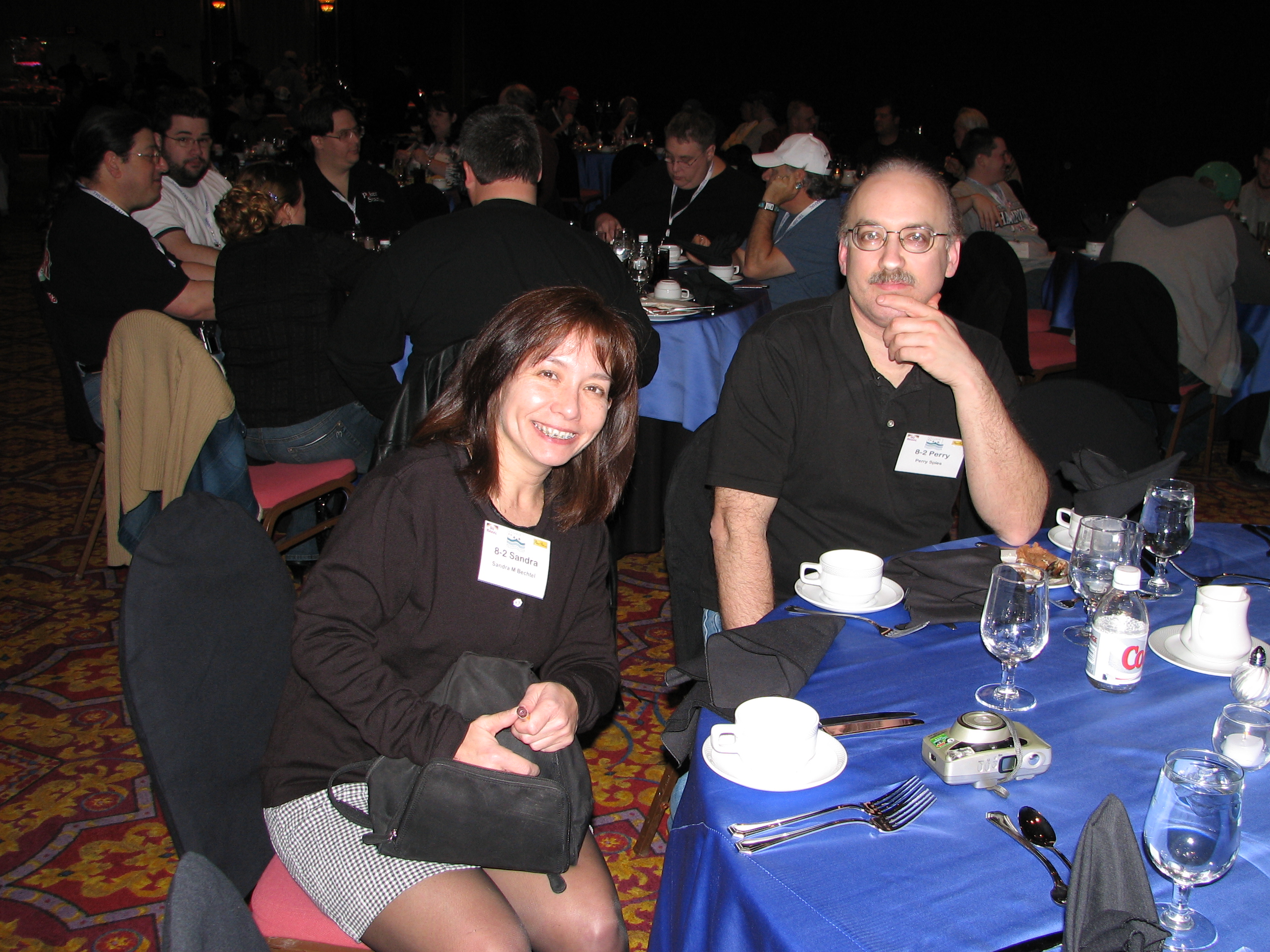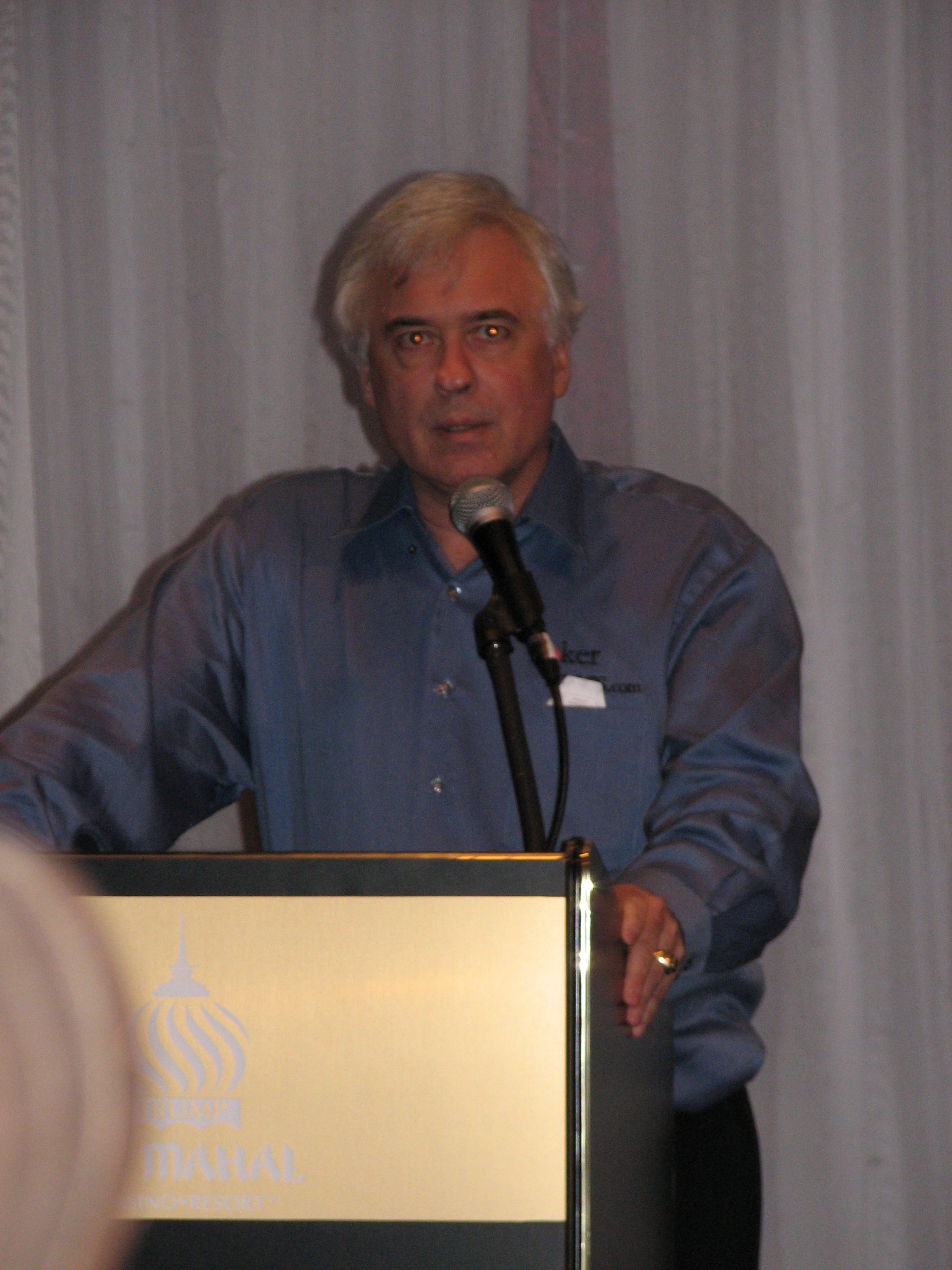 (From her blog: http://www.noninetofive.blogspot.com/ [dead link --Ed.]) Matt and Ivy picked me up bright and early and we left Brooklyn for AC. The first thing Matt told me when we got in the car was that the gas gauge was broken (permanently stuck on "E"). He then informed me of something even more hysterical: that I would be playing the H.O.E. tournament when we arrived at the Taj. I hadn't planned on playing this event. I've had historically abysmal results in limit hold 'em tourneys. My Omaha game is so-so on a good day. And before this weekend, I had played Stud O8 exactly once in my life. Overall, not a lot of reasons to play a $120 tournament involving these three games. We arrived just as the tournament registration was finishing up, and since I couldn't check into my room until noon I decided I might as well pass the time reuniting with fellow ARGErs at the poker table. Matt finally convinced me by offering to take half my action. I told him it was a lousy investment, outlining my reasons from above, but the long drive and lack of breakfast must have addled his brain because we ended up making this deal anyway. After a mad scramble to get a Taj card, I signed up for the tourney and took my seat. I was about to play my first H.O.E. tournament. I played at so many tables in this tourney that it's hard to recall who was at each one. Please yell at me if I forget you or get this wrong. Players I remember from my first table were Kenny, Matt, and Laurie Caulkins. Laurie had a nice set of chopsticks from her recent trip to China as her bust-out prize and I eyed them covetously. I don't remember any hands from this table, and in fact the most memorable thing that happened was Ivy Janet bringing us all a box of sinfully delicious Krispy Kream doughnuts. Mmmm, doughnuts.....argharhgahrargh. I found that the rotation game format really kept me paying attention in this tournament. Having to think about a different game every half hour or so kept things interesting, and I really enjoyed it. (Anyone know of any rotation tourneys online?) I found that my Omaha game was on par with the players around me, and I muddled through the Stud rounds without spewing too many chips. My basic strategy in Stud early on was to fold almost every hand except the ones I was 100% sure were playable, pinpoint the players at my table who seemed to understand the game, and watch them play theirs. (I also saw a fair number of examples of what not to do...) My stack remained healthy through most of the early rounds. As the blinds increased, I started to worry more about the fact that I would not be able to make it deep in this tournament without winning some Stud hands. The pots in Stud were the largest being played, and I needed to get my hands on those chips sooner or later. My first huge pot was not in Stud, but in Omaha. One player limped and I limped behind with A4xx double-suited (sorry I don't have more precise hand histories). The flop came with two low cards and one diamond. I held the Ax of diamonds. The turn paired the board, and I donked along to the river, where I hit my flush. I called one bet, as did the limper behind me, and when we turned up our hands I was up against a smaller flush for the high and ended up with half the low as well. I was accumulating chips nicely and never had much concern for my chip stack. Until I was moved yet again and found myself with Jeff Caulkins and Bill Chen on my right and Rob "ActionBob" Hwang on my left. And oh, good, the Stud round was beginning. Bill wonders if he'll make it to his speech on time. I don't know much about Stud O8, but it seemed to me that as long as I went for the low, I could sometimes back into a decent high and still win. I scooped two huge Stud pots at this table, both with two pair. How could this be?? On one hand, no one had a low, so and on the other my two small pair were good. Is this common in Stud? My only other experience with split games is Omaha, and two pair are rarely good for the high in that game. Stacking my chips, I looked up and saw that Jeff had a pair of chopsticks as his bust-out prize just as Laurie had. I wanted them. During the Hold 'Em round, I looked down at two red sevens. Jeff was short-stacked and called my pre-flop raise. The flop came ten-high and he moved in. I wanted those chopsticks real bad so I called. Jeff showed two overs (ace-jack, I think?) and got no love from the turn or river. Jeff was out and the chopsticks were mine! Woot! Now I had a serious stack, and entered my favorite part of a tournament: the part where I have chips and start raising like it's going out of style. During the course of this tournament, someone gave me the nickname, "Raising Station." I took that as a compliment. I was able to steal some blinds/antes/pots during the next few rounds (and to be fair, I was also getting smacked with the deck) and built my stack even bigger. One by one, players were getting knocked out around me (and sometimes, *by* me!). I started to think I might have a shot at going really deep in this thing. The raising station (center). Thank goodness I've built up my tourney stamina online during the past few months, and thank goodness that the deeper you get in a tournament, the less the specific game matters. Nine hours after we began, I found myself at the final table. The blinds were insane, and any given hand could turn the short stack into the chip leader (and vice versa). I made this swing a couple of times myself as we remained eight-handed for nearly an hour. Then there was a rapid series of bust-outs and we were four-handed: Rob "Suddenly" Catlett, Bill Chen, Gabe DeVitto, and me. It was approaching 8pm, when the banquet was supposed to begin, so we had a pitiful number of sweaters. They were busy admiring the Poker Stars ice sculpture upstairs. Since I was a moron and didn't record any of this sooner, I have no remarkable hands to report. Bill busted fourth, followed by Rob, and that left Gabe and me