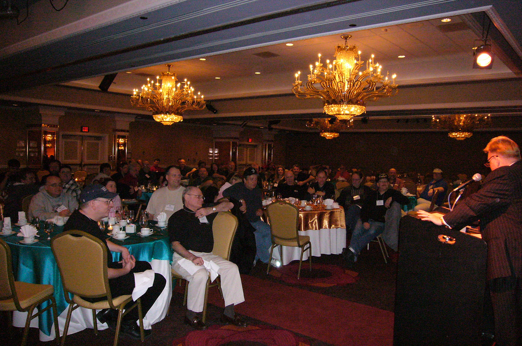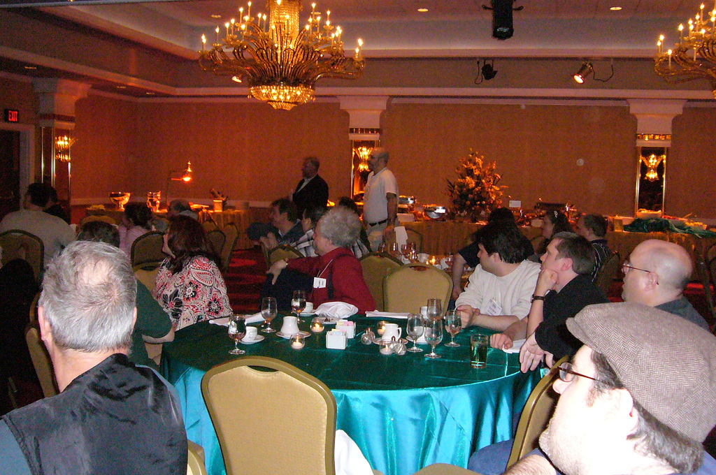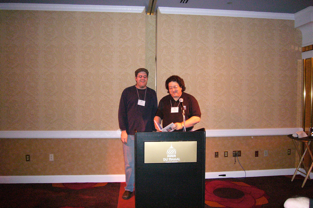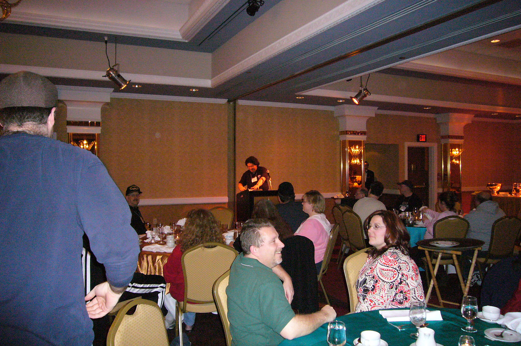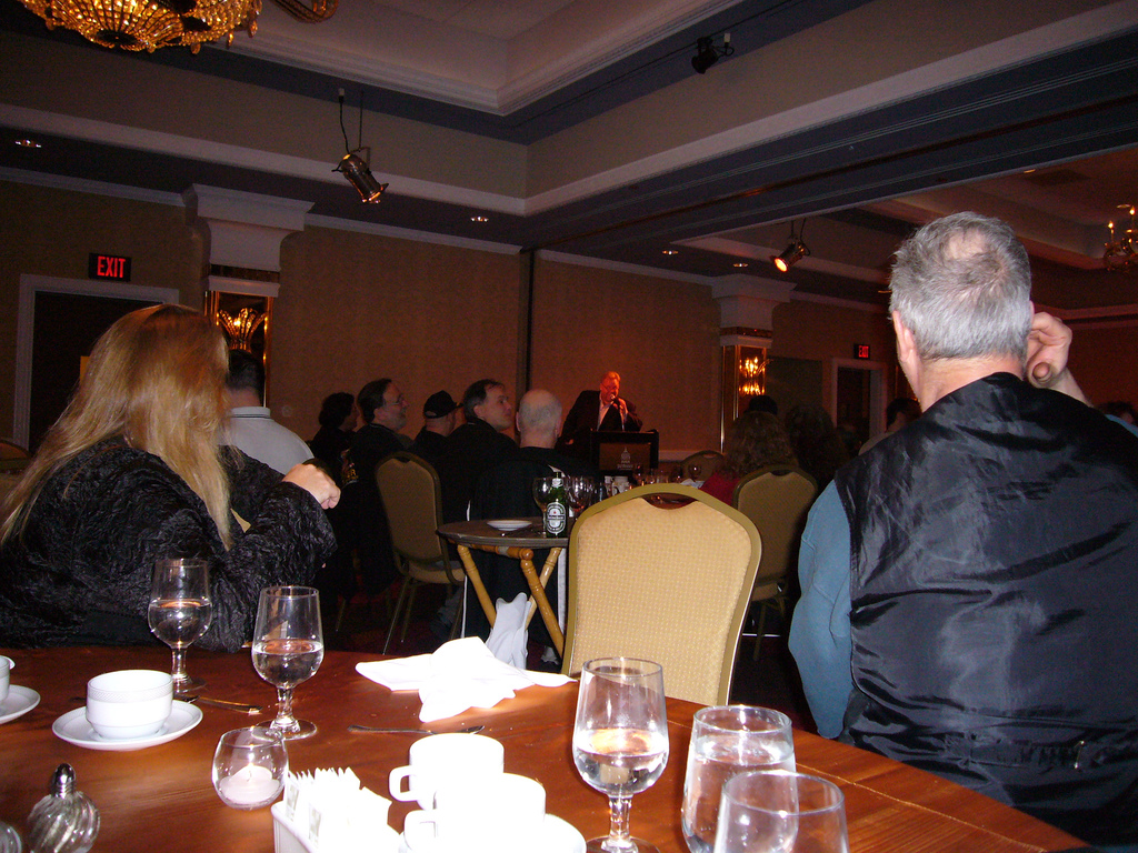 We signed up for a $120 SitnGo, but it looked like it would be a while till it went, so we got into a 1-2 no-limit game. Nothing memorable, up $12 in a little over an hour; I think J was up about $125. We left to go back to the Taj for the banquet. Food was decent. Gift presentation to hgfalling and billandmatt (in absentia) of Geek Logik. Nolan Dalla was the surprise (to me) guest speaker. His attempts at humour were not so good, but when he answered real questions from the audience about some behind-the-scenes stuff with the WSOP and Harrah's that was very interesting; he should have stuck to that. Back down to play some p0cker