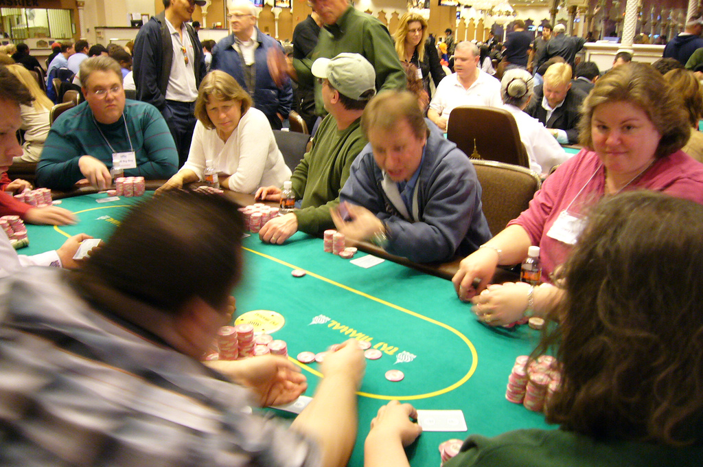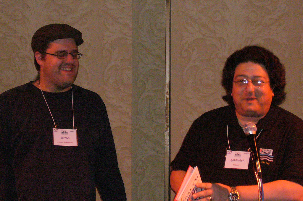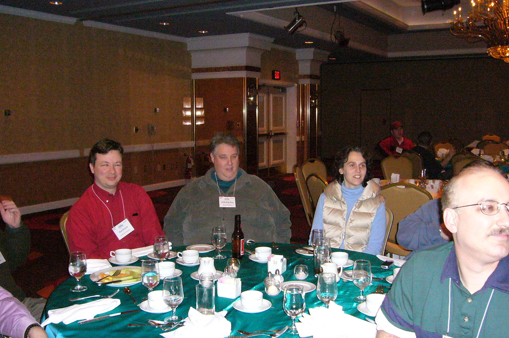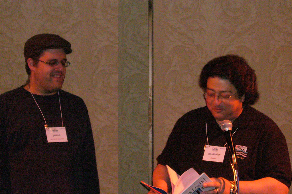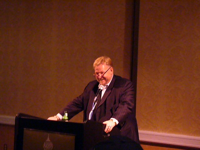 We signed up for a $120 SitnGo, but it looked like it would be a while till it went, so we got into a 1-2 no-limit game. Nothing memorable, up $12 in a little over an hour; I think J was up about $125. We left to go back to the Taj for the banquet. Food was decent. Gift presentation to hgfalling and billandmatt (in absentia) of Geek Logik. Nolan Dalla was the surprise (to me) guest speaker. His attempts at humour were not so good, but when he answered real questions from the audience about some behind-the-scenes stuff with the WSOP and Harrah's that was very interesting; he should have stuck to that. Back down to play some p0cker